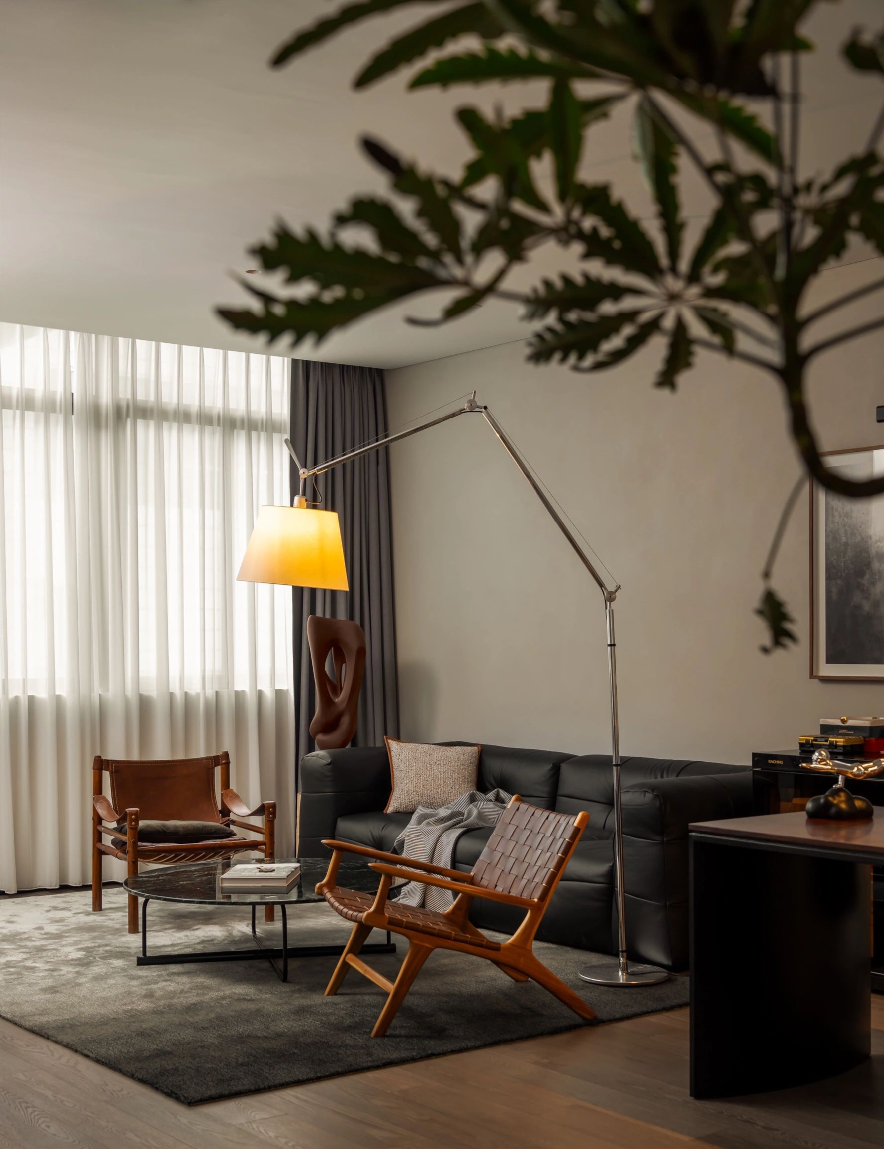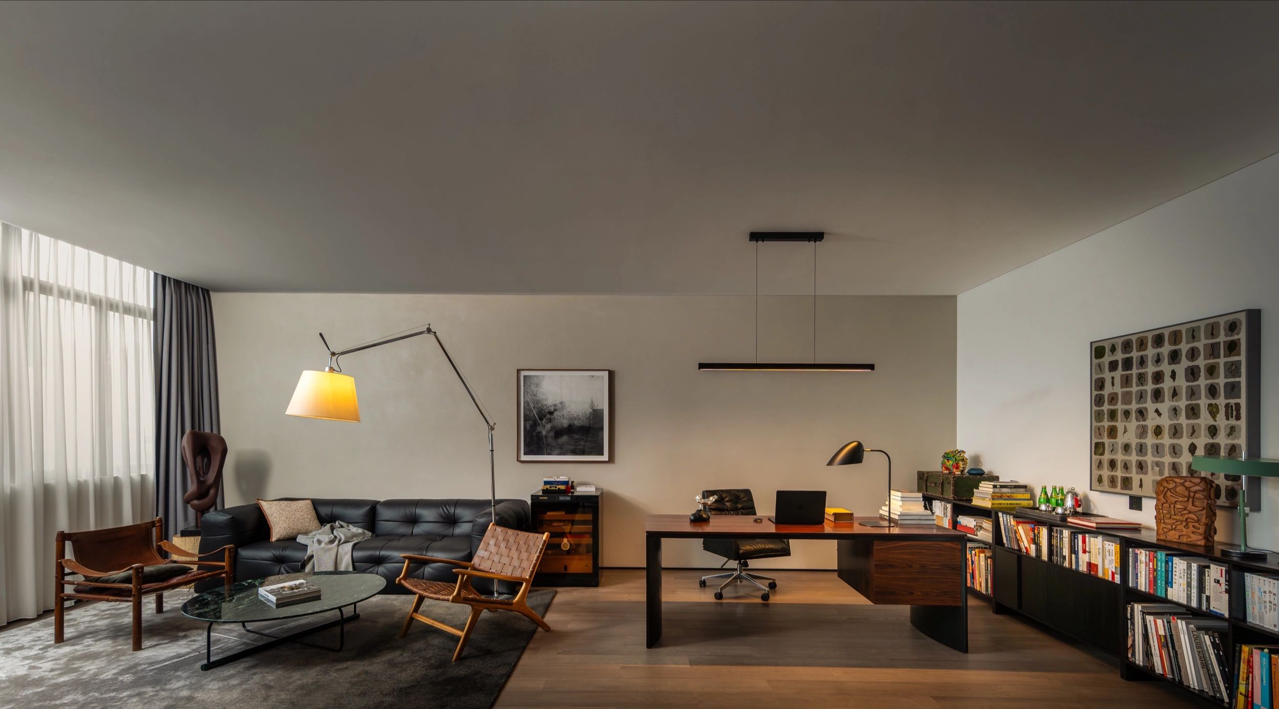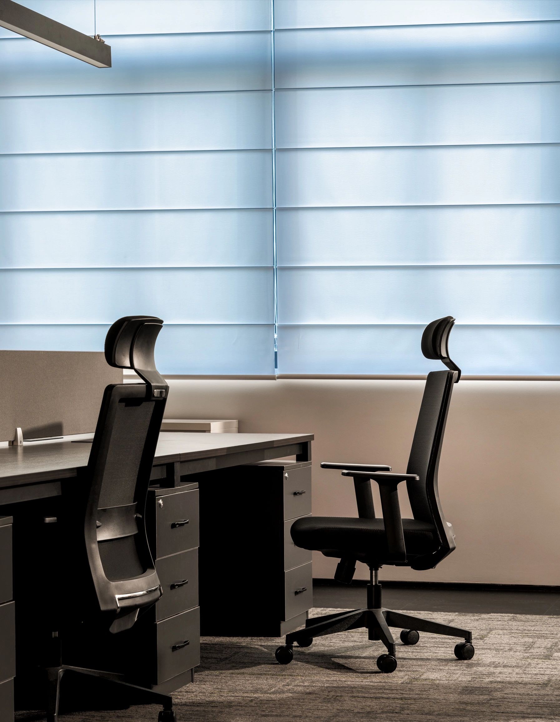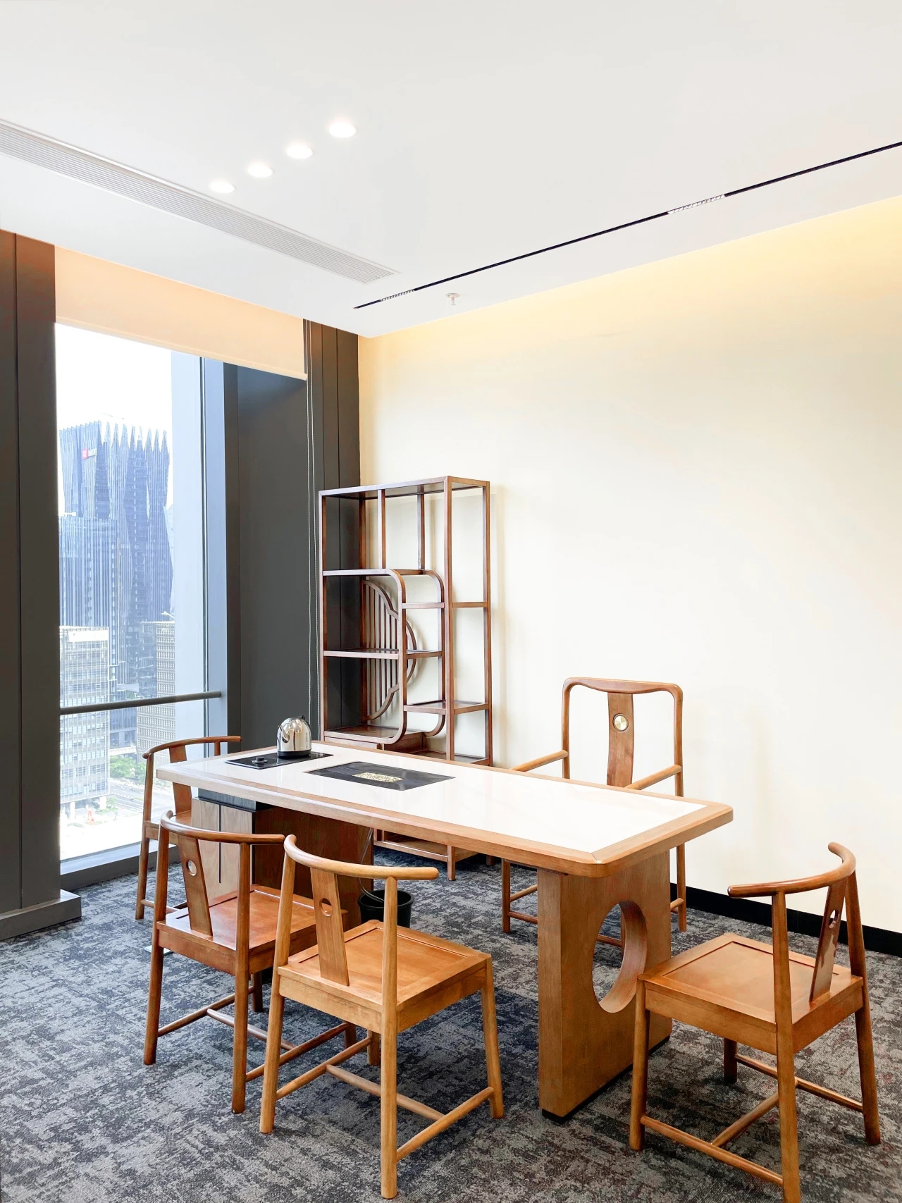 整体设计装修以现代风格为主,场地为长方盒子空间,把窗外自然光源尽可能引入到每一个办公位,综合环境和人文的需要,在呈现空间状态的设计中,利用重新建构框架的基础面形成的线条作展开,简约的造型和简洁的线条,营造既高效节能又平和松弛的办公环境。前台背景墙采用黑白调的石材搭配,错落有致,简洁时尚,地面用的是灰色印花阻燃地毯,通过窗外光影映射,与墙面相呼应,让空间更加丰富,有层次感,使其增添了几分活力。董事长办公室同样以灰白为基调,加入暖黄见光不见灯的无轨灯槽强化空间质感,与木色家具搭配的同时,利用简洁几何线条,将自然、简约与艺术融合,化繁为简,返璞归真,使整个空间温馨而高雅。眺望窗外一线江景,将宏伟蓝图尽收眼底,让你在工作之余,欣赏到城市的繁华美景。
