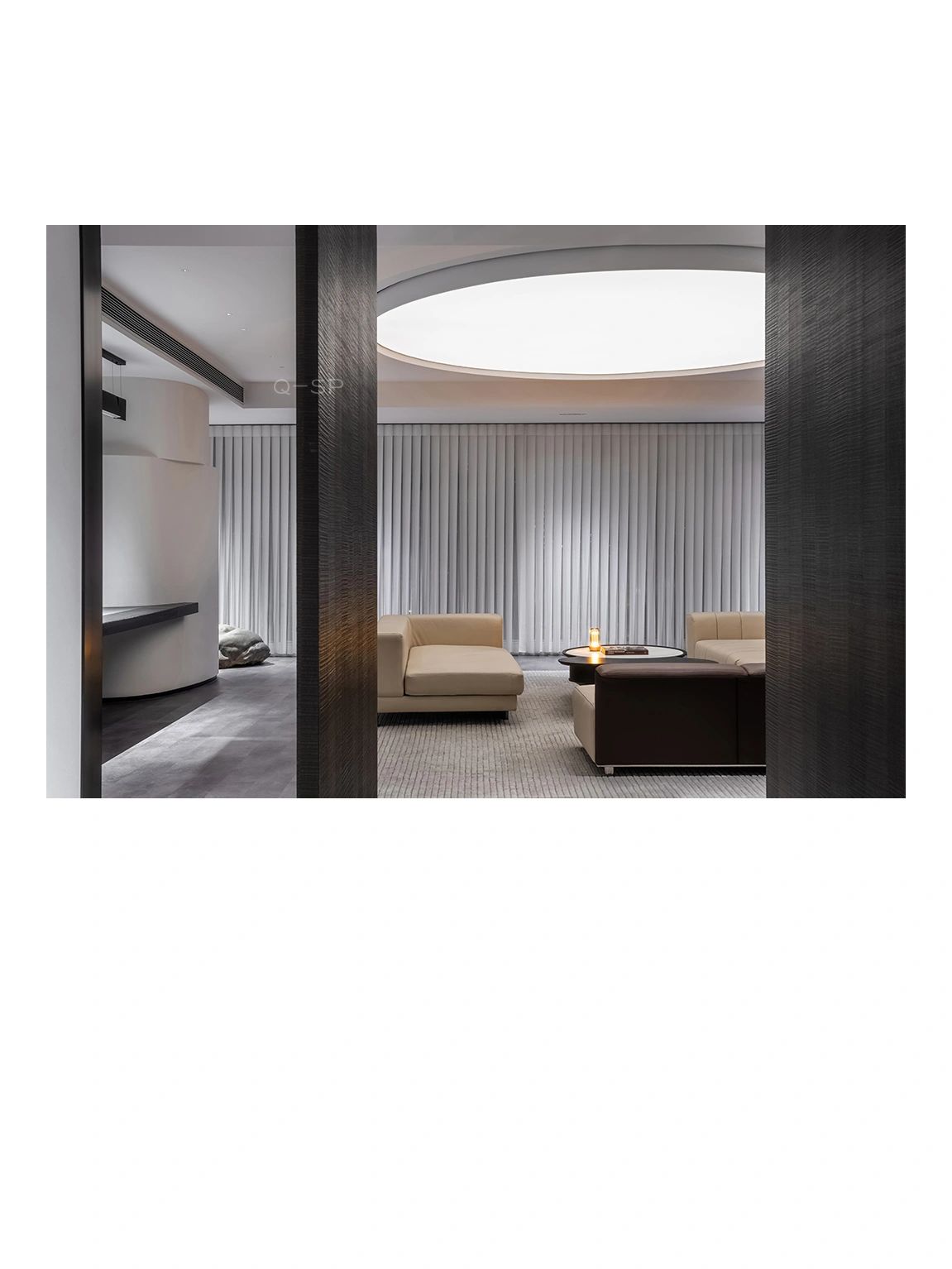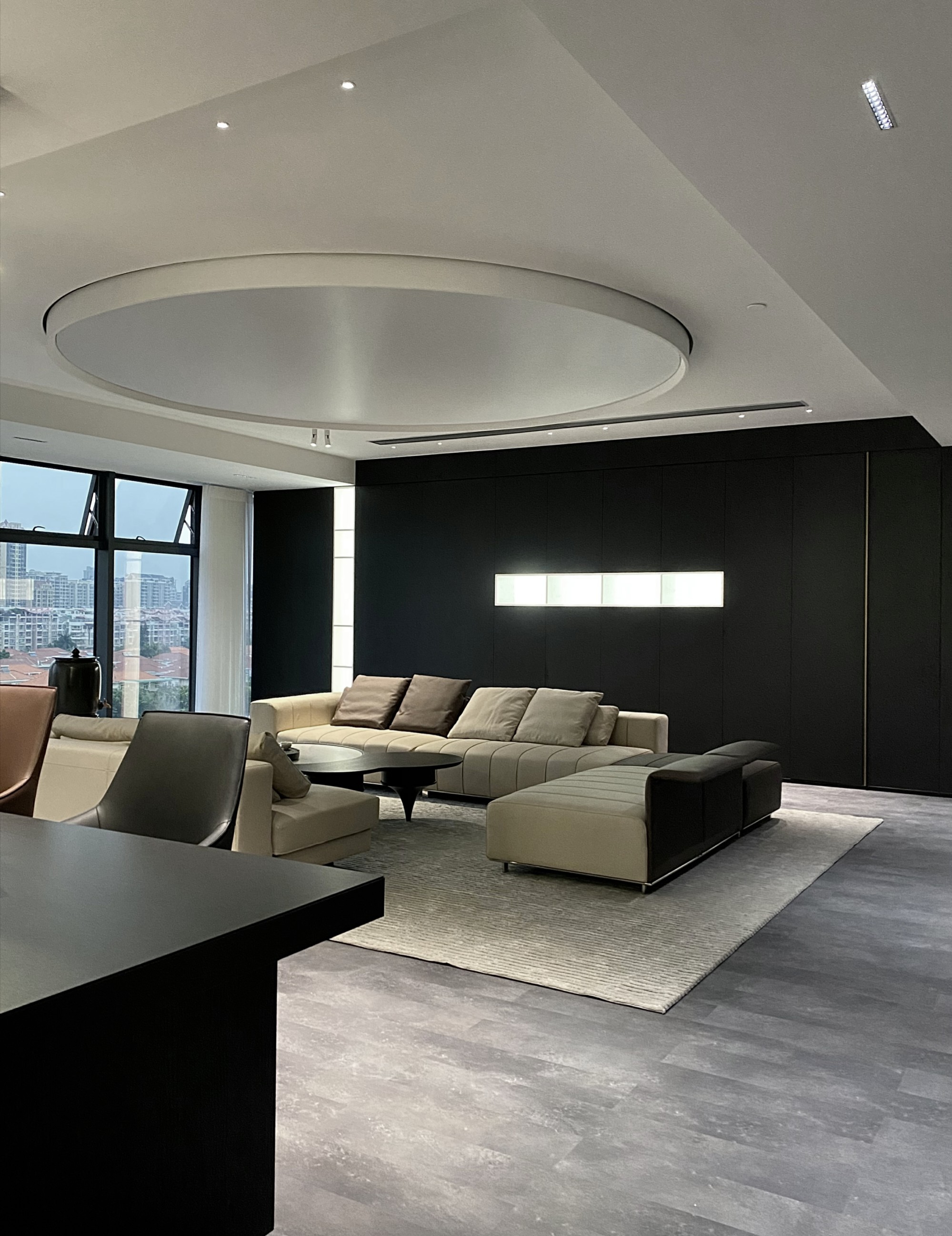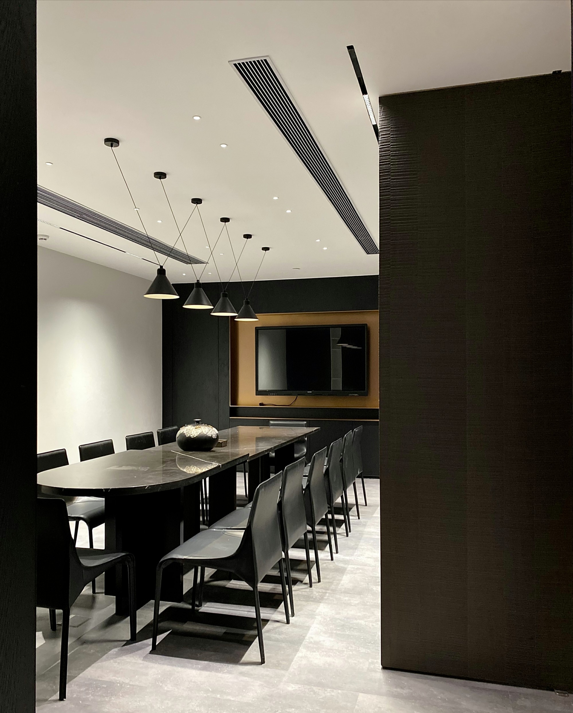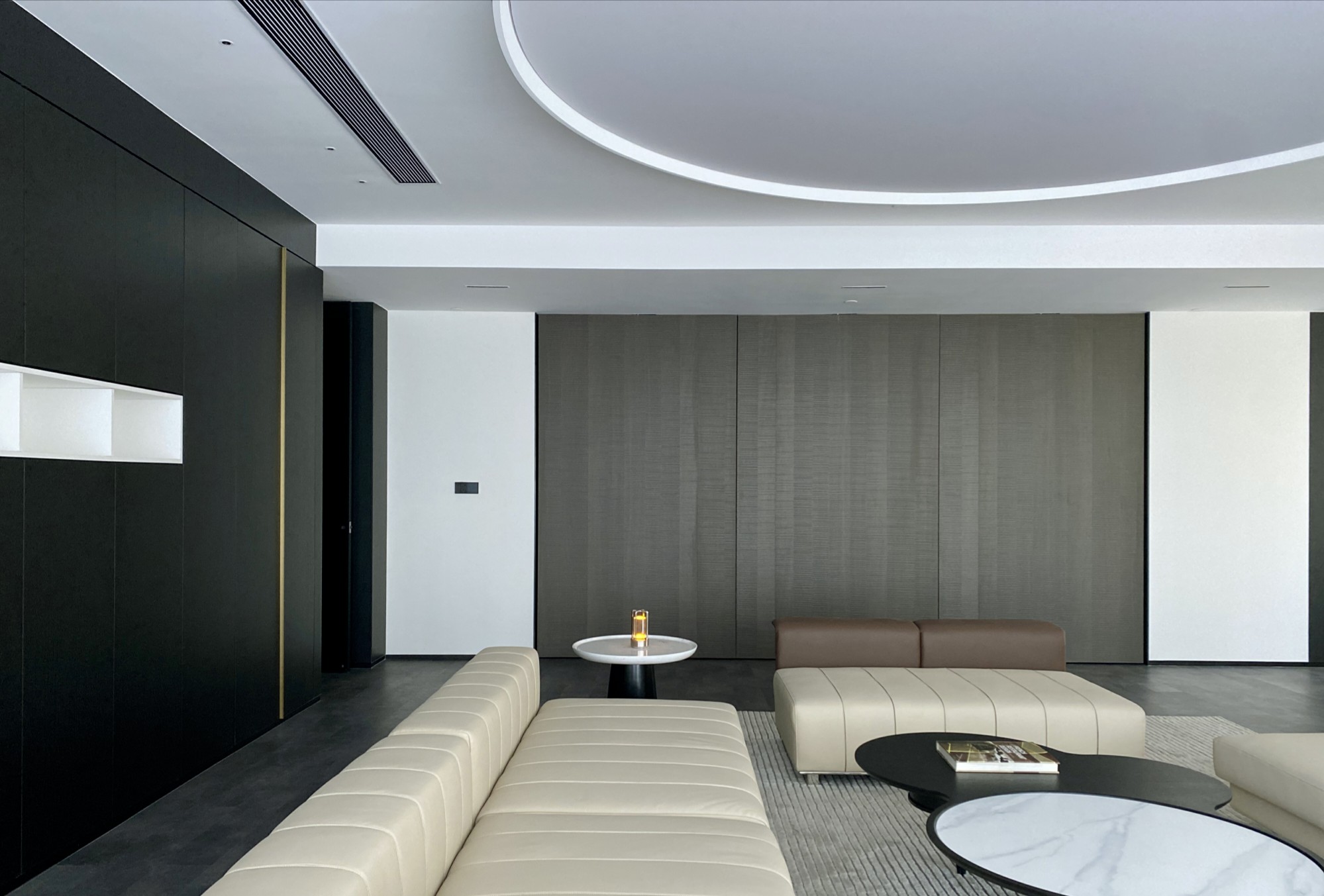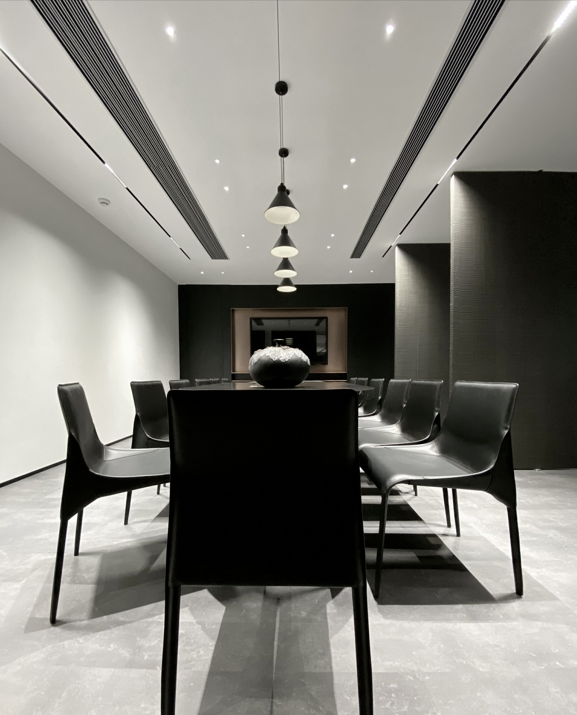 构筑三段式旋转结构,闭合时形成安静的立面背景,分隔了会客区和会议室,转开时可以随意调节开合面积,把控着空间的边界感,满足多样化的场景需求。黑色系桌椅从材质的高级感入手,抒发敛中有奢的气质。设置观影区,优化了会议讨论的氛围与效率。