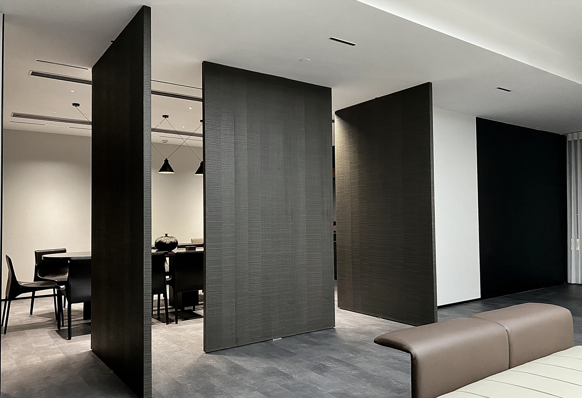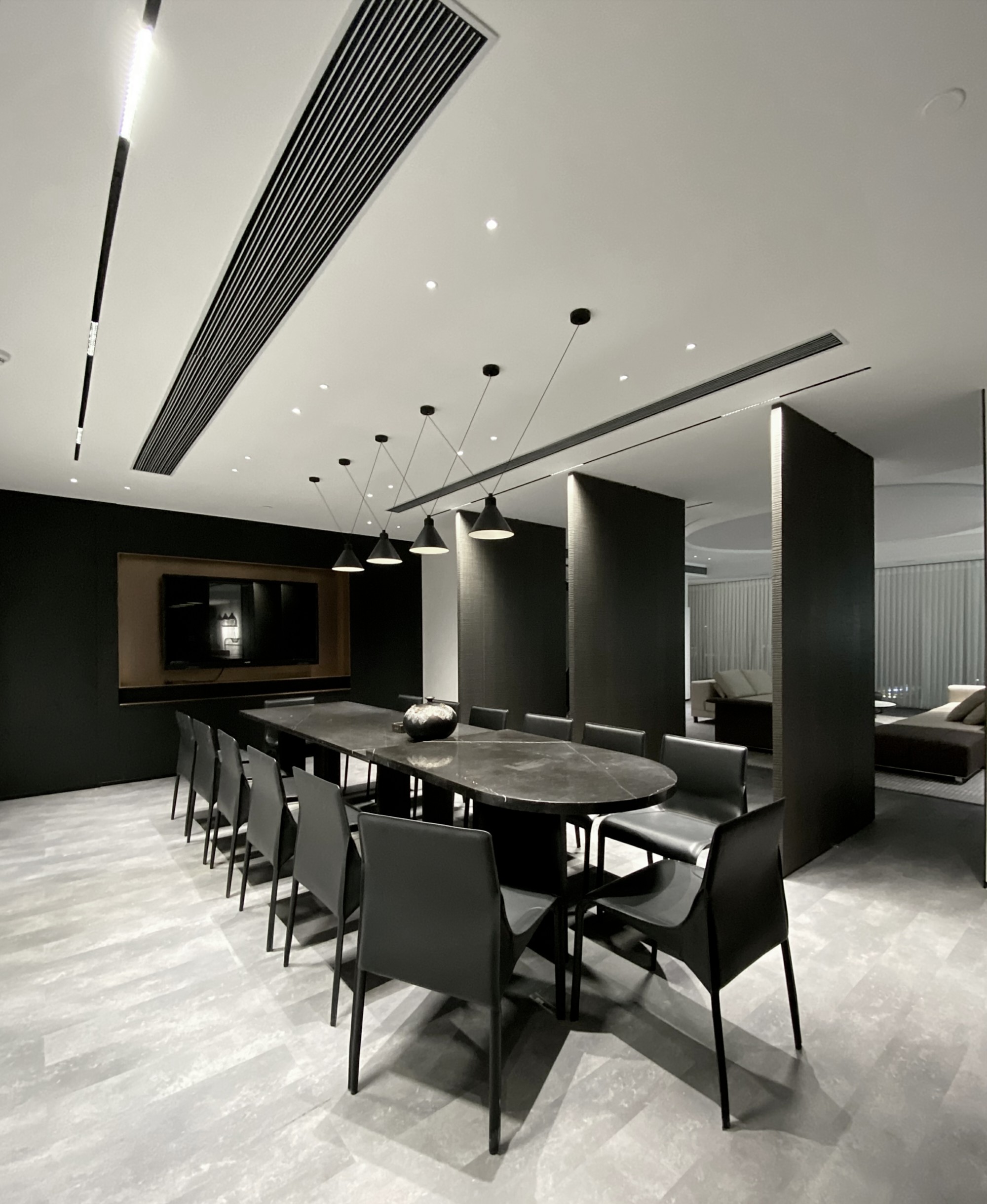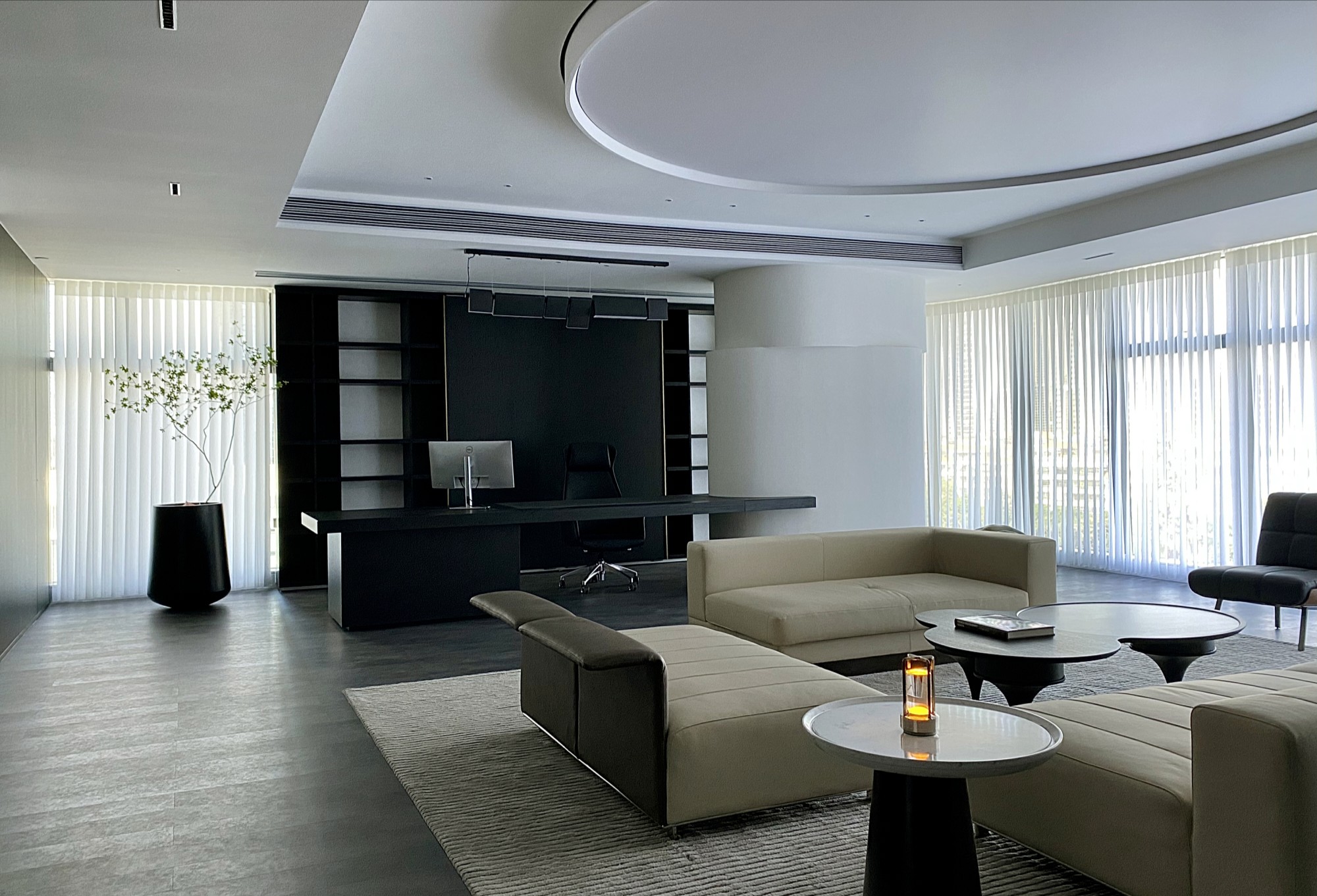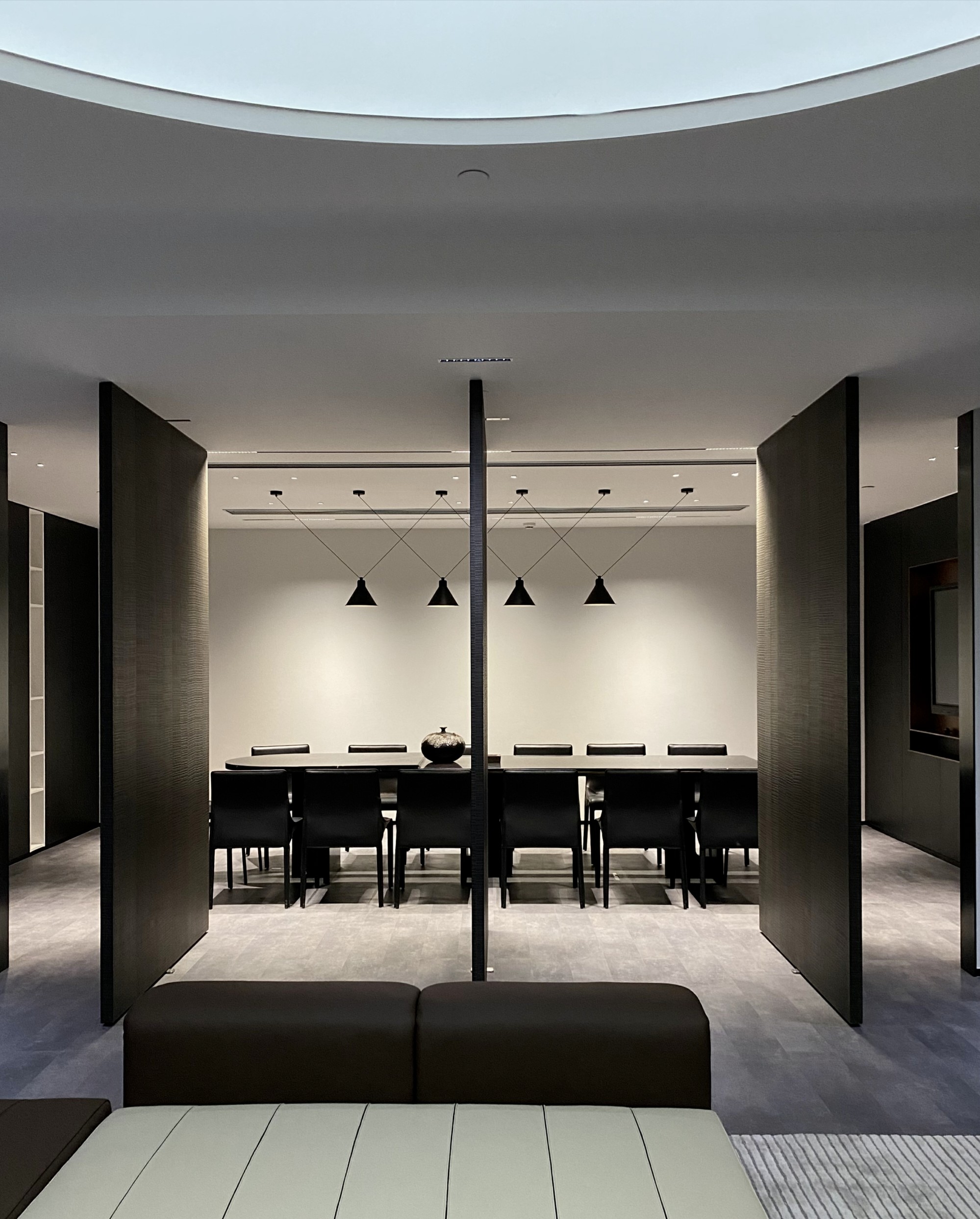 构筑三段式旋转结构,闭合时形成安静的立面背景,分隔了会客区和会议室,转开时可以随意调节开合面积,把控着空间的边界感,满足多样化的场景需求。黑色系桌椅从材质的高级感入手,抒发敛中有奢的气质。设置观影区,优化了会议讨论的氛围与效率。