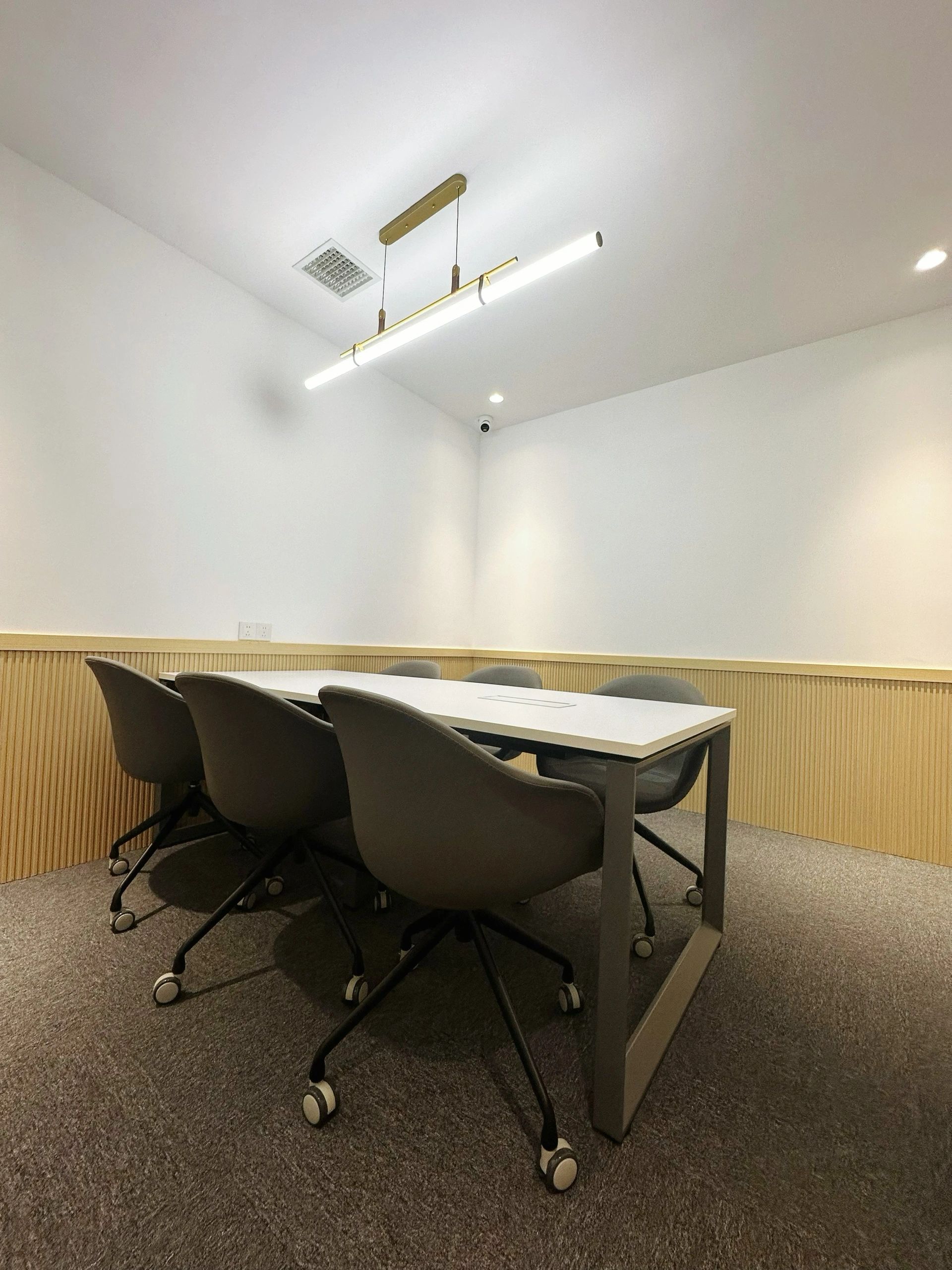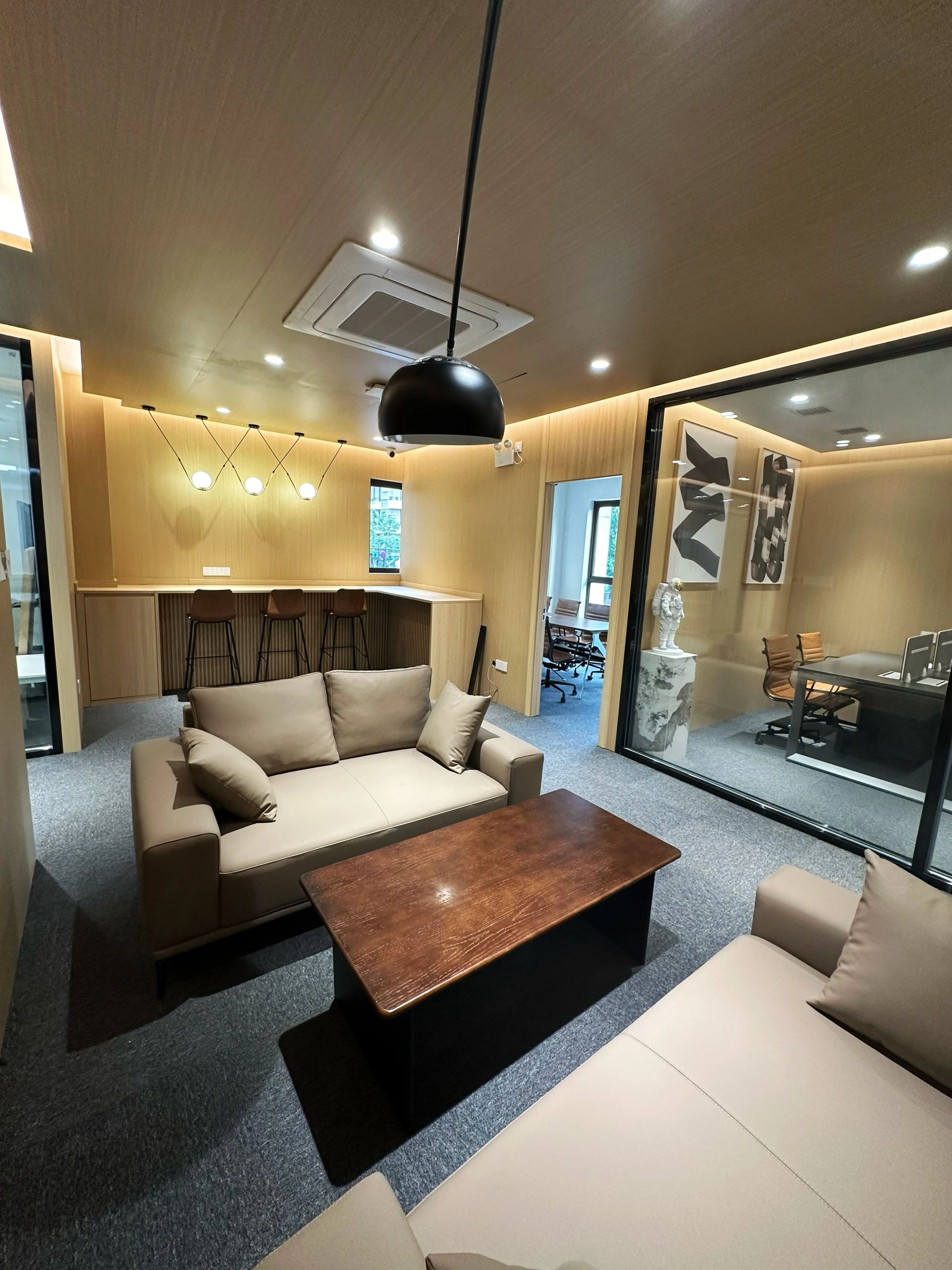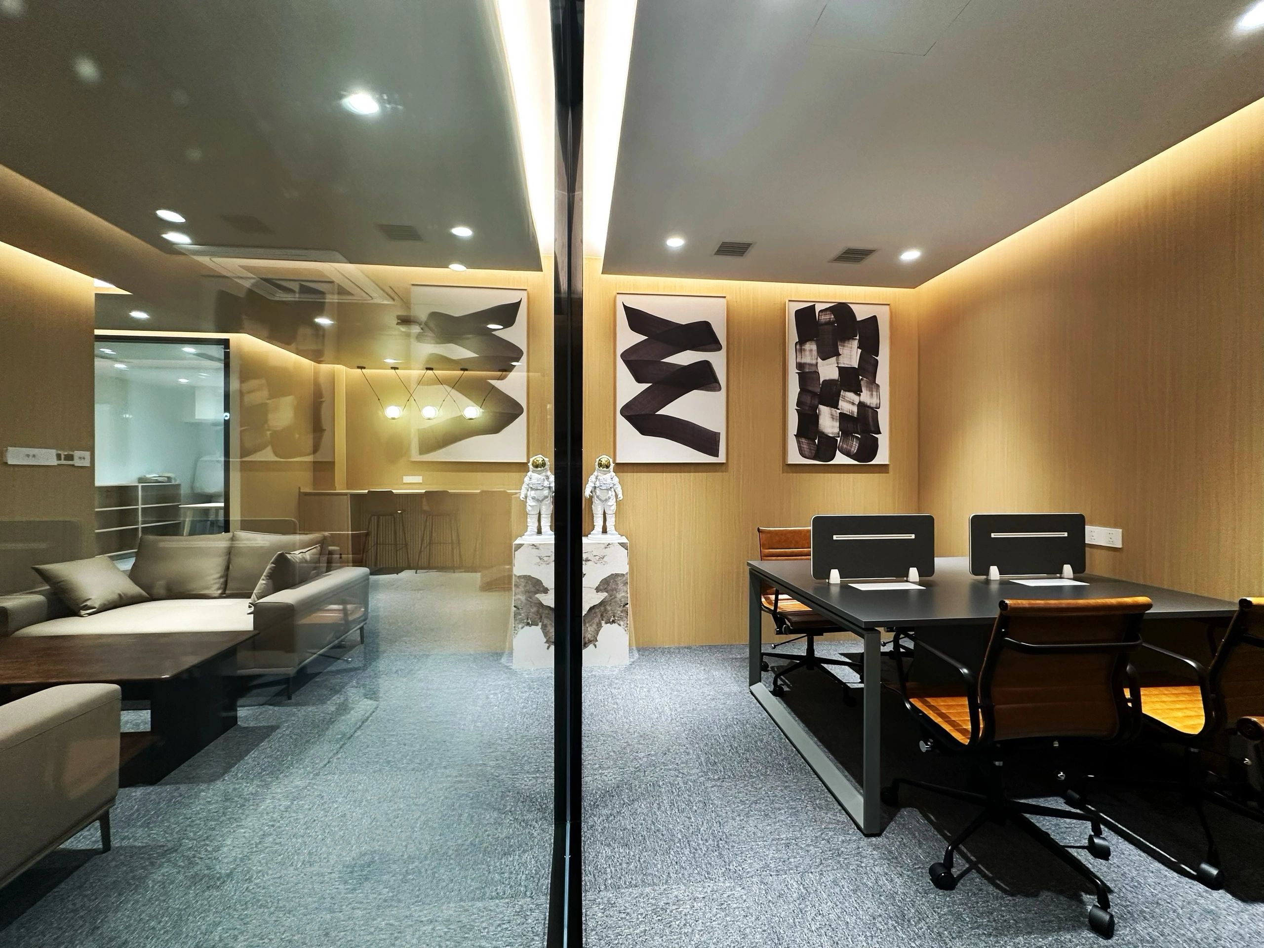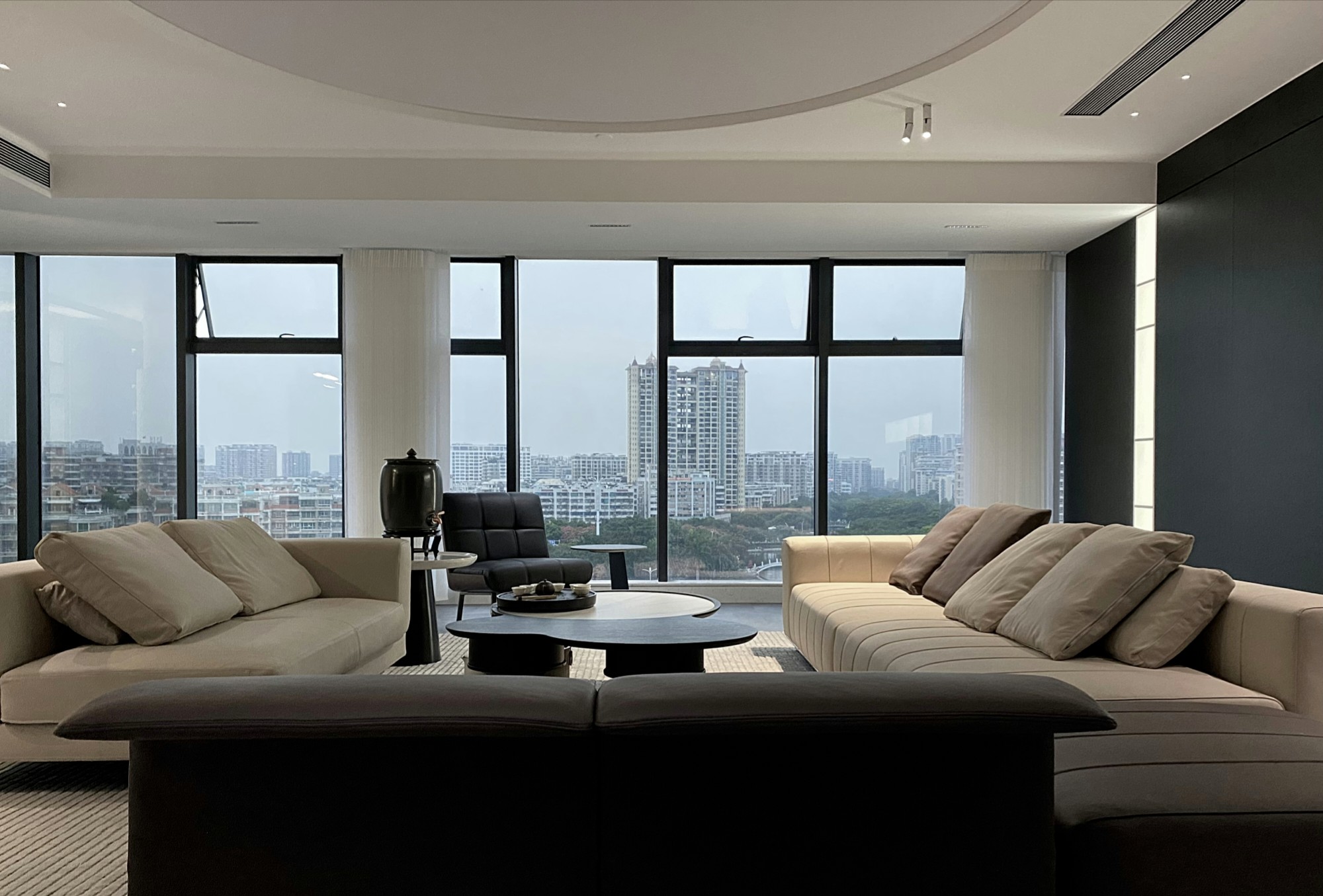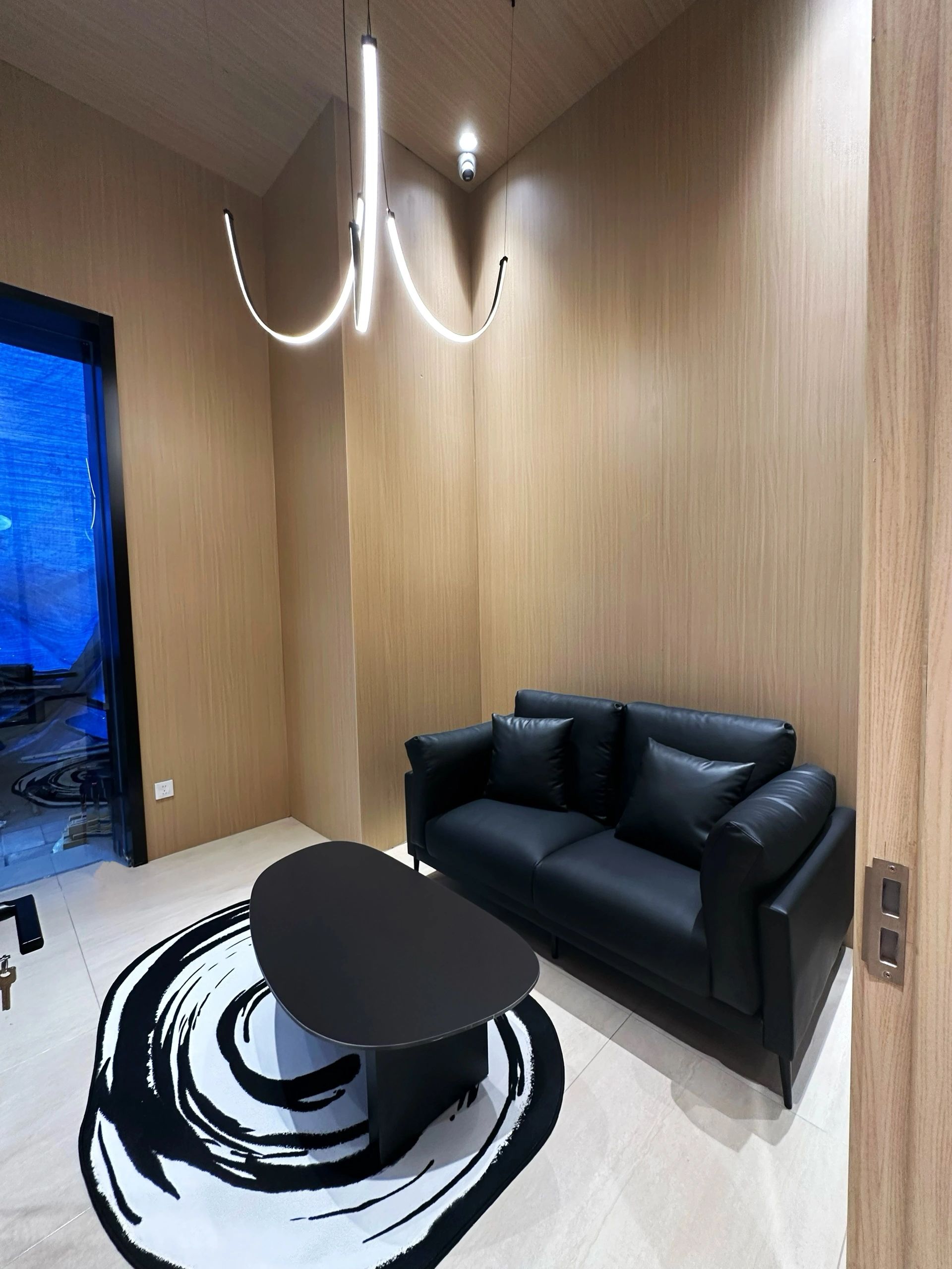 构筑三段式旋转结构,闭合时形成安静的立面背景,分隔了会客区和会议室,转开时可以随意调节开合面积,把控着空间的边界感,满足多样化的场景需求。黑色系桌椅从材质的高级感入手,抒发敛中有奢的气质。设置观影区,优化了会议讨论的氛围与效率。