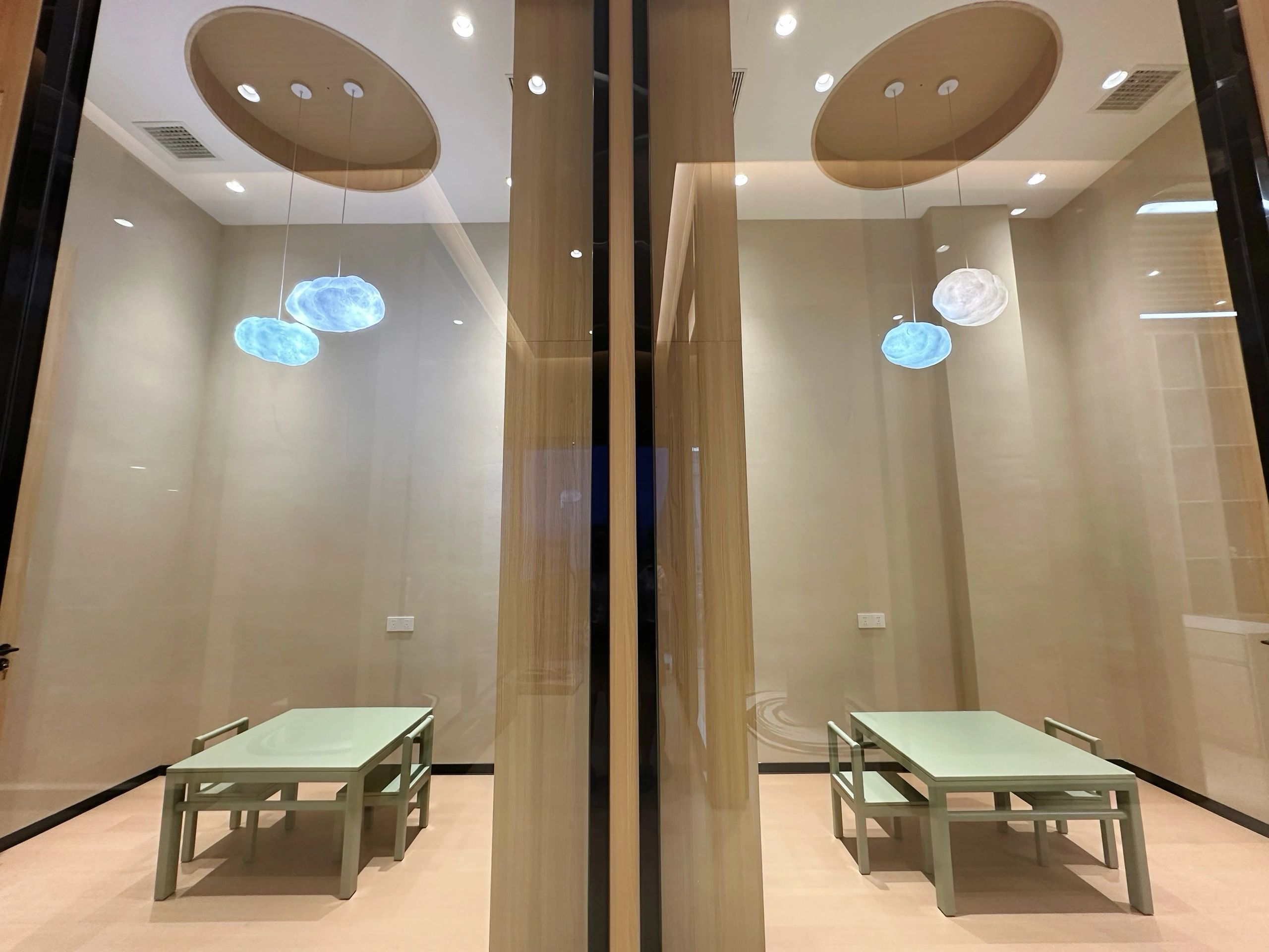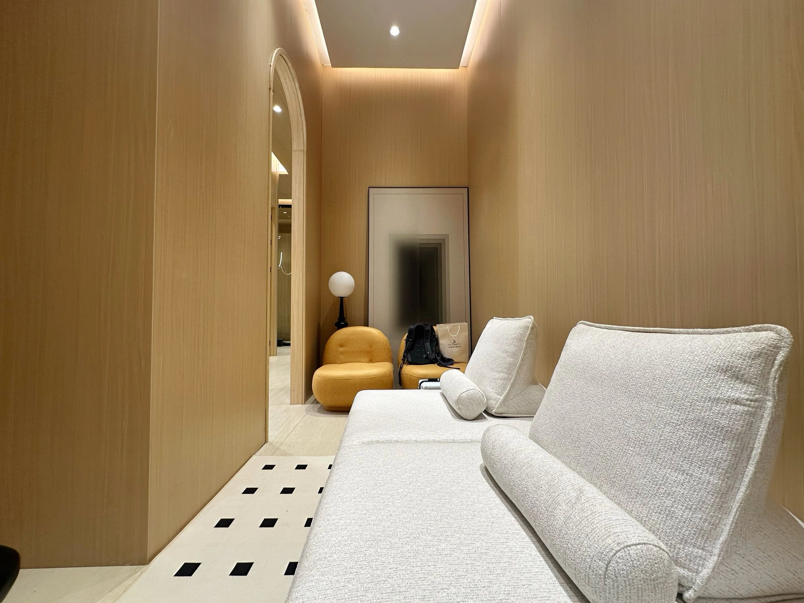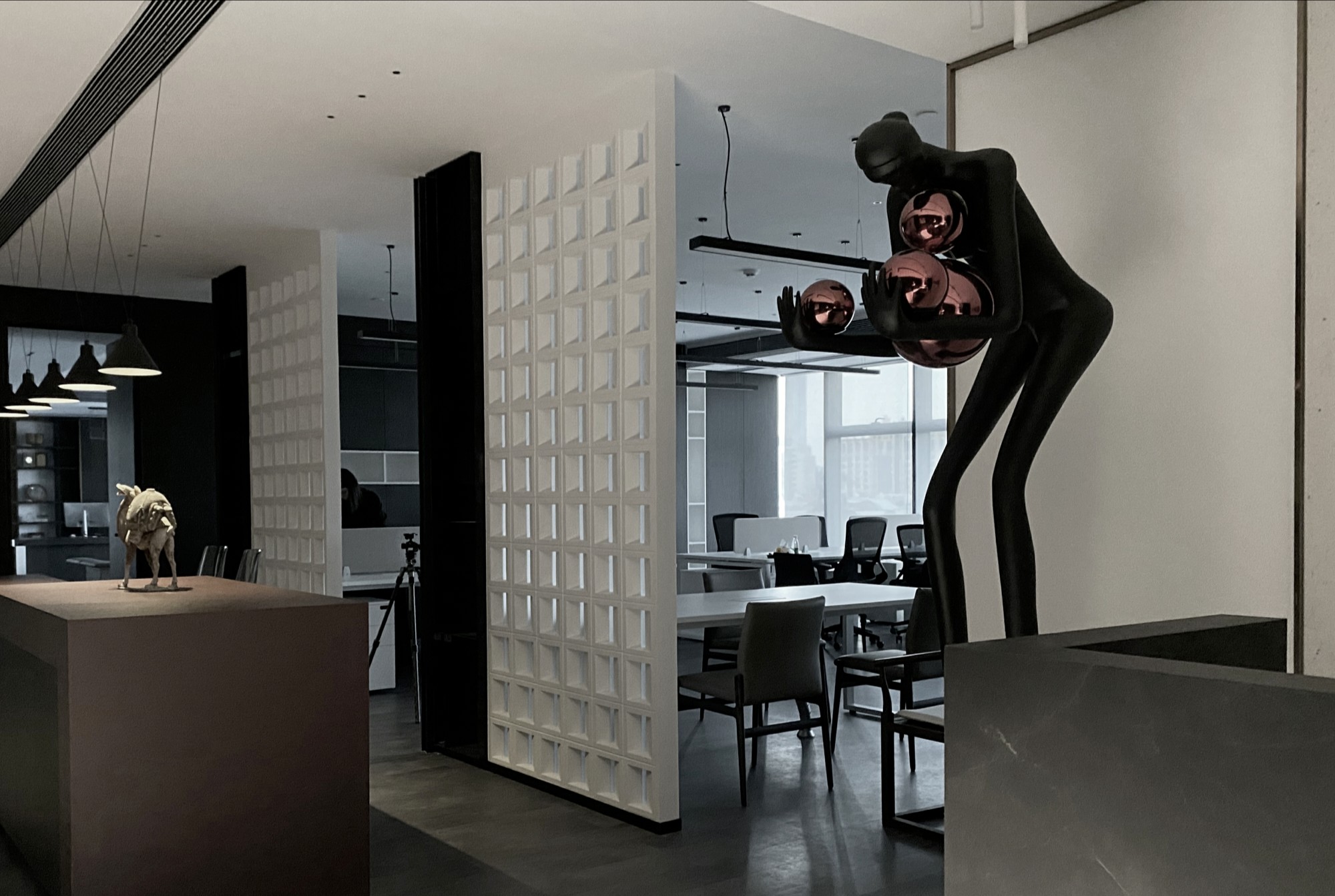 现代简约,重视多重功能的融合,主张场域互动的灵活性,光色、温度、质感,打造景别相互渗透也各自独立的关系。用独特的“时间感”和视觉冲击力,造就空间调性的“内在循环”。塑造空间的初印象,具象化主客交流的场景,在独立片区中排布黑白色块,彰示贯穿整体的美学基调。留白“帷幕”负责嫁接场景两端,人形雕塑显示出艺术表达,用色泽蔓延出温暖,为向内的叙事进行层层铺垫。