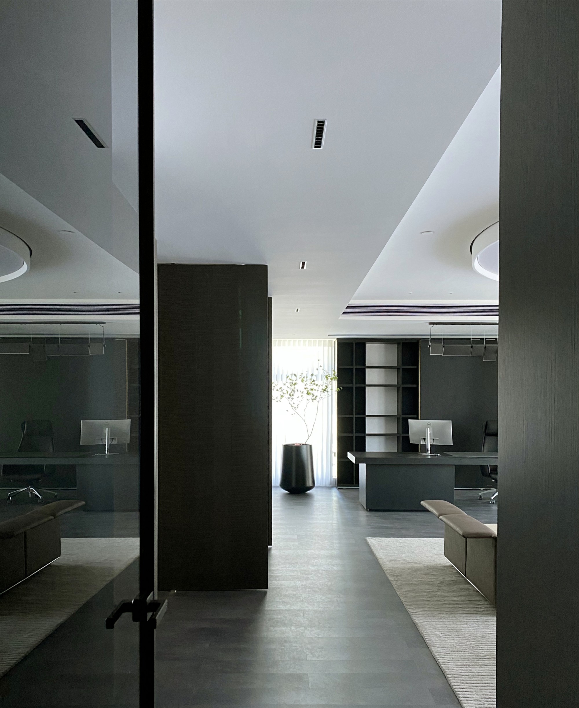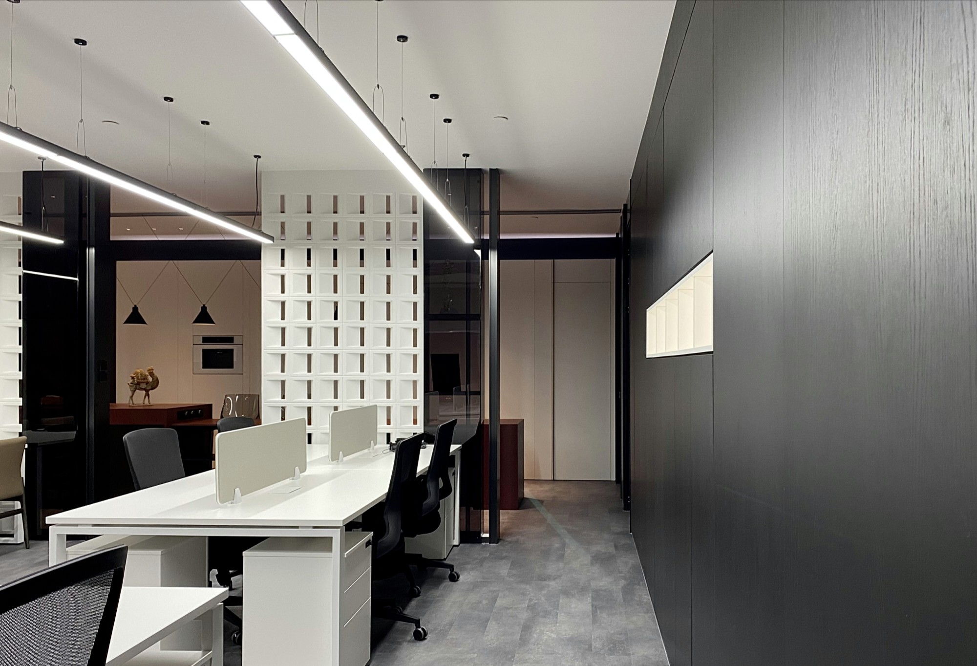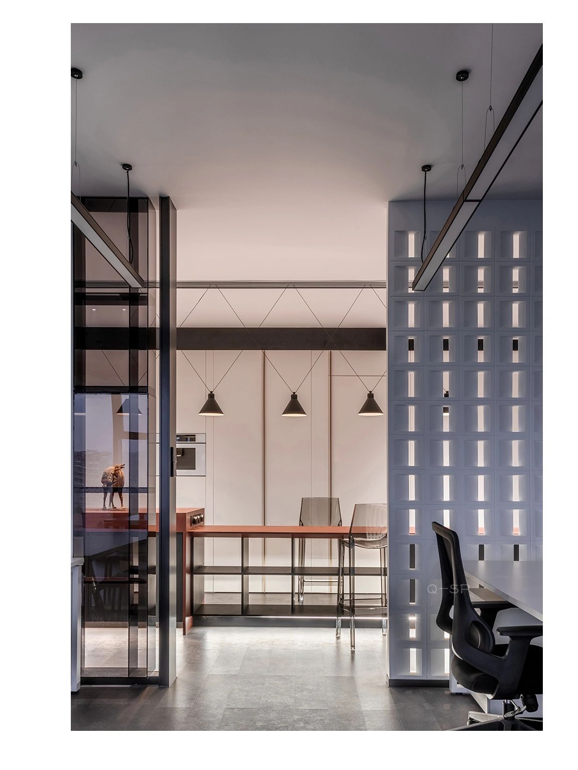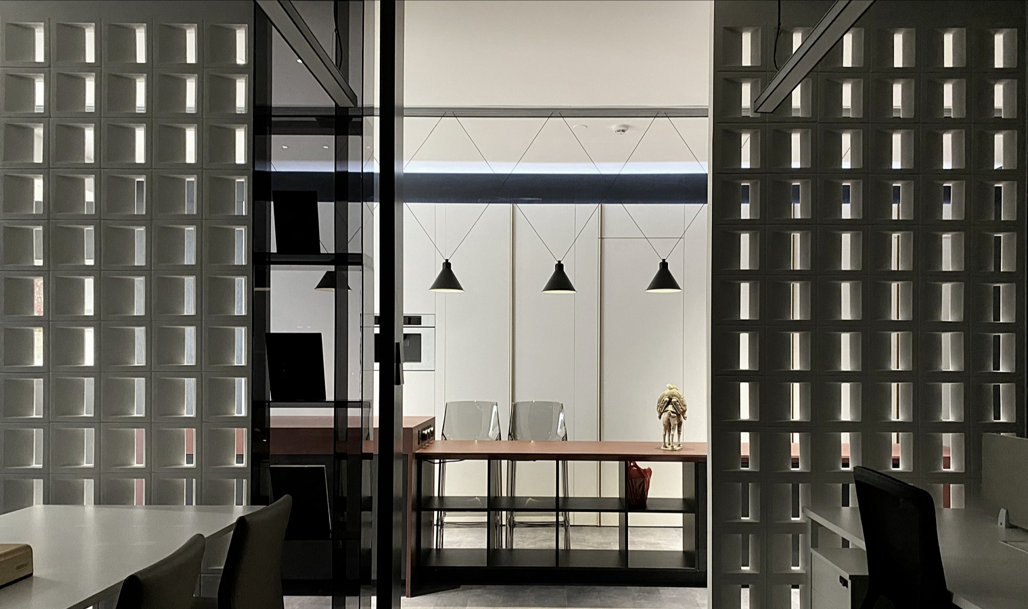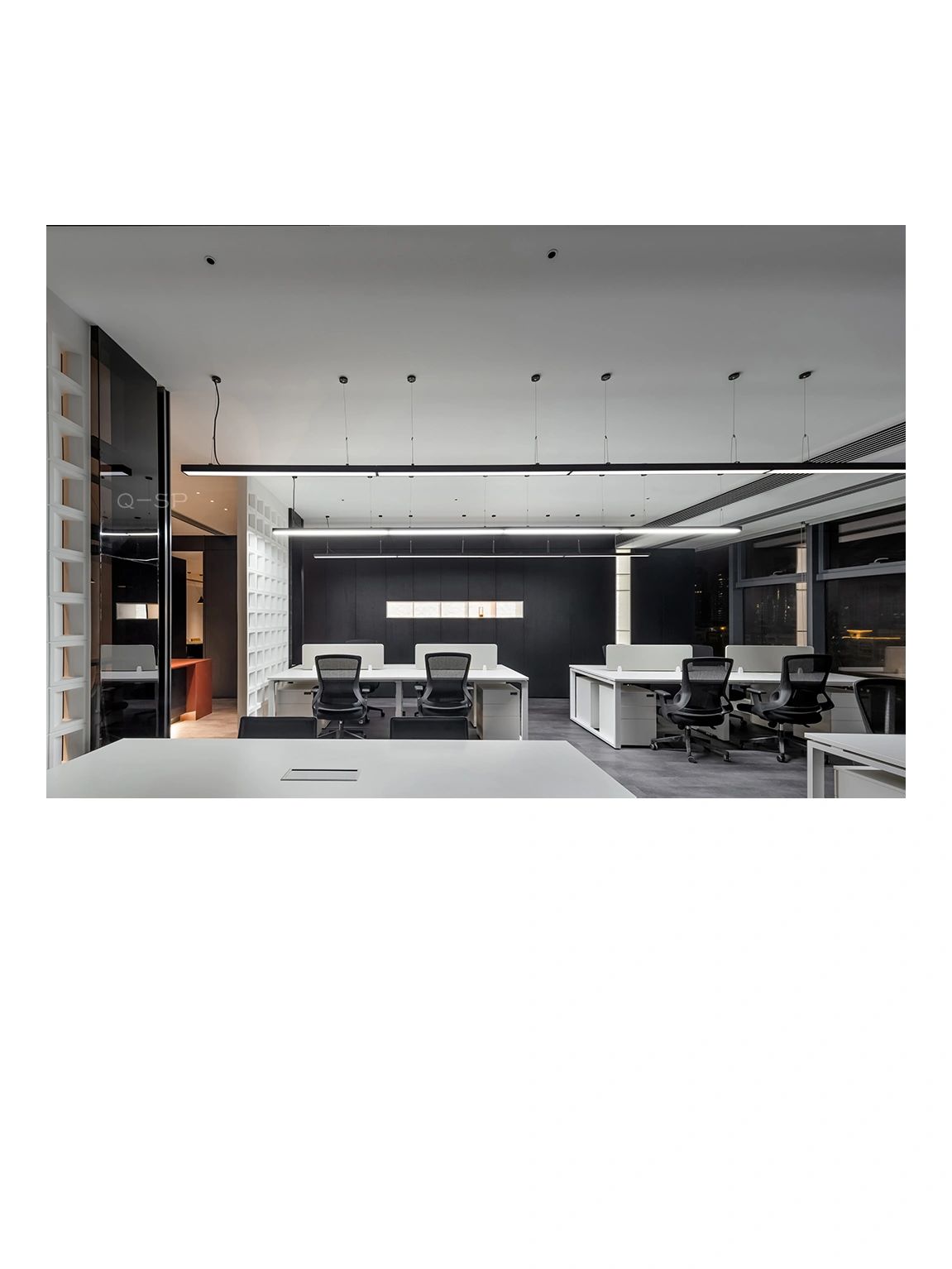 原入口通达过长,故而将选料台放在通道区域,化劣为优,甄选别致罕见的红色岩板,在黑白基调的空间形成鲜明的视觉对比。融合了深调的雅致气息与色相的跳跃感,将空间温度无声协调。一排吊灯,展开一场聚精会神的探索旅程。秩序,是空间与人深度交流的前提,依循尺度比例、隔断间奏的韵律以及合理的办公形式,呈现专业又高效的氛围。镂空元素经由立体化斜切处理,将实景与光影融为一体,使屏障式的饰面得以“呼吸”,又不显露任何形式的松散,与地面纹理对话,让诗意悄然绽放。