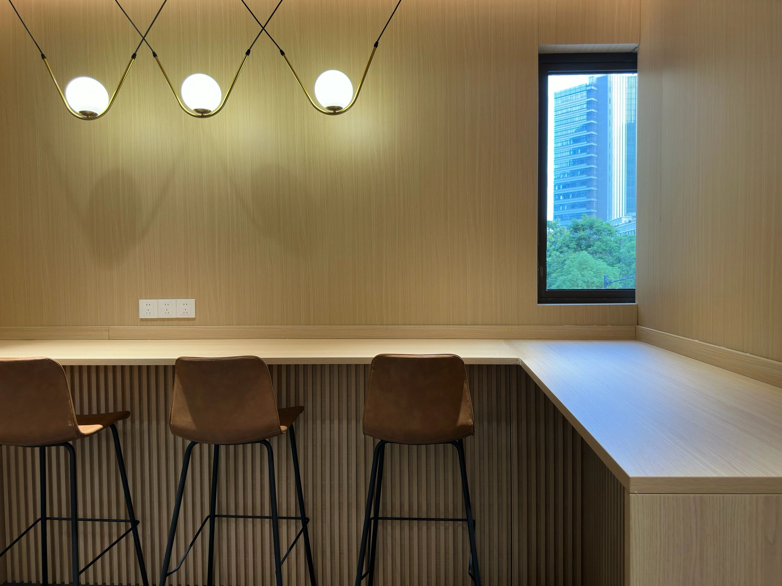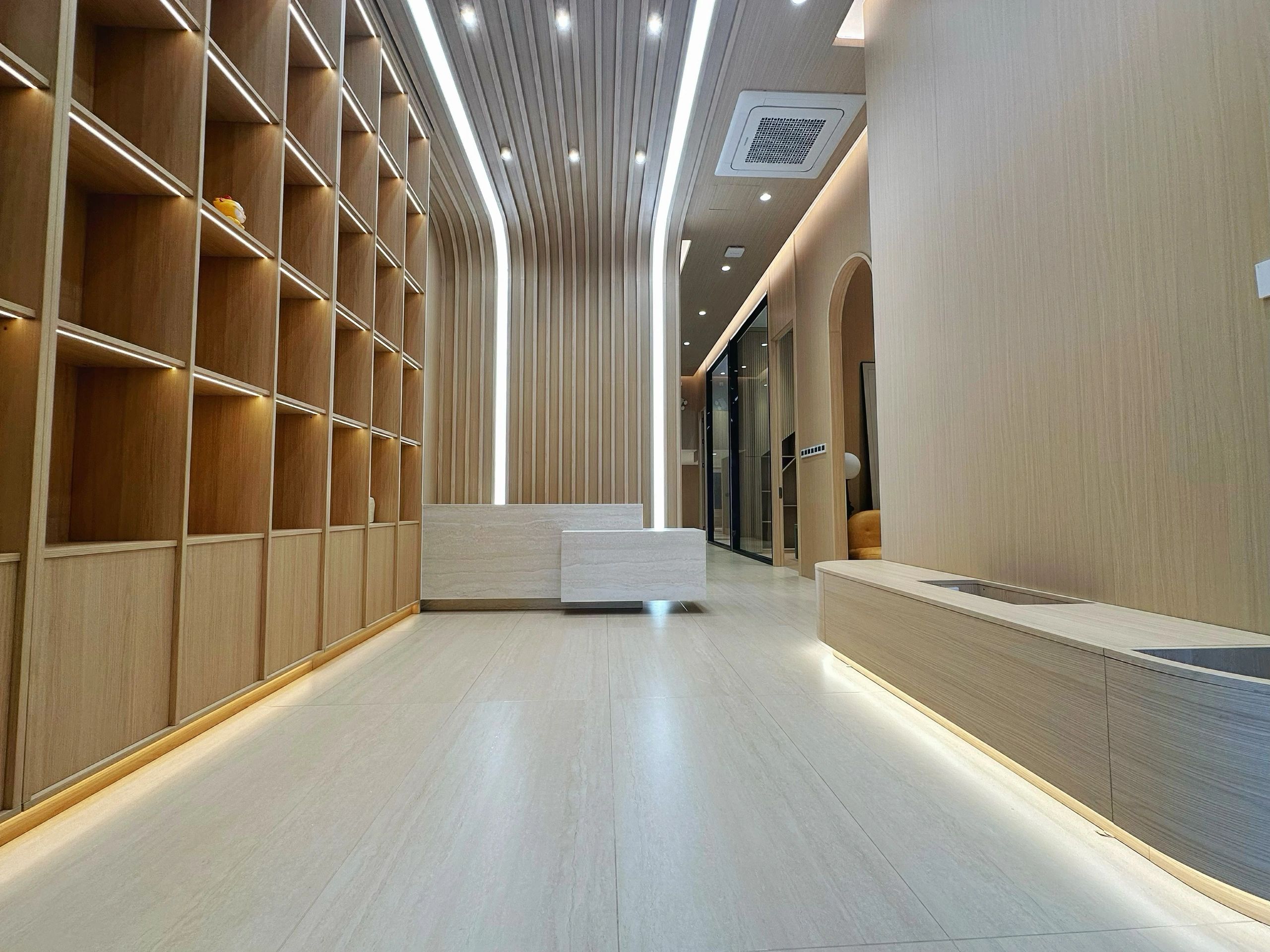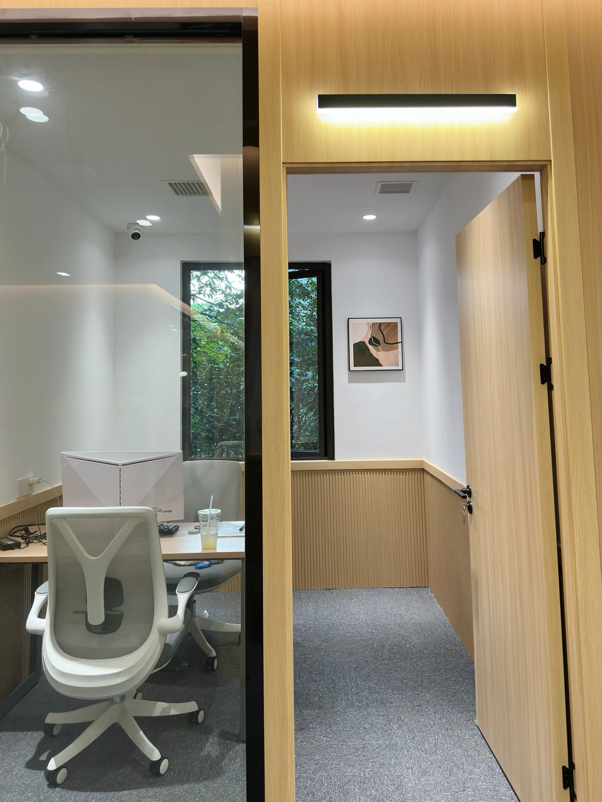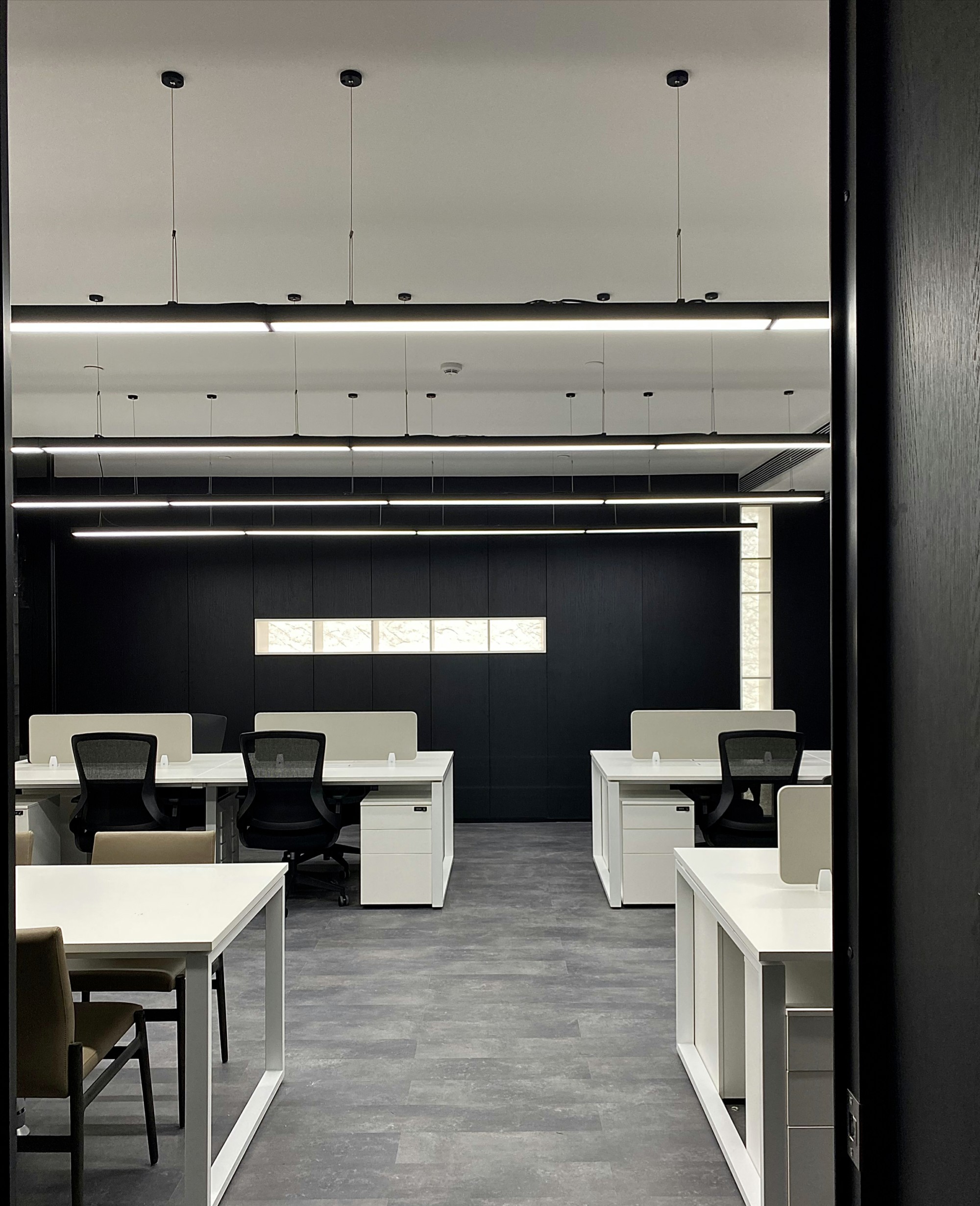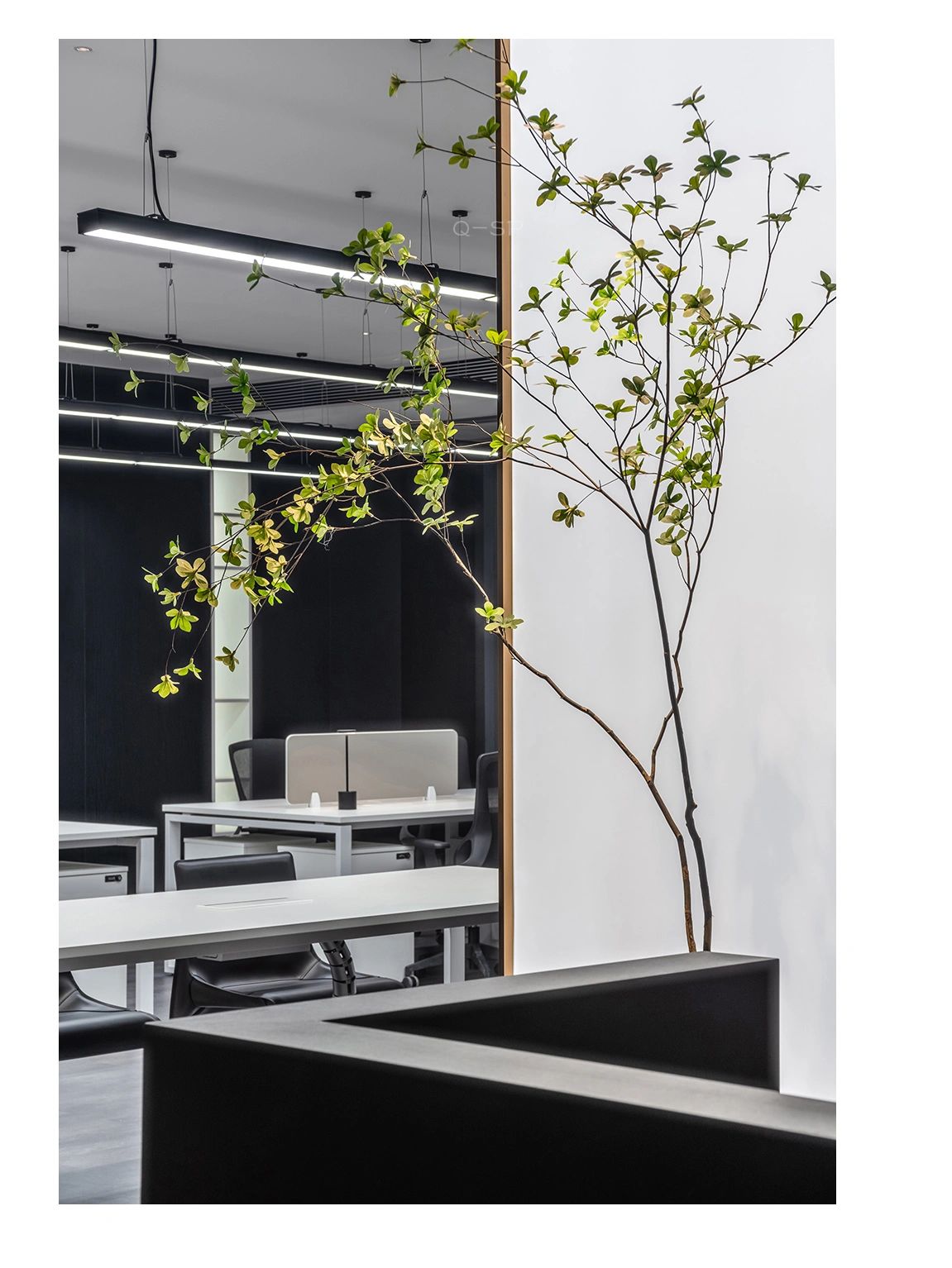 原入口通达过长,故而将选料台放在通道区域,化劣为优,甄选别致罕见的红色岩板,在黑白基调的空间形成鲜明的视觉对比。融合了深调的雅致气息与色相的跳跃感,将空间温度无声协调。一排吊灯,展开一场聚精会神的探索旅程。秩序,是空间与人深度交流的前提,依循尺度比例、隔断间奏的韵律以及合理的办公形式,呈现专业又高效的氛围。镂空元素经由立体化斜切处理,将实景与光影融为一体,使屏障式的饰面得以“呼吸”,又不显露任何形式的松散,与地面纹理对话,让诗意悄然绽放。