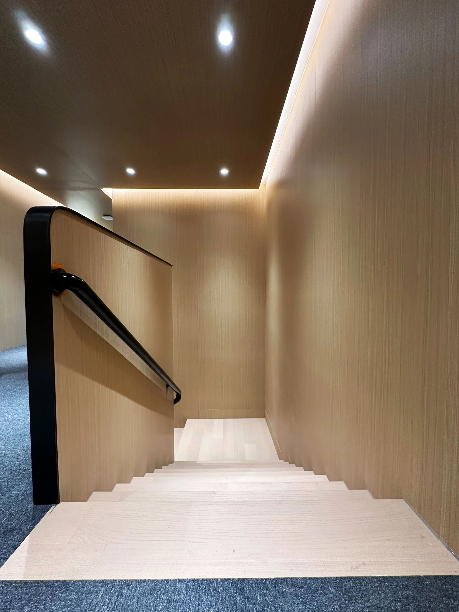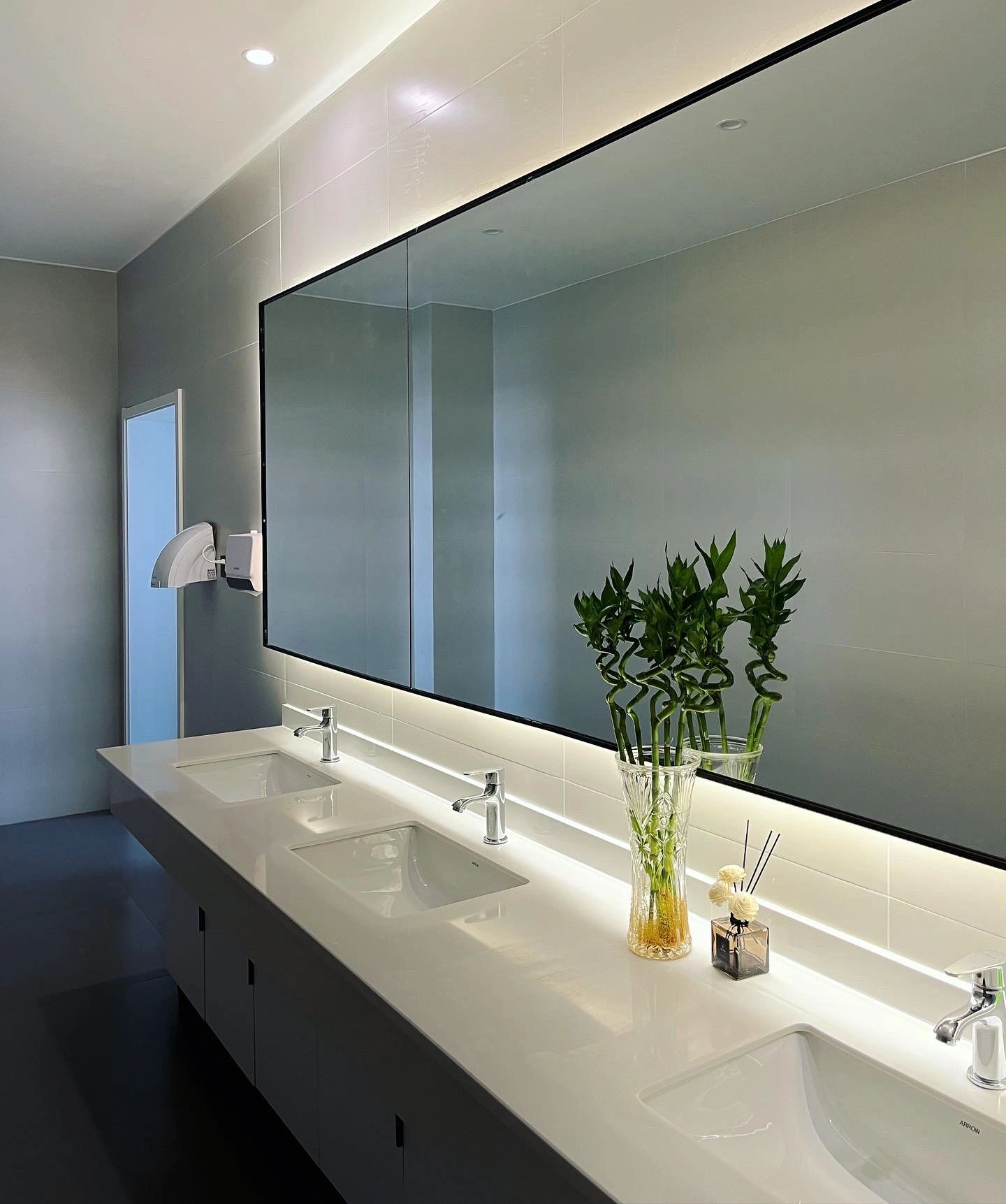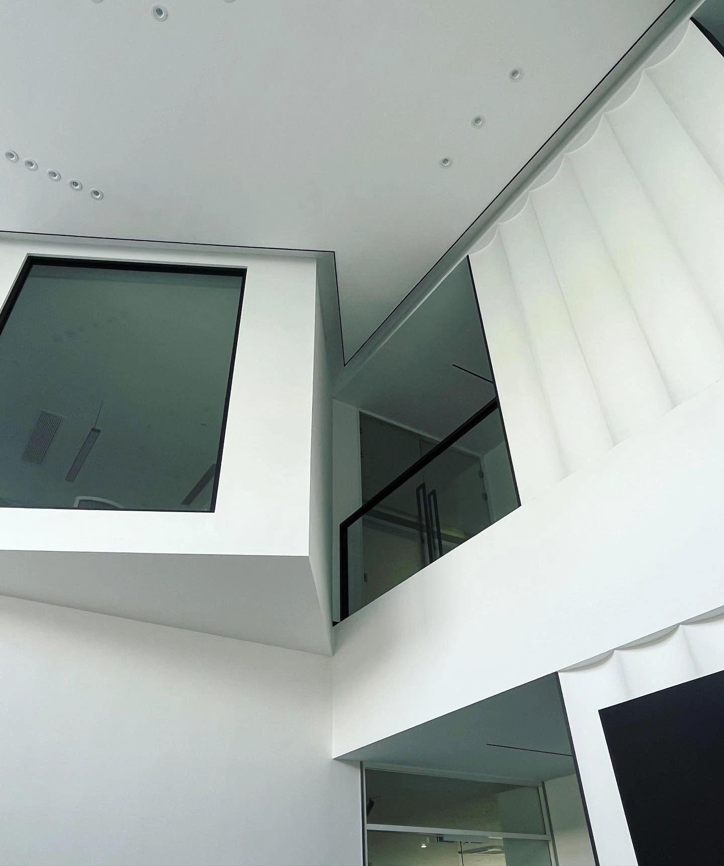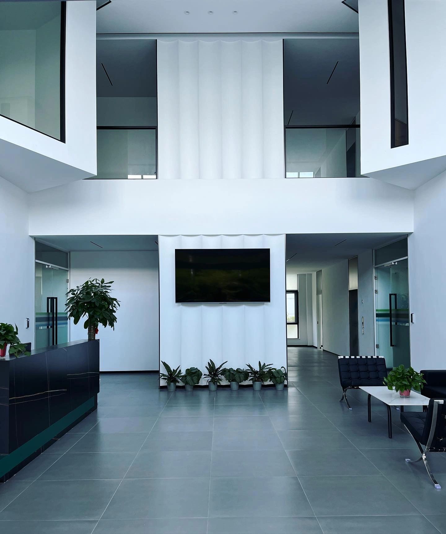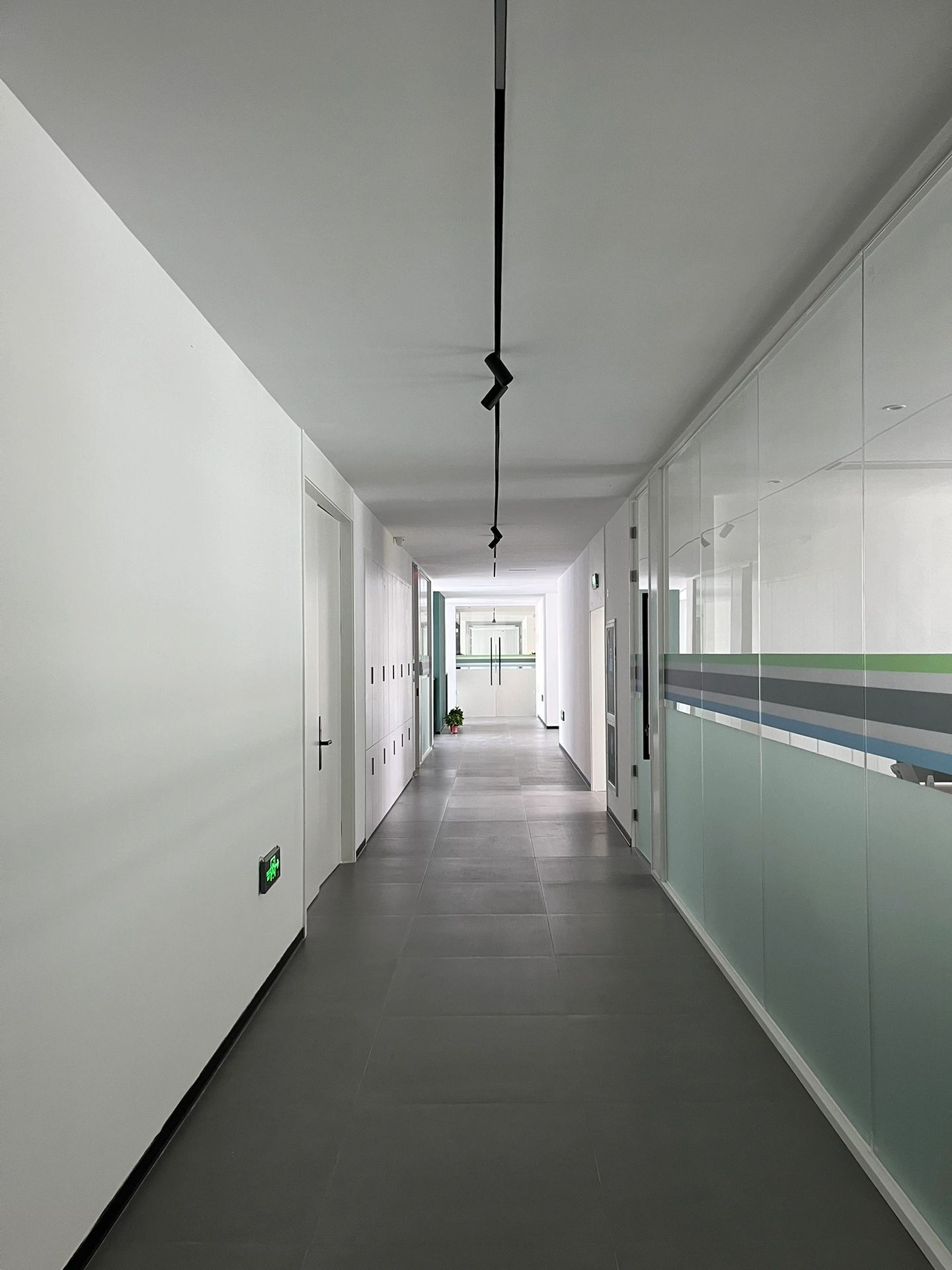 原入口通达过长,故而将选料台放在通道区域,化劣为优,甄选别致罕见的红色岩板,在黑白基调的空间形成鲜明的视觉对比。融合了深调的雅致气息与色相的跳跃感,将空间温度无声协调。一排吊灯,展开一场聚精会神的探索旅程。秩序,是空间与人深度交流的前提,依循尺度比例、隔断间奏的韵律以及合理的办公形式,呈现专业又高效的氛围。镂空元素经由立体化斜切处理,将实景与光影融为一体,使屏障式的饰面得以“呼吸”,又不显露任何形式的松散,与地面纹理对话,让诗意悄然绽放。