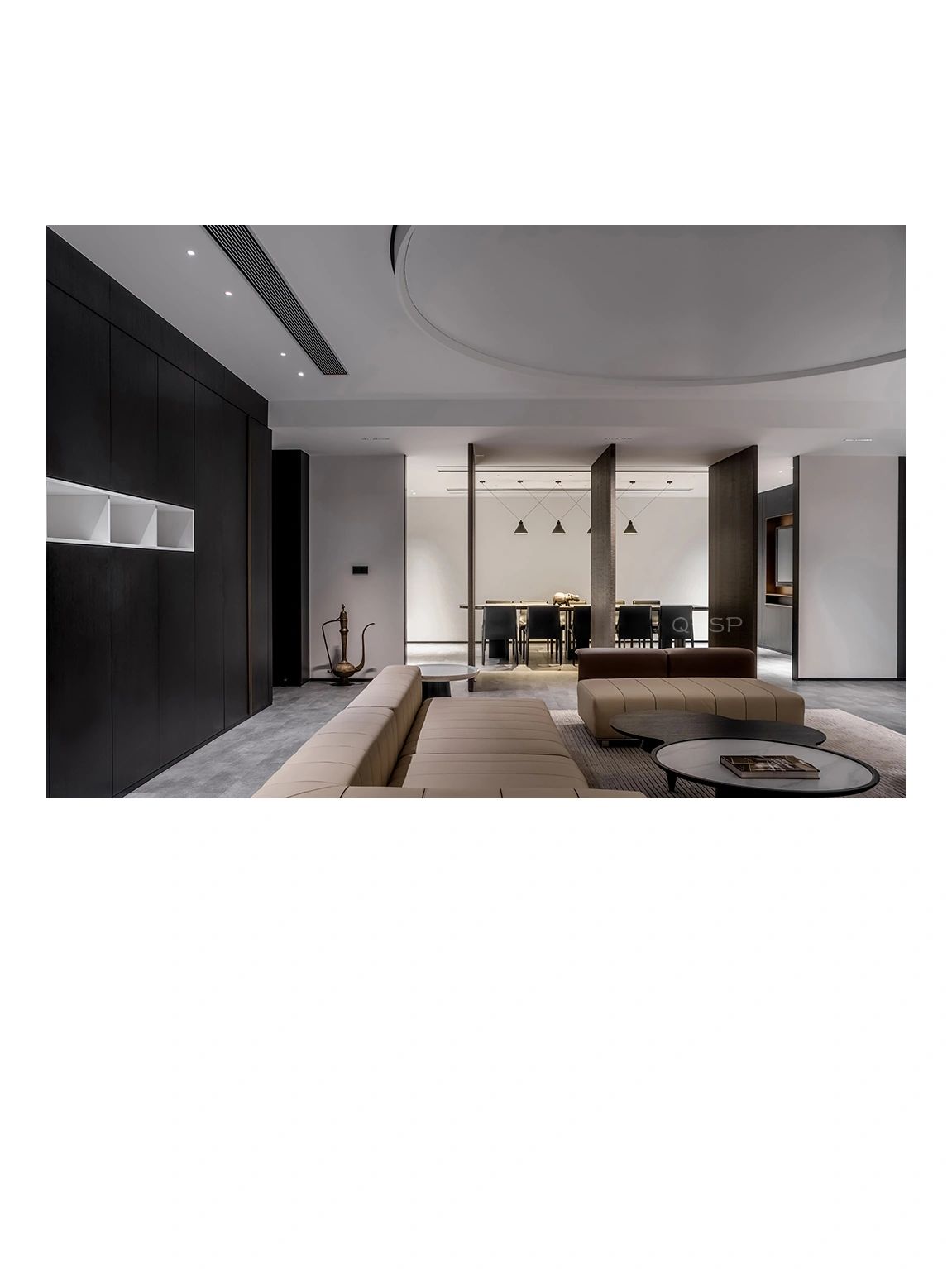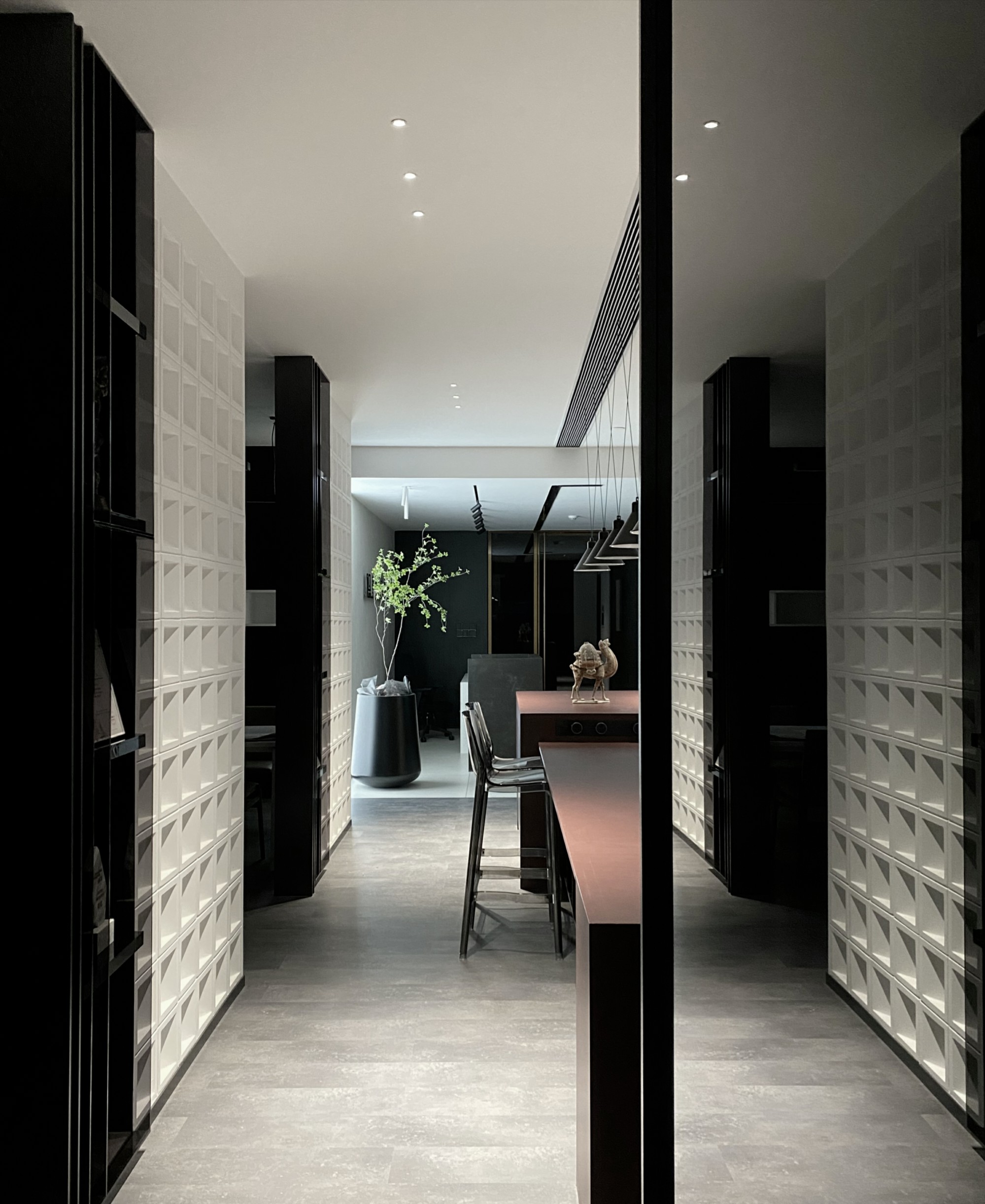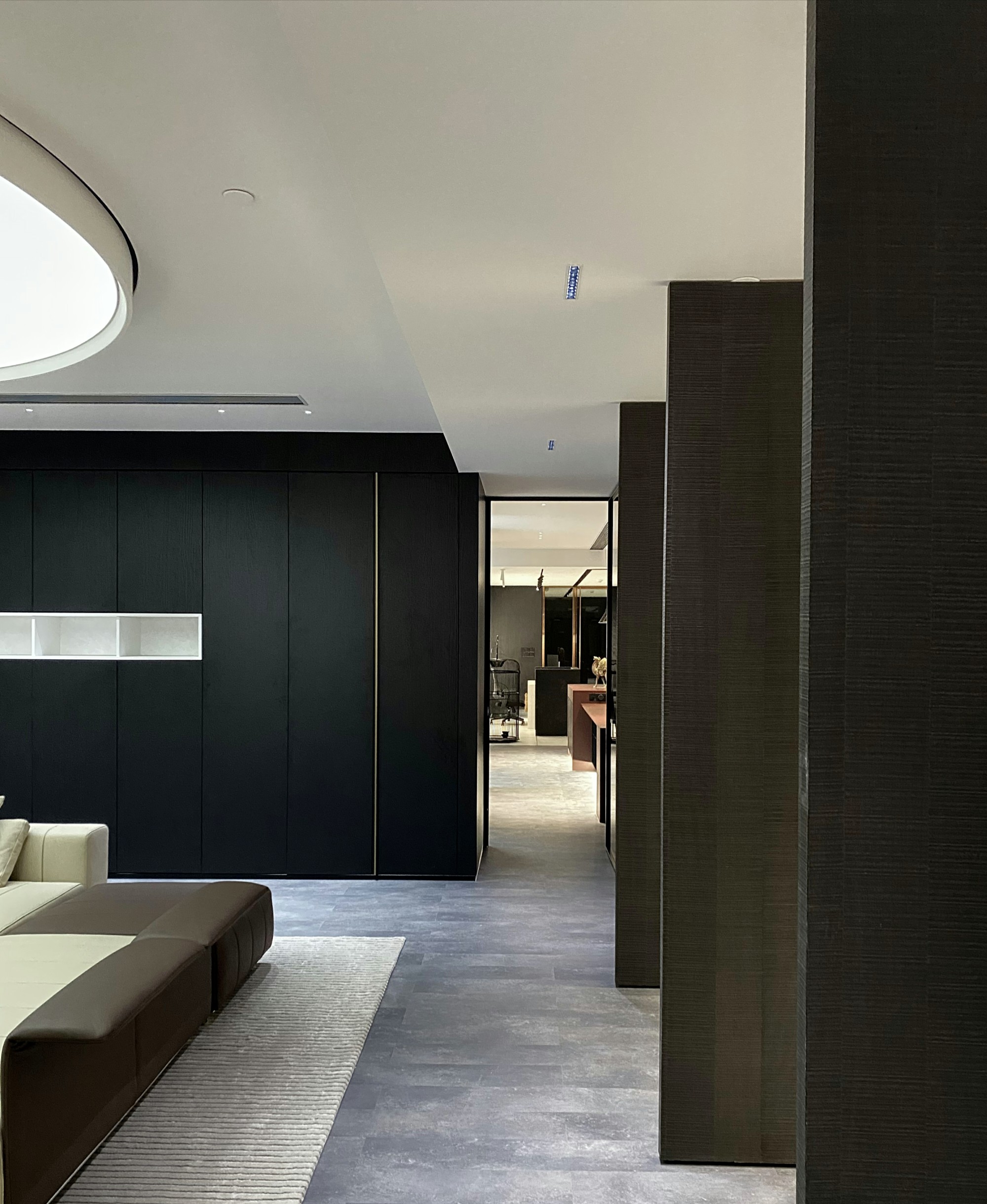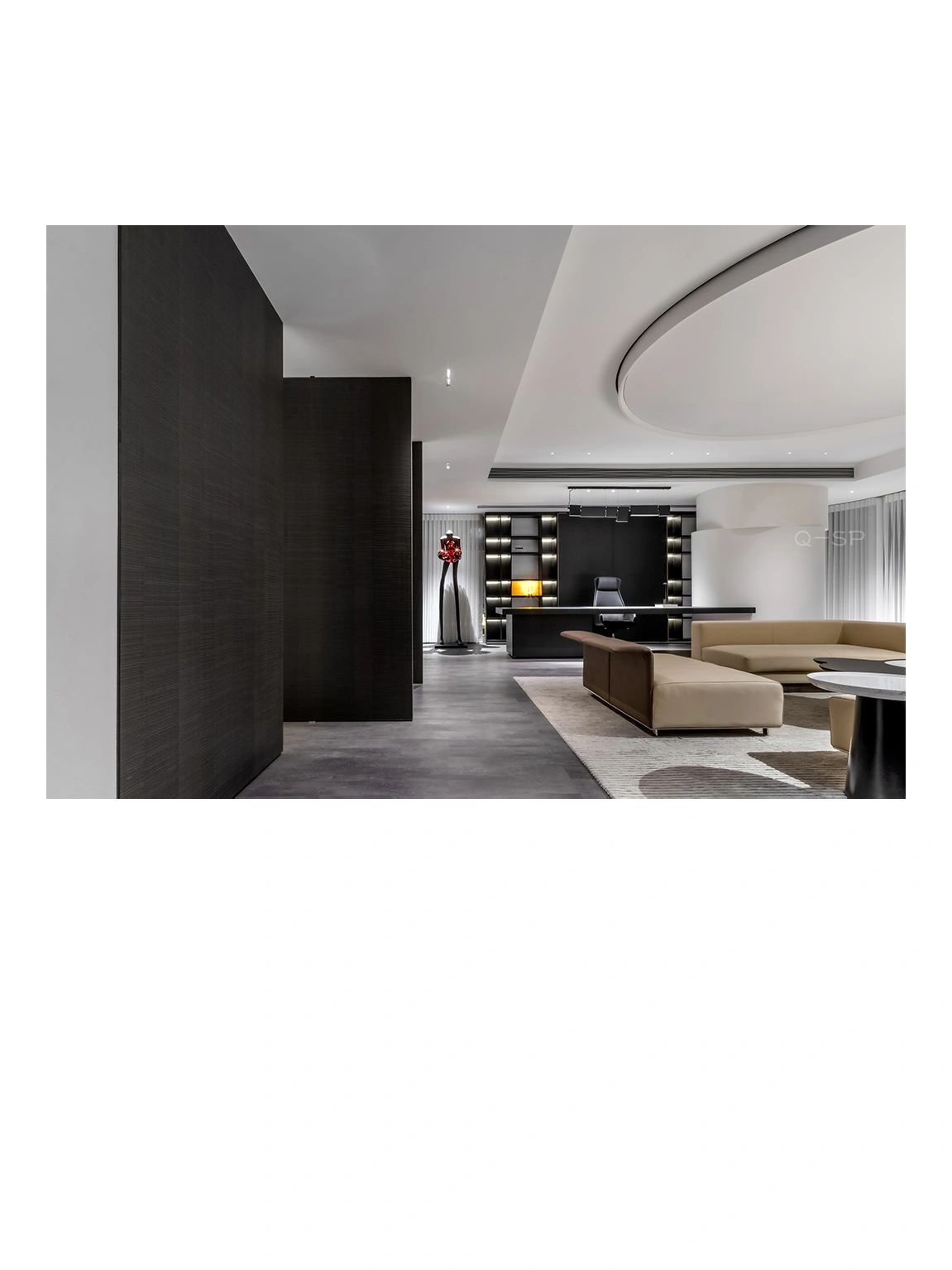 平面结合曲面的柱式,按照上短下长的形态展现错置的意趣,从而将人的目光吸引,一陈一设都被渲染了富有态度的黑色,隐没于空间侧旁,不会影响会客区的正常运行,也能独享一隅的安静氛围。
