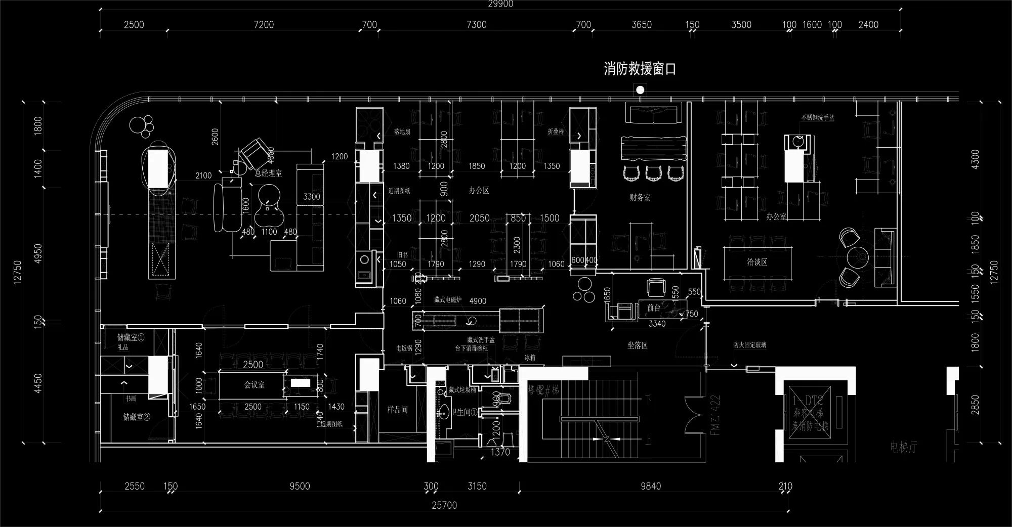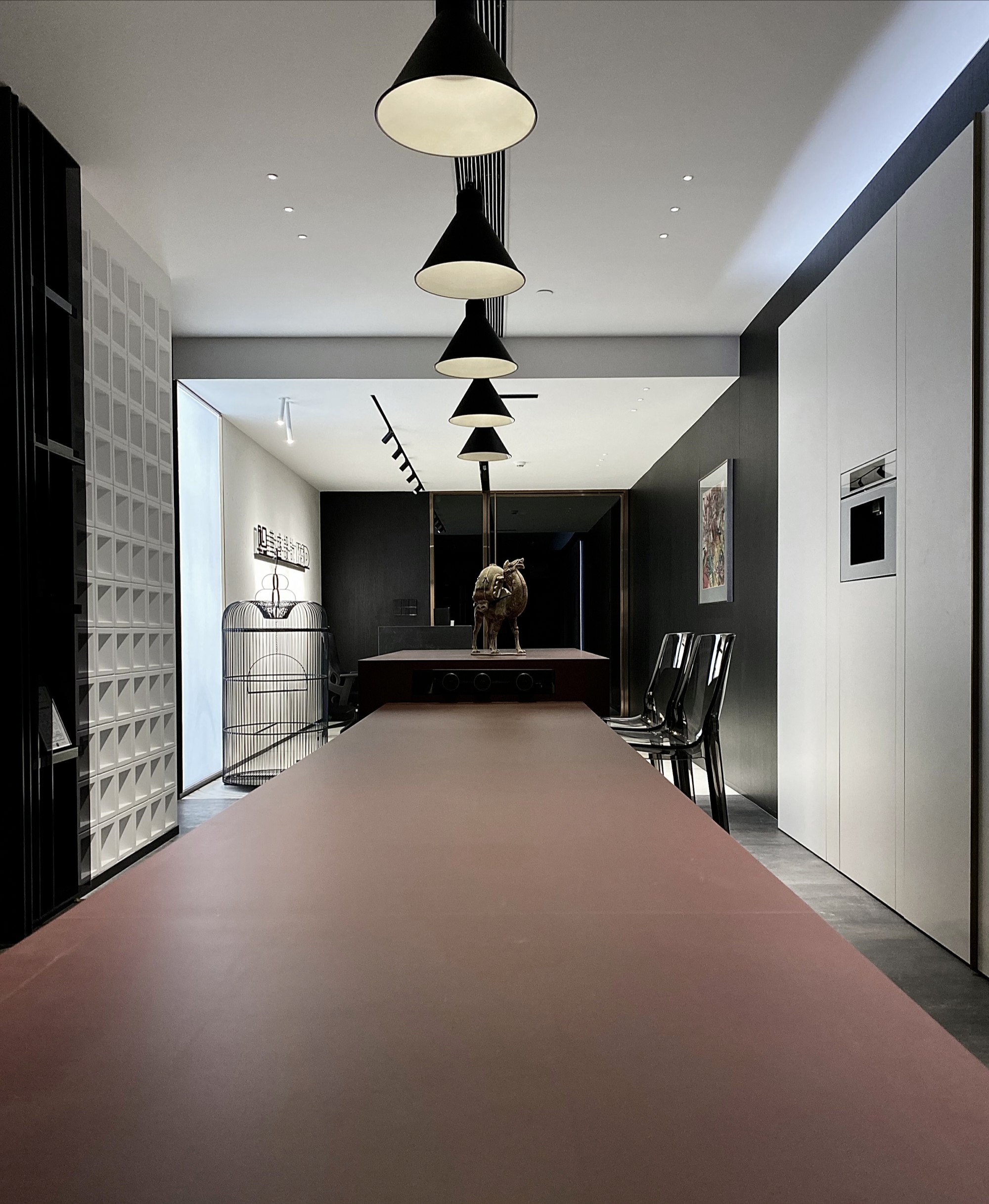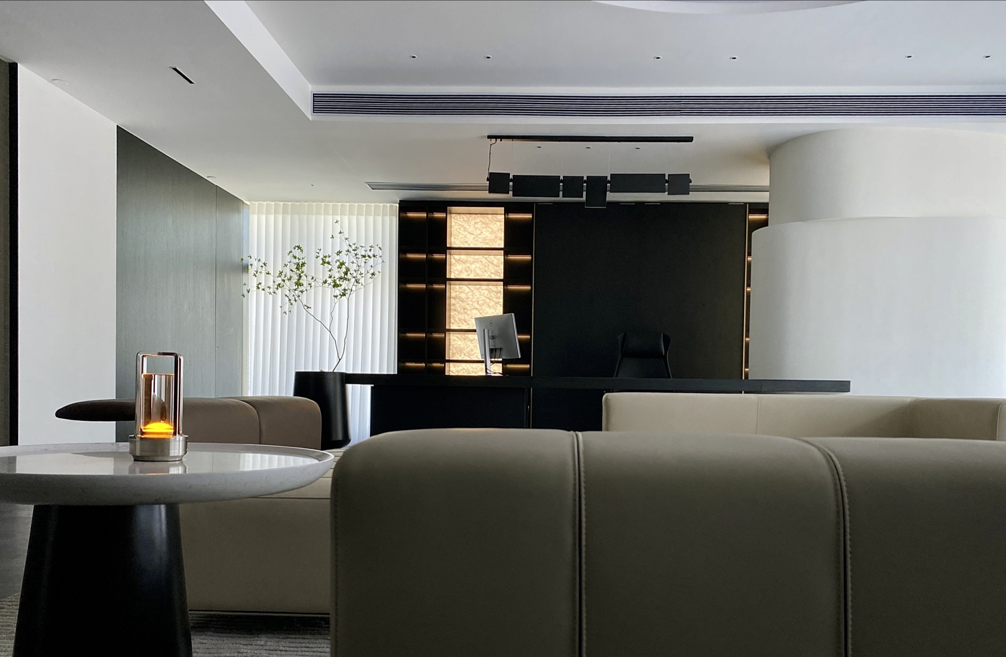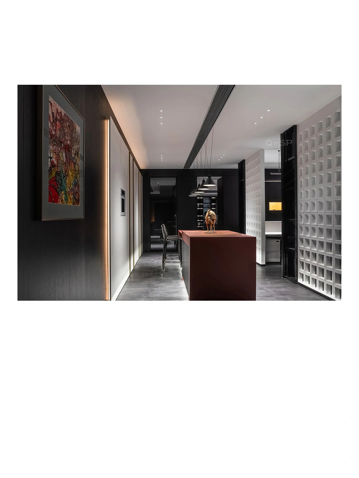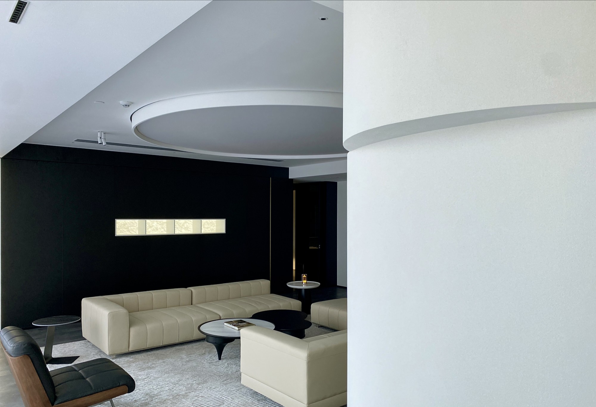 平面结合曲面的柱式,按照上短下长的形态展现错置的意趣,从而将人的目光吸引,一陈一设都被渲染了富有态度的黑色,隐没于空间侧旁,不会影响会客区的正常运行,也能独享一隅的安静氛围。