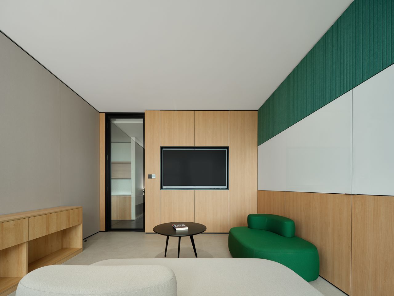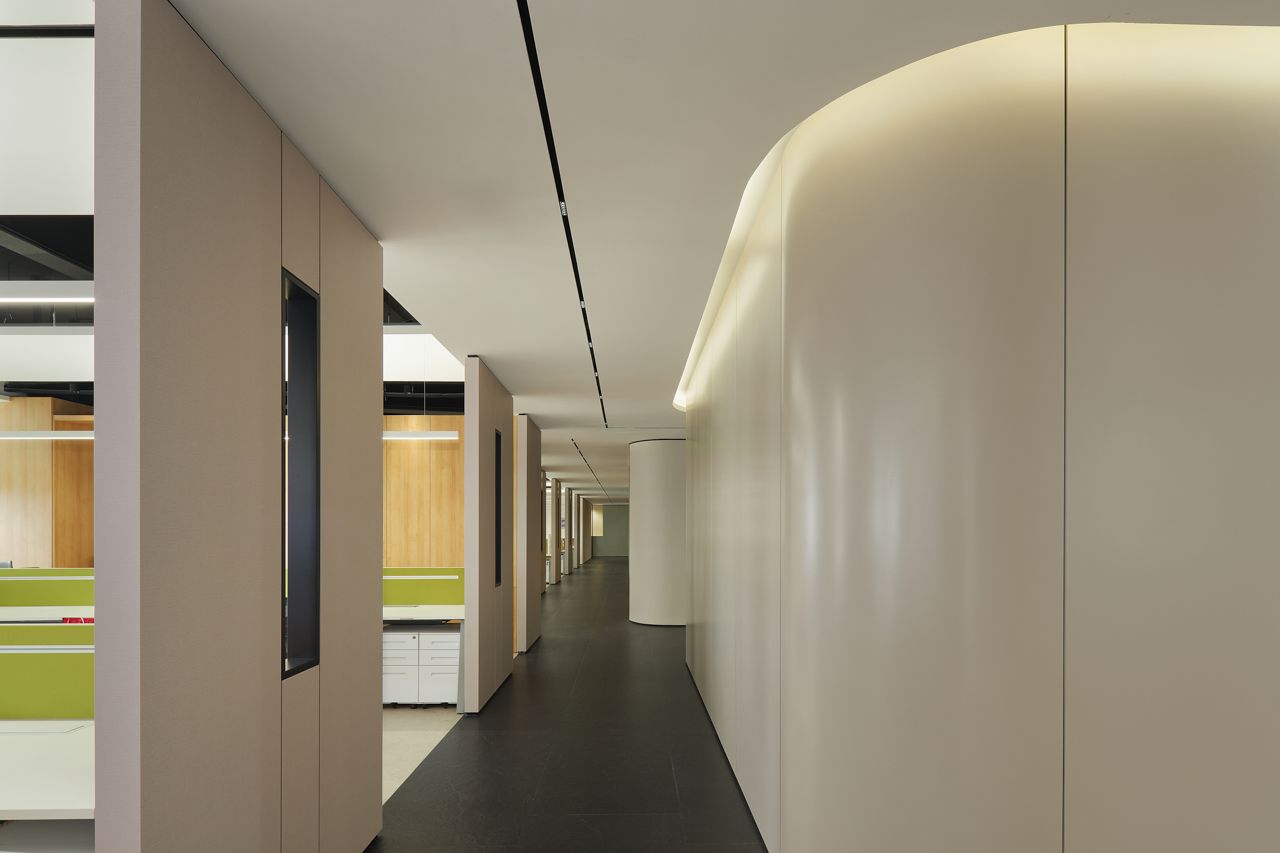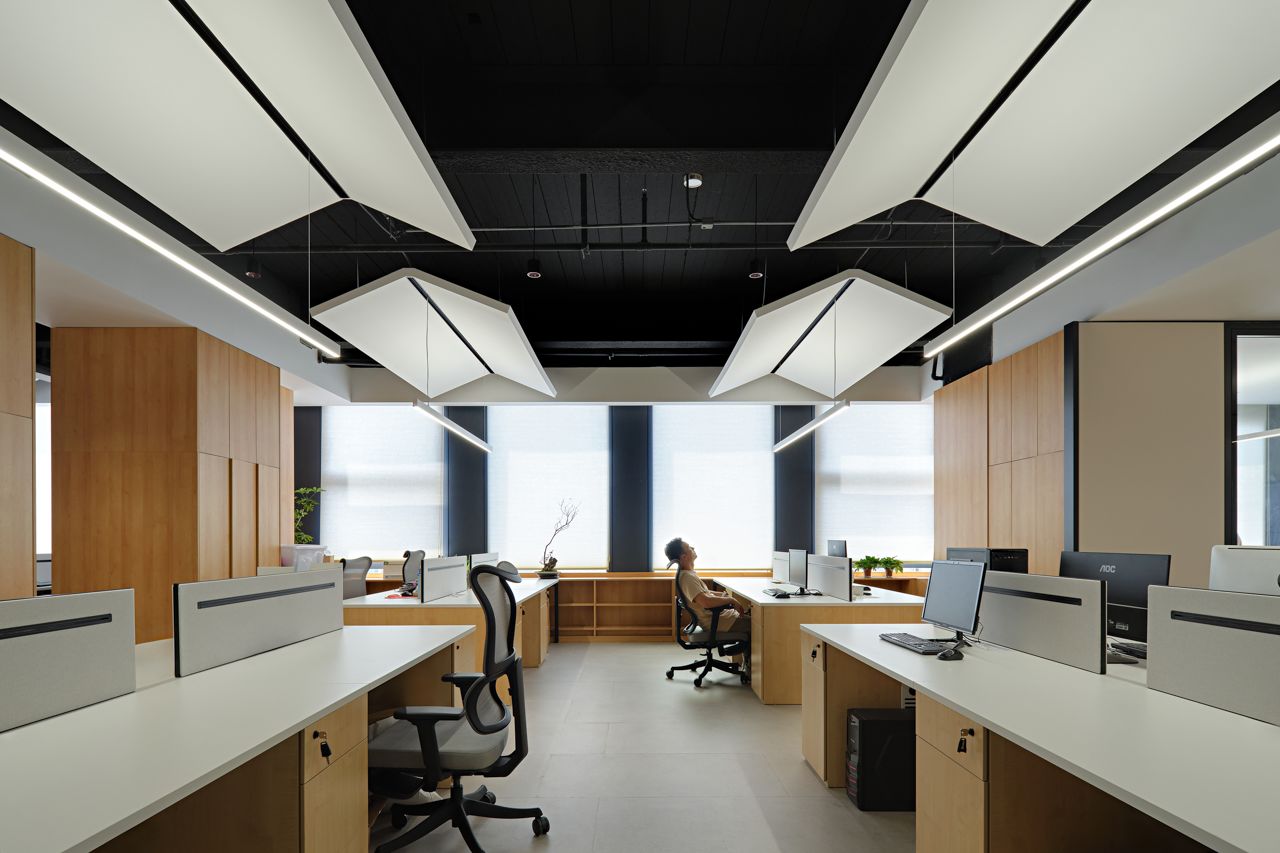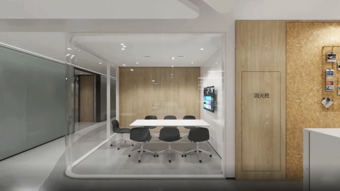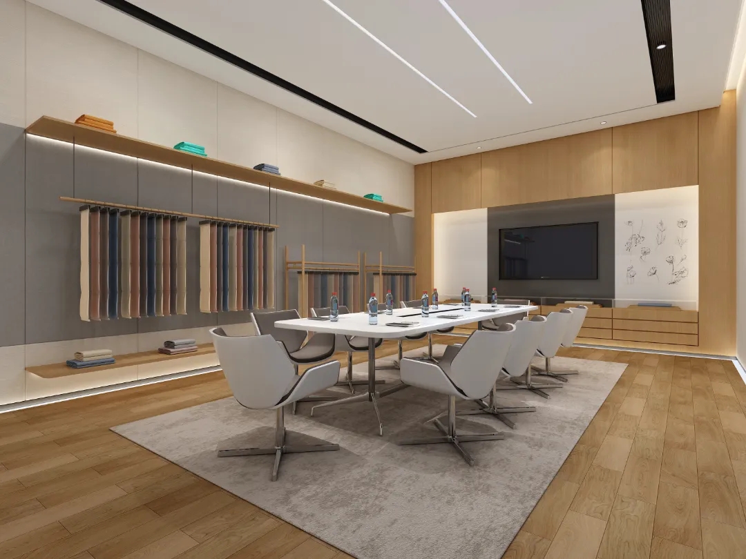 室内设置纺织品陈列区,开会和产品展示都能实现,营造了一个相对松弛舒适的会客与接待区域,同时兼具会议室功能,满足日常工作会议的办公需求。布艺展厅融合展示、销售、活动等功能于一身,高低错落的原木展架则是具有另一种具有人文和历史的质感,围绕墙面,营造出空间的自然美感和独特的气韵。