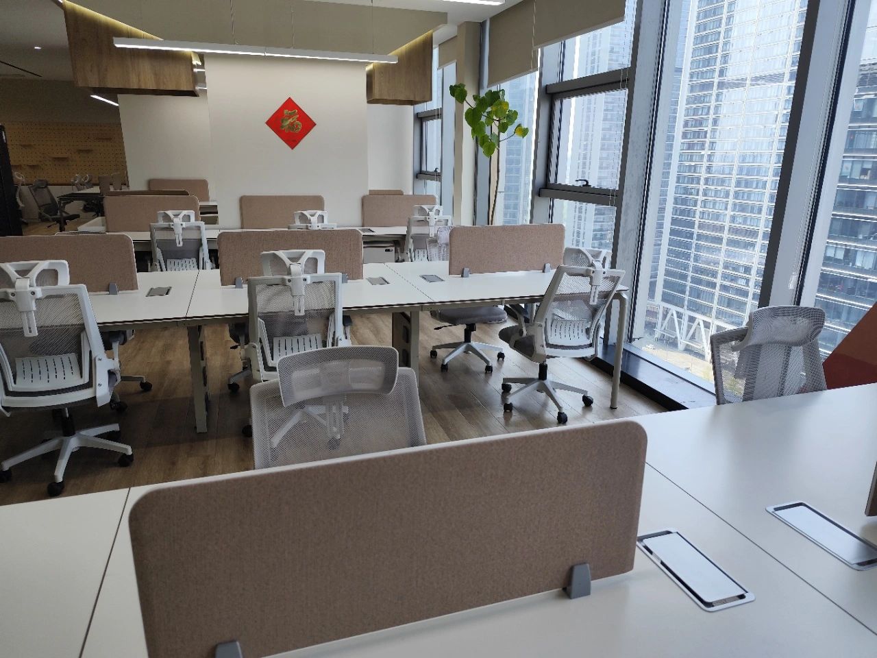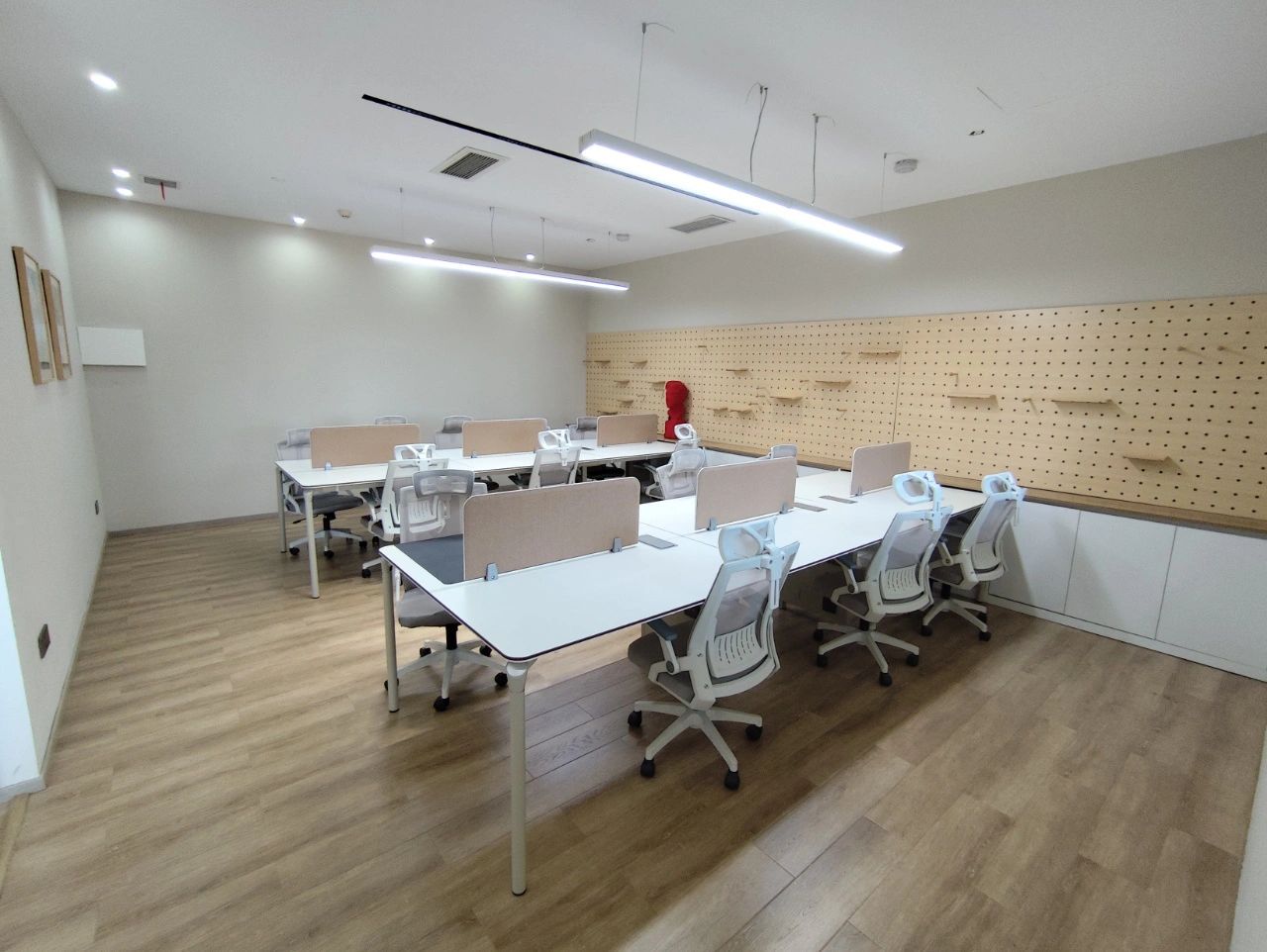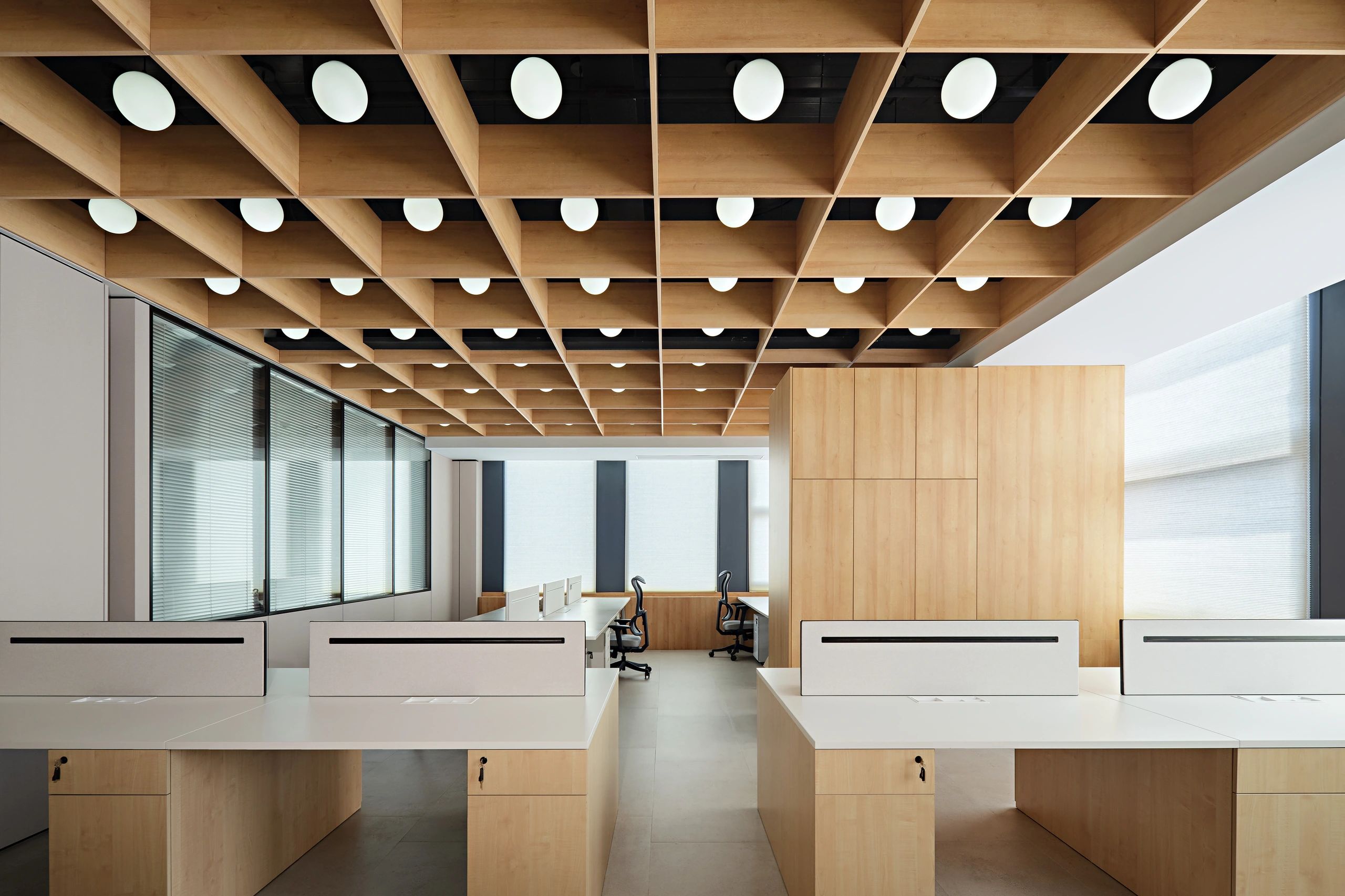室内设置纺织品陈列区,开会和产品展示都能实现,营造了一个相对松弛舒适的会客与接待区域,同时兼具会议室功能,满足日常工作会议的办公需求。布艺展厅融合展示、销售、活动等功能于一身,高低错落的原木展架则是具有另一种具有人文和历史的质感,围绕墙面,营造出空间的自然美感和独特的气韵。