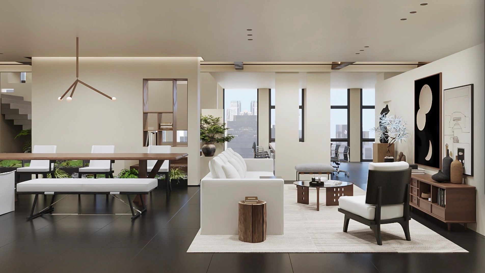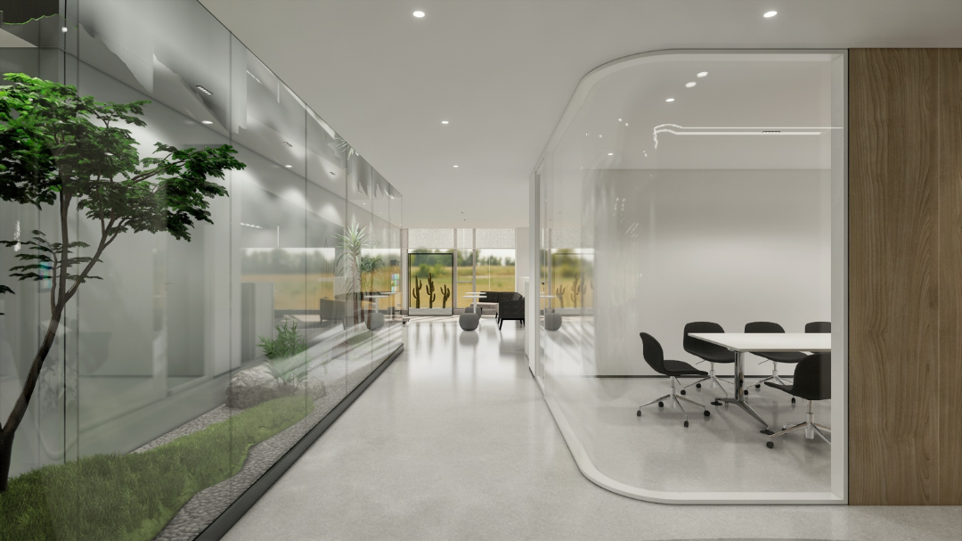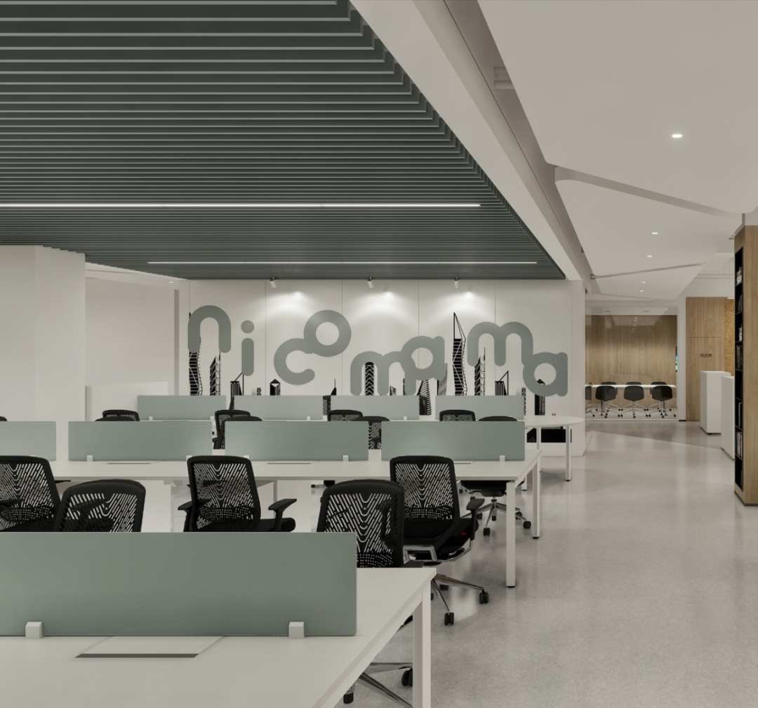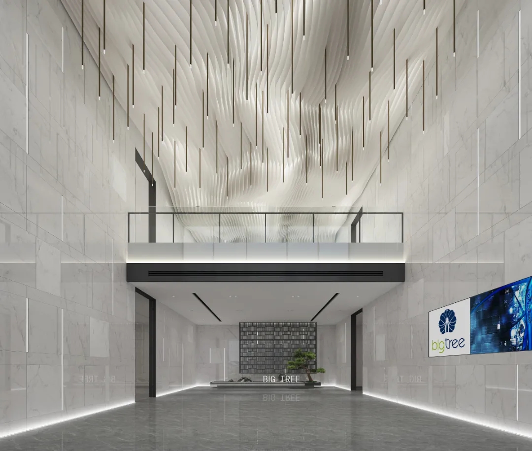 设计要求有充分的陈列区和休闲区,创造具备创新时尚、人性关怀、生态环保的一个复合型生态空间,以空间-形态的综合打造彰显其价值。大面积的留白设计给人无尽的想象和精神力量。空间和自然景观作结合,兼顾了艺术与自然之间的灵感之美,勾勒出了一幅简约、大气的自然办公版图。