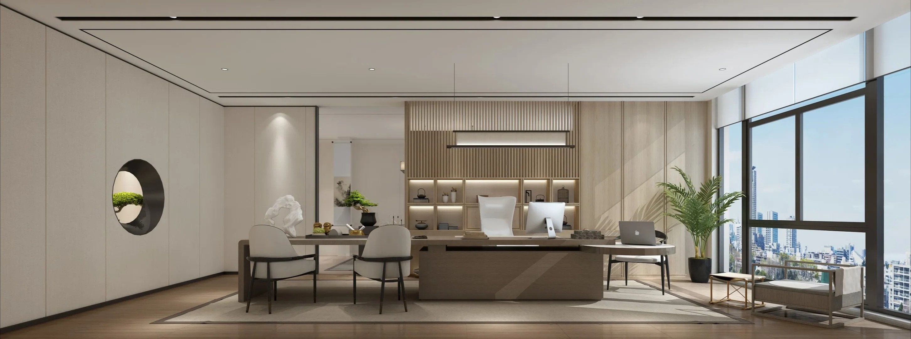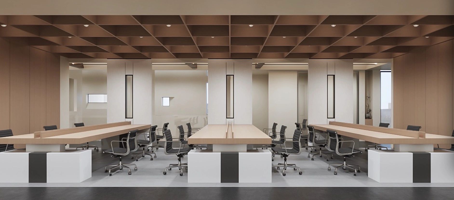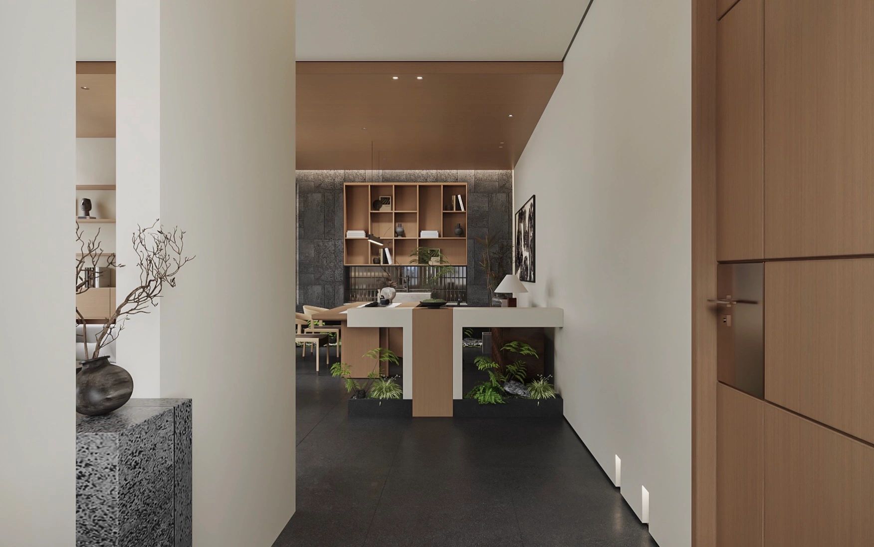 设计要求有充分的陈列区和休闲区,创造具备创新时尚、人性关怀、生态环保的一个复合型生态空间,以空间-形态的综合打造彰显其价值。大面积的留白设计给人无尽的想象和精神力量。空间和自然景观作结合,兼顾了艺术与自然之间的灵感之美,勾勒出了一幅简约、大气的自然办公版图。