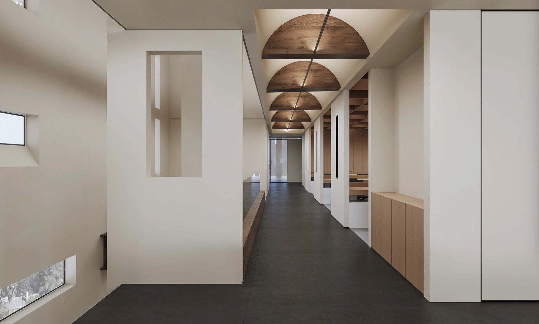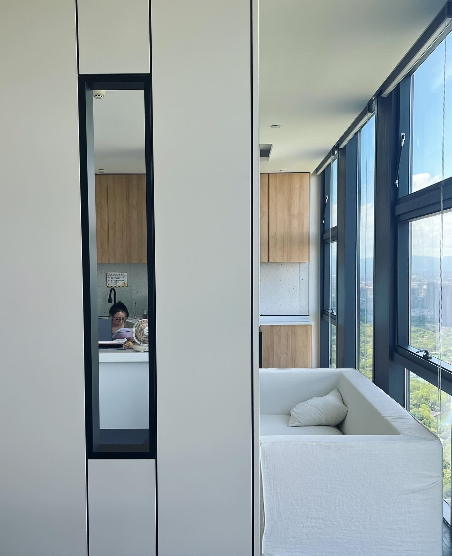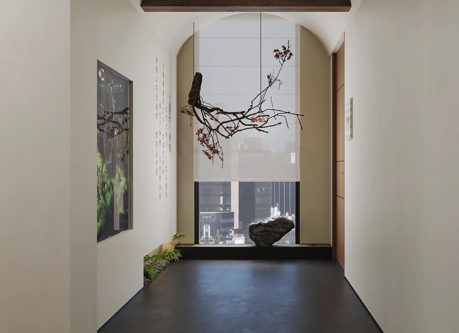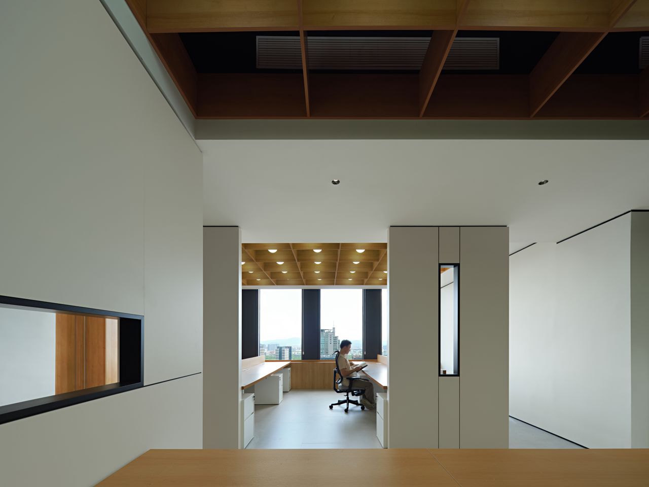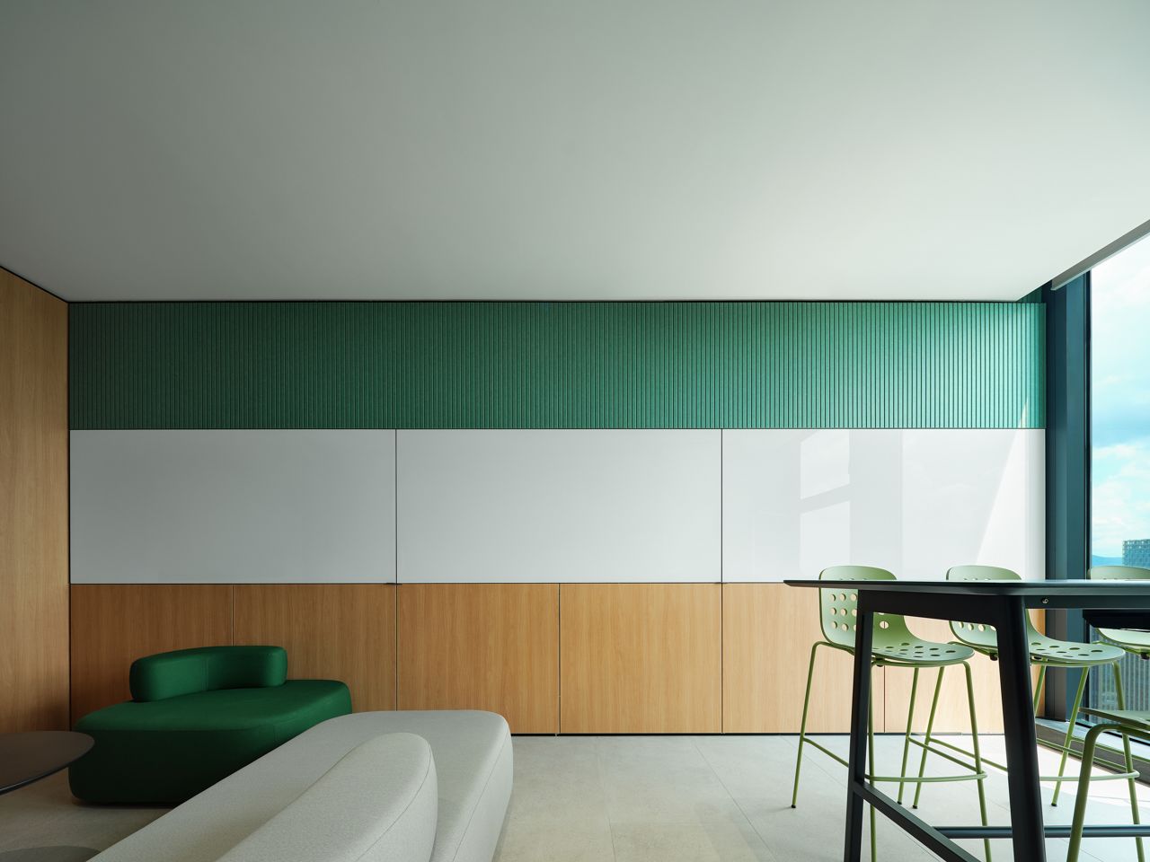 进入顶楼,以大面积玻璃隔断,通透明亮,将艺术与自然环境相融,以此弱化空间的界限,重塑人在场所的新感知,呈现与天空风景为伴的场景。