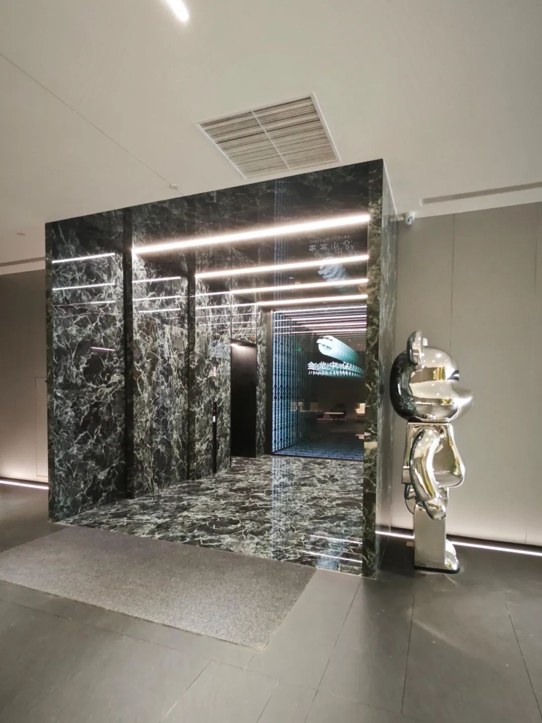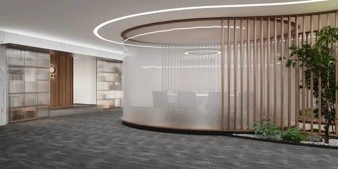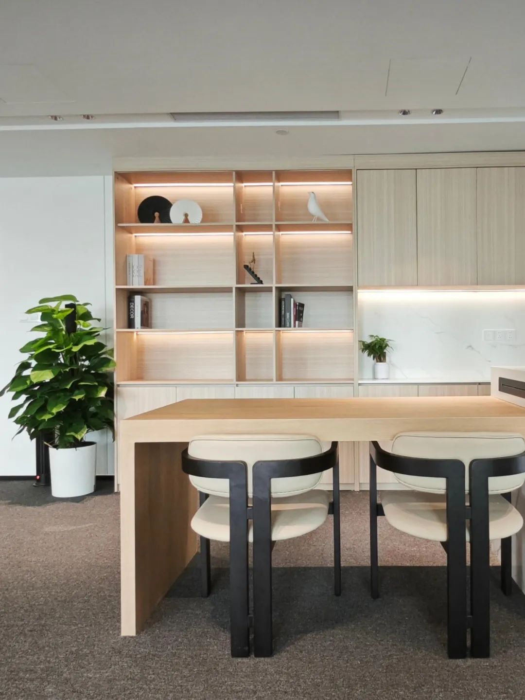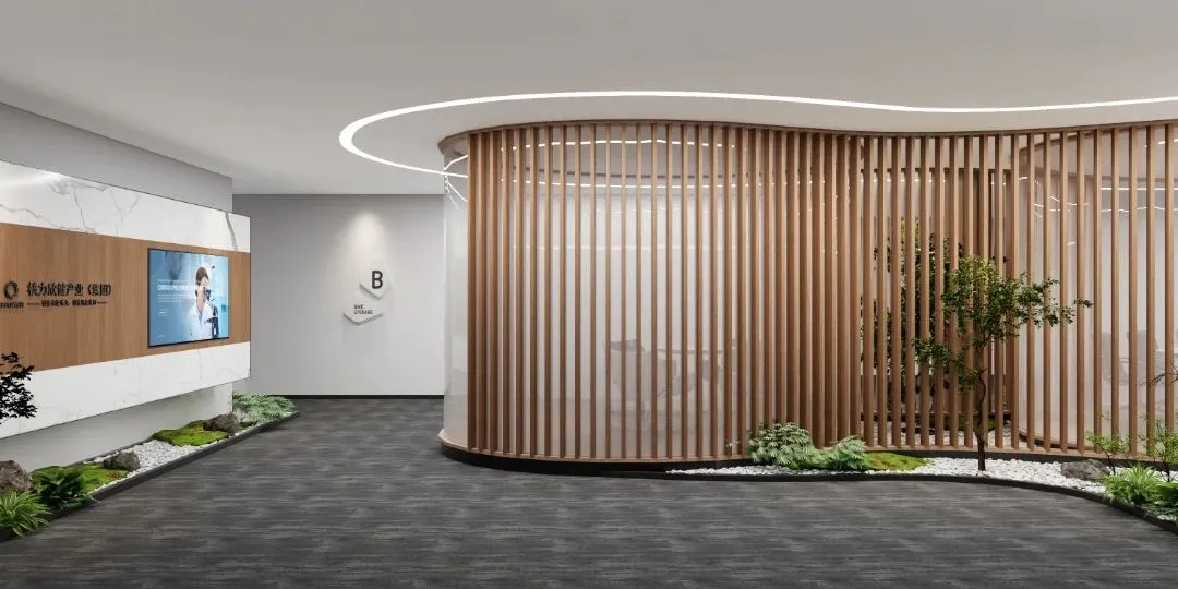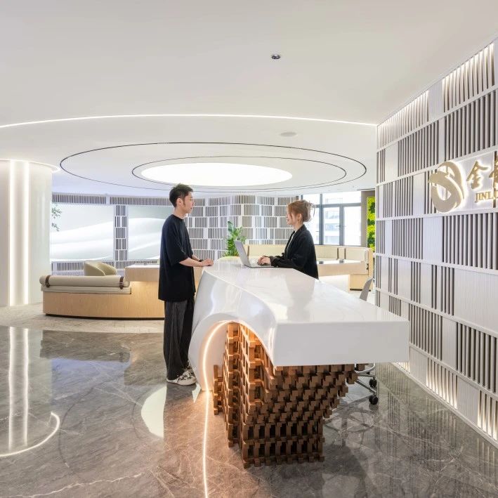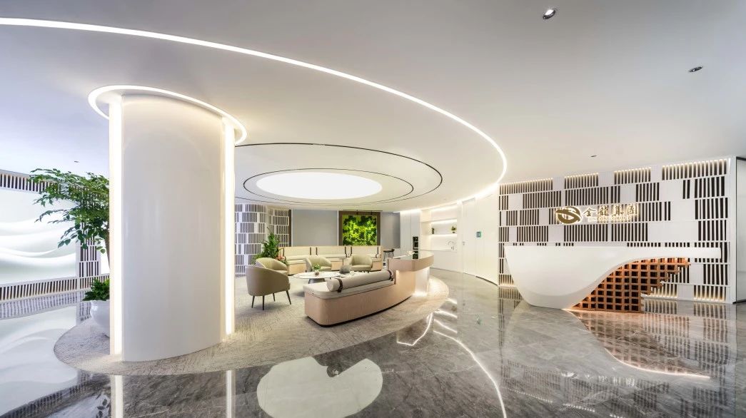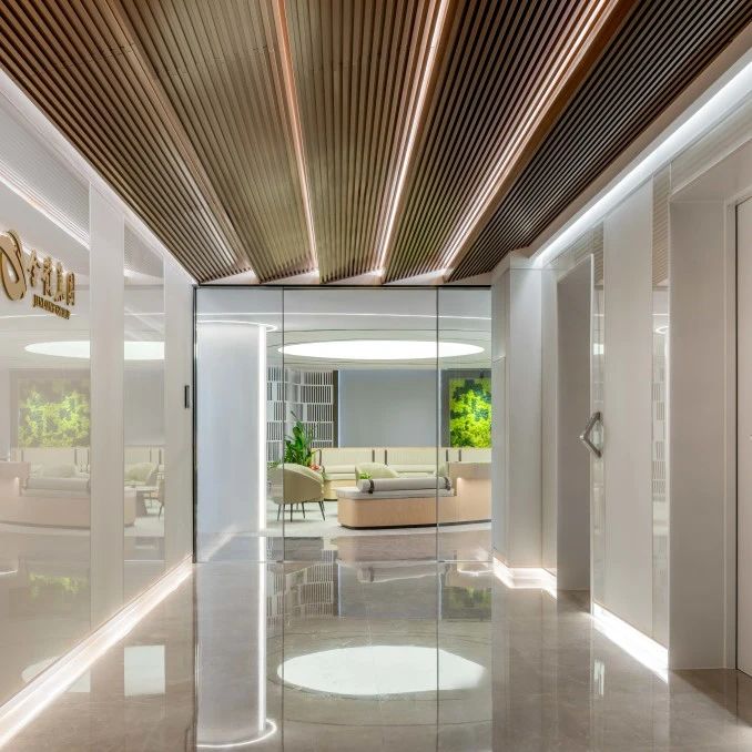 前厅设计融入温润的原木色,借助圆弧形灯带和玻璃,用简练的手法勾勒和渲染,让空间层次变得多样。以绿植点缀,错落有序,散发着现代自然美学的简约质朴。在丰富的灯光和景观的映衬,一个简约清新的环境被打造出来。白色吊顶与灯光配合,整体光线均匀柔和,亮度统一,在完善功能性的同时,塑造出沉静的空间氛围。充满线条感的木饰板,与整个格局相呼应,又呈现出视觉上的延伸感。