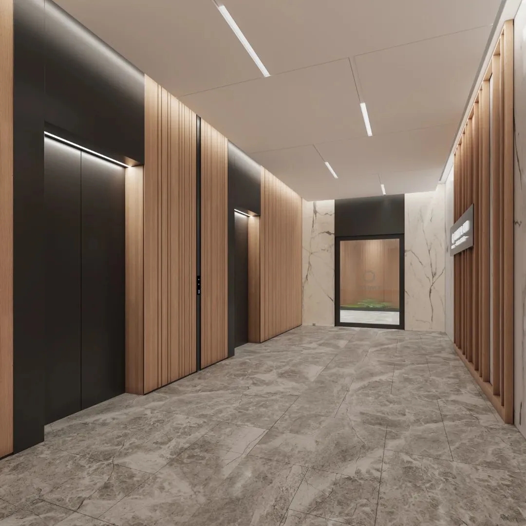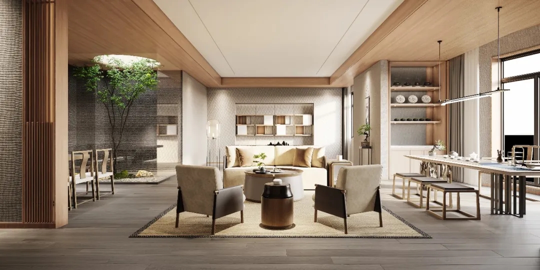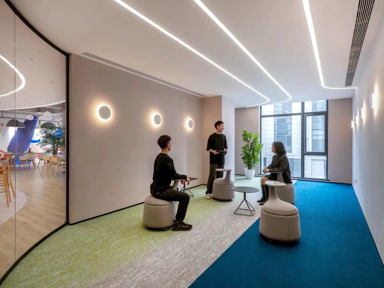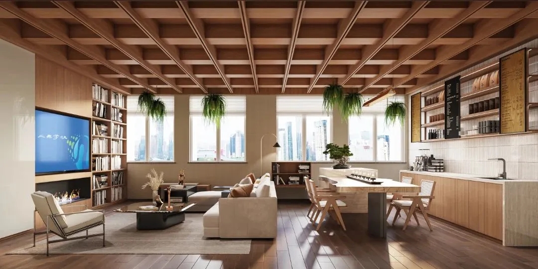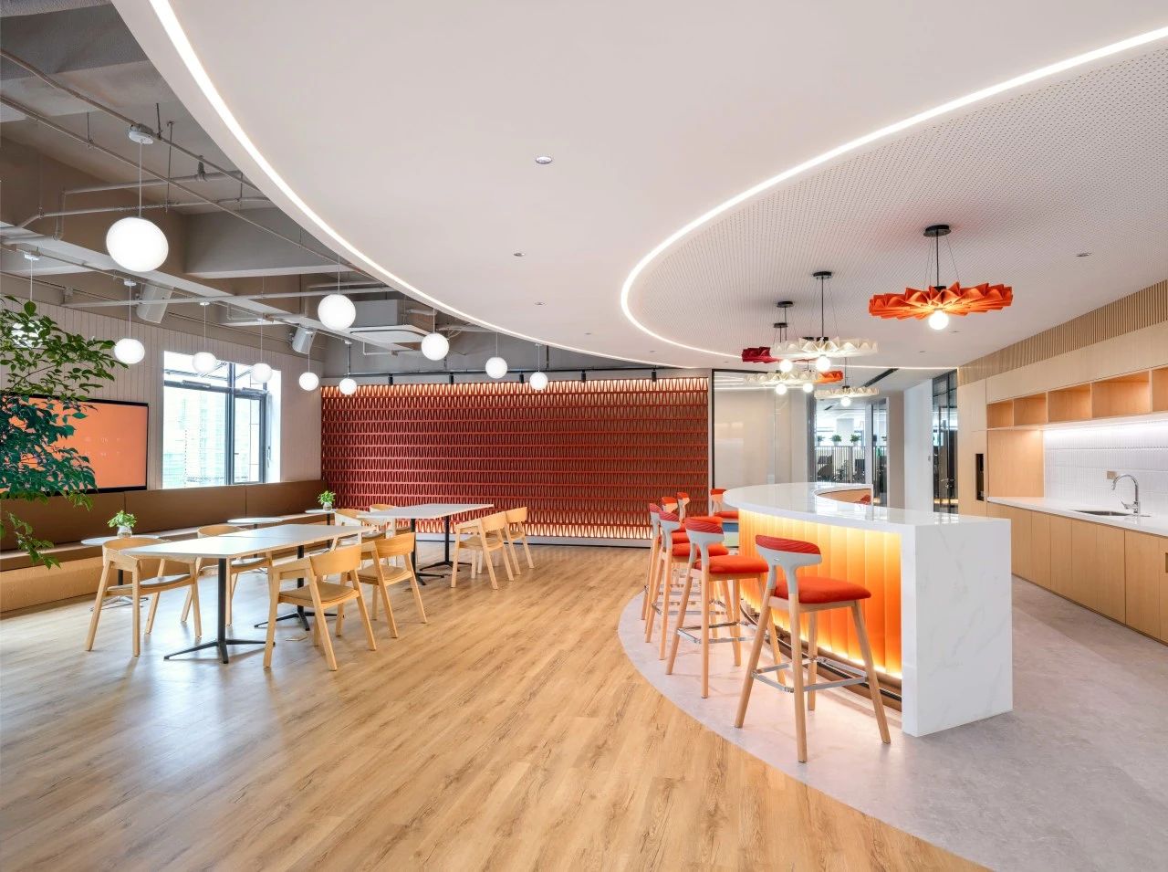 前厅设计融入温润的原木色,借助圆弧形灯带和玻璃,用简练的手法勾勒和渲染,让空间层次变得多样。以绿植点缀,错落有序,散发着现代自然美学的简约质朴。在丰富的灯光和景观的映衬,一个简约清新的环境被打造出来。白色吊顶与灯光配合,整体光线均匀柔和,亮度统一,在完善功能性的同时,塑造出沉静的空间氛围。充满线条感的木饰板,与整个格局相呼应,又呈现出视觉上的延伸感。