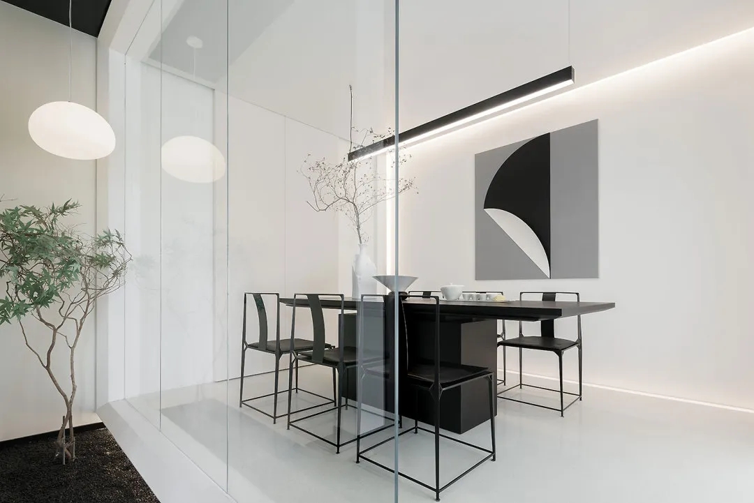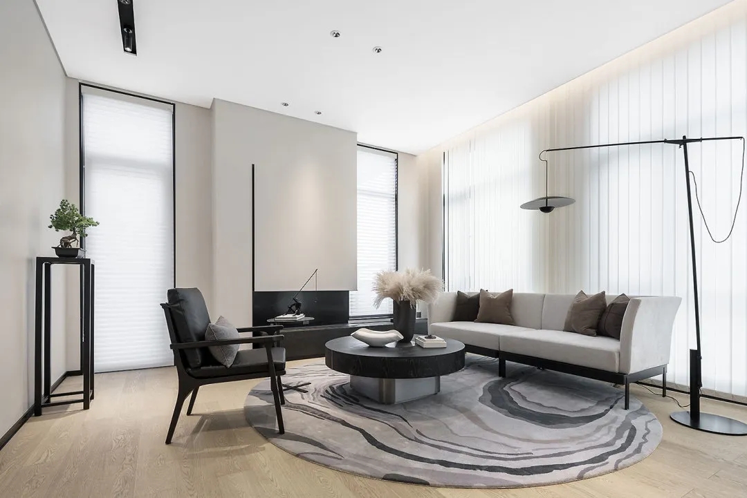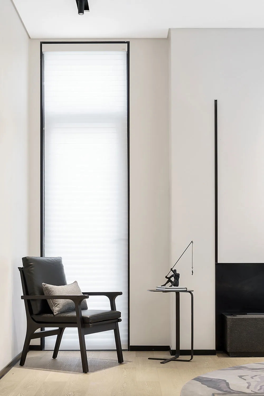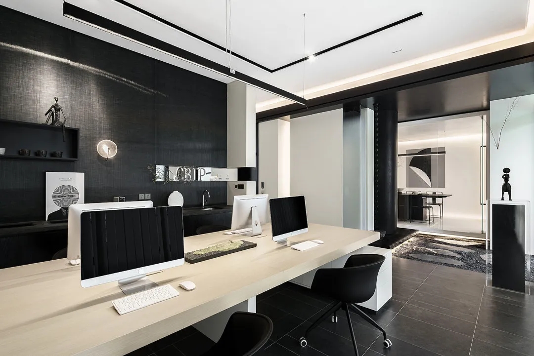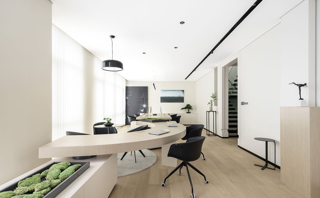 本案以黑白为主色调,创造一个充满光线和单色的空间,与工业美学产生共鸣。在现代简约的风格里,以简洁克制的手法,将精致和个性内敛于黑白之间,凸显企业高效、专业、务实的特性。会客区开放式设计,动线流畅,用光线作为空间里惬意而温和的叙事开场,光影之间平添几分雅致,创造自然气息的自由流动,简明大方的质感塑造的恰到好处。办公区以大面积的黑白,混搭交织原木、暖黄色系,冷暖相融,简约时尚的同时又不失温度。弧形的办公桌,去繁从简,虚化掉了空间的紧张感,更添一丝趣味。