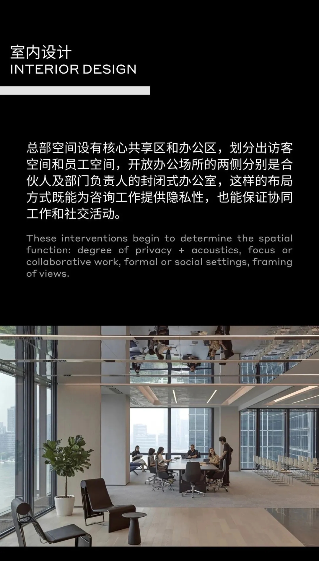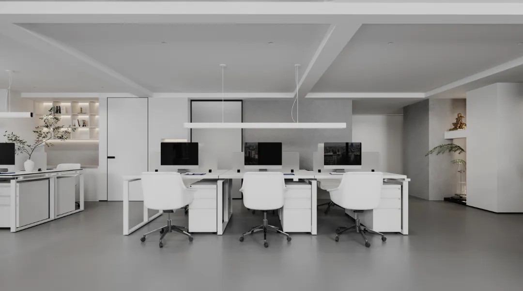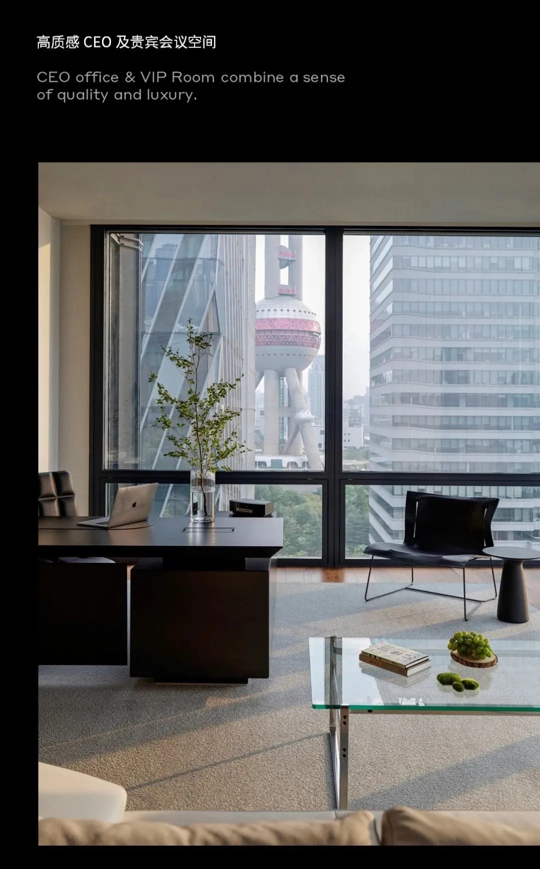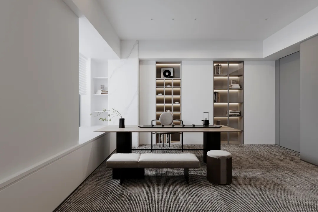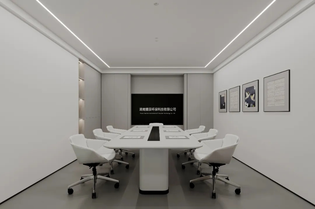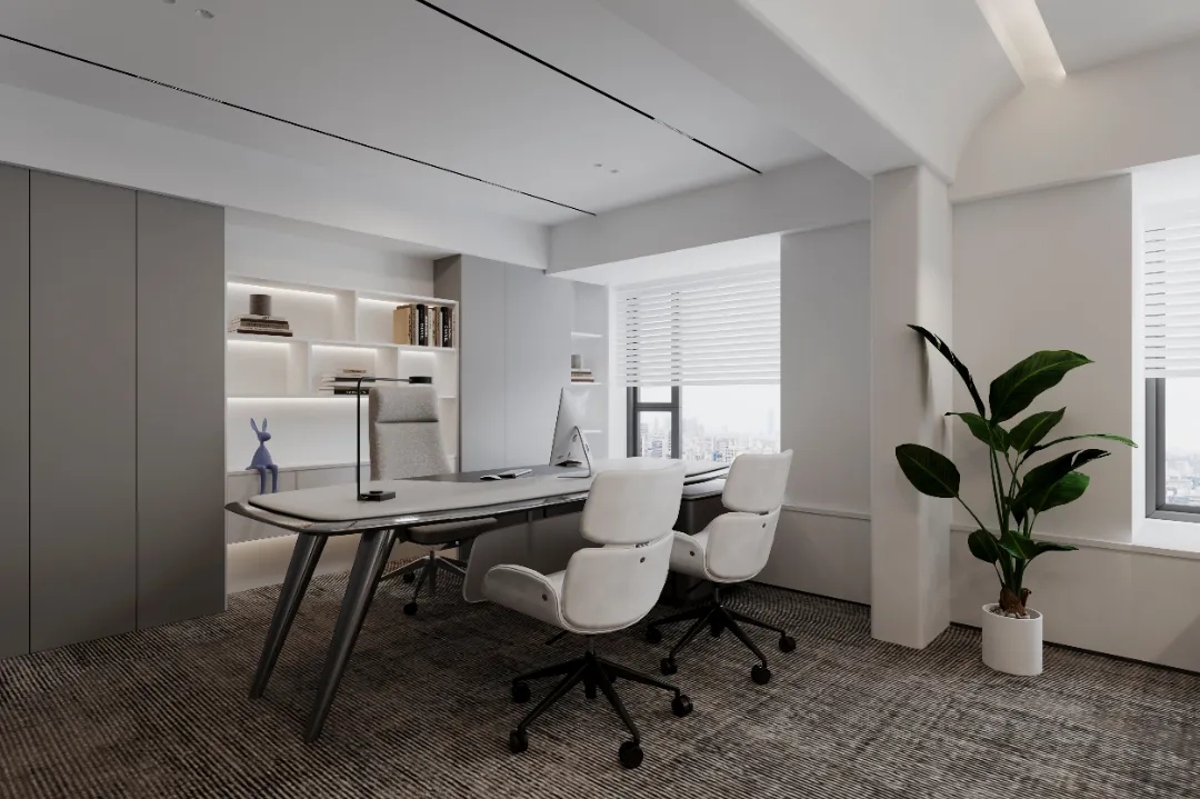 门厅材质选用微水泥,纹理细腻,增强墙面肌理质感,完美地呈现出现代极简主义的写意之美。素色空间中绿植的点缀犹如点睛之笔,赋予美的同时,仿若一抹流动的绿意,为空间加持生机与活力。会议室同样以“简静”为主题,局部以企业文化宣传墙调和空间气质,展示品牌实力,多媒体影视装置加强了墙面空间的信息辐射作用,为参会者提供高效舒适的视觉体验。总经理办公空间并没有过多的繁杂的装饰,品质,时尚,舒适与艺术,对于私人办公空间尤为重要。地毯、木质、皮质等温润材料的选择柔化了室内空间,创造了温暖的的质感,可以畅快地感受空间尺度感与自由。