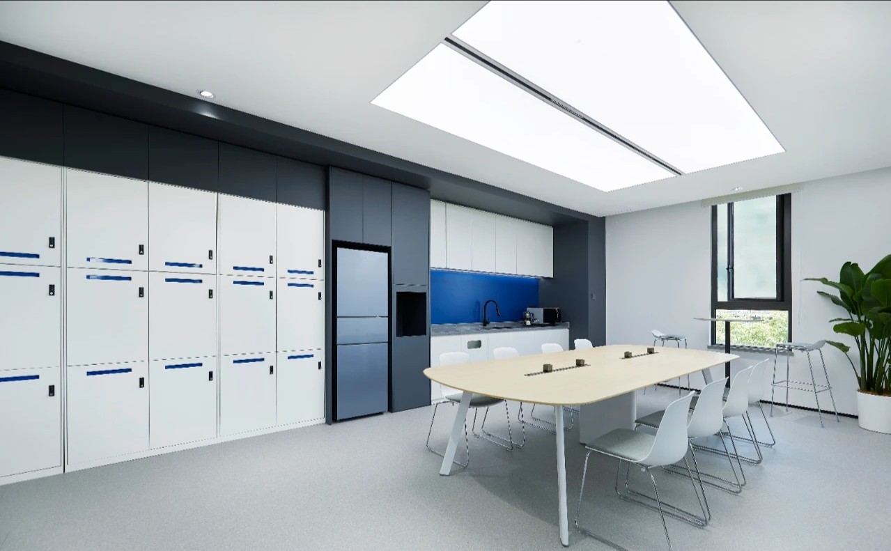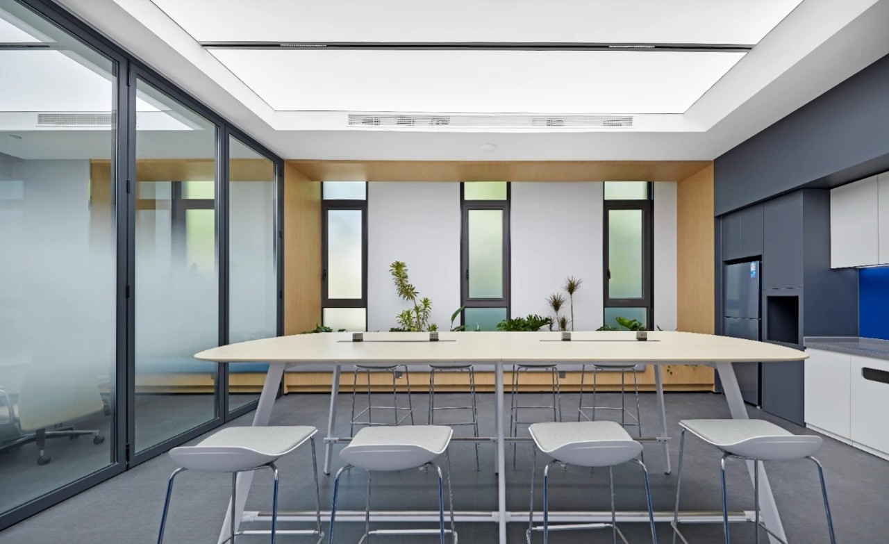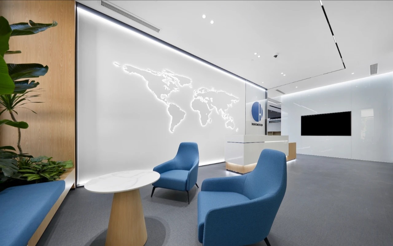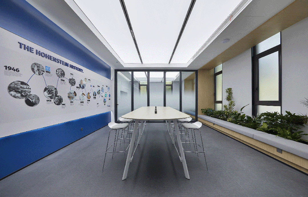 空间设计中,结合海恩斯坦的品牌企业色将不同空间层次串联起来,实现品牌力的流淌。前厅以简约基调表达高级的视觉效果,舒适的色调烘托出平静的空间氛围。发光背景墙递进空间层次。世界地图的出现构成了空间中微妙的波动,透露出独特的视觉信息。高品质的材质和高标准的施工细节成为了项目的一大亮点。减法,让空间更丰富。顶部细长的灯带增加纵深感,与挑高围合成干净通透的多功能空间。多样化的环境可以使员工自然选择,以便根据不同工作需求,进行灵活整合,开展团队协作。