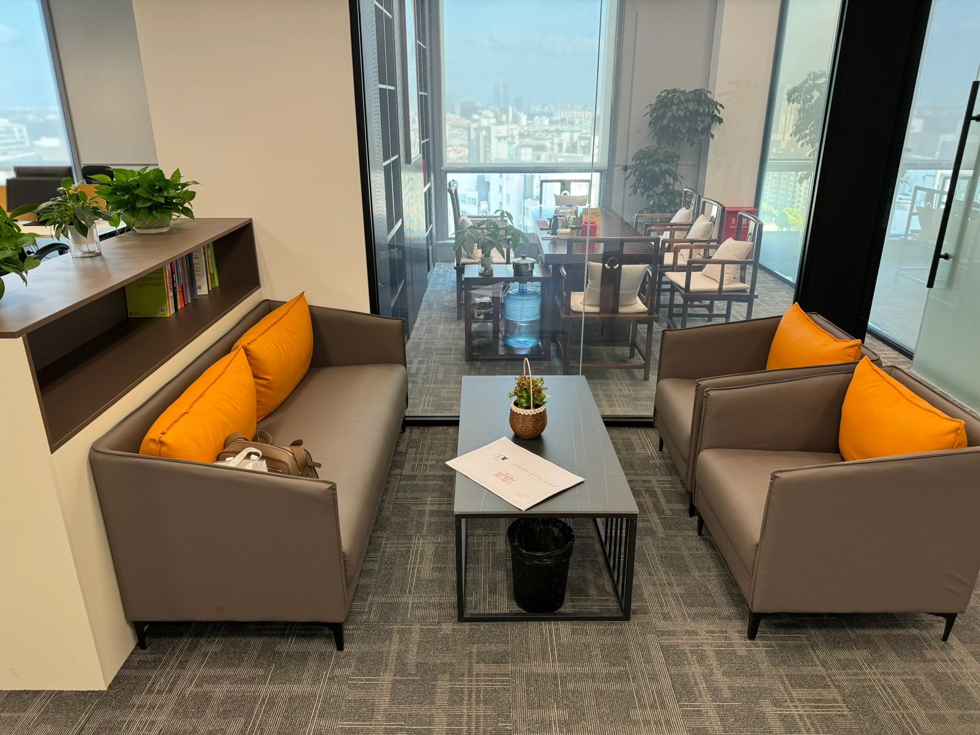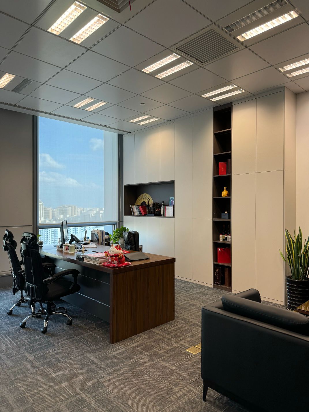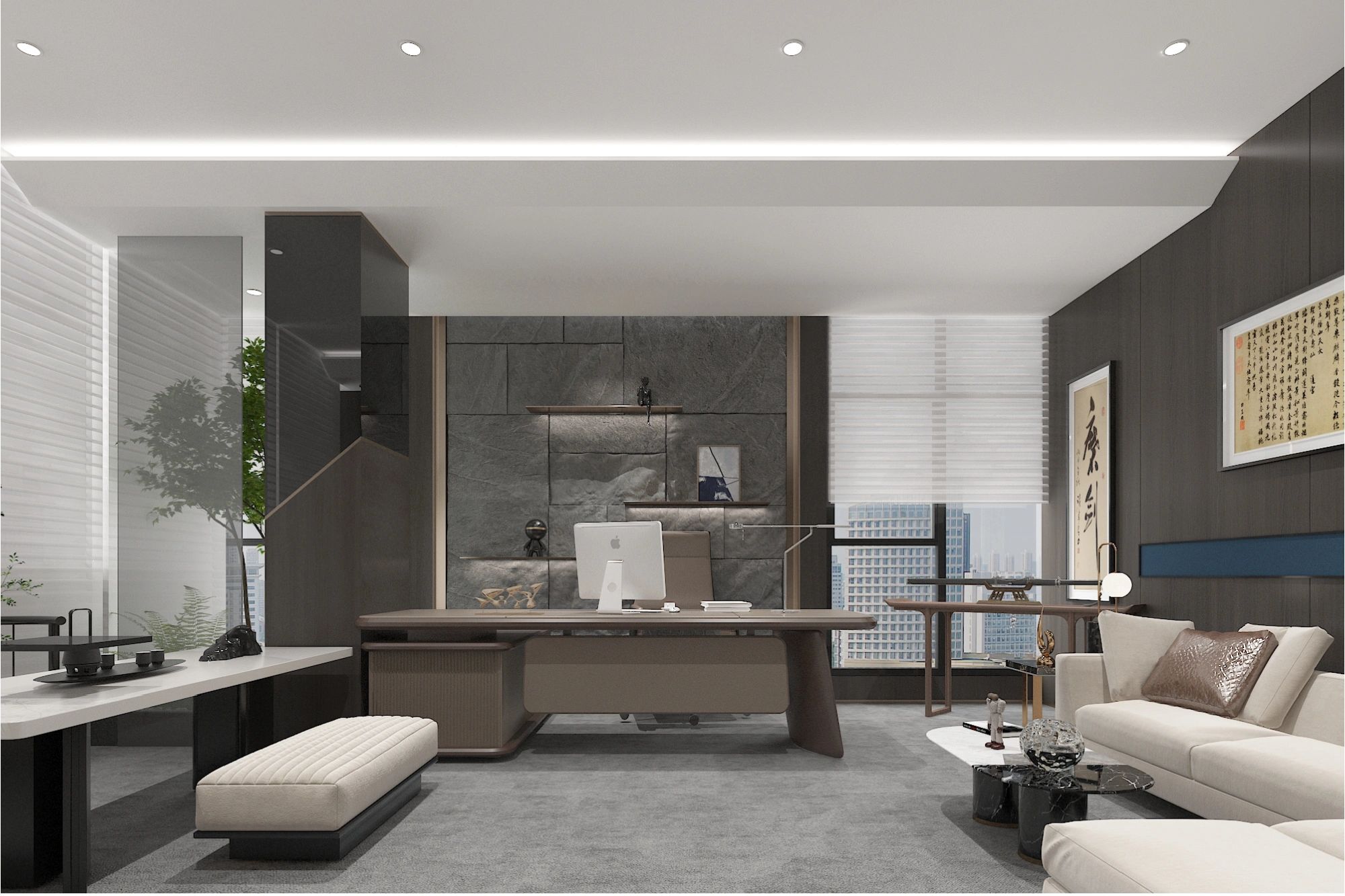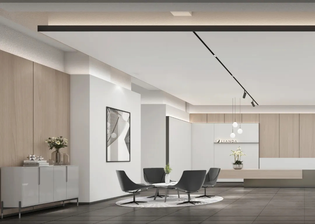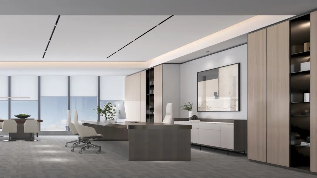 接待区色彩主要以暖色为主,加以墙面的挂画作为点缀,茂绿的盆栽更加使得空间具有生机感。在空间内加入绿植,在自然和光影变幻之间找到对心灵的冲击,为员工提供了一个轻松舒适的工作环境。开放办公区采取玻璃隔断的形式,采光好,为促进室内多样性,整体空间设计通过使用颜色、纹理、挂饰和几何形状,统一了色彩和线条,在形式与功能、风格与舒适、休闲与专业之间创造了完美平衡。董事长办公室设计现代感十足,装饰陈设上色调简洁统一,为办公区域提供了一个美观、实用的空间。超大落地窗保障了区域采光,低饱和度的灰色摆件、抱枕以及桌面相互协调,一扫大面积的沉闷。