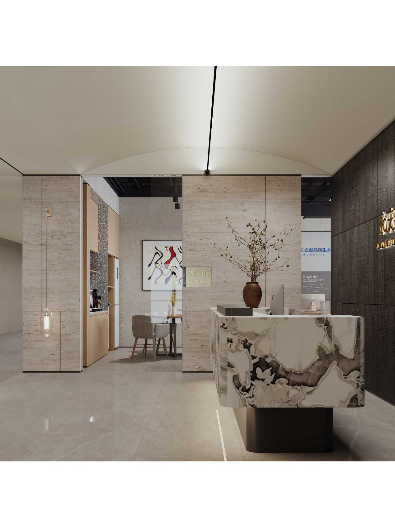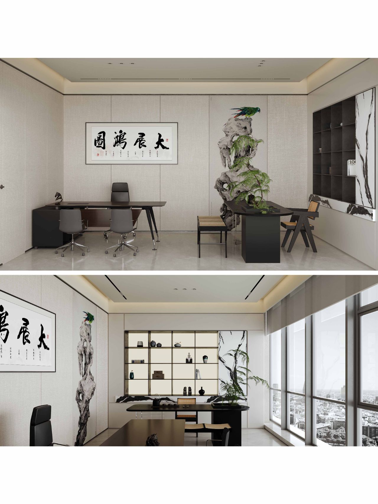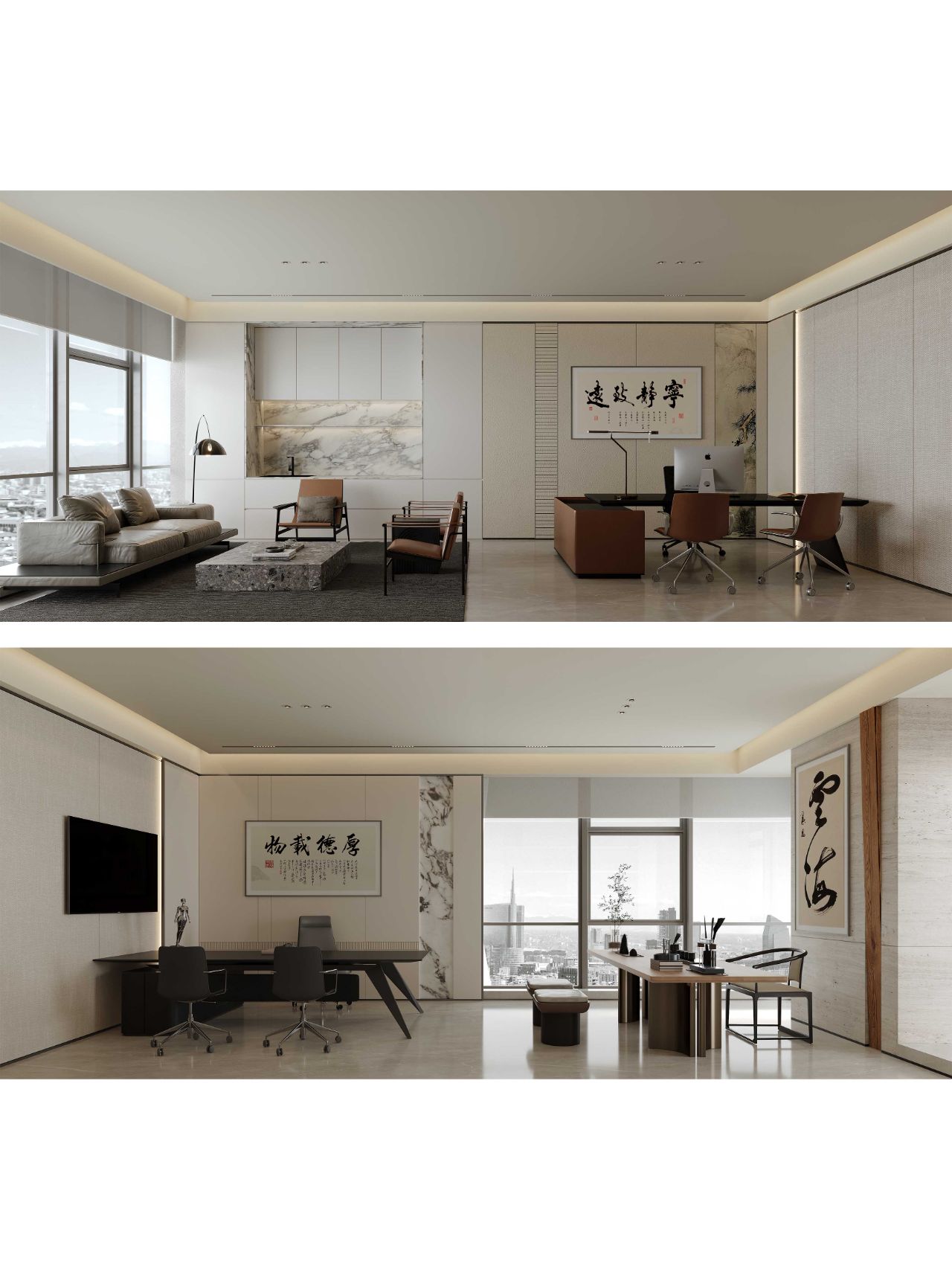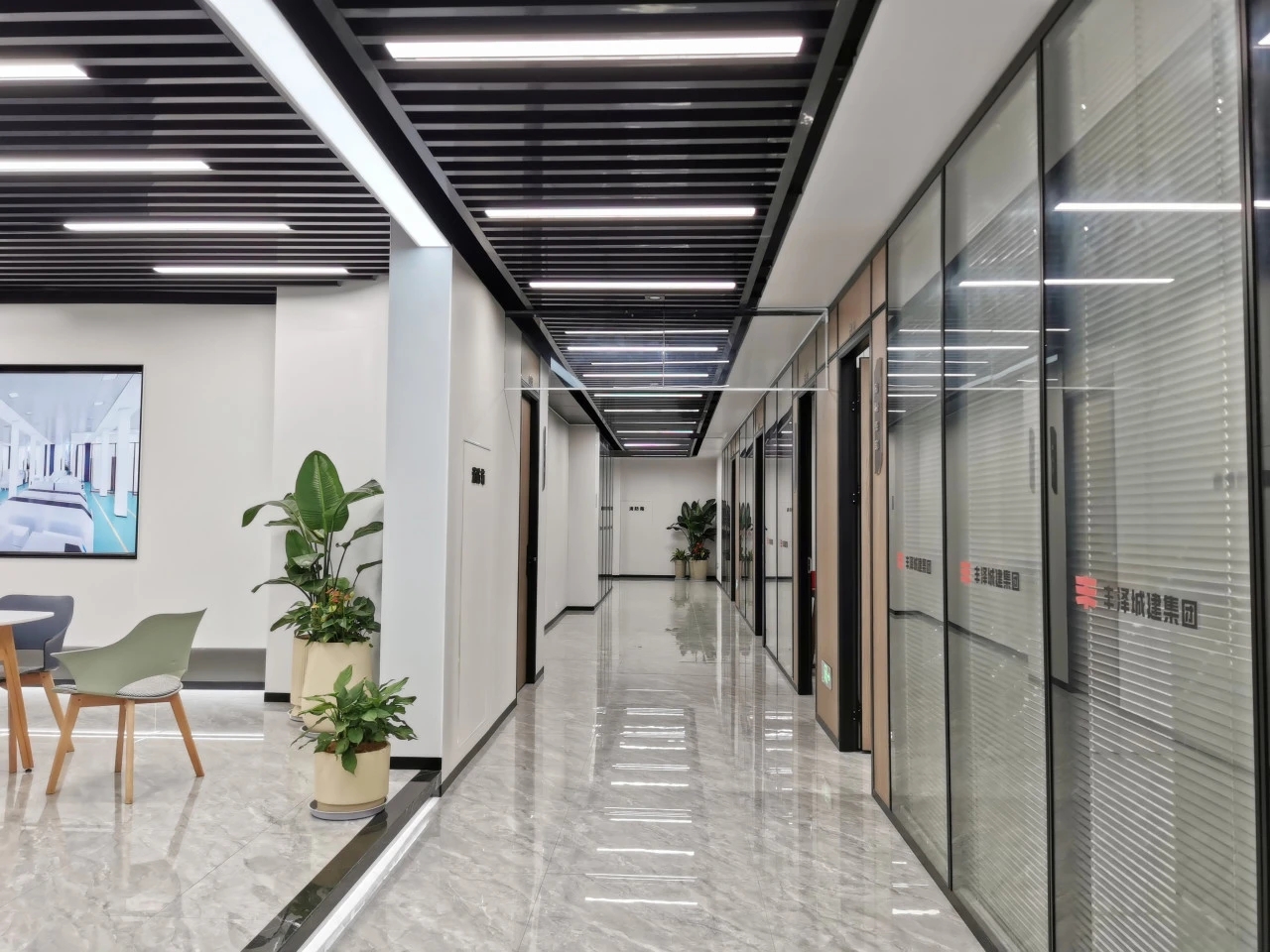 接待区色彩主要以暖色为主,加以墙面的挂画作为点缀,茂绿的盆栽更加使得空间具有生机感。在空间内加入绿植,在自然和光影变幻之间找到对心灵的冲击,为员工提供了一个轻松舒适的工作环境。开放办公区采取玻璃隔断的形式,采光好,为促进室内多样性,整体空间设计通过使用颜色、纹理、挂饰和几何形状,统一了色彩和线条,在形式与功能、风格与舒适、休闲与专业之间创造了完美平衡。董事长办公室设计现代感十足,装饰陈设上色调简洁统一,为办公区域提供了一个美观、实用的空间。超大落地窗保障了区域采光,低饱和度的灰色摆件、抱枕以及桌面相互协调,一扫大面积的沉闷。