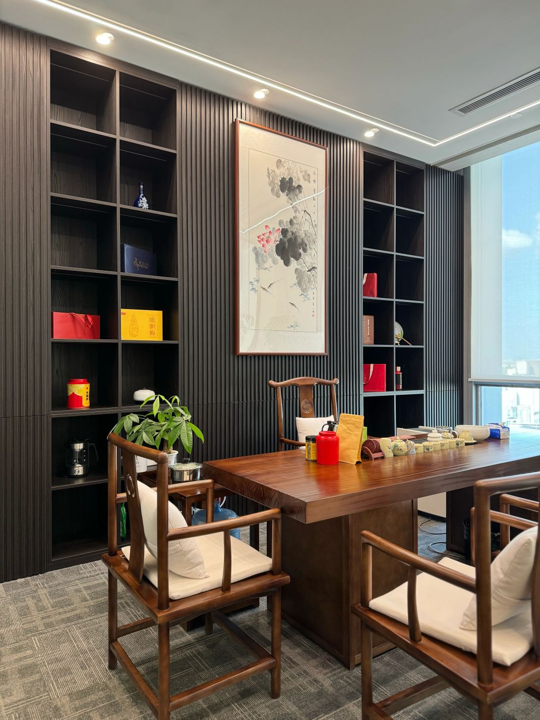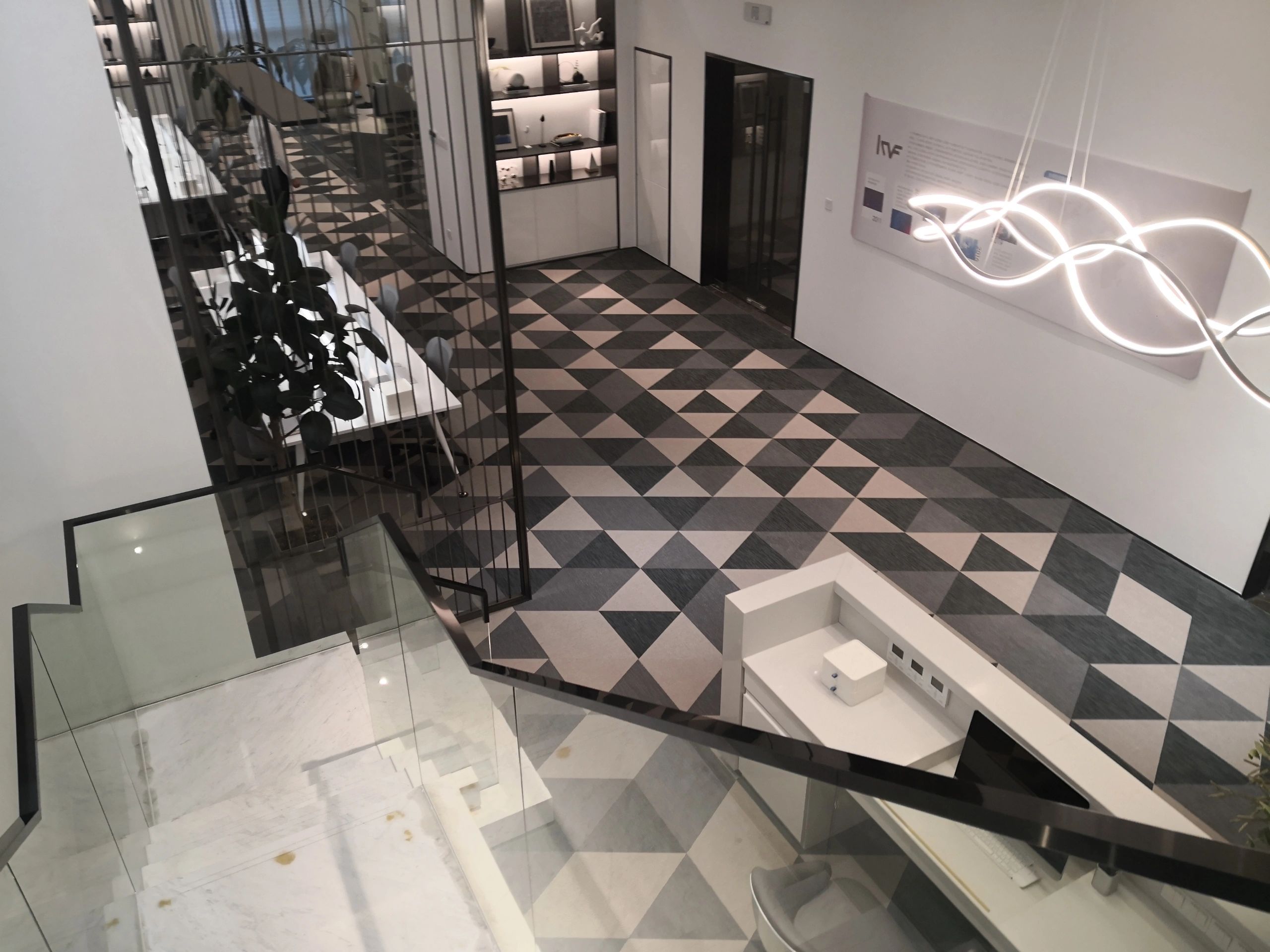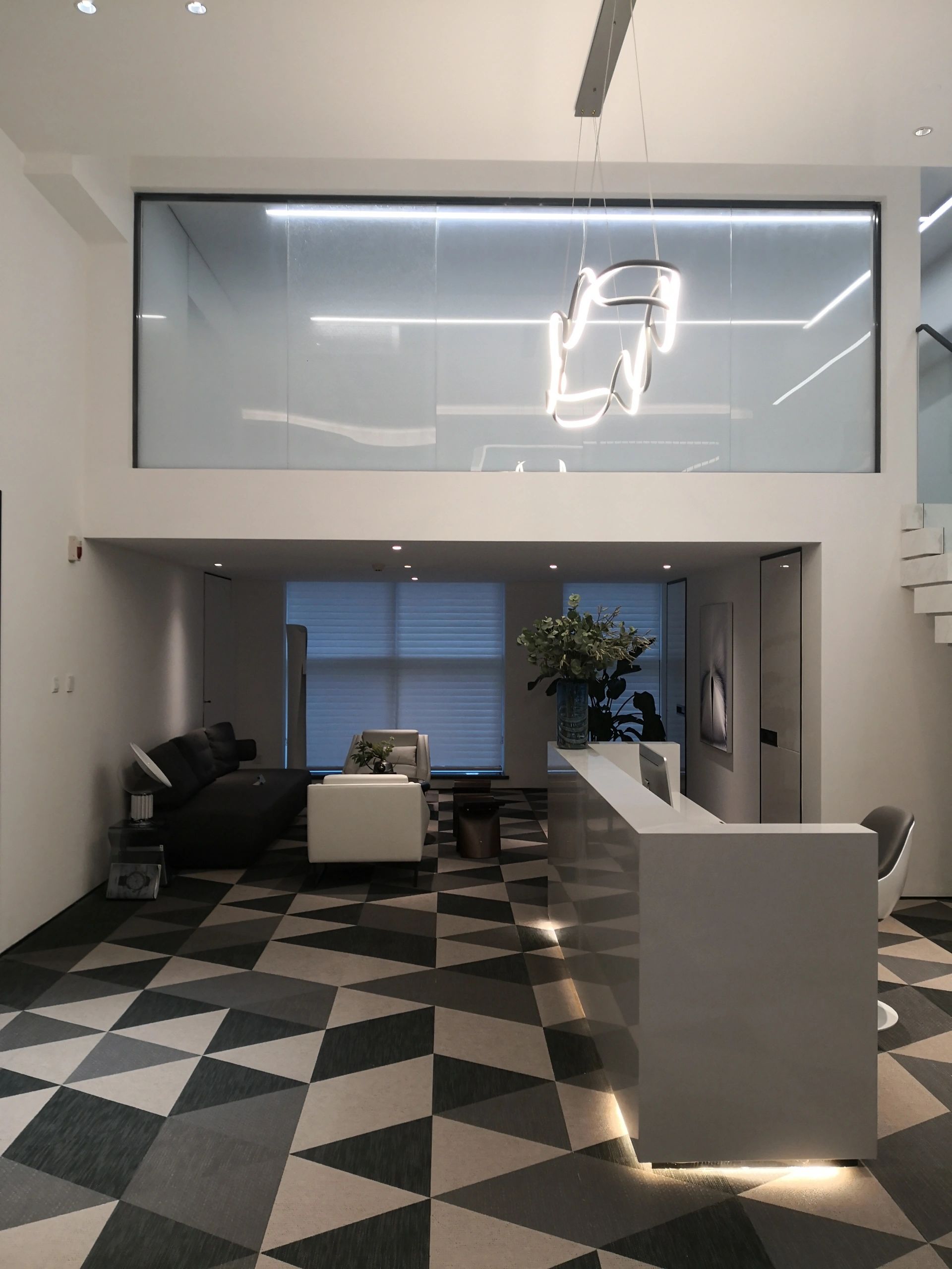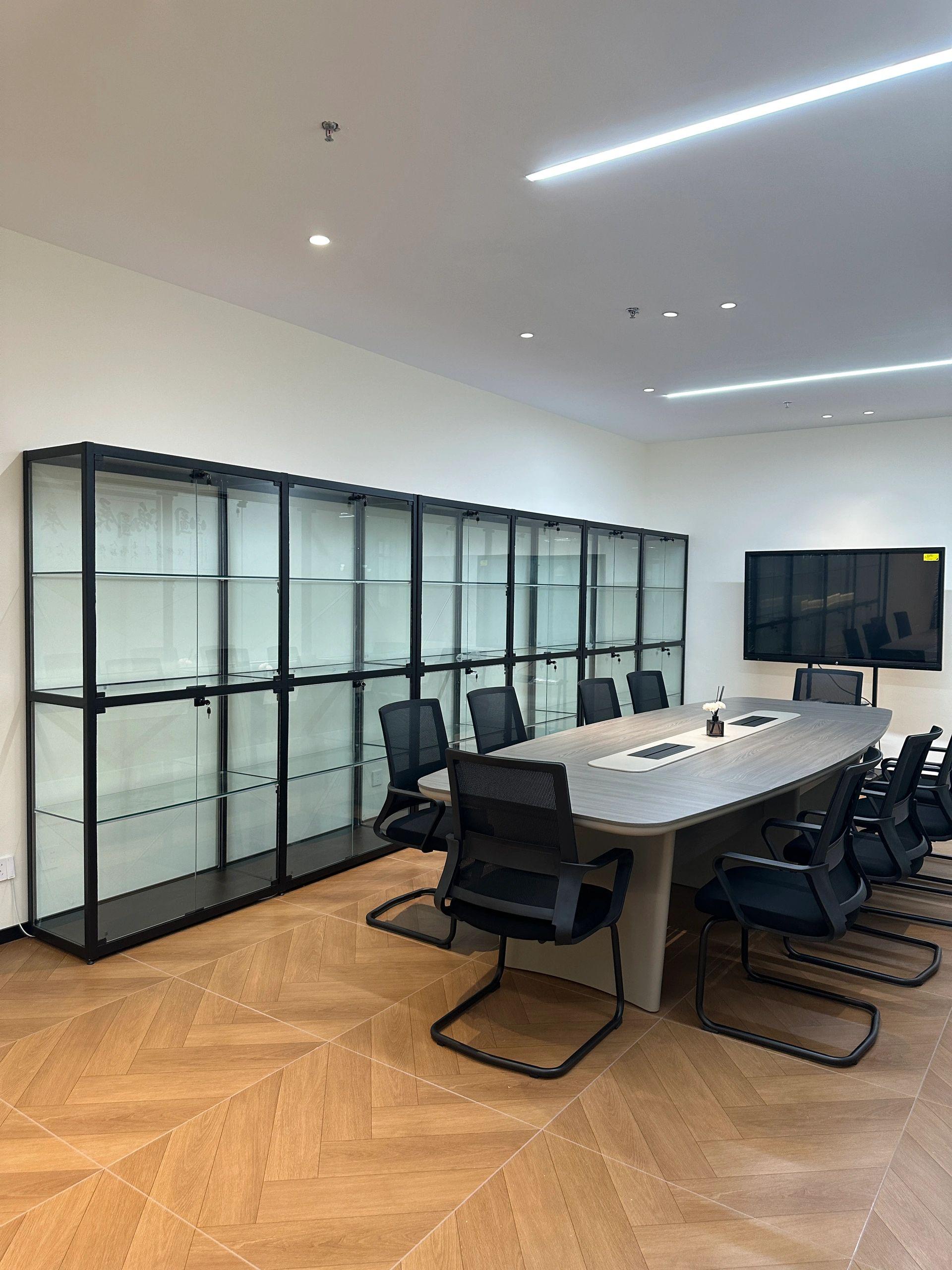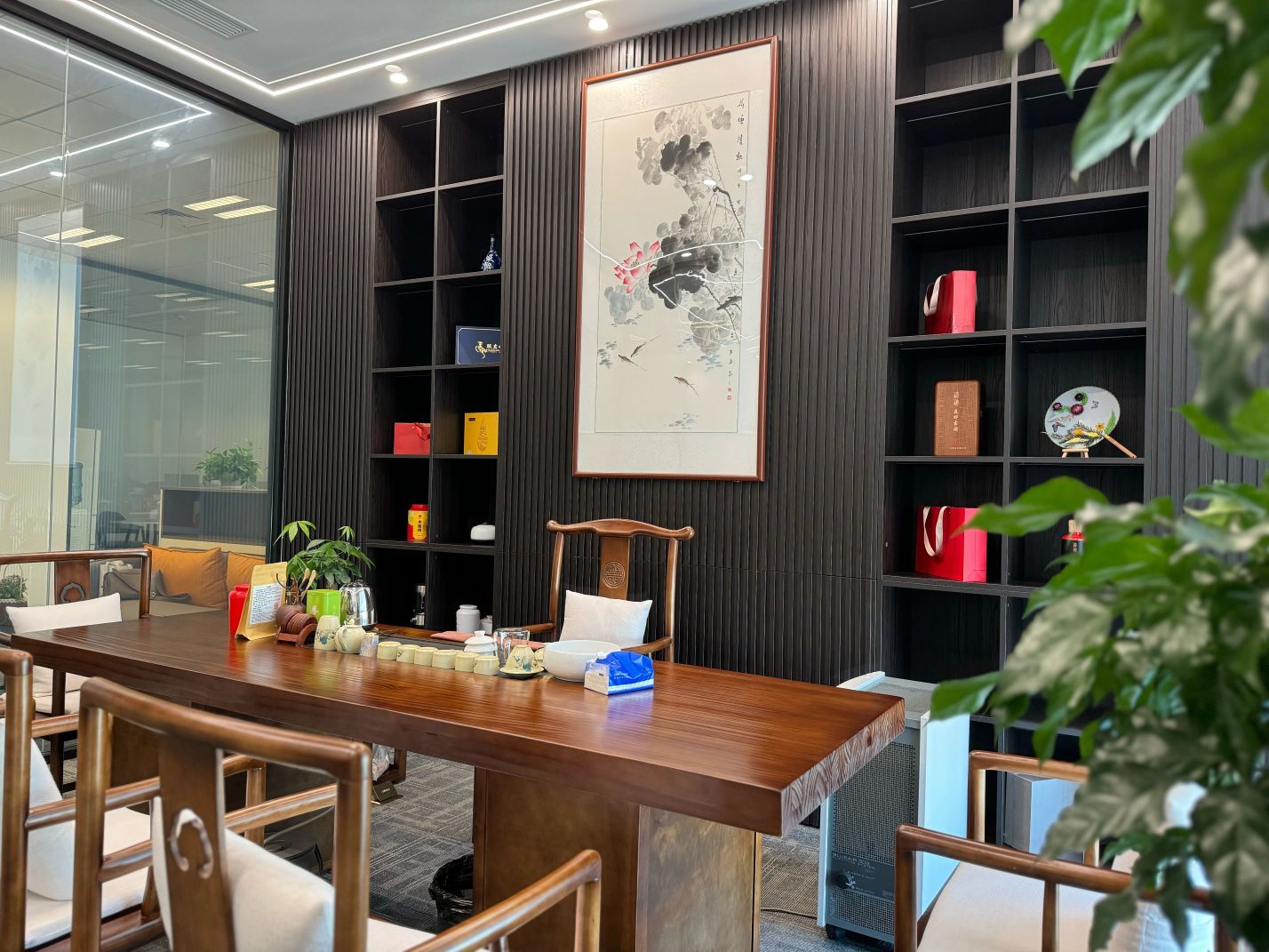接待区色彩主要以暖色为主,加以墙面的挂画作为点缀,茂绿的盆栽更加使得空间具有生机感。在空间内加入绿植,在自然和光影变幻之间找到对心灵的冲击,为员工提供了一个轻松舒适的工作环境。开放办公区采取玻璃隔断的形式,采光好,为促进室内多样性,整体空间设计通过使用颜色、纹理、挂饰和几何形状,统一了色彩和线条,在形式与功能、风格与舒适、休闲与专业之间创造了完美平衡。董事长办公室设计现代感十足,装饰陈设上色调简洁统一,为办公区域提供了一个美观、实用的空间。超大落地窗保障了区域采光,低饱和度的灰色摆件、抱枕以及桌面相互协调,一扫大面积的沉闷。
