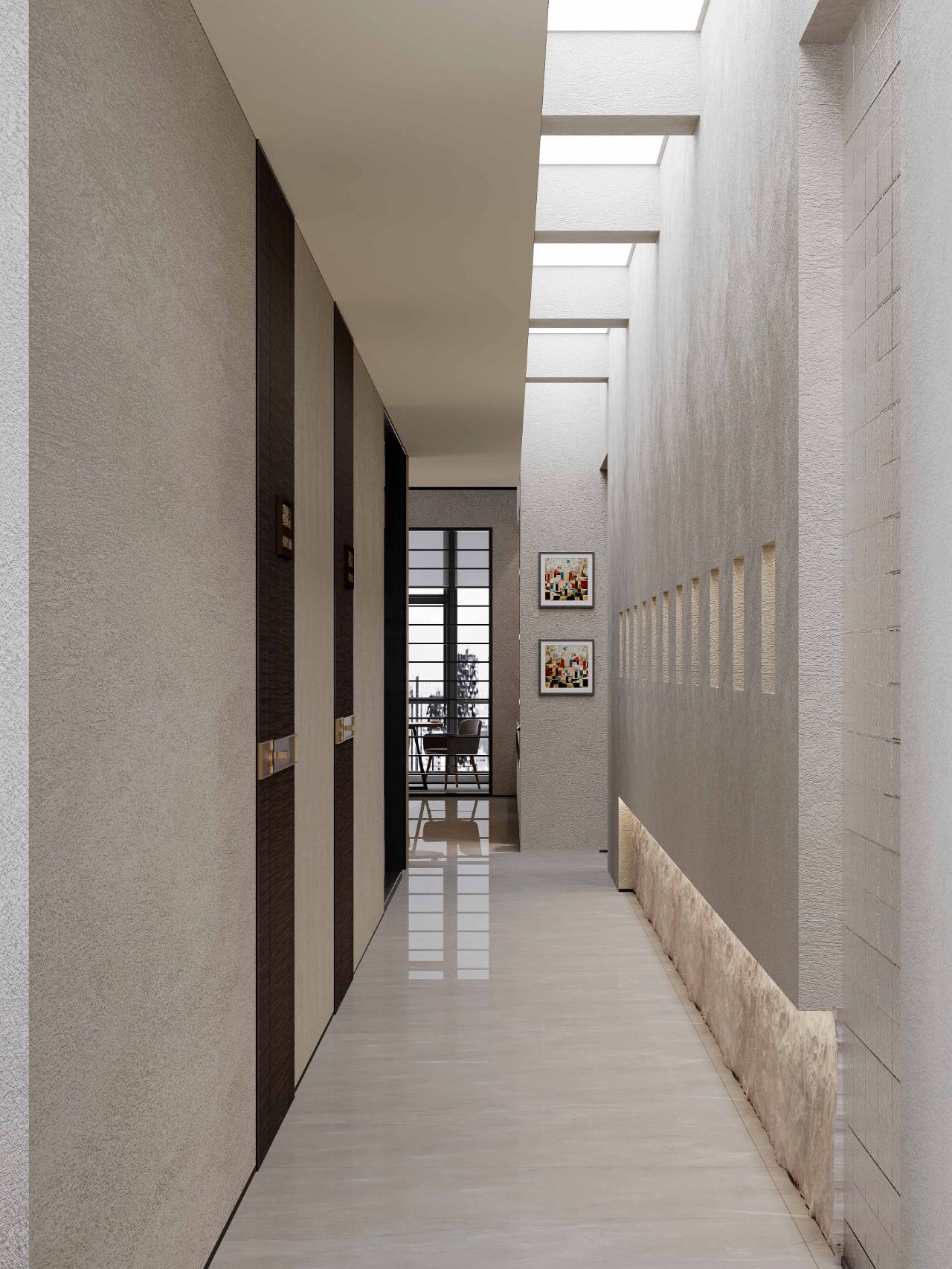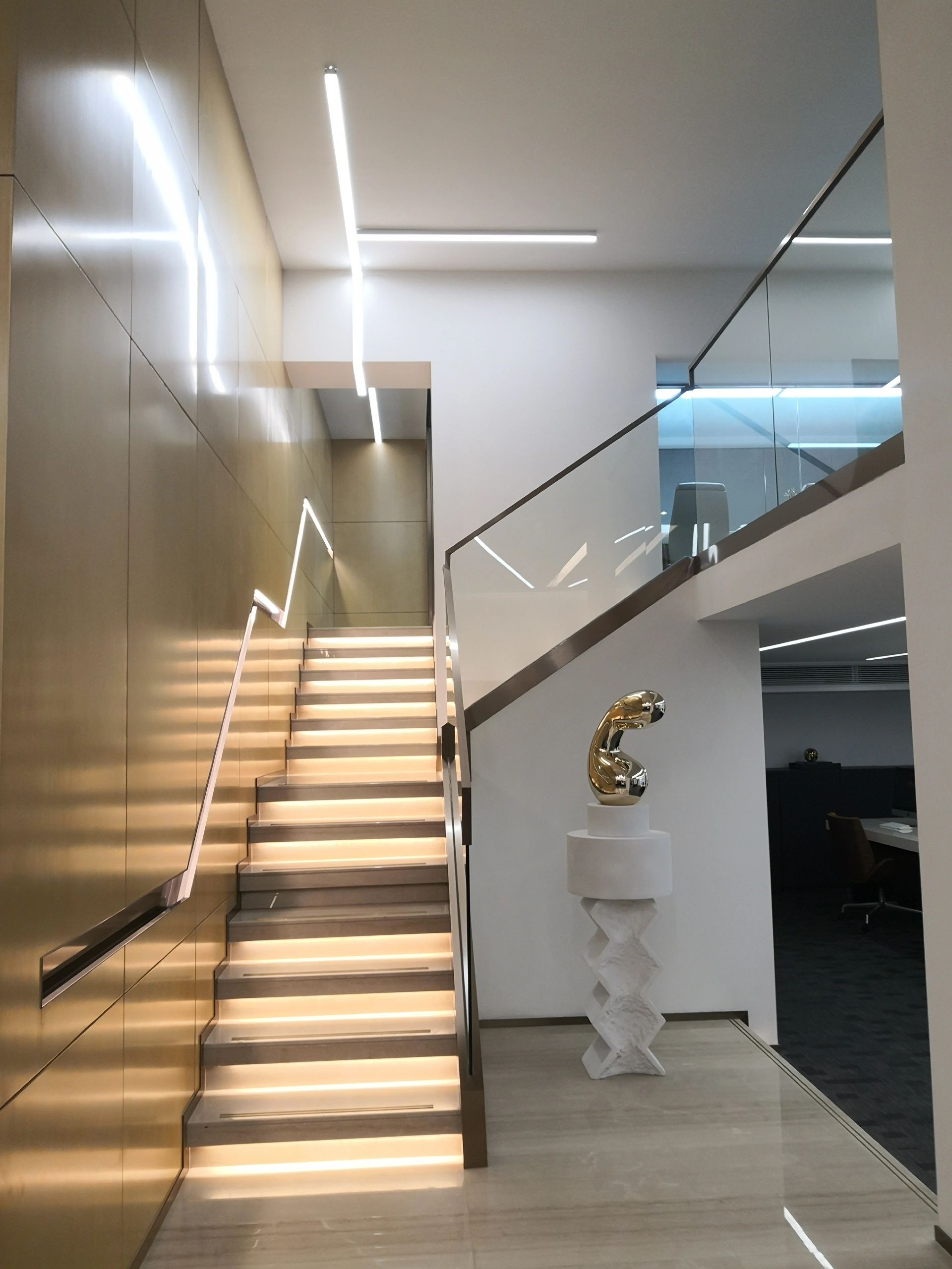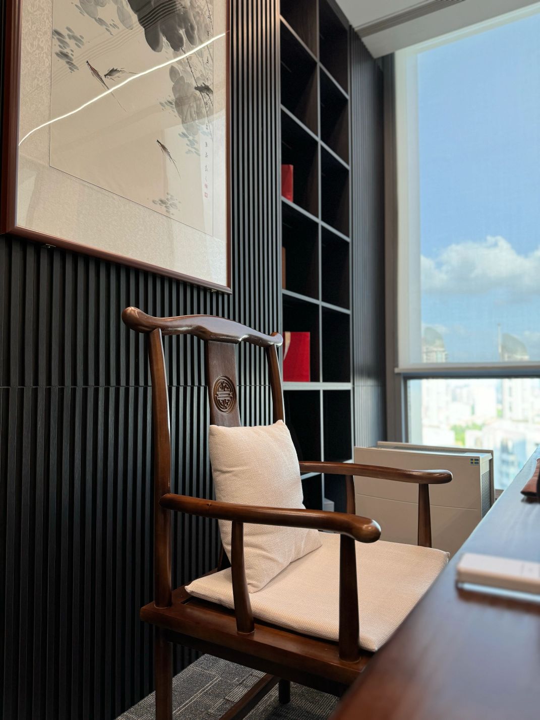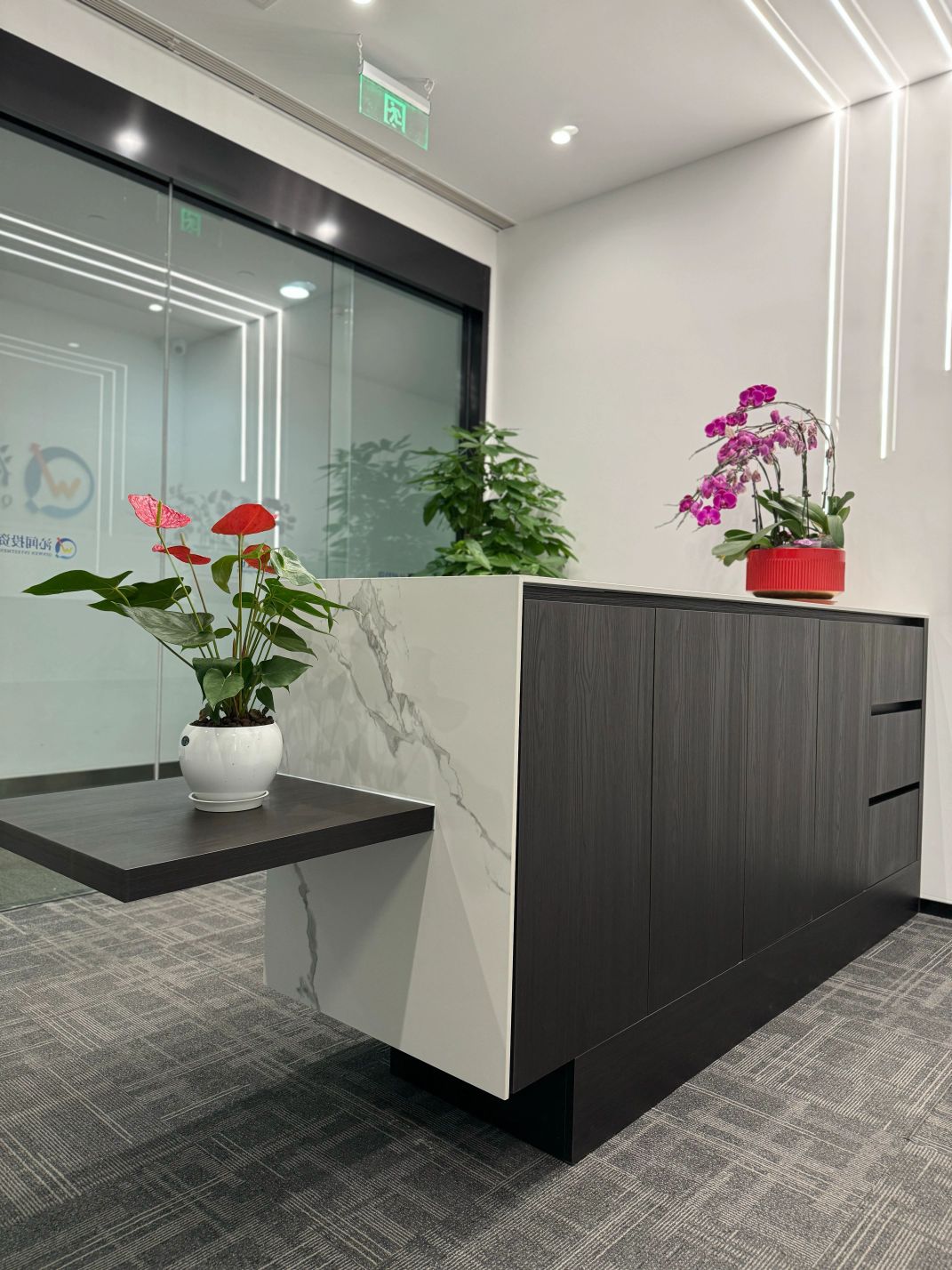 接待区色彩主要以暖色为主,加以墙面的挂画作为点缀,茂绿的盆栽更加使得空间具有生机感。在空间内加入绿植,在自然和光影变幻之间找到对心灵的冲击,为员工提供了一个轻松舒适的工作环境。开放办公区采取玻璃隔断的形式,采光好,为促进室内多样性,整体空间设计通过使用颜色、纹理、挂饰和几何形状,统一了色彩和线条,在形式与功能、风格与舒适、休闲与专业之间创造了完美平衡。董事长办公室设计现代感十足,装饰陈设上色调简洁统一,为办公区域提供了一个美观、实用的空间。超大落地窗保障了区域采光,低饱和度的灰色摆件、抱枕以及桌面相互协调,一扫大面积的沉闷。