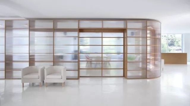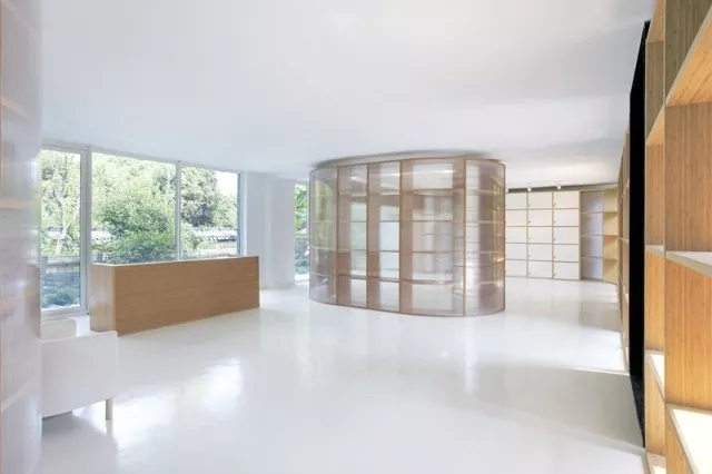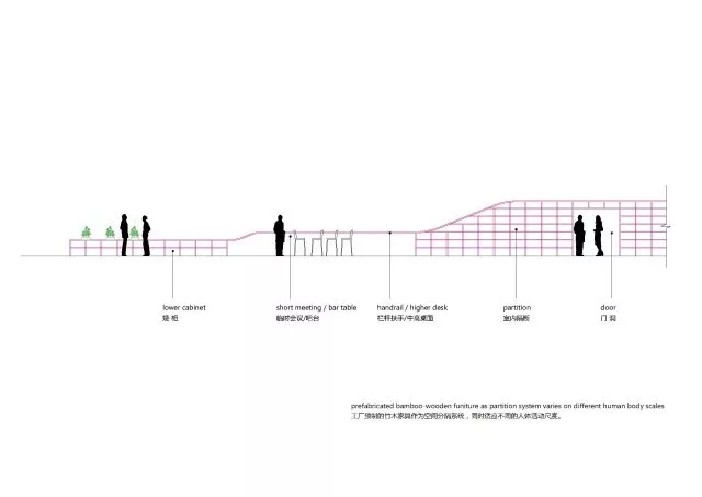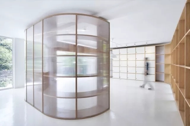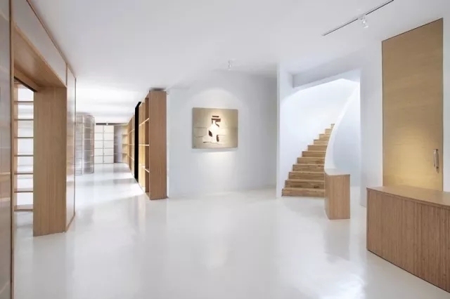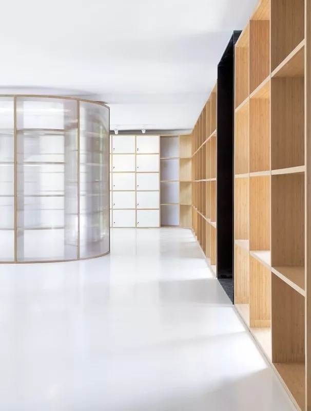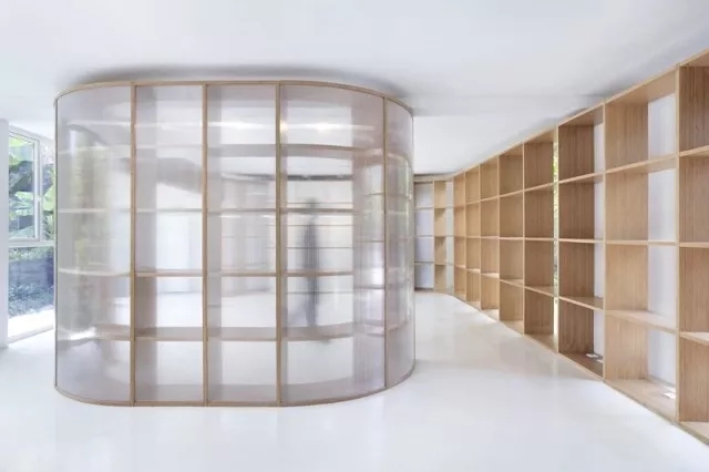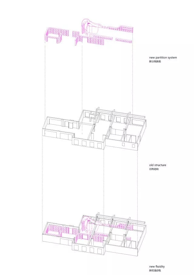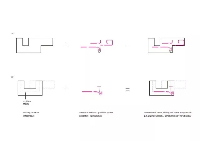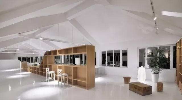 虽然基地拥有良好的室外自然景观条件,但原有建筑内部阴暗压抑:已有结构的1层层高3.3m,梁下高度2.6m, 空间比例相对低矮;2层空间的高度具有优势,但1,2层的联系较弱,原有建筑的双层特点也并没有展现出来。因此设计一开始考虑的是如何让上下层联系起来,不只是在空间上,也是在未来使用者的心理感知层面上。让楼上和楼下的人都能感觉另一部分成员的存在,营造出团队感。在氛围上希望营造出完全开放,具有空气感的流动空间。不止是单层平面的流动,还是上下层之间的流动感。如果我们把空间里的家具看成物体(object),把墙体,楼梯等结构看成背景(canvas),通过让家具(object)和结构(canvas)同化,连接,与人的身体最易发生关系的家具就会把这种流动感传递给人体。楼上的空间因为结构和家具的同化,也与楼下联系在一起。