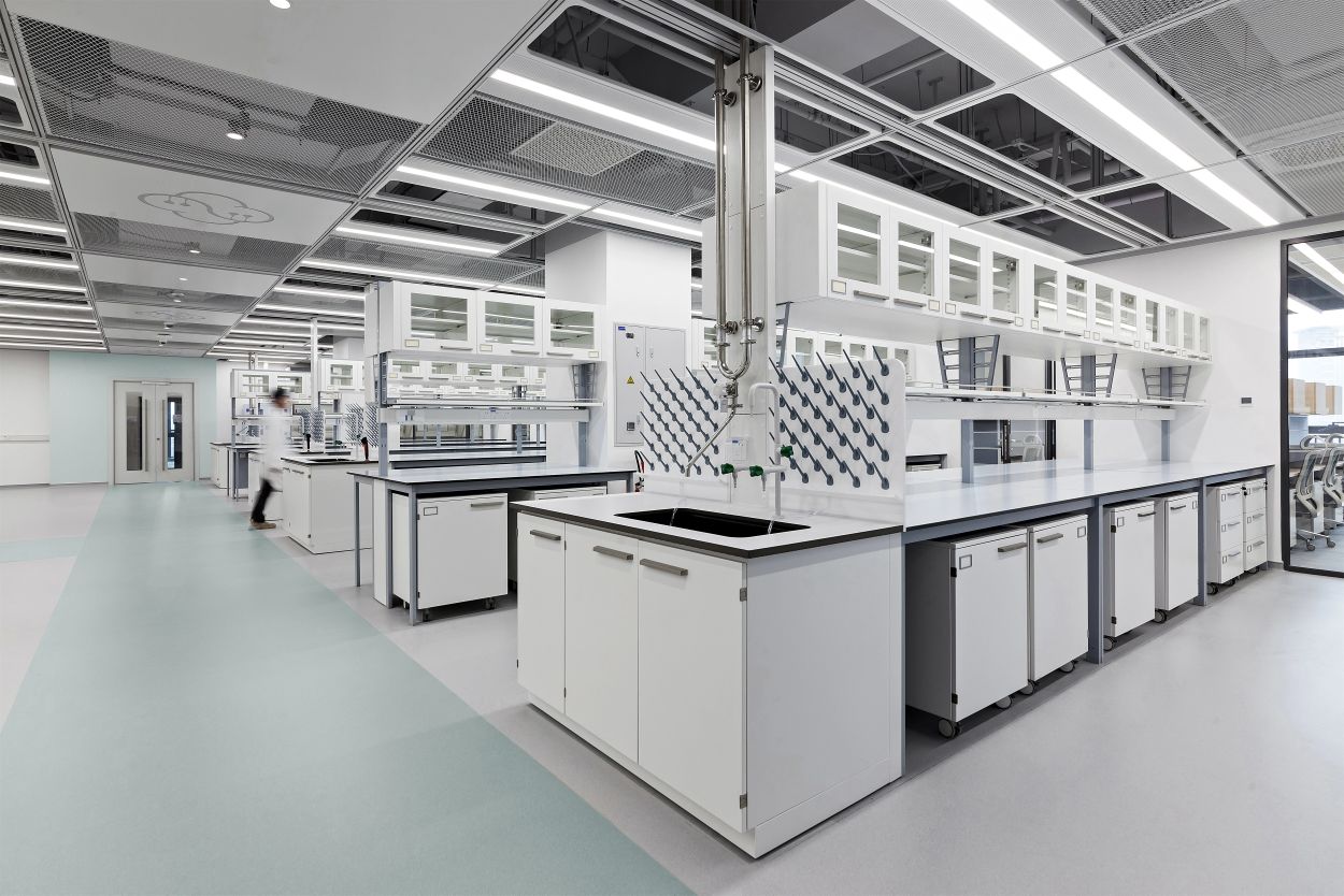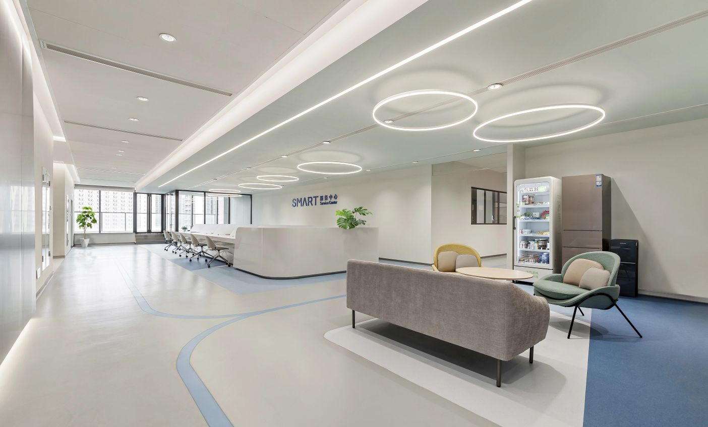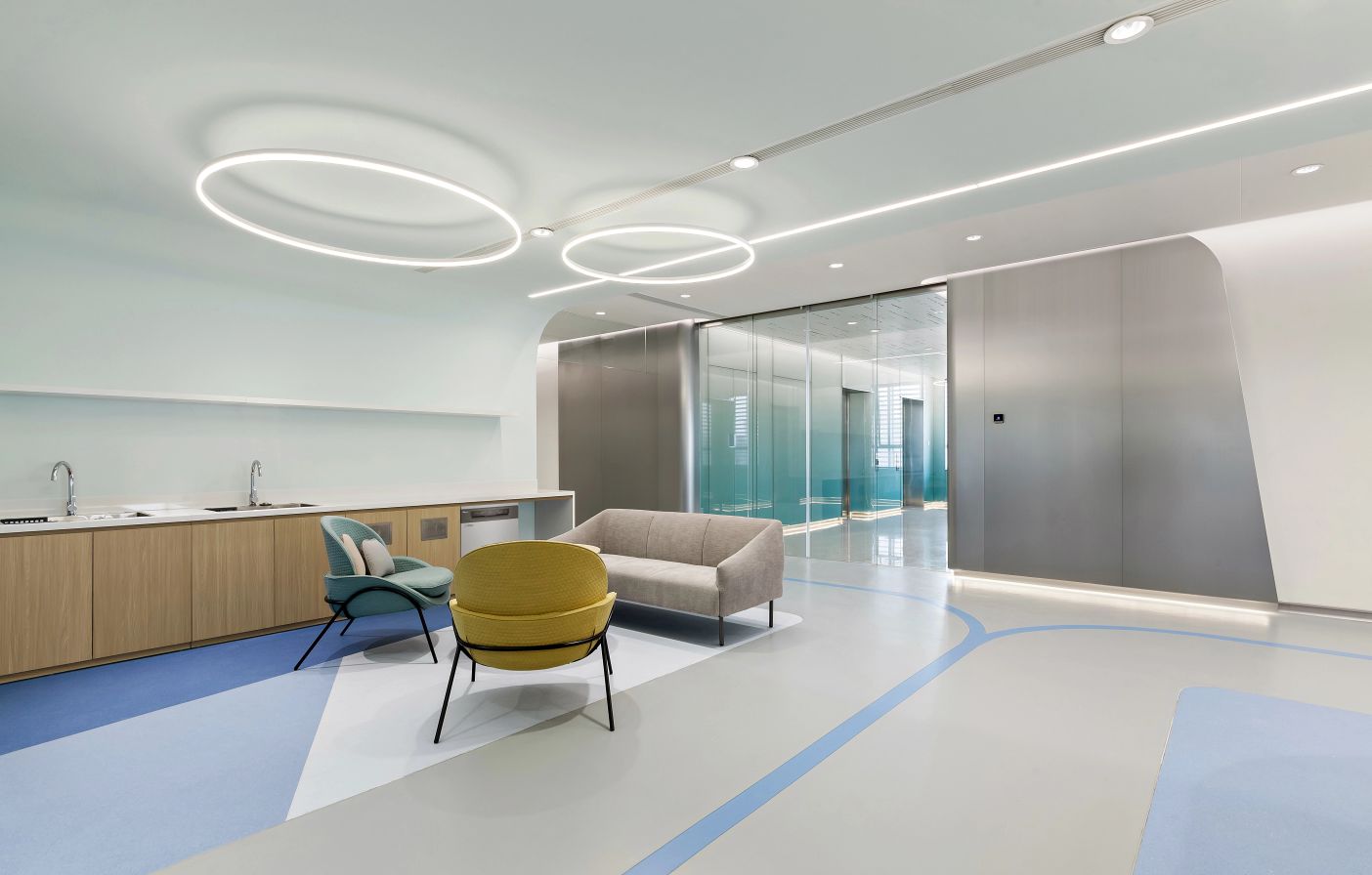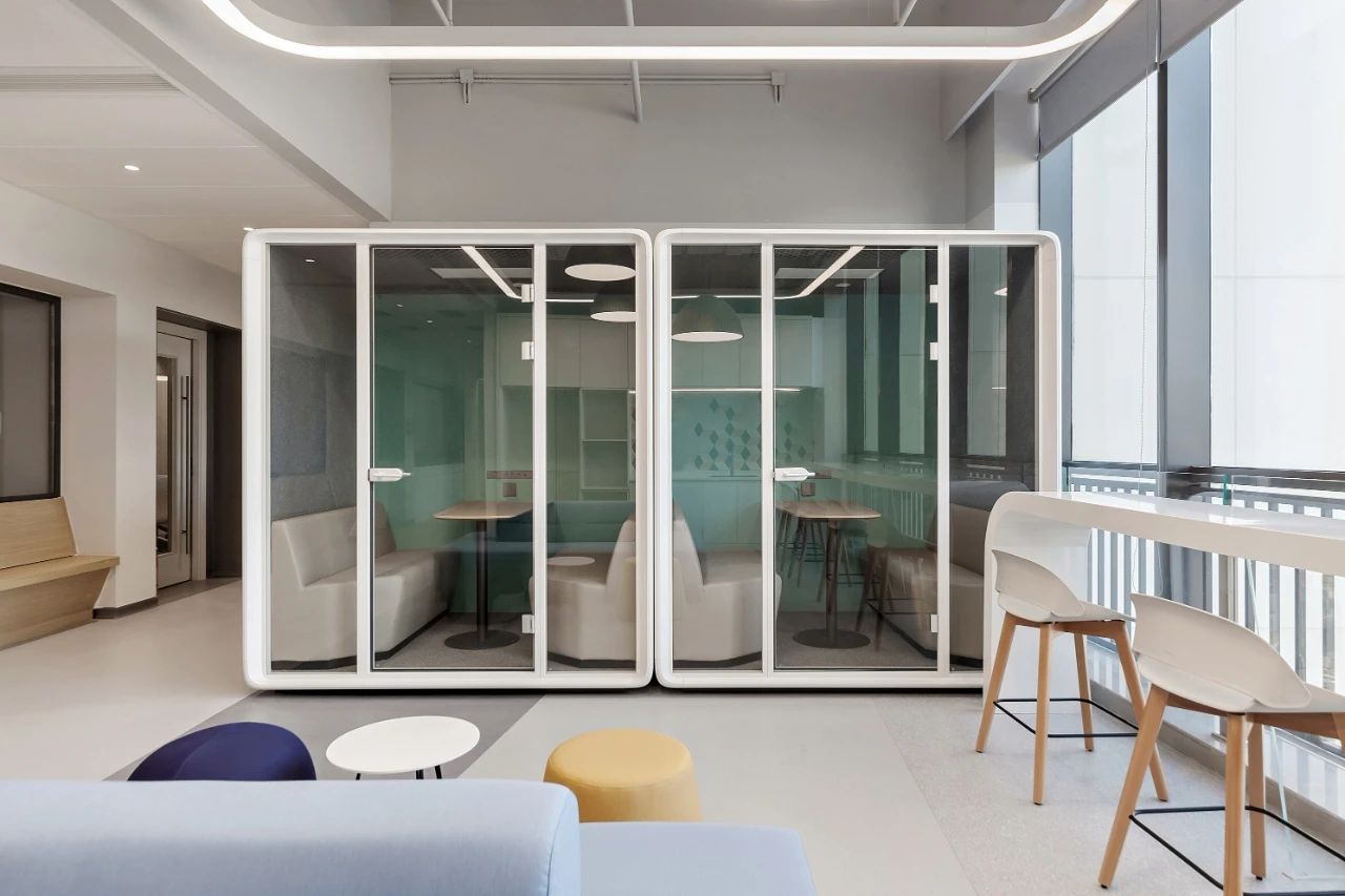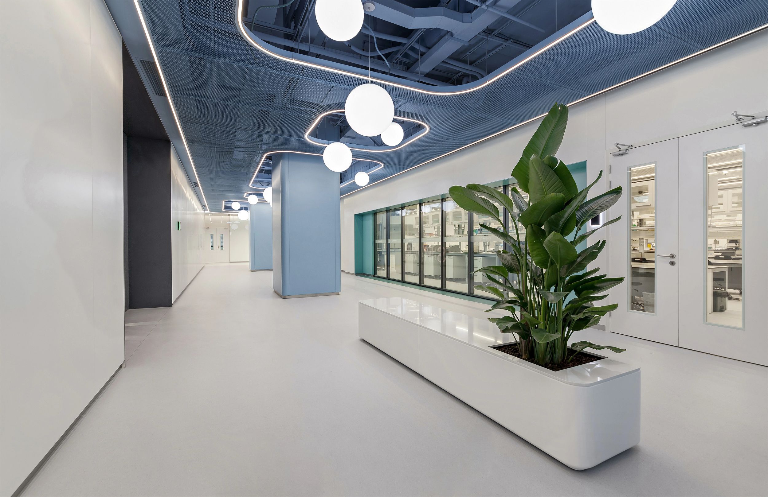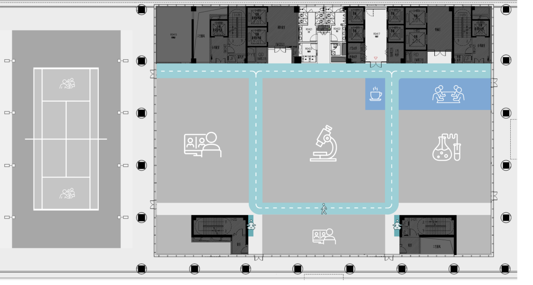 2F共享实验设备平台 | 医科院标志性的蓝以渐变的形式运用于二层电梯厅,入口设备展陈区加设移门,融合休闲、展示、小型会议功能,实现空间多元化高效利用。核心实验区与功能区巧借建筑黑空间和消防道自然分隔,临窗处利用柱间距设置卡座,为研究人员提供可坐可躺的自由休憩空间。