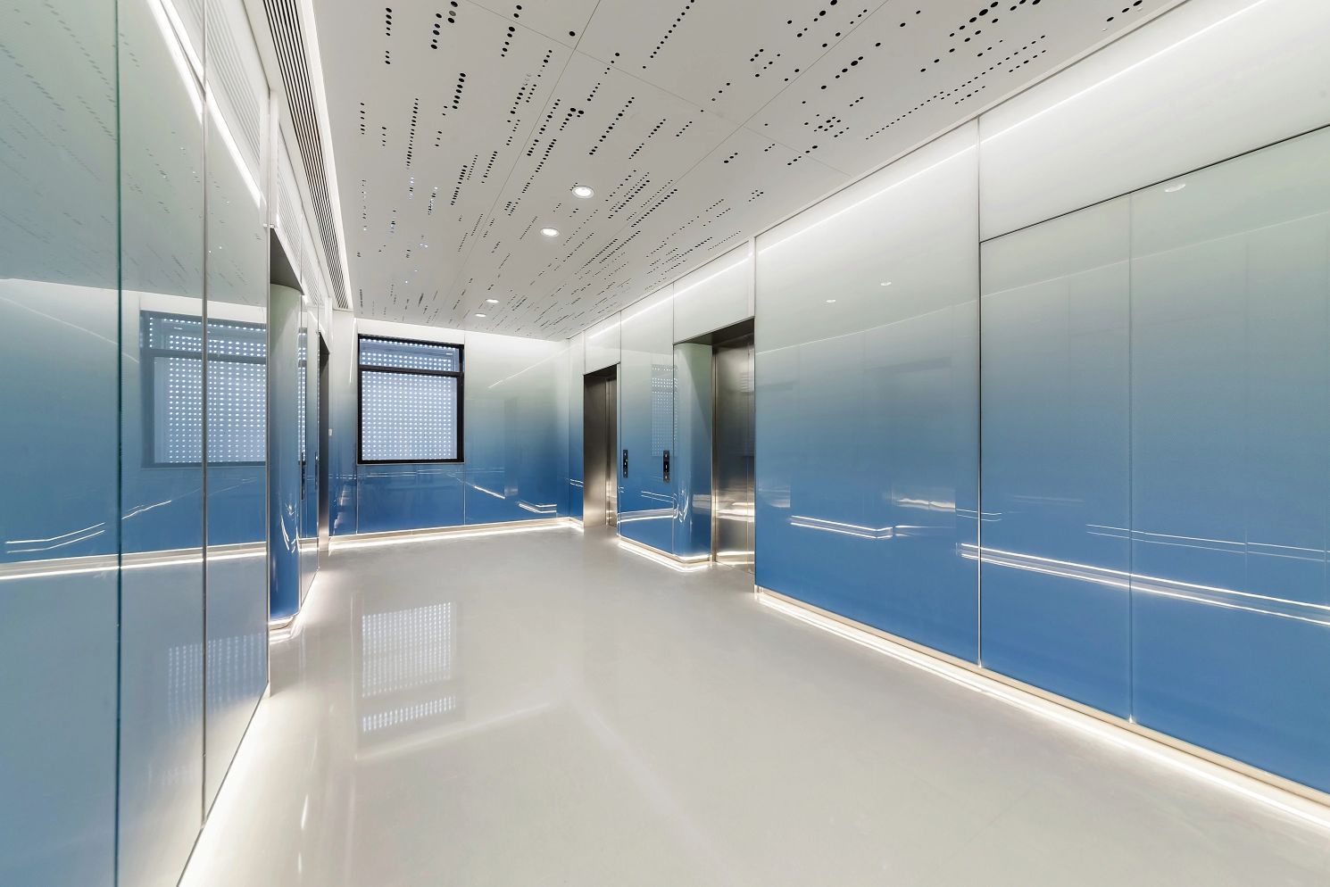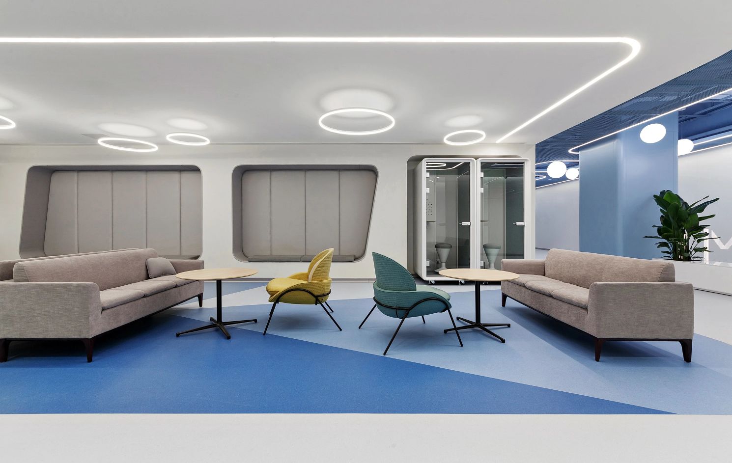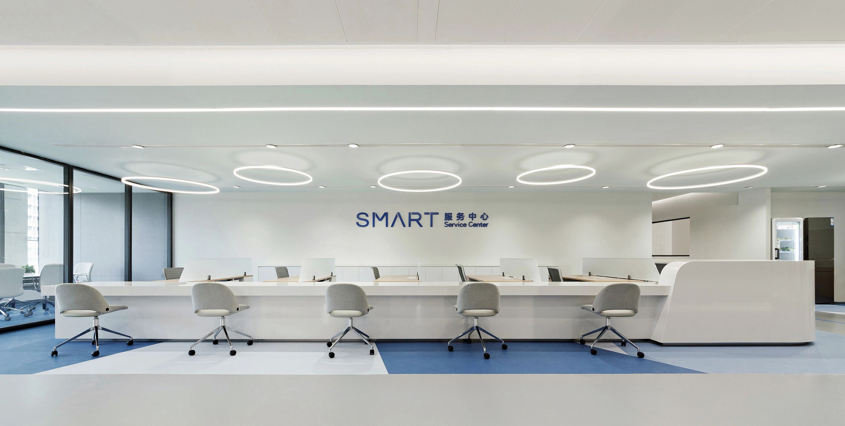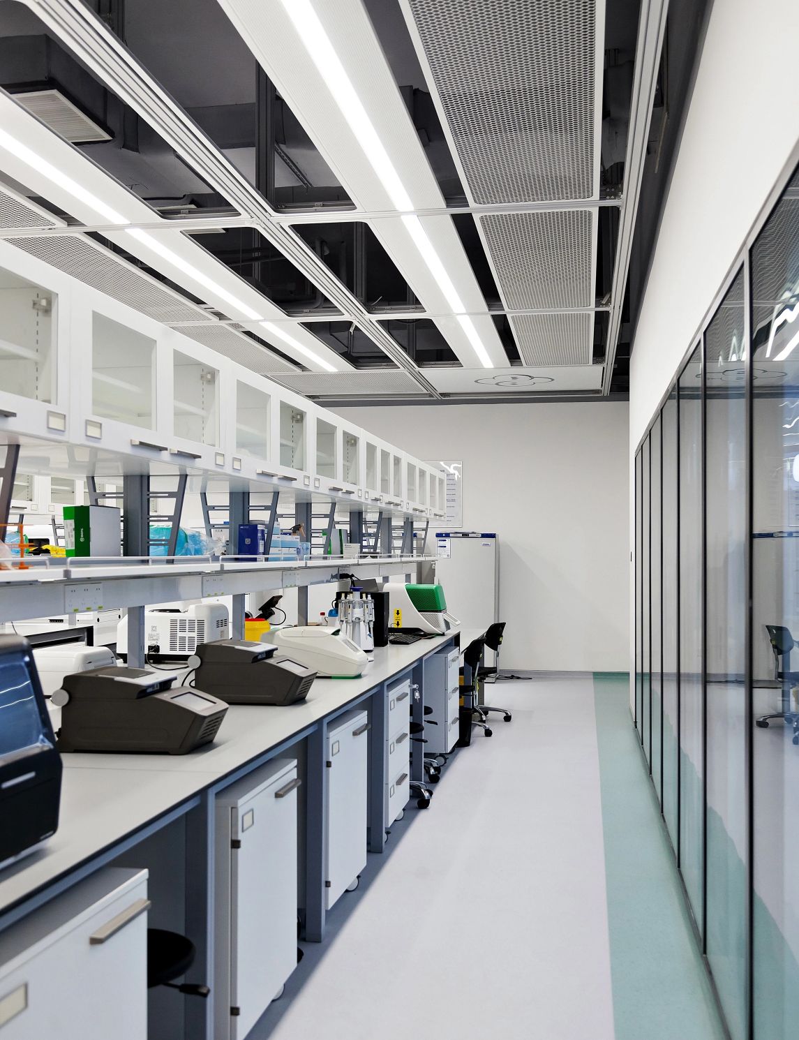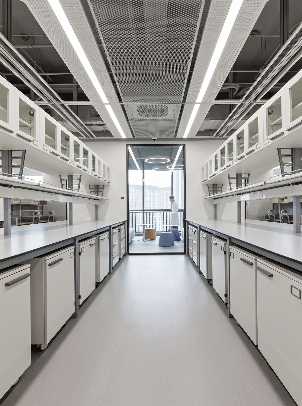 2F共享实验设备平台 | 医科院标志性的蓝以渐变的形式运用于二层电梯厅,入口设备展陈区加设移门,融合休闲、展示、小型会议功能,实现空间多元化高效利用。核心实验区与功能区巧借建筑黑空间和消防道自然分隔,临窗处利用柱间距设置卡座,为研究人员提供可坐可躺的自由休憩空间。
