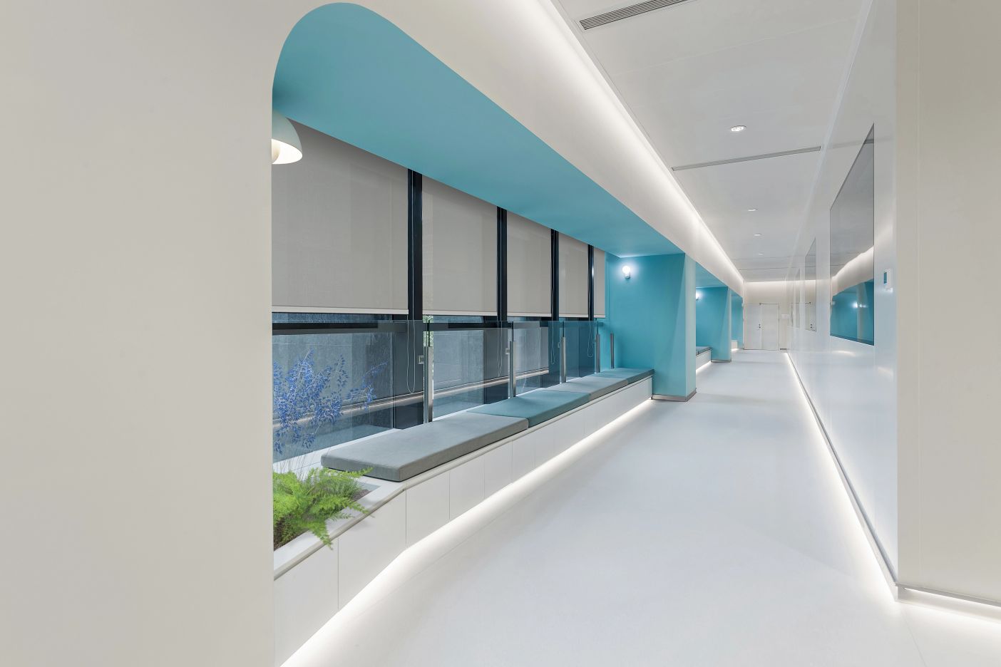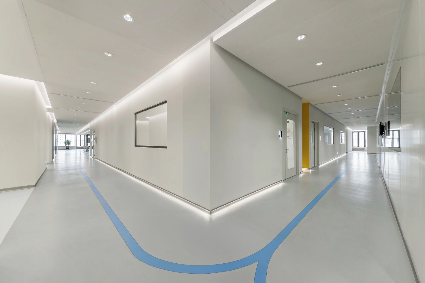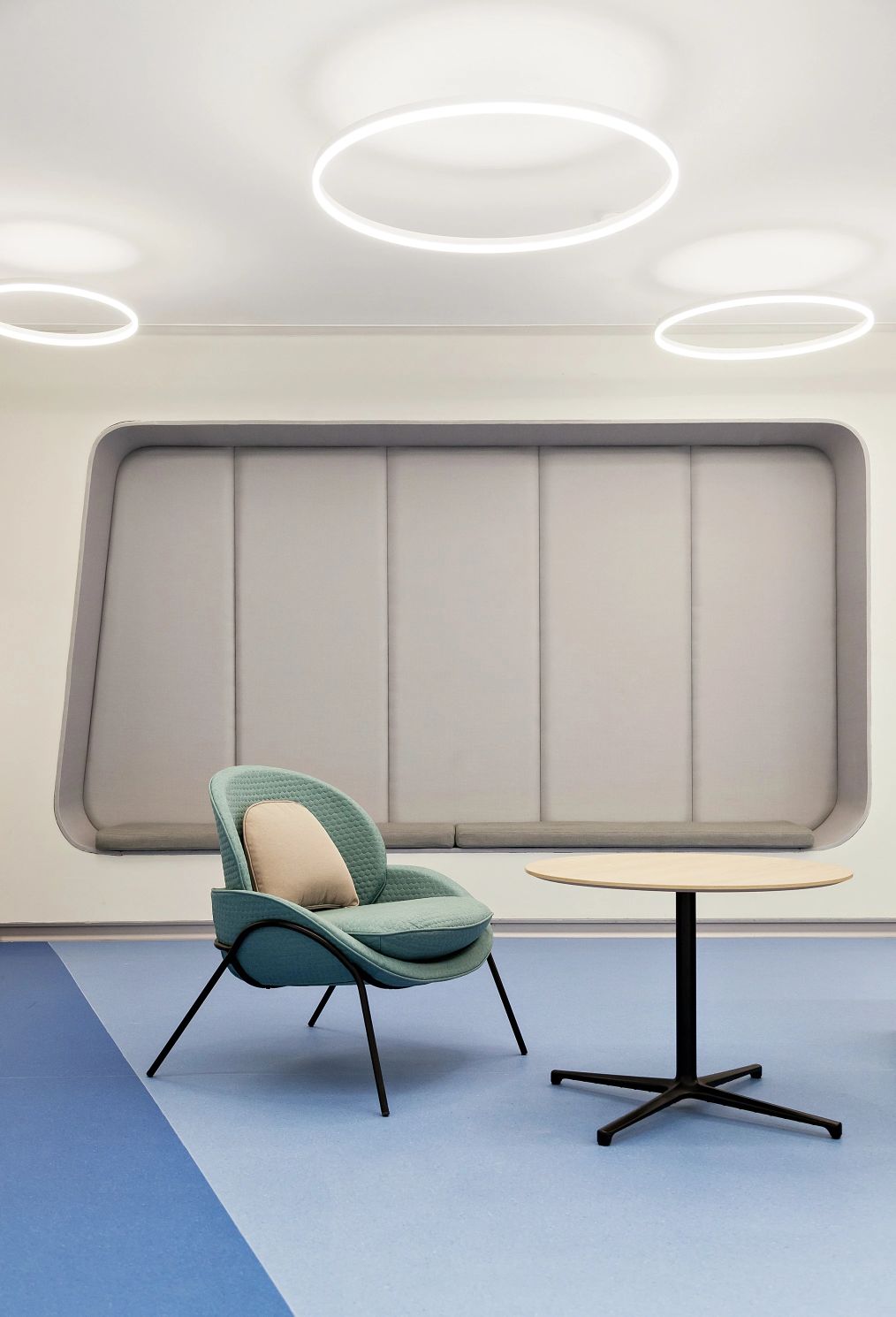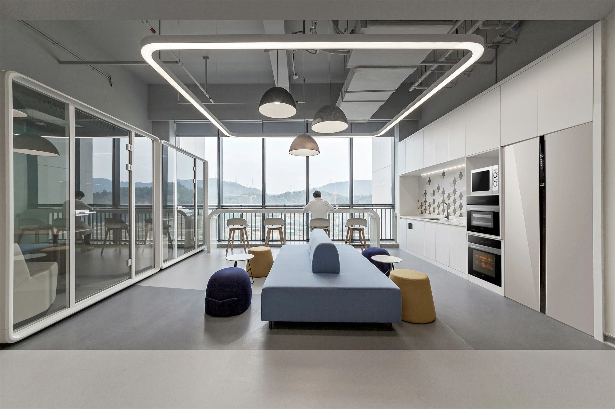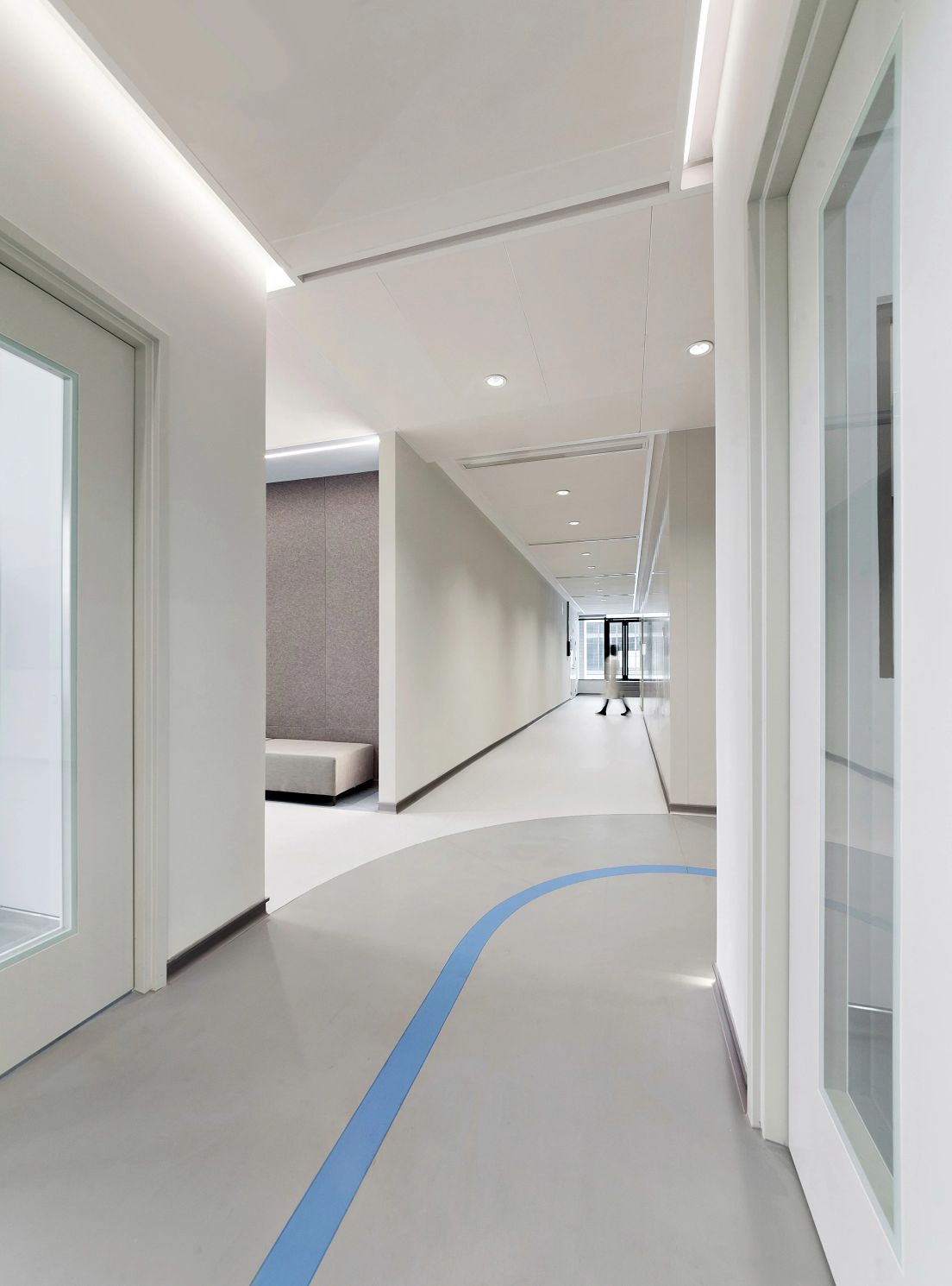 2F共享实验设备平台 | 医科院标志性的蓝以渐变的形式运用于二层电梯厅,入口设备展陈区加设移门,融合休闲、展示、小型会议功能,实现空间多元化高效利用。核心实验区与功能区巧借建筑黑空间和消防道自然分隔,临窗处利用柱间距设置卡座,为研究人员提供可坐可躺的自由休憩空间。