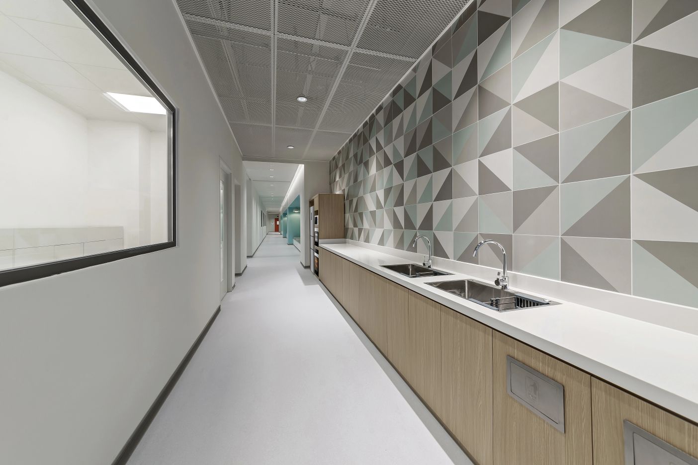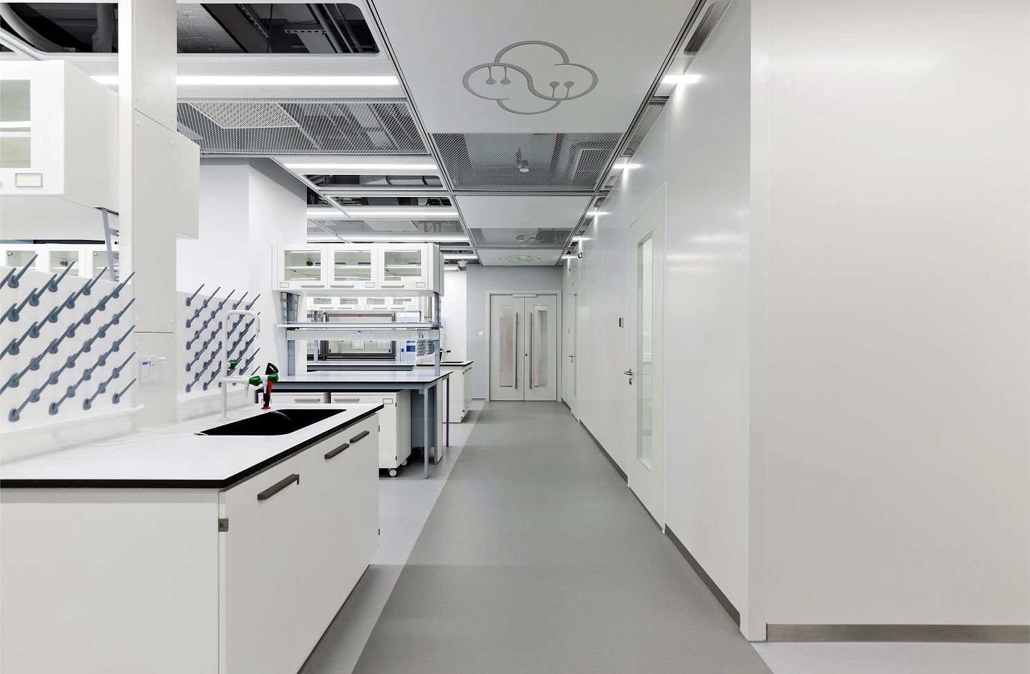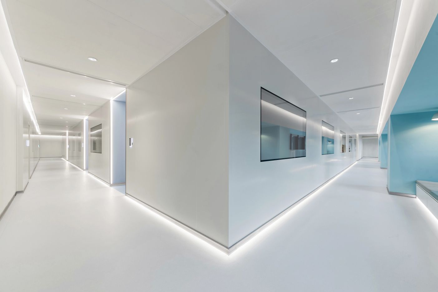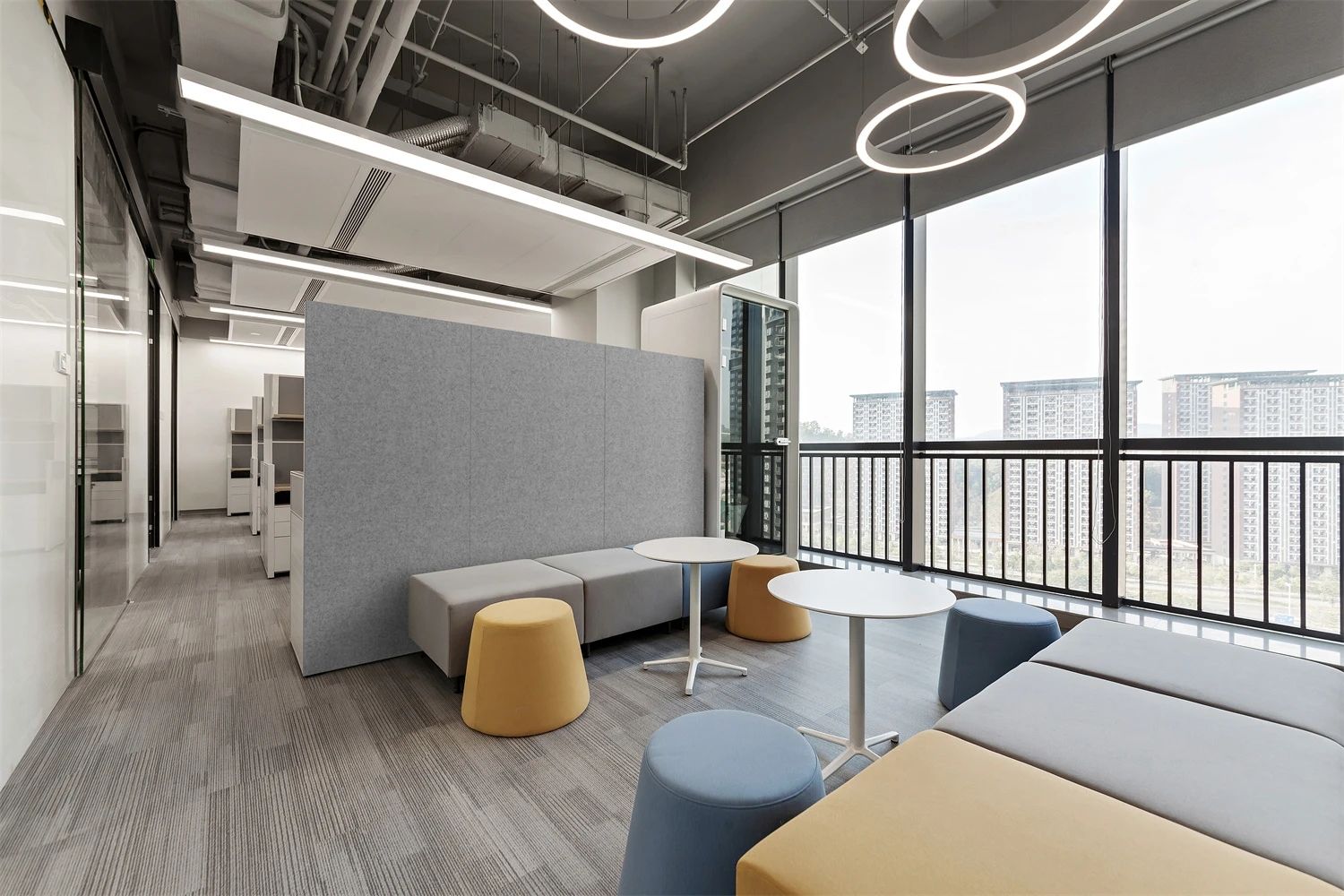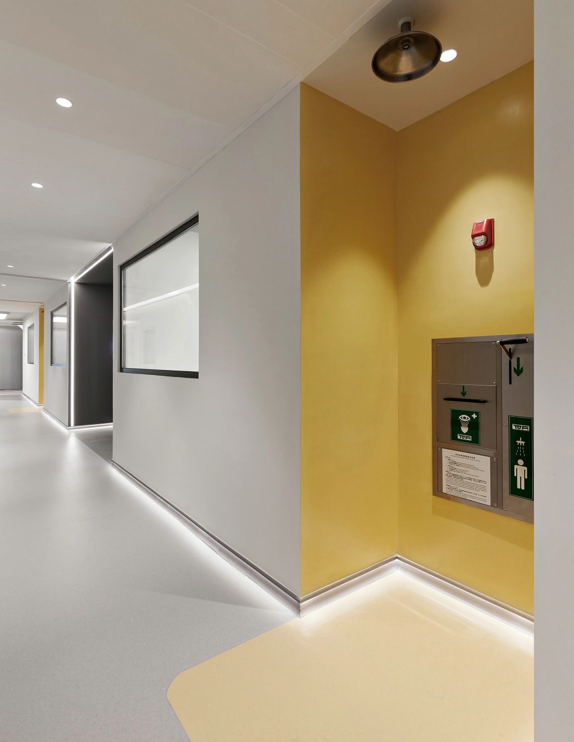 2F共享实验设备平台 | 医科院标志性的蓝以渐变的形式运用于二层电梯厅,入口设备展陈区加设移门,融合休闲、展示、小型会议功能,实现空间多元化高效利用。核心实验区与功能区巧借建筑黑空间和消防道自然分隔,临窗处利用柱间距设置卡座,为研究人员提供可坐可躺的自由休憩空间。
