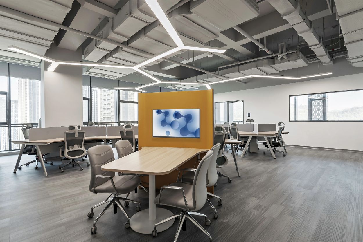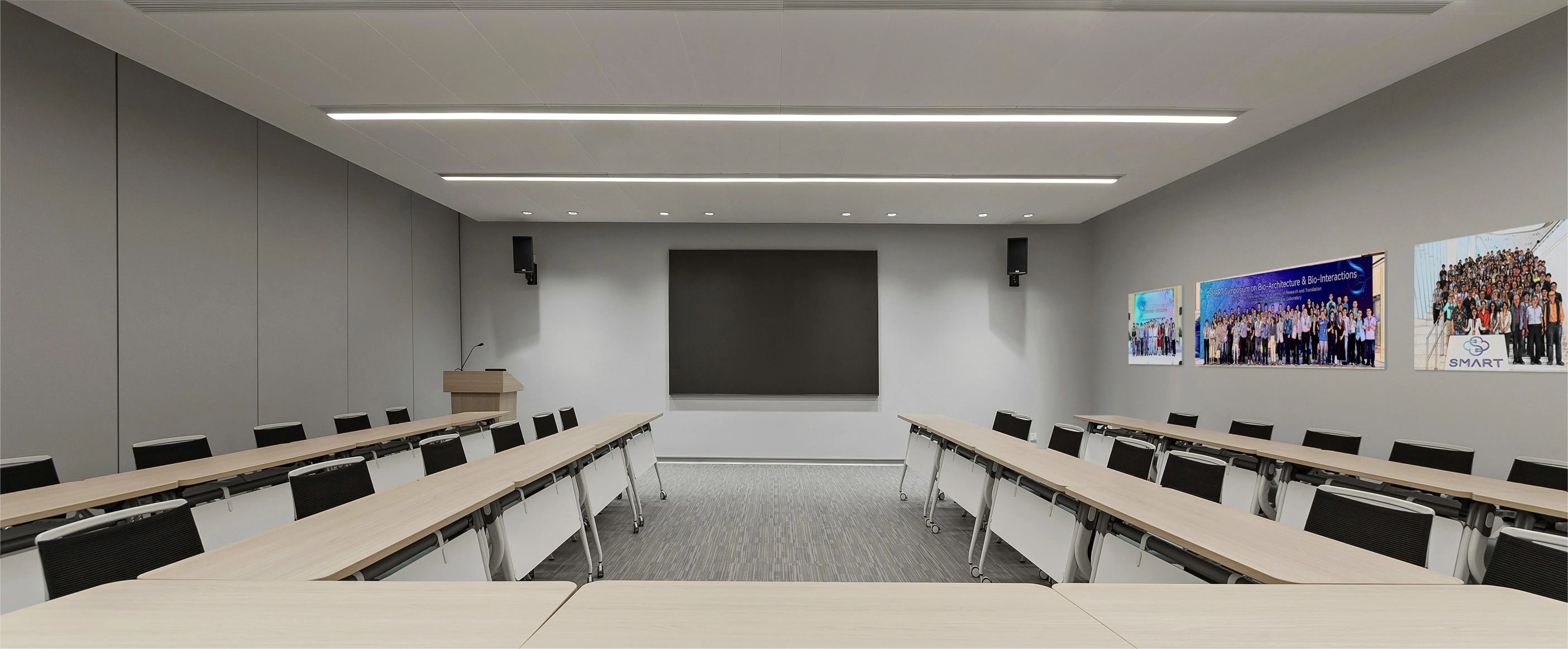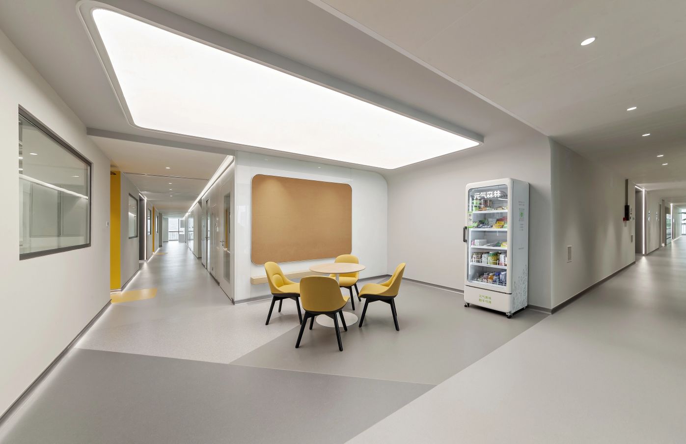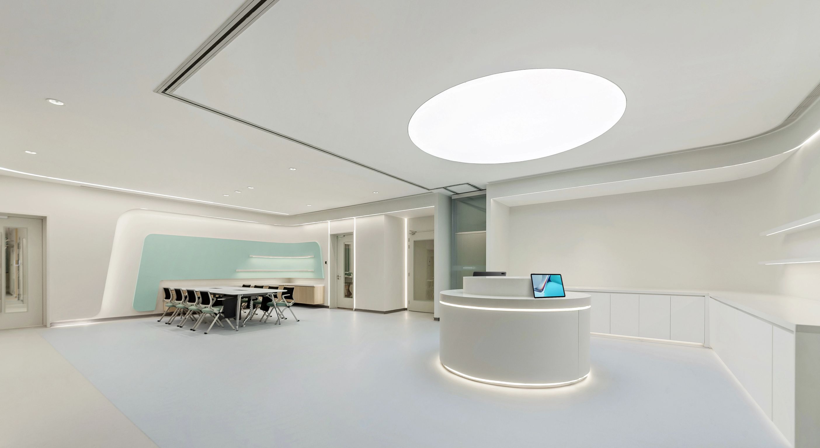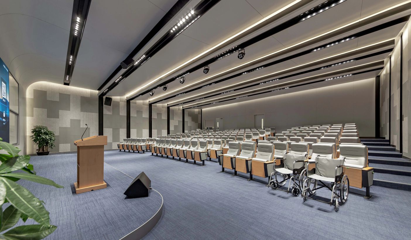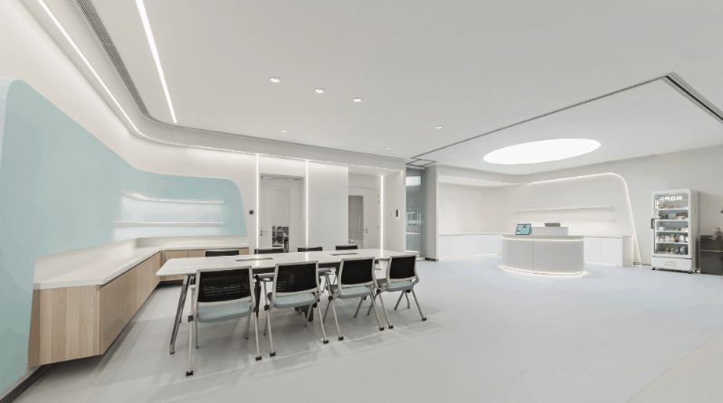 3F研讨层培训室、实验室 | 三层充分利用了建筑大跨度柱网的特点,集中布局报告厅与多规格研讨室等。扩充后的走廊具备签到、茶歇功能,天花的简雅弧线与悬浮吊灯共同营造出一种科幻视感,仿佛置身于星辰大海、宇宙天空的广袤之中,让人感受到科研灵感的无处不在。