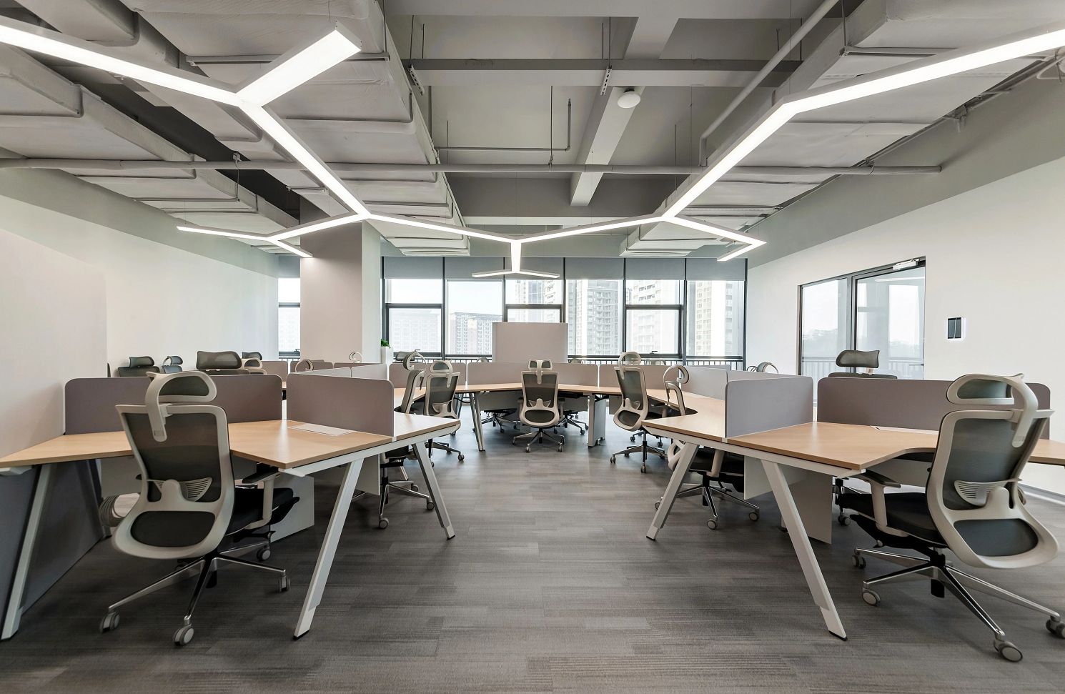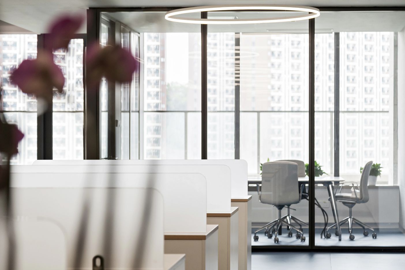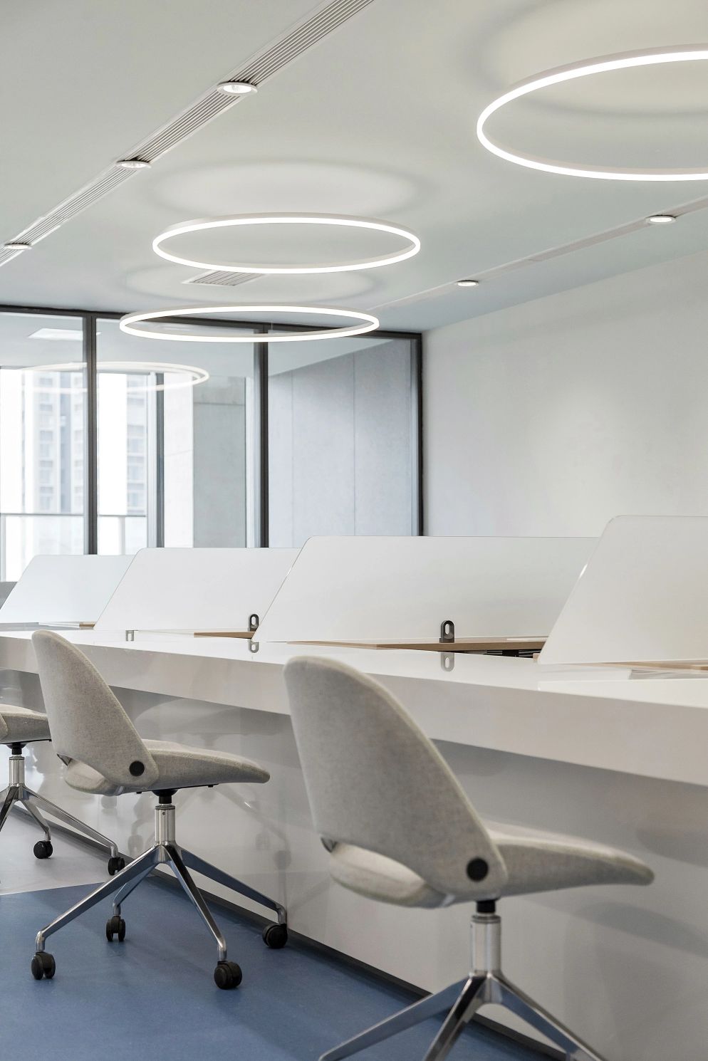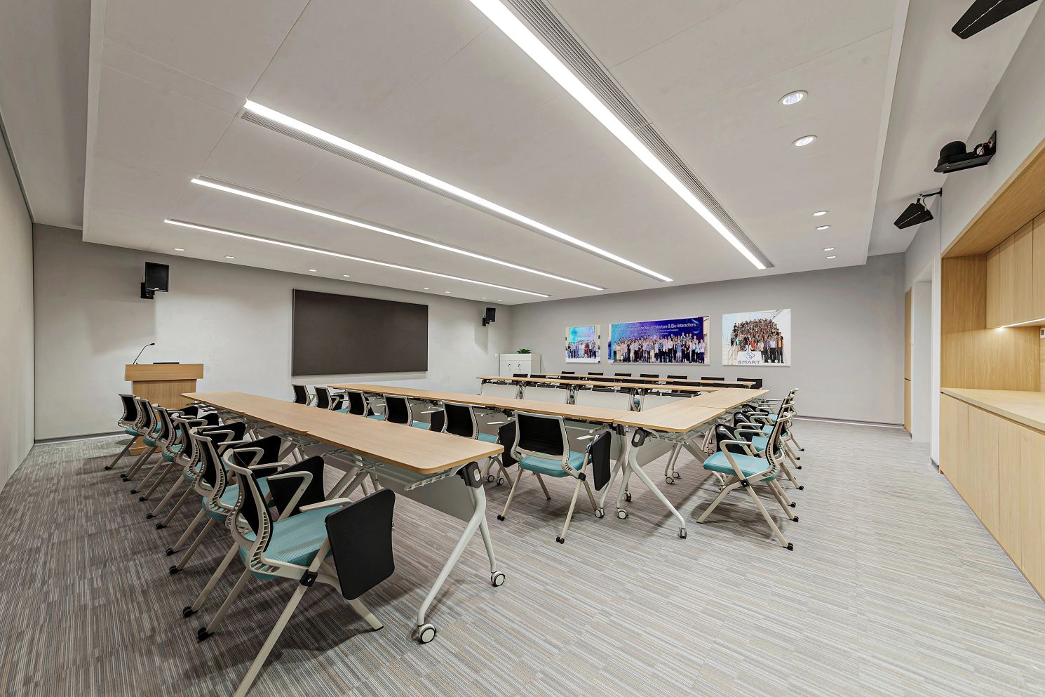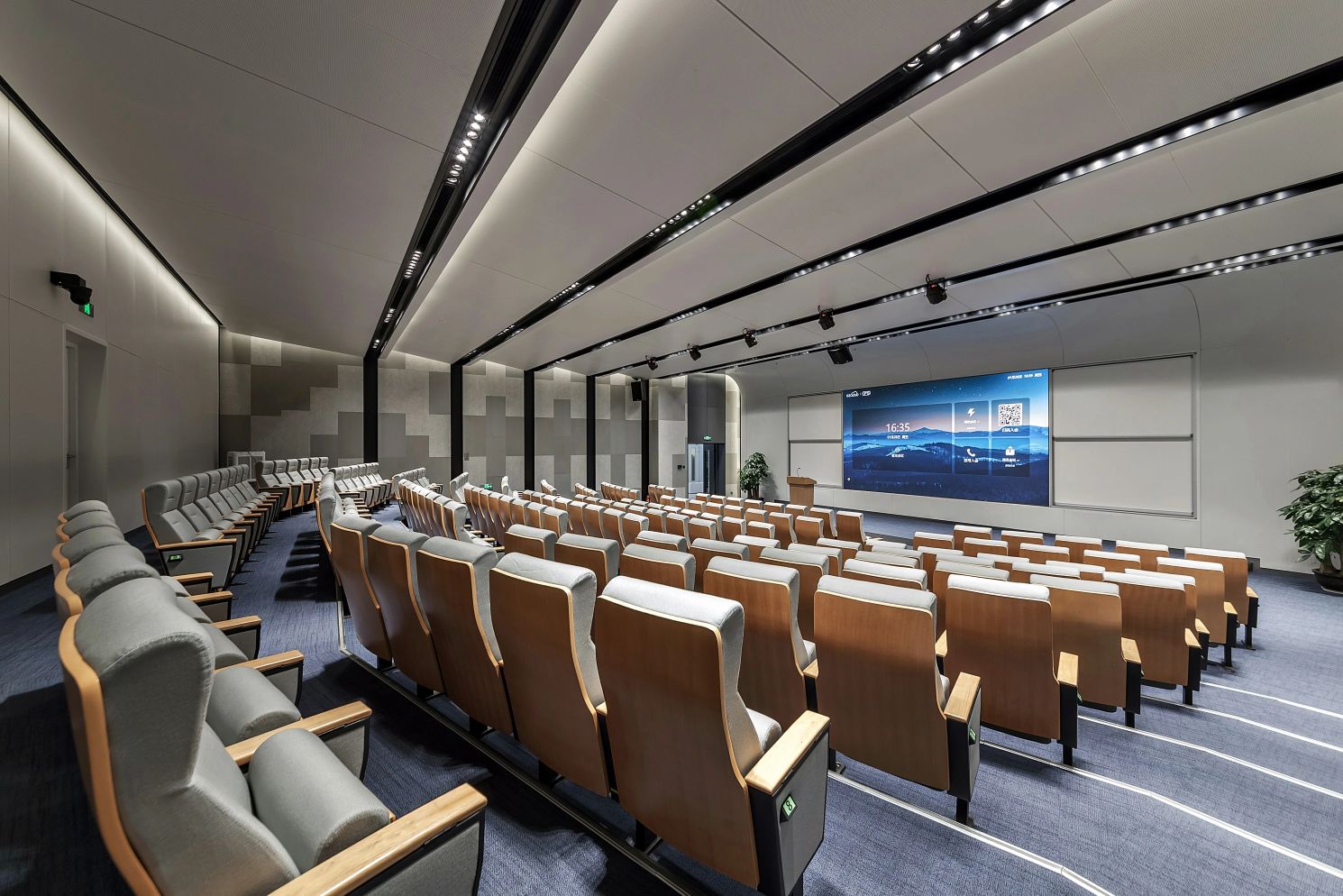 3F研讨层培训室、实验室 | 三层充分利用了建筑大跨度柱网的特点,集中布局报告厅与多规格研讨室等。扩充后的走廊具备签到、茶歇功能,天花的简雅弧线与悬浮吊灯共同营造出一种科幻视感,仿佛置身于星辰大海、宇宙天空的广袤之中,让人感受到科研灵感的无处不在。
