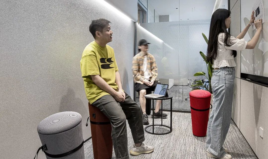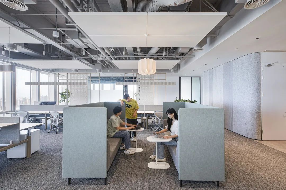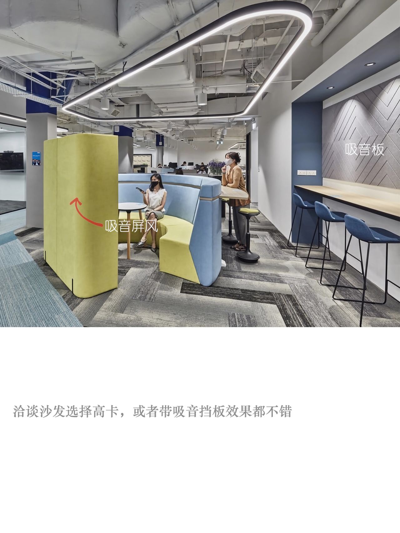 建筑的外立面不可改动,但又为了改善室内的光环境,我们利用顶部的白色金属板将户外的阳光进行二次反射,来扩大自然光线在室内的照射深度,同时利用建筑外立面的窗台的现有结构,设计出了一条卡座阅读区,和一些站立式办公工位。