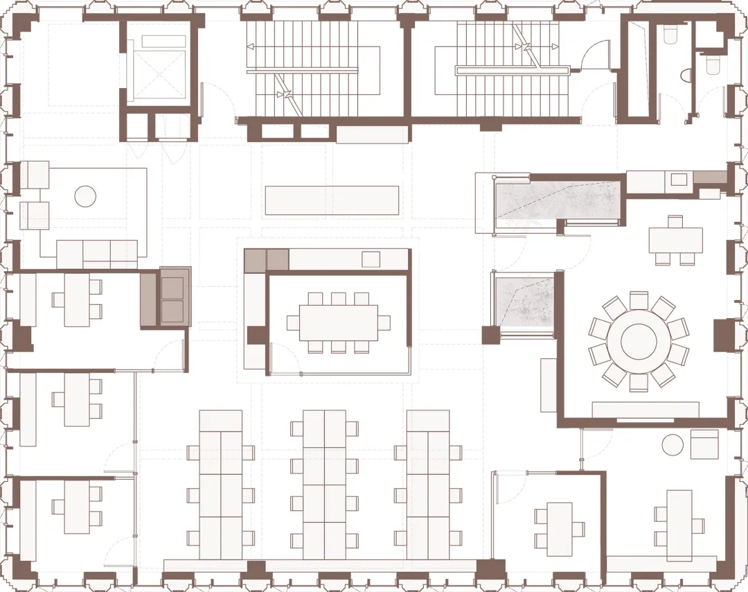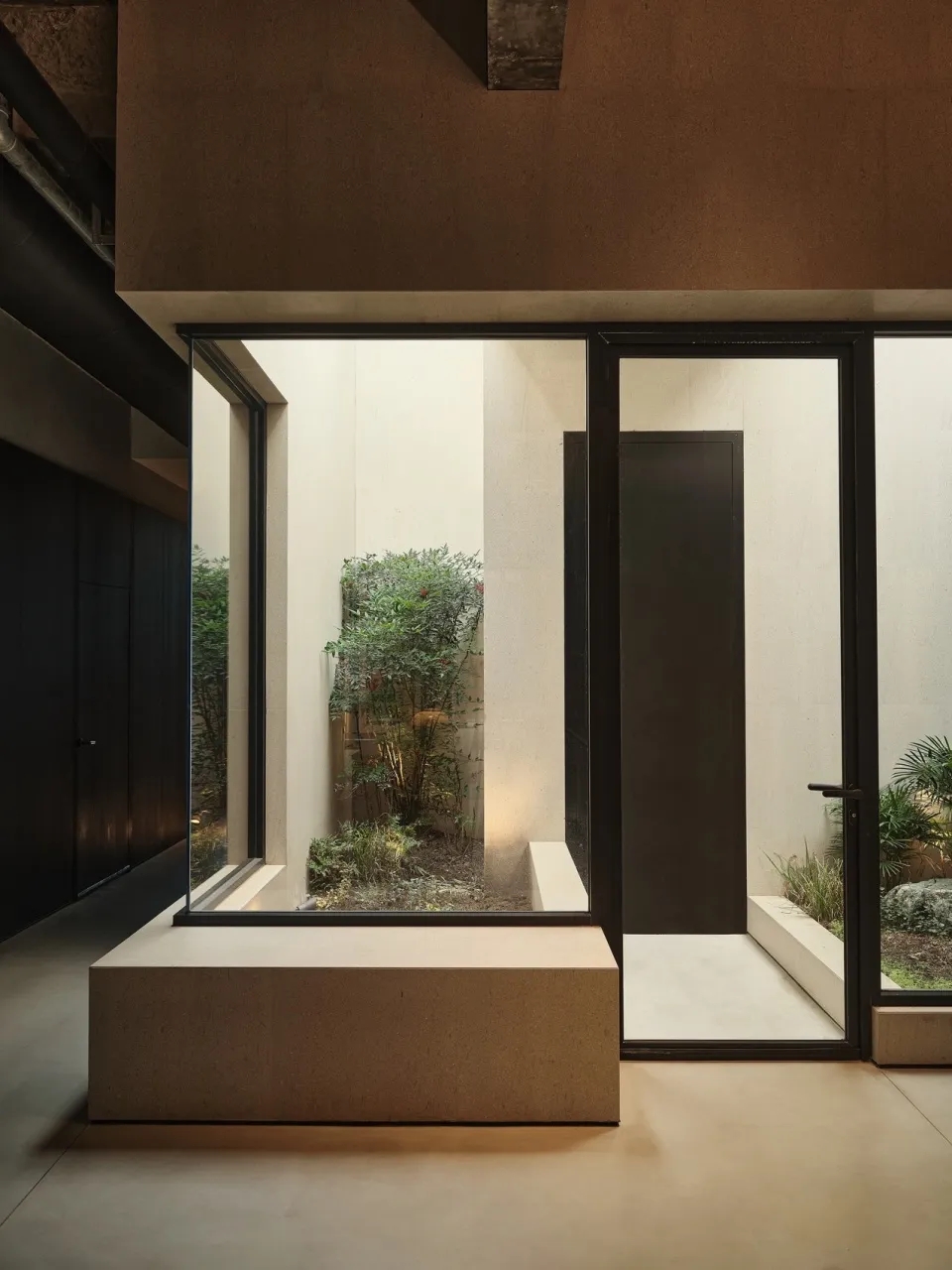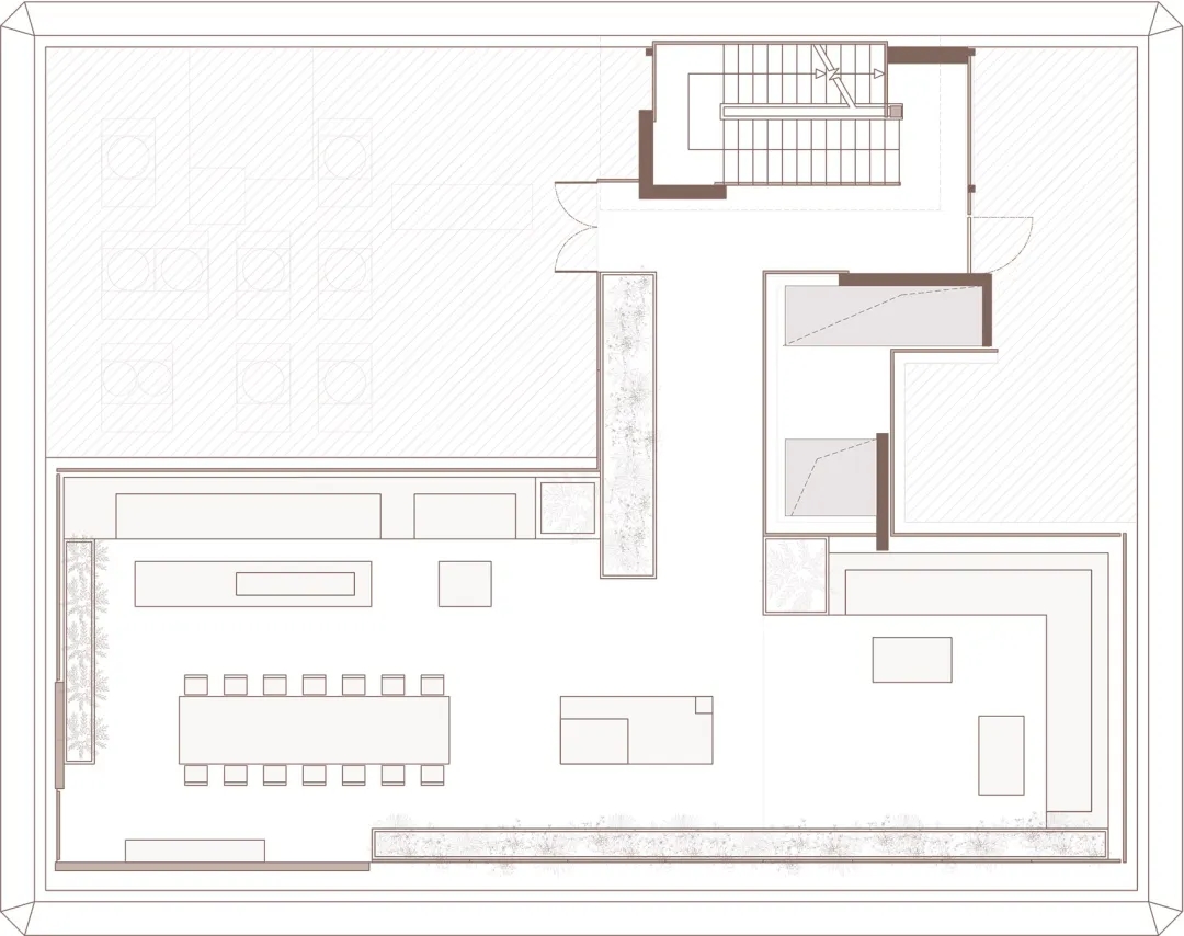原建筑布局为方正规整的柱网结构,我们希望打造一个可与外界环境自由切换又融合的开放办公环境,室内空间与户外自然结合,同时保留局部空间的私密性。整体空间结构采用虚实结合,我们在柱网中心围合出一个相对“实体”的中心岛区域,容纳小会议室、开放厨房和影印储藏功能。这座多功能的中心岛作为公共与私密的过渡,区隔从接待交流的公共区进入相对私密安静的办公区。柱子并未完全包裹而是将其局部露出,弱化中心岛的封闭体量感,让空间流动起来。与实体中心岛比邻对景的是一处补充采光的景观“虚”空间,这也是办公空间中另一个核心重点。我们希望为封闭的室内办公空间打造一处连通户外的自然之地,于是借助顶层空间优势,将建筑进行局部改造,设计增加下沉庭院,引入采光天井,将室内空间打开与楼顶露台相连。天井里一高一低的树池可适配种植不同根系品种的植物,以丰富景观。不论从电梯厅入口的“客厅”接待区,透过开放式厨房,还是从内部开放办公区、通往卫生间的过道,都能望见这一片对景庭院,从室内即可感受户外气息,室外景观与室内空间既彼此独立又巧妙融合。自然之地承载对景、采光、分隔和空间切换的功能,同时也连接了开放办公空间与会客室。进入会客室需要穿过庭院,由一个灰空间连廊相接,形成一个由室内到室外,再步入室内的独特体验。天井的墙体设计巧思在于其延伸至楼顶露台,不仅串联上下空间,也为会客室留下一处庭院景观框景,保留了私密性。从公司内部楼梯行至楼顶露台则来到完全的室外空间,我们并未选用成品户外家具,而是用混凝土定制浇筑成烤火炉、矮台、座椅和树池,背靠钢板挡墙,辅以绿植点缀,作为公司活动场所,创造了一个既适合自然休闲又可工作交流的多功能户外空间。