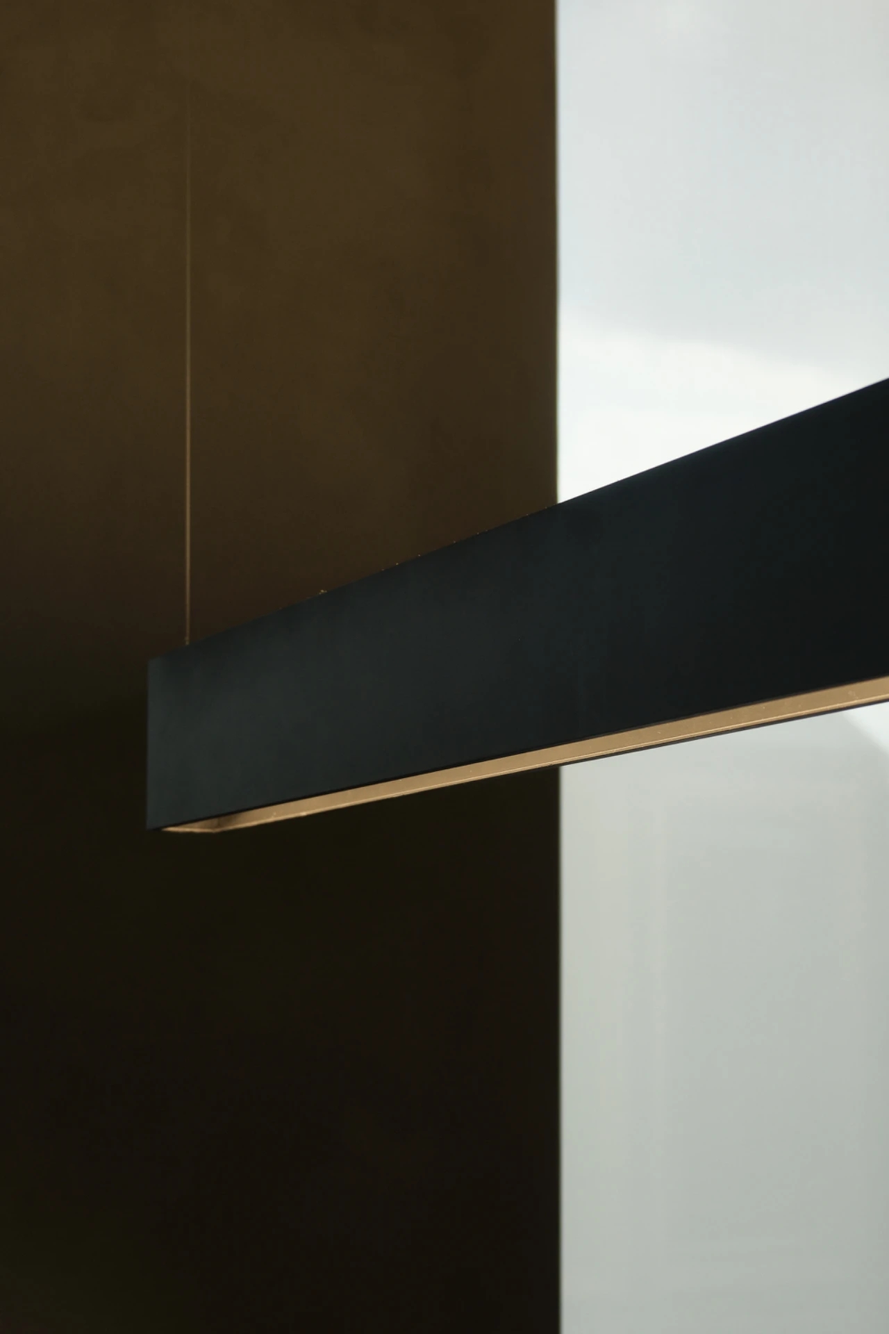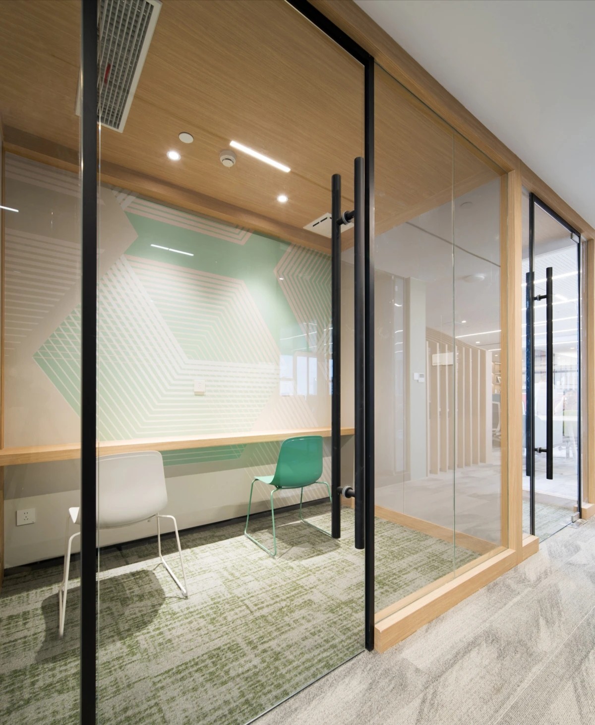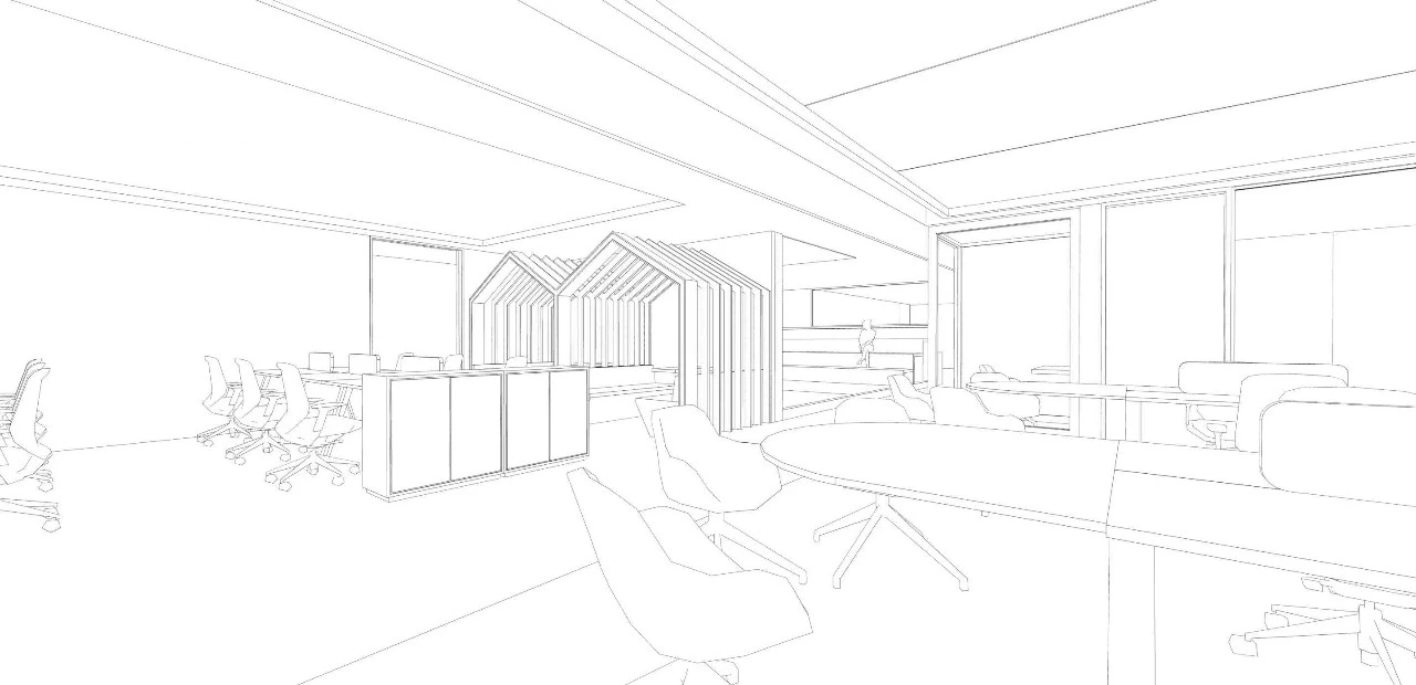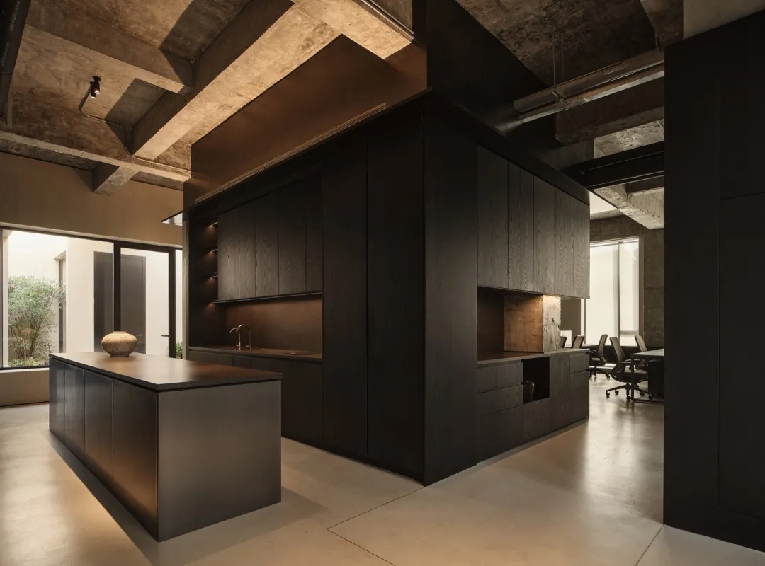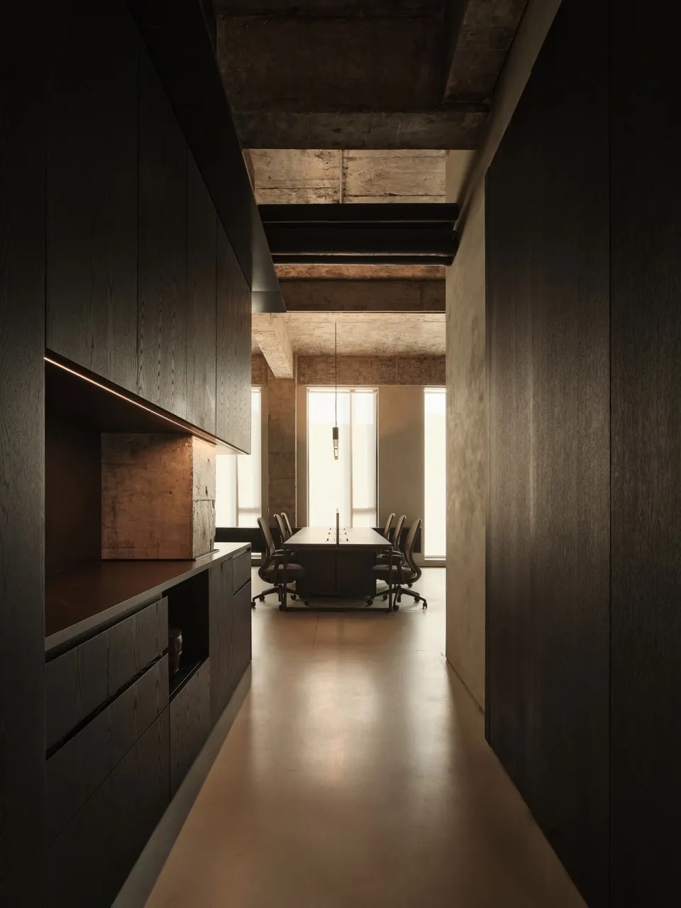 整个办公空间采用无吊顶设计,直接露出原有梁底结构,局部配以筒灯精准照明。开放办公区的吊灯可上下发光,微暖的灯光营造柔和氛围。室内材料简约克制,以木材、艺术涂料和水泥自流平为主。公区开放厨房和茶水空间用黑色木板包裹环绕,面向开放办公空间则为黑框玻璃。我们用同样的木板材料将岛台对面管井包裹起来,做成半围合长椅空间,人们可在此休息洽谈并与开放厨房形成互动。开放办公空间的沿窗柜子也沿用黑色木板,与办公家具结合,不同材质间的对话,冷静而克制。