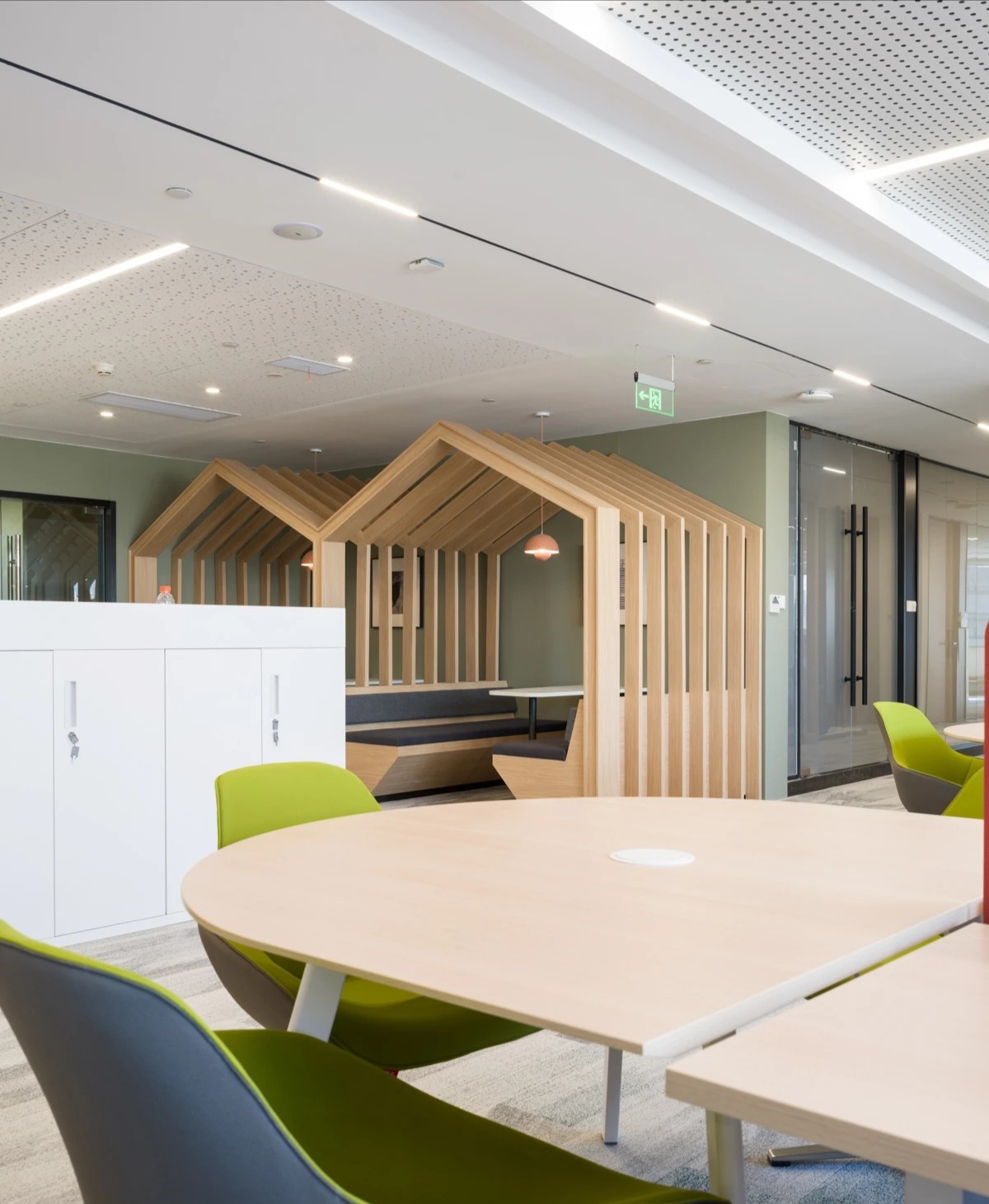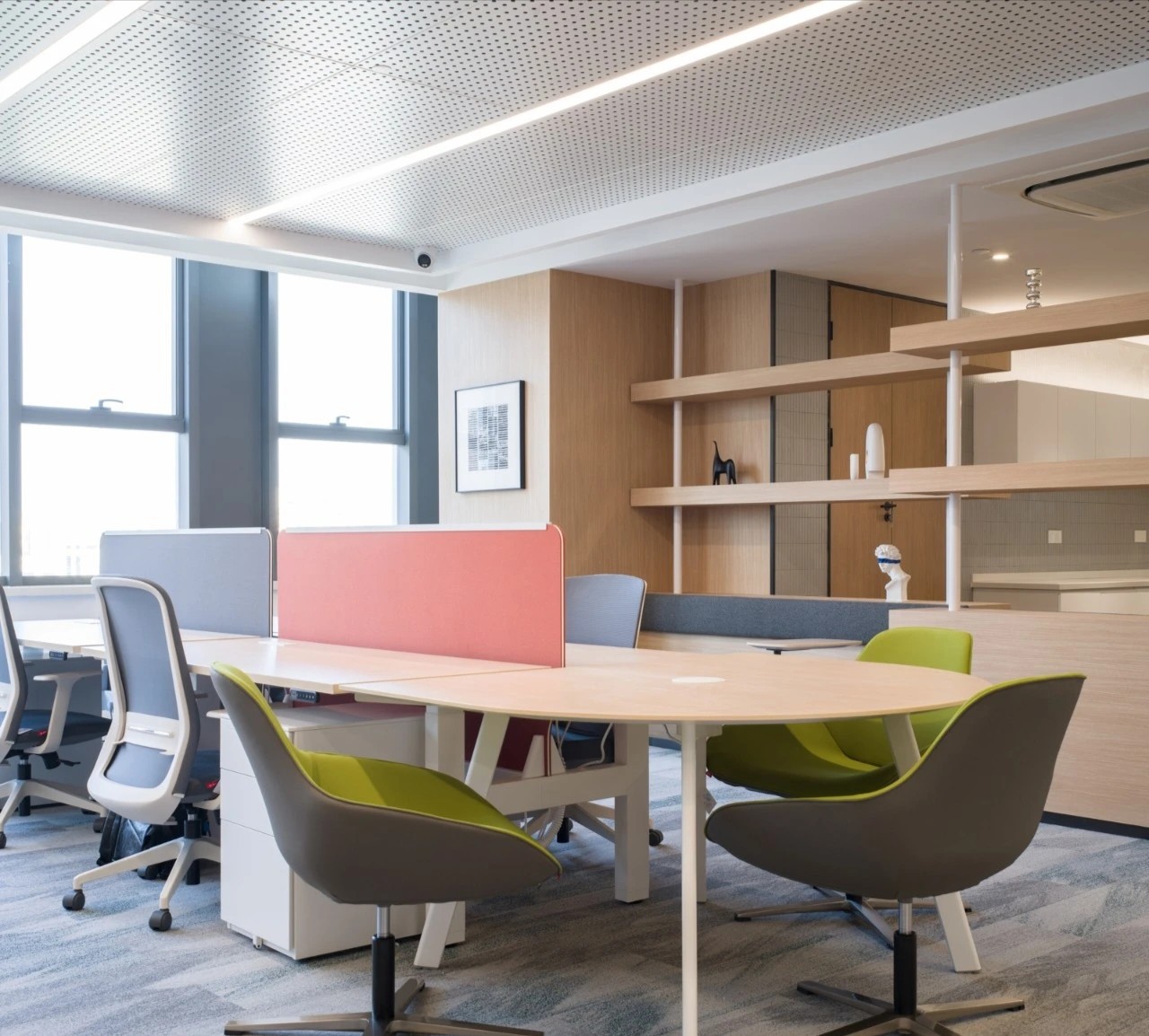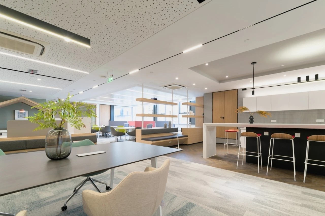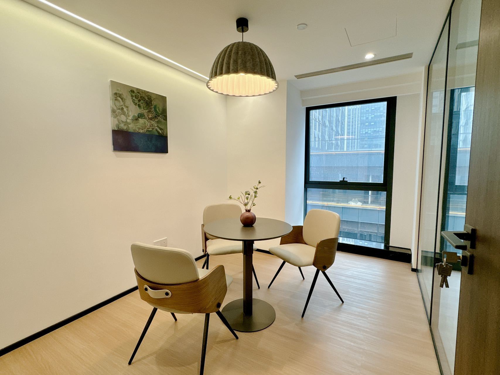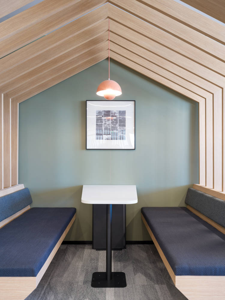 整个办公空间采用无吊顶设计,直接露出原有梁底结构,局部配以筒灯精准照明。开放办公区的吊灯可上下发光,微暖的灯光营造柔和氛围。室内材料简约克制,以木材、艺术涂料和水泥自流平为主。公区开放厨房和茶水空间用黑色木板包裹环绕,面向开放办公空间则为黑框玻璃。我们用同样的木板材料将岛台对面管井包裹起来,做成半围合长椅空间,人们可在此休息洽谈并与开放厨房形成互动。开放办公空间的沿窗柜子也沿用黑色木板,与办公家具结合,不同材质间的对话,冷静而克制。