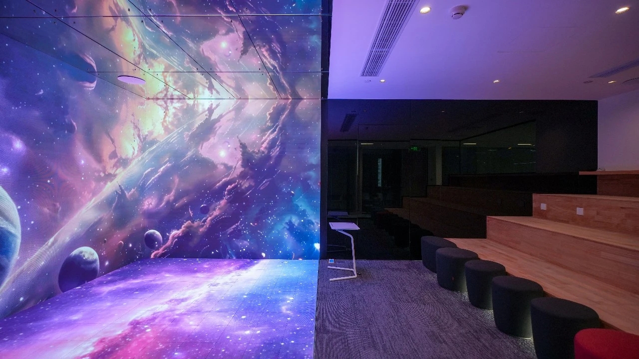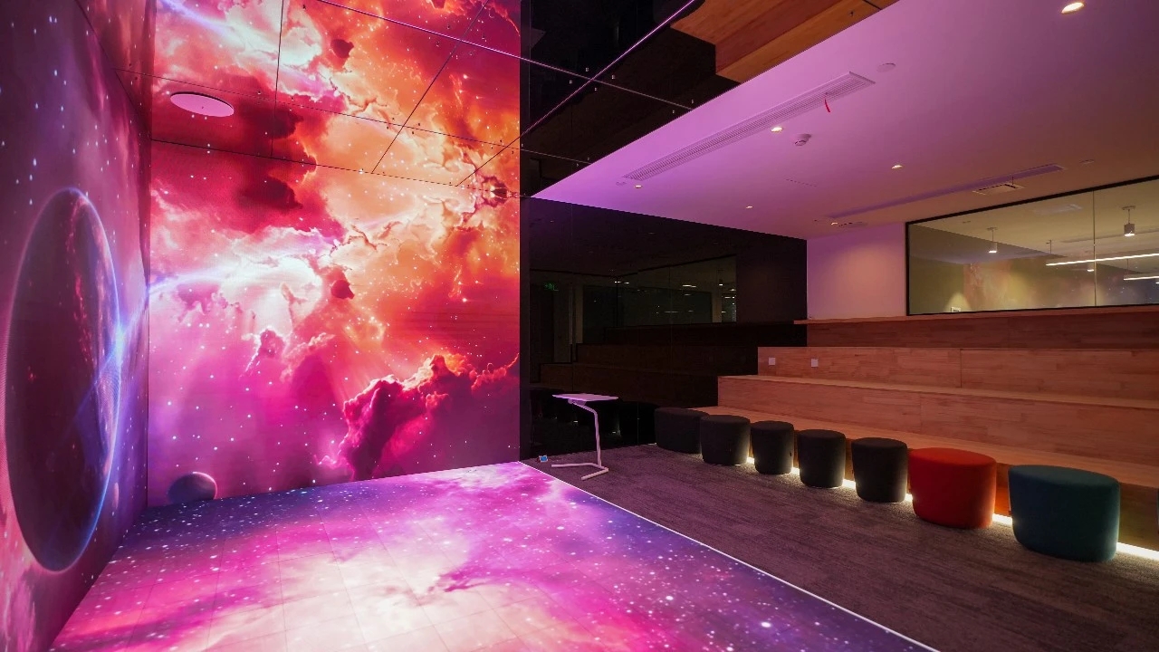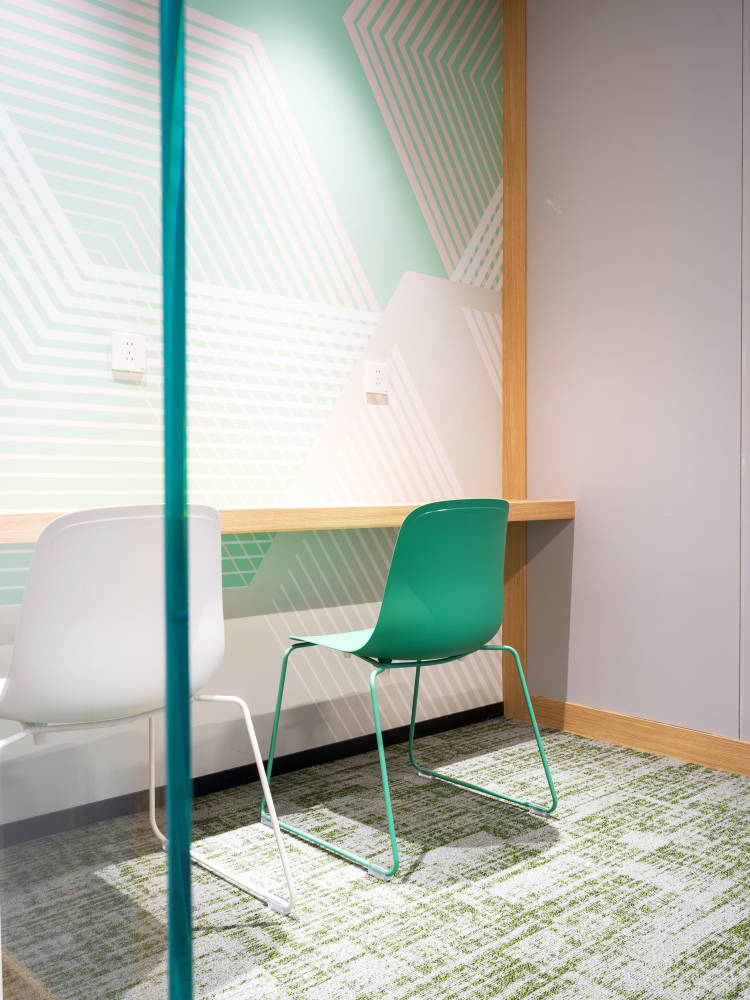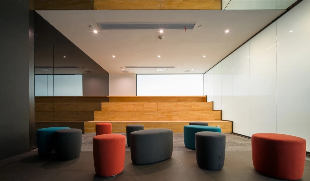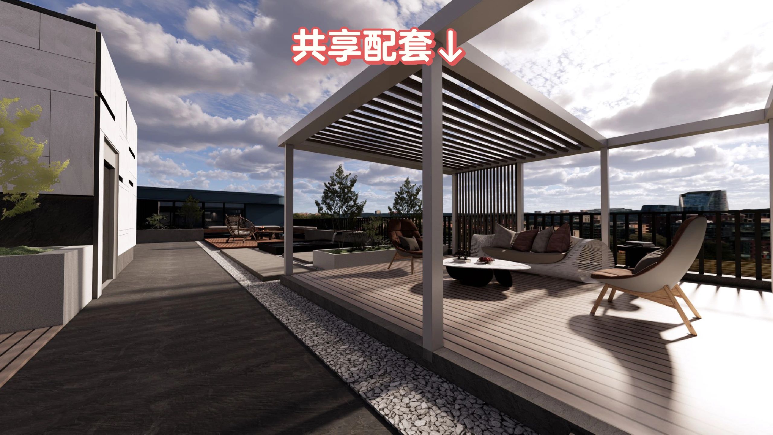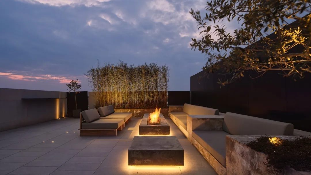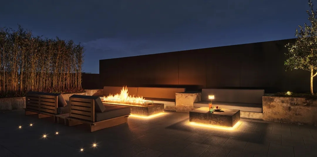 自然之地承载对景、采光、分隔和空间切换的功能,同时也连接了开放办公空间与会客室。进入会客室需要穿过庭院,由一个灰空间连廊相接,形成一个由室内到室外,再步入室内的独特体验。天井的墙体设计巧思在于其延伸至楼顶露台,不仅串联上下空间,也为会客室留下一处庭院景观框景,保留了私密性。从公司内部楼梯行至楼顶露台则来到完全的室外空间,我们并未选用成品户外家具,而是用混凝土定制浇筑成烤火炉、矮台、座椅和树池,背靠钢板挡墙,辅以绿植点缀,作为公司活动场所,创造了一个既适合自然休闲又可工作交流的多功能户外空间。