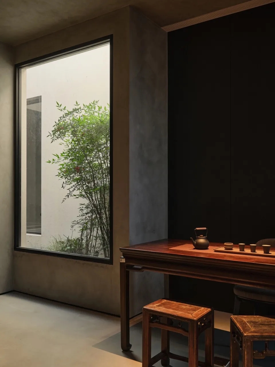空间中偏柔和软性的元素来自业主所喜爱收藏的古董老家具,入口接待区的小凳茶几、会客室的茶桌凳椅、光井过道旁的边桌,还有开放办公区尽头的一把明椅以及一组中药抽屉柜子,都不约而同地中和了办公室的理性和硬朗。在此,办公空间与生活老家具的结合营造了充满禅意的氛围,沉静中带有一丝温情。而作为公司品牌调性展示和延续的西餐厅“馐·shy table”正位于建筑底层,从顶层办公到一层餐厅,设计从整体到细微一以贯之地传达了品牌内敛沉静的形象和气质。