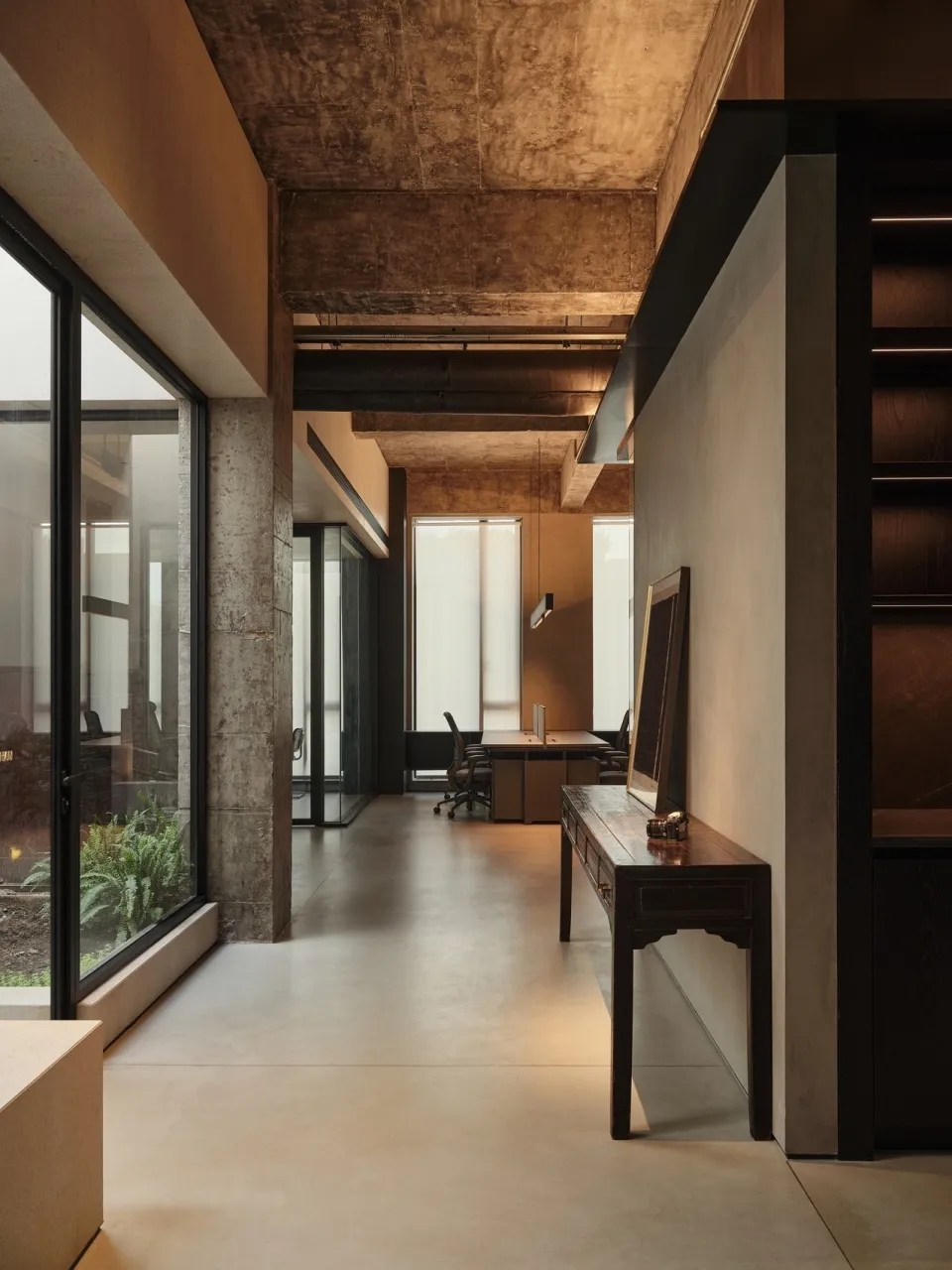 希望在设计中通过材料对话、动线布局、虚实空间、室内外切换、景观自然的引入以及老家具的展示,润物无声地体现品牌调性和设计理念。我们在常规办公空间设计的基础上,整合多元化空间以满足不同需求,将办公空间局部生活化,让日常工作的环境更舒适宜人。空间动线划分动与静,分别对应公共交流和内部办公的使用路径。