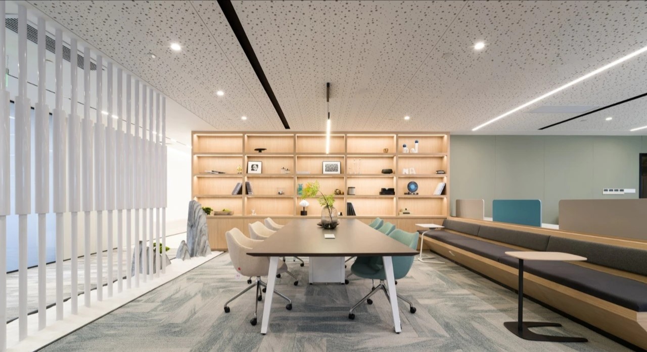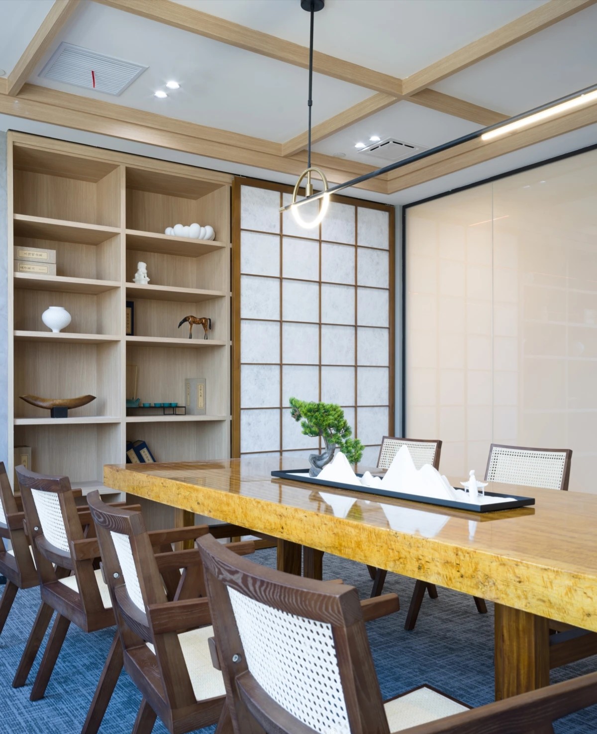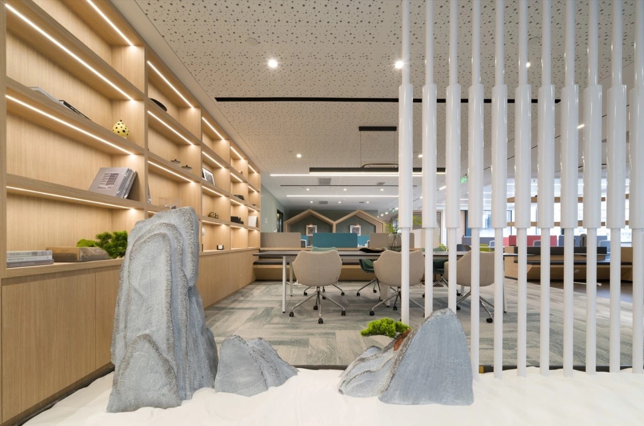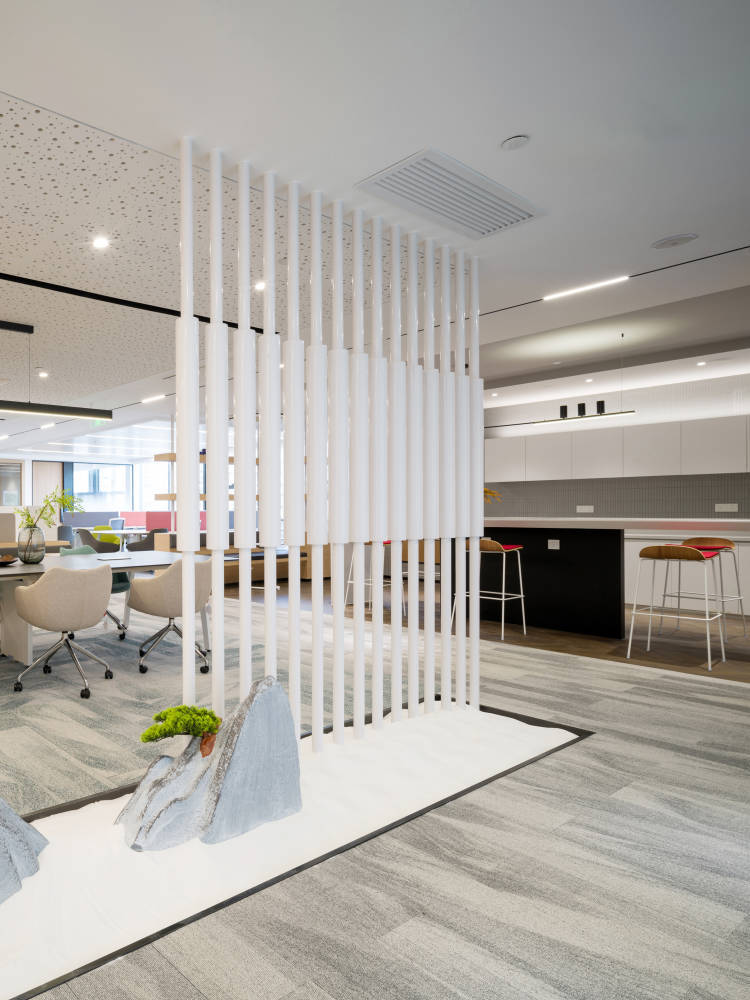 办公空间组织以功能为主导,为了寻求隐私、美观、功能之间的平衡,设计师提出了与景观相结合的空间设计方案,安置在办公区域入户处的枯山水装置确保了前厅与办公区域的分隔,使以视觉为中心的叙事逻辑能够徐徐展开。室内的开放式布局通过线性排列的空间强调了视觉的对话关系,同时诠释了光对于氛围营造的重要影响。休闲开放区域的多功能置物架作为过渡,将其与办公区域进行分隔处理,保持私密性的同时平衡着通透的空间感。建造初始都从平面开始,平面是房间组织的社群,是光里的空间结构体。基于对实用性的考量,功能性空间具象的要求,设计上更重视办公与协作的关联及体验。