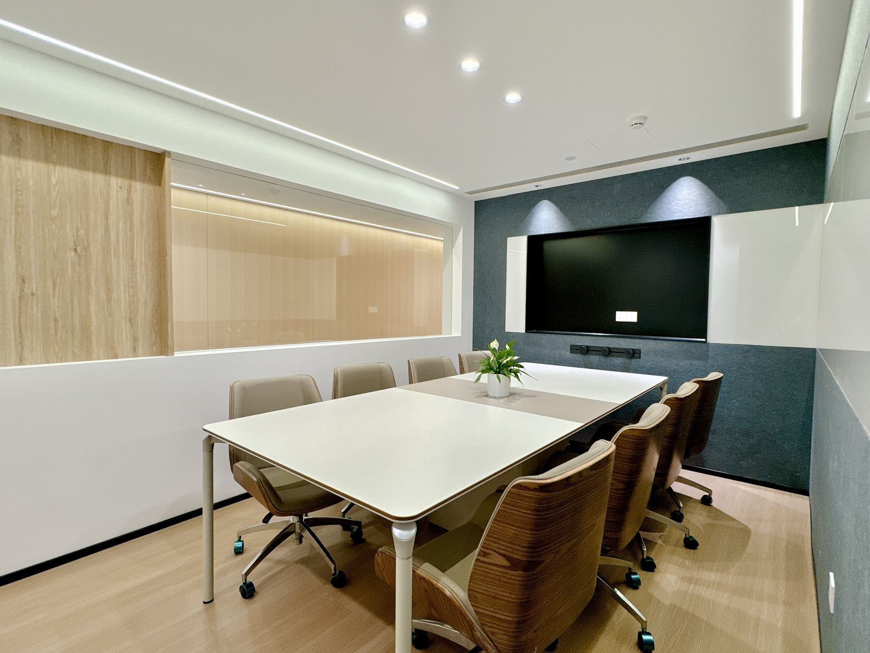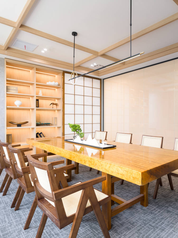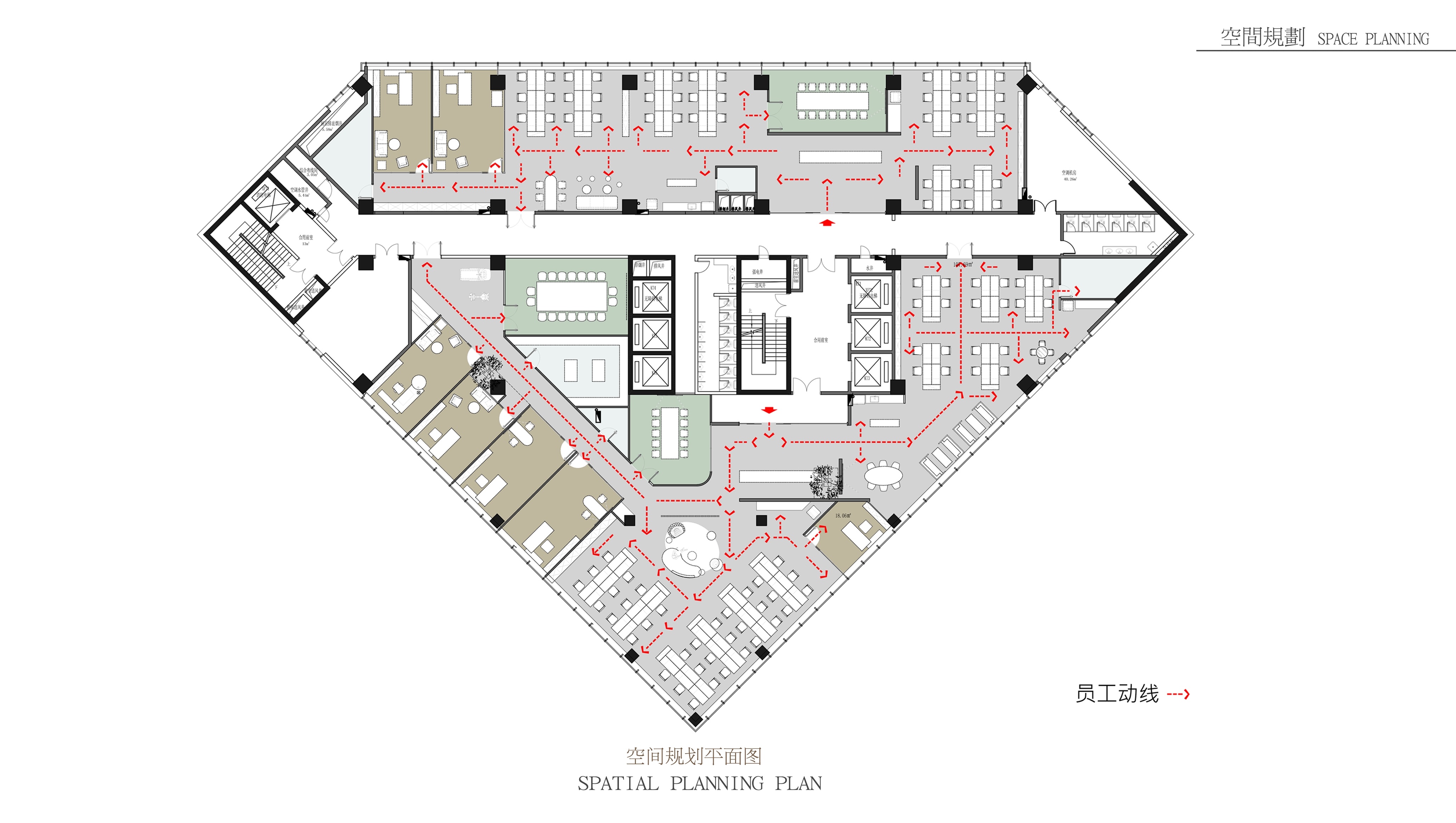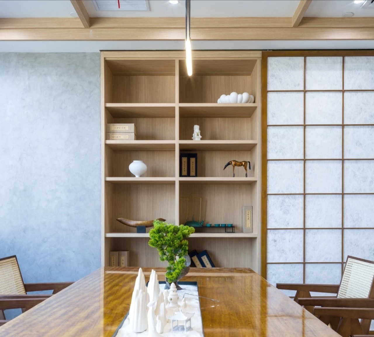 办公空间组织以功能为主导,为了寻求隐私、美观、功能之间的平衡,设计师提出了与景观相结合的空间设计方案,安置在办公区域入户处的枯山水装置确保了前厅与办公区域的分隔,使以视觉为中心的叙事逻辑能够徐徐展开。室内的开放式布局通过线性排列的空间强调了视觉的对话关系,同时诠释了光对于氛围营造的重要影响。休闲开放区域的多功能置物架作为过渡,将其与办公区域进行分隔处理,保持私密性的同时平衡着通透的空间感。建造初始都从平面开始,平面是房间组织的社群,是光里的空间结构体。基于对实用性的考量,功能性空间具象的要求,设计上更重视办公与协作的关联及体验。