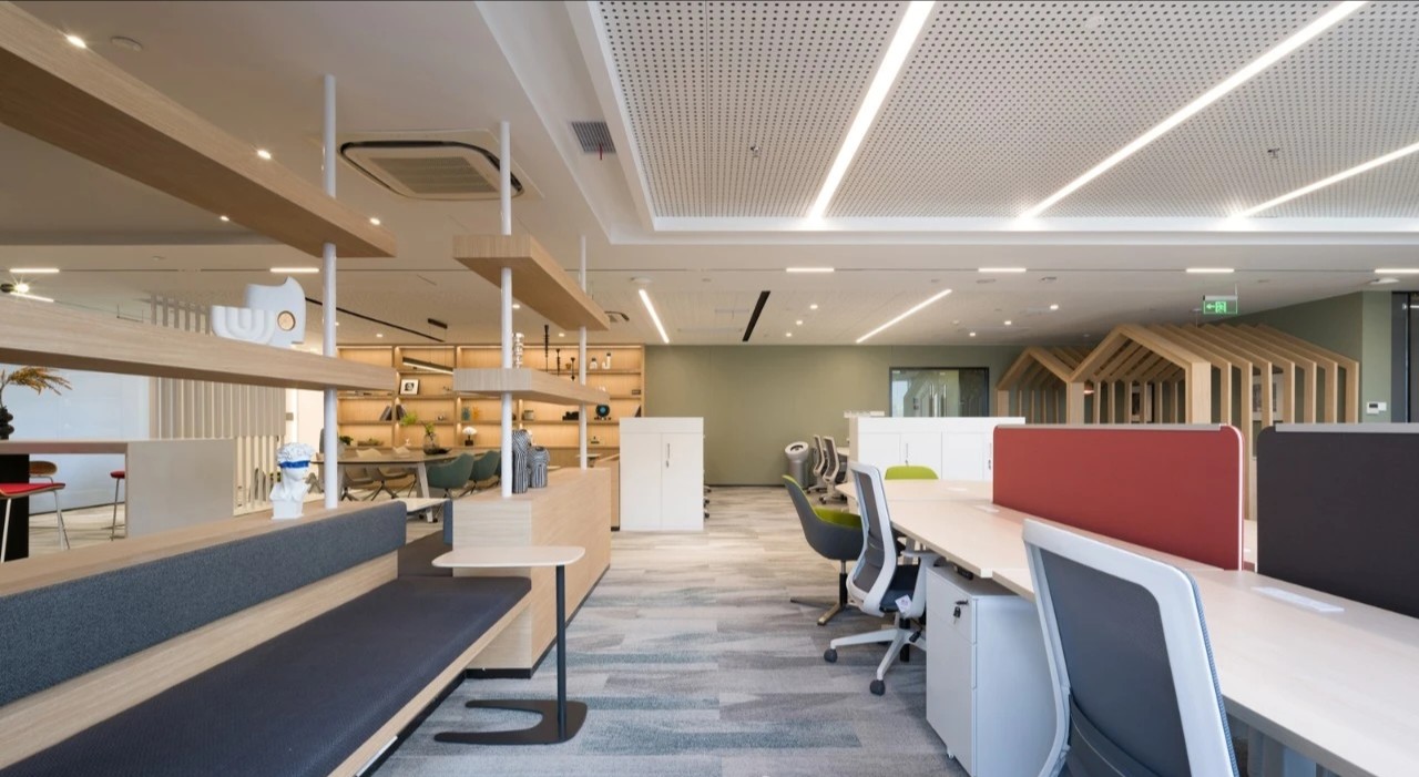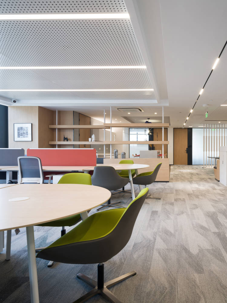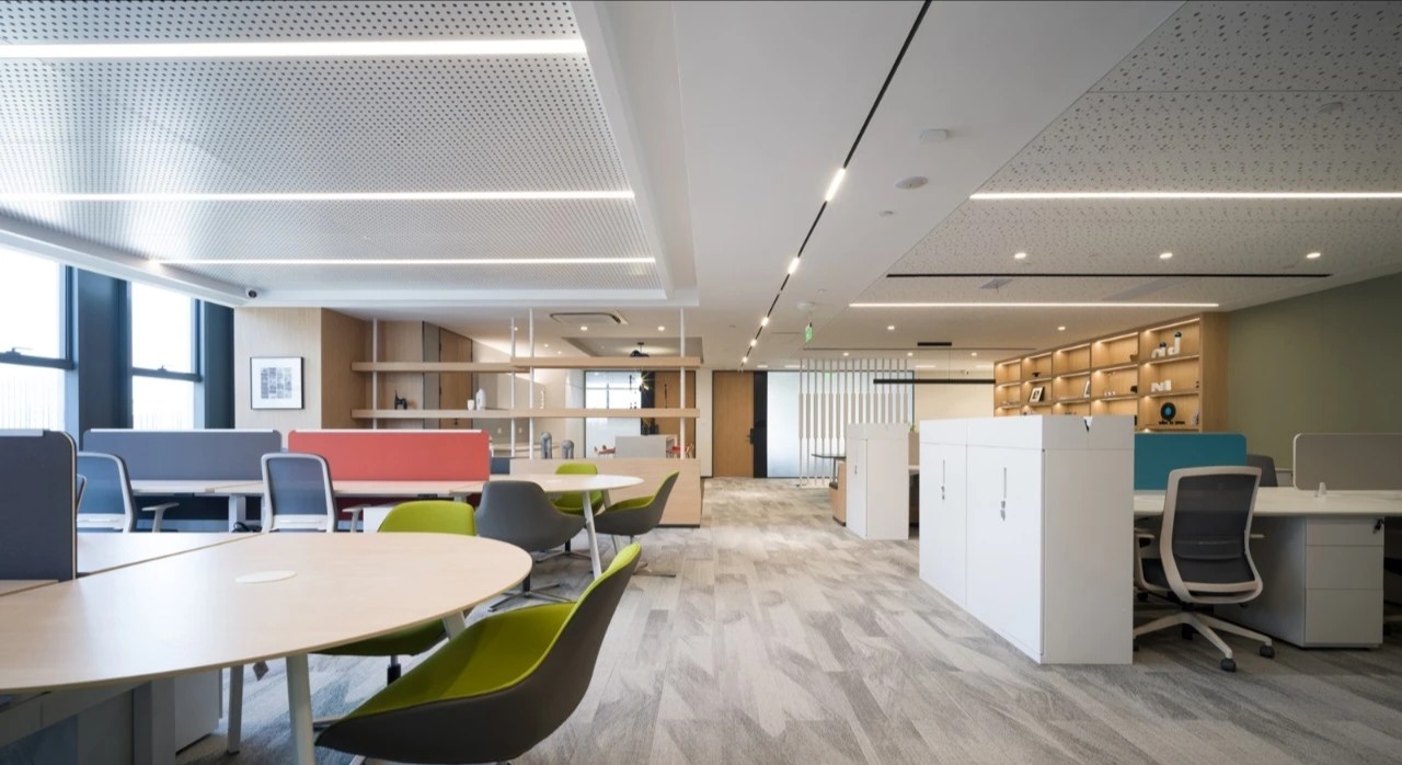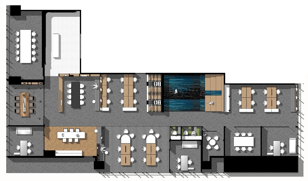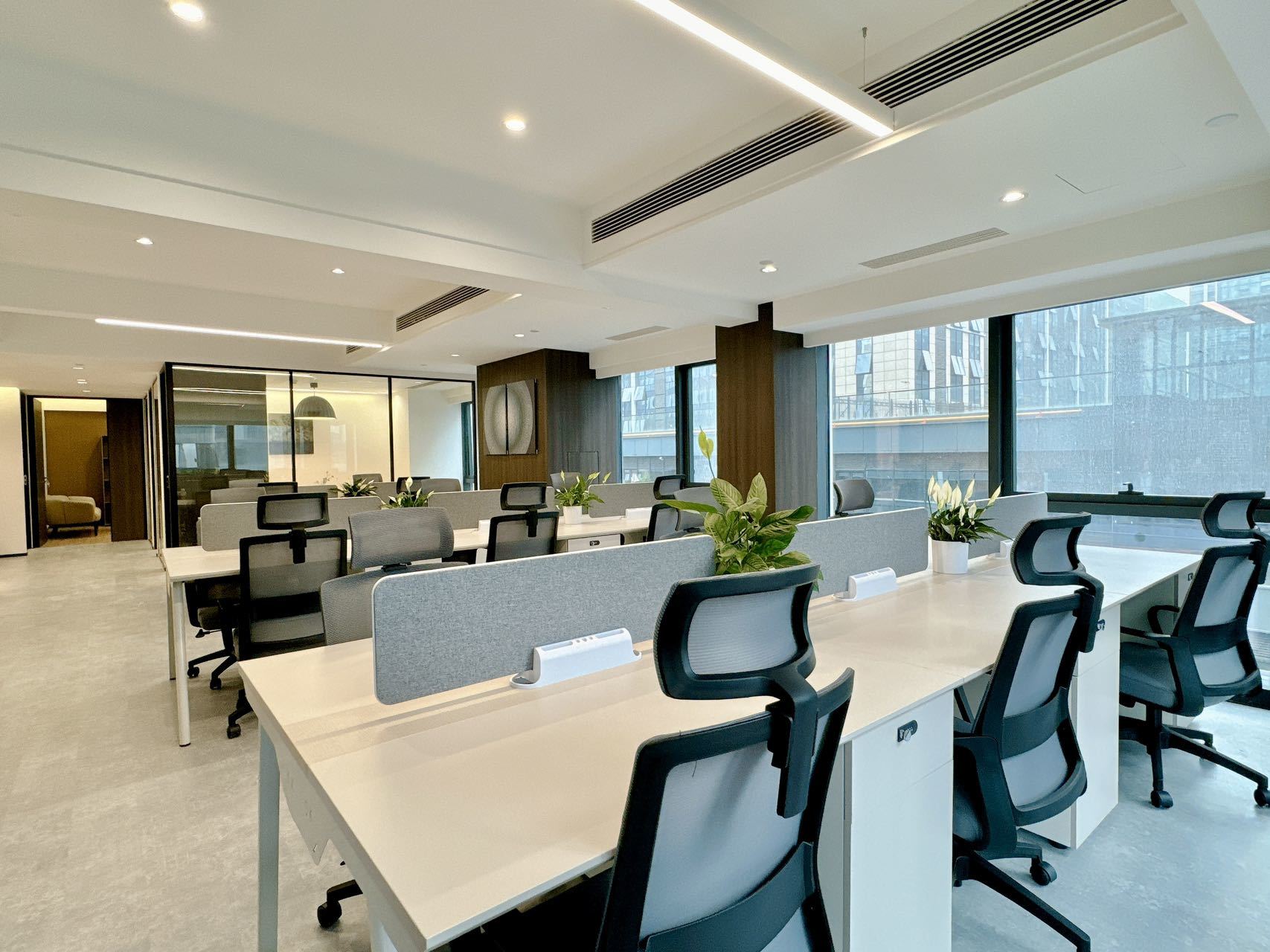 办公空间组织以功能为主导,为了寻求隐私、美观、功能之间的平衡,设计师提出了与景观相结合的空间设计方案,安置在办公区域入户处的枯山水装置确保了前厅与办公区域的分隔,使以视觉为中心的叙事逻辑能够徐徐展开。室内的开放式布局通过线性排列的空间强调了视觉的对话关系,同时诠释了光对于氛围营造的重要影响。休闲开放区域的多功能置物架作为过渡,将其与办公区域进行分隔处理,保持私密性的同时平衡着通透的空间感。建造初始都从平面开始,平面是房间组织的社群,是光里的空间结构体。基于对实用性的考量,功能性空间具象的要求,设计上更重视办公与协作的关联及体验。
