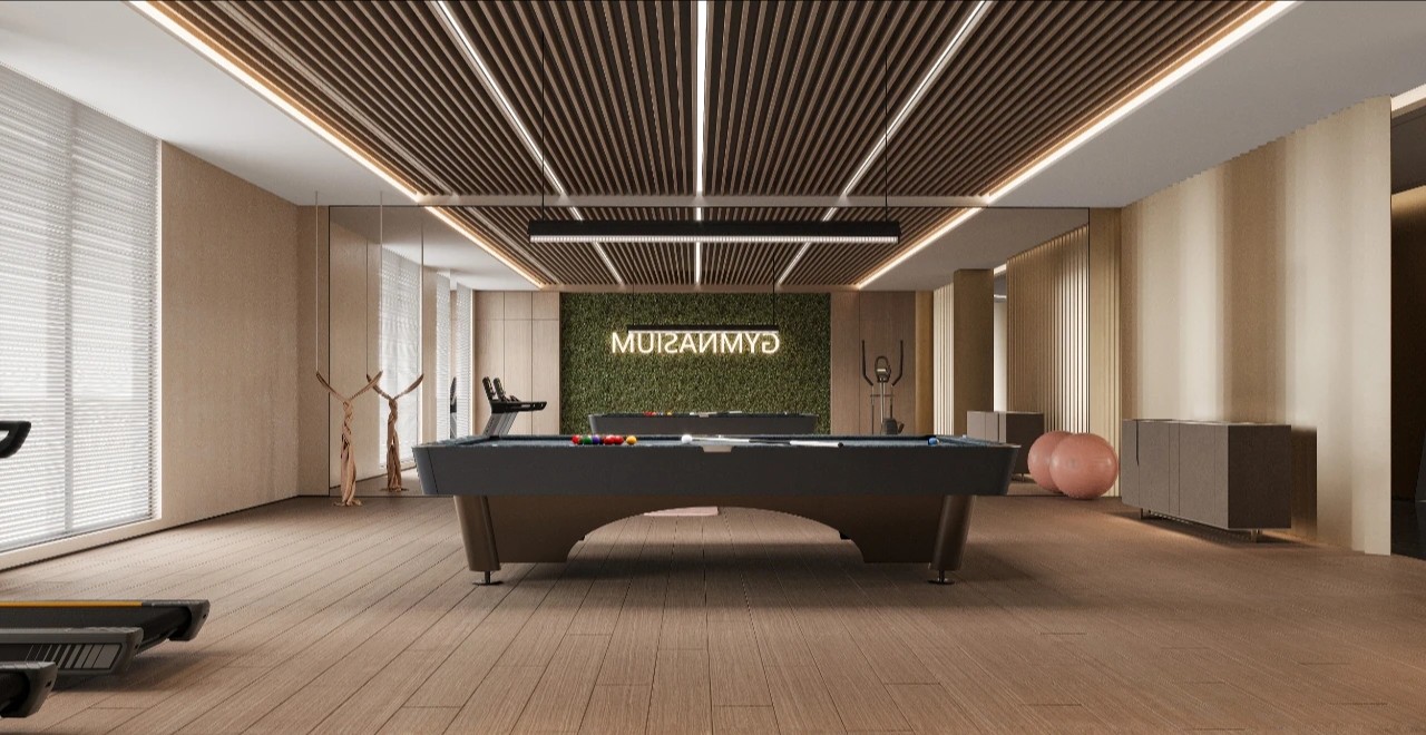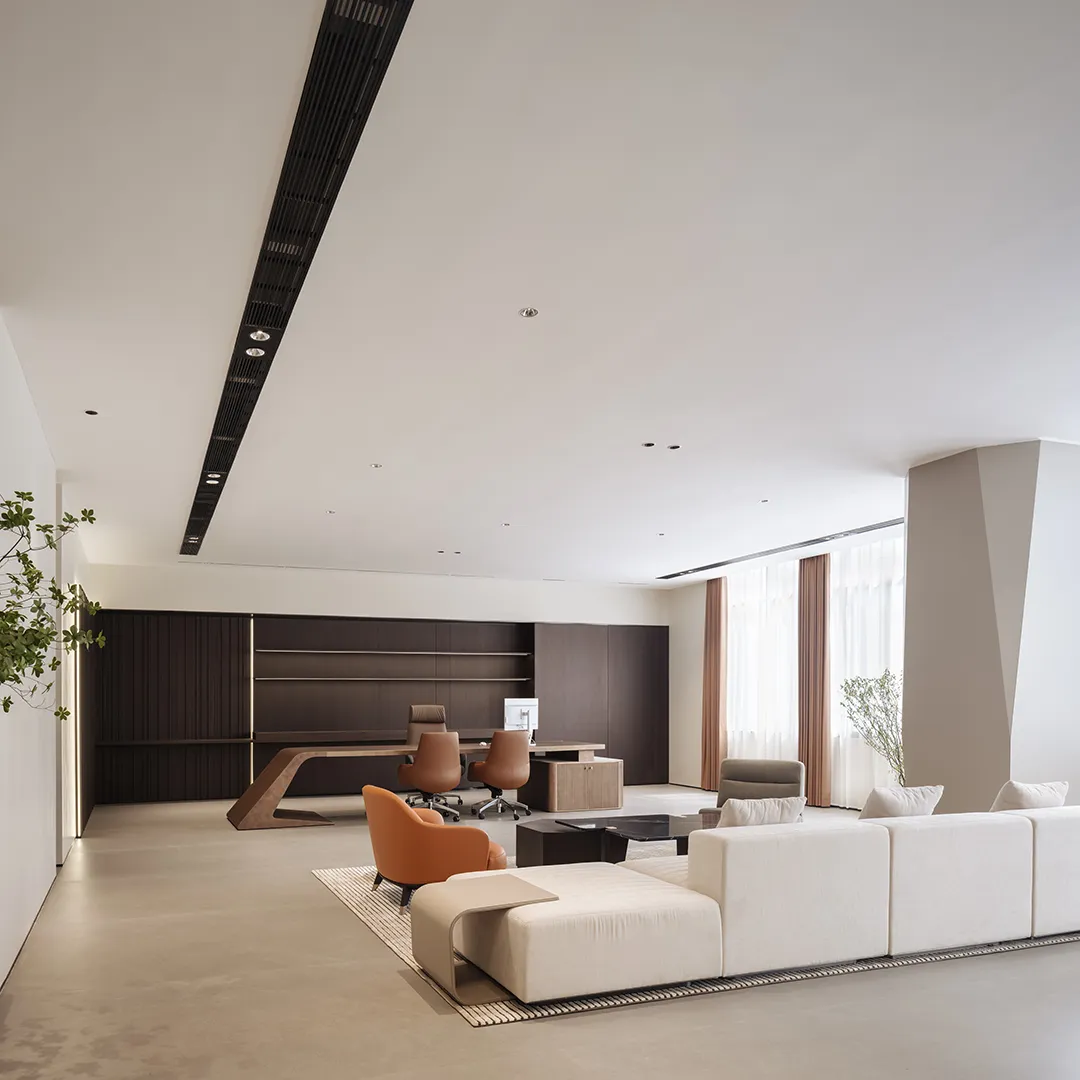 董事长办公室是一个自然呼吸的空间,配备办公区、会客区、茶室、健身区与休息室。在这里可以游刃有余地进行办公、休闲、洽谈与休憩,恍若随风起伏的城市脉搏,感知时代的脉动,与万象共鸣。