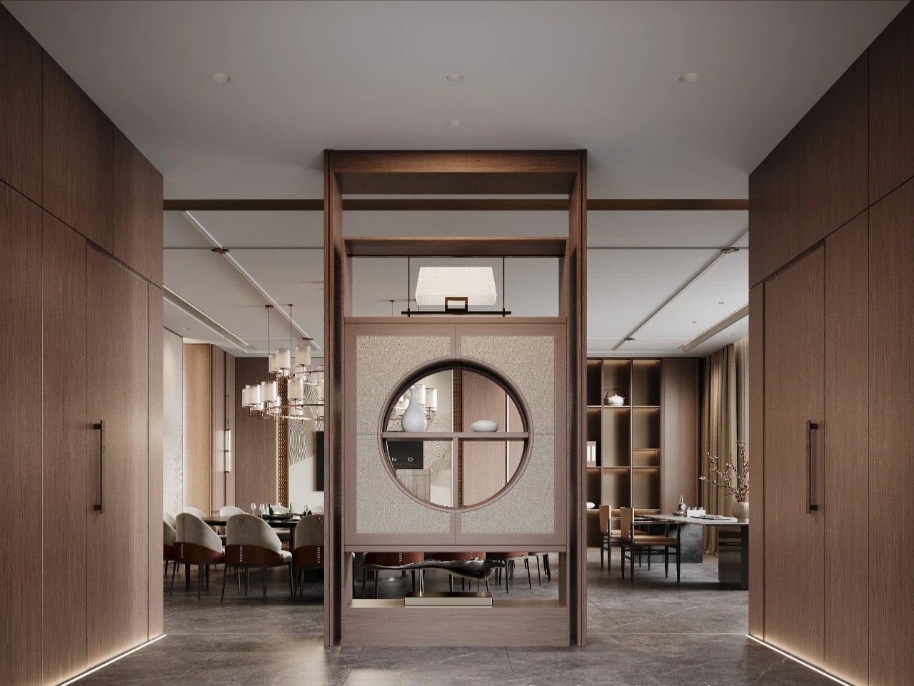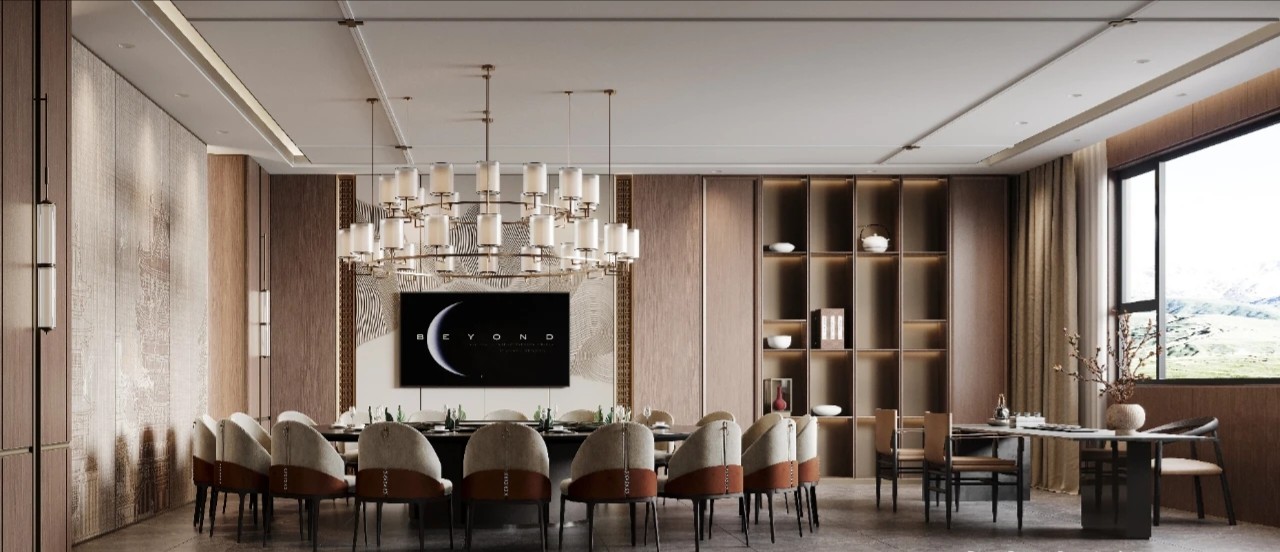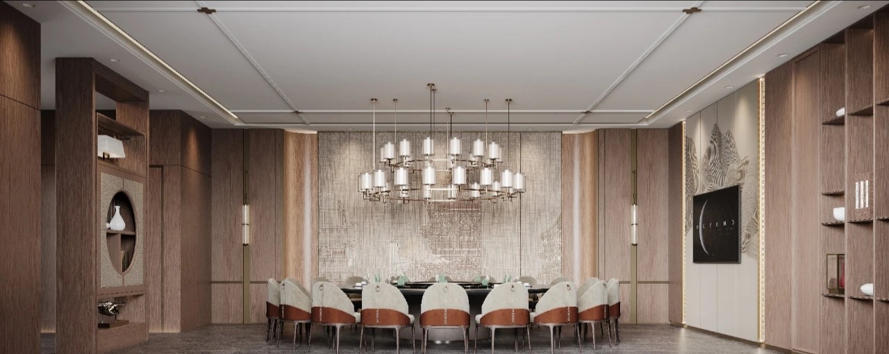 宴客厅以新中式文化和现代设计元素相融合为主题,采用对称式布局,打造出古典美学气息。步入宴客厅,一面东方禅意的屏风,完美诠释了”犹抱琵琶半遮面”的中式美学韵味。