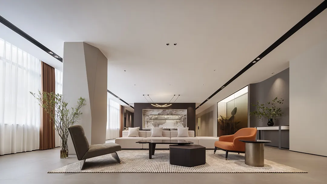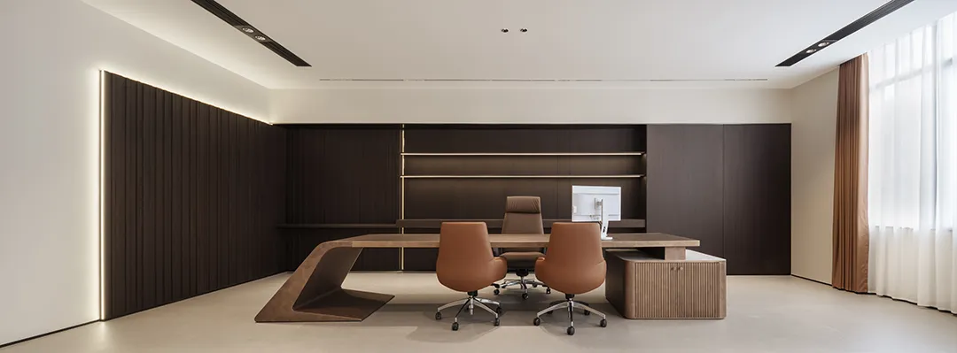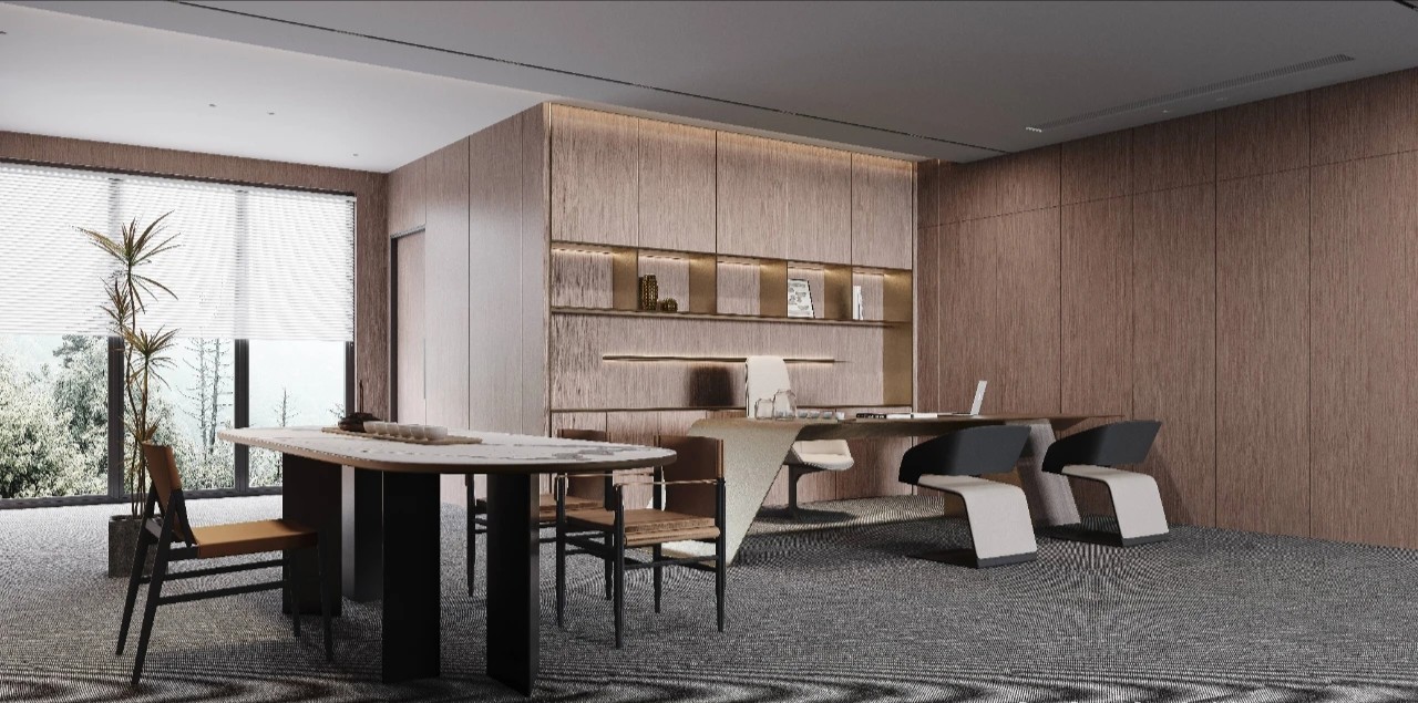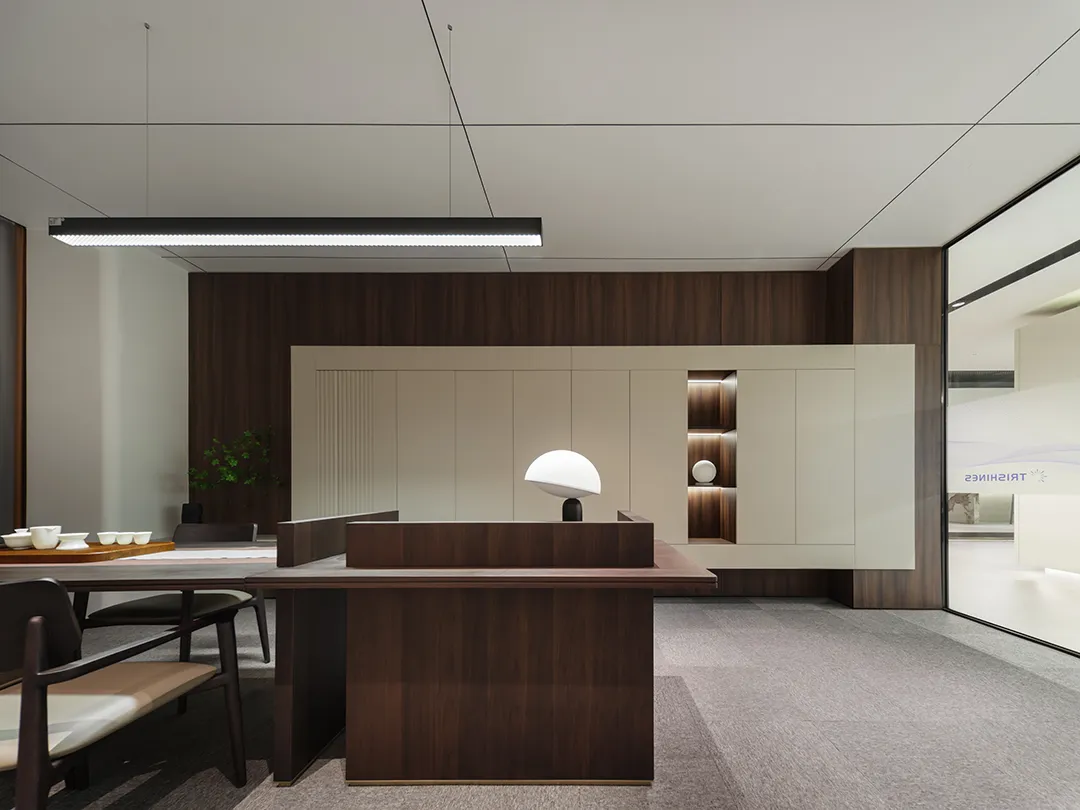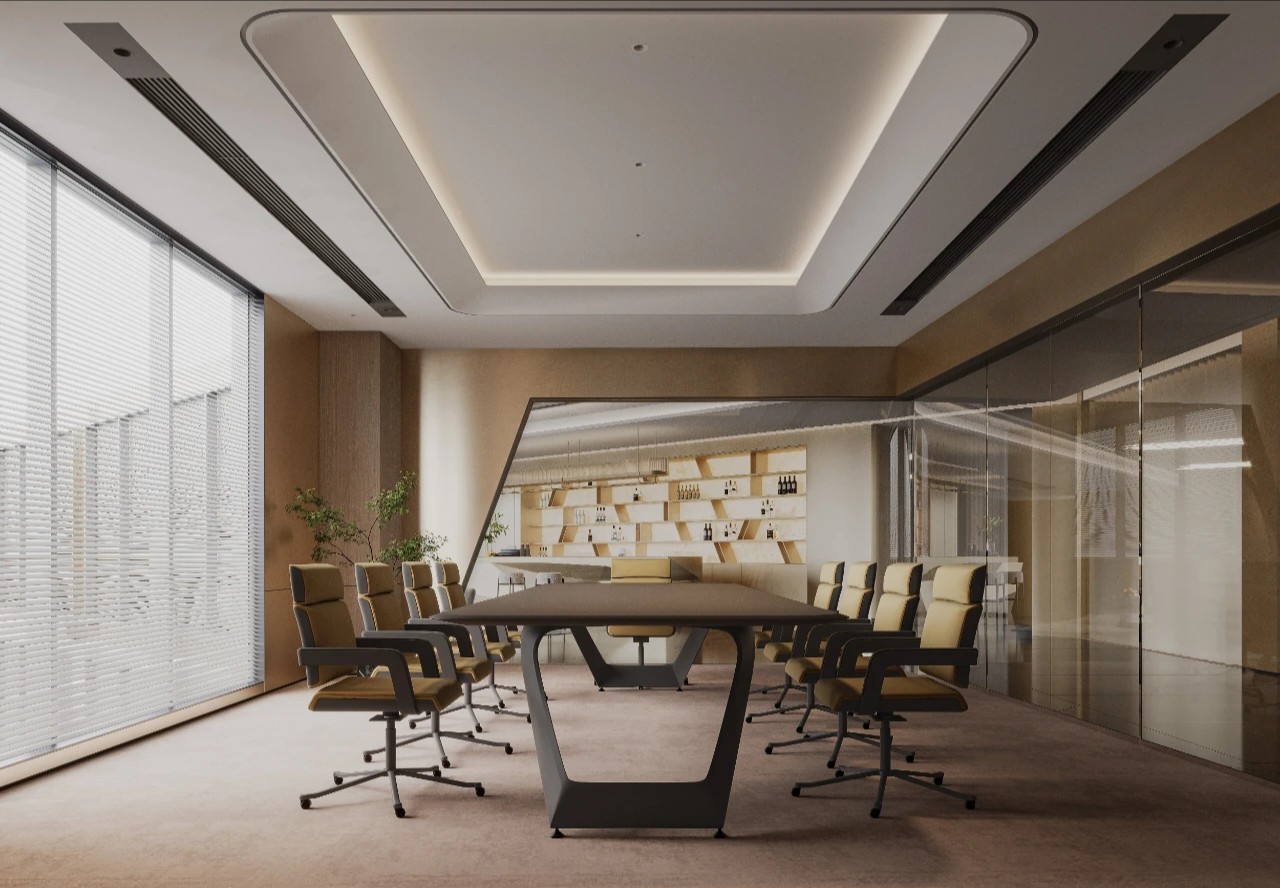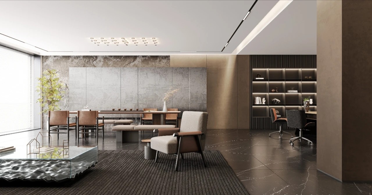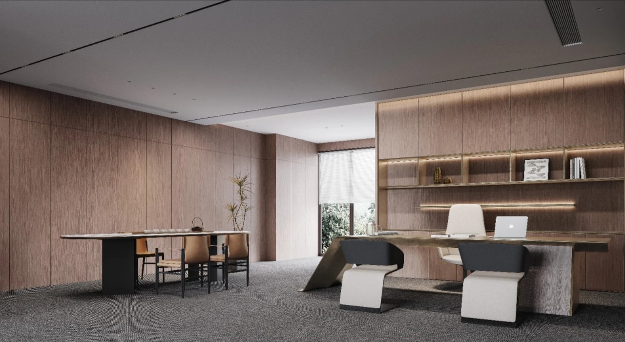 精细的线性元素突显商务氛围,搭配品牌家具与当代艺术饰品,营造出顶级商务空间的细腻质感。茶桌提供了专注与休闲、办公与洽谈的多功能需求,使得日常场景切换变得更为完美自然。