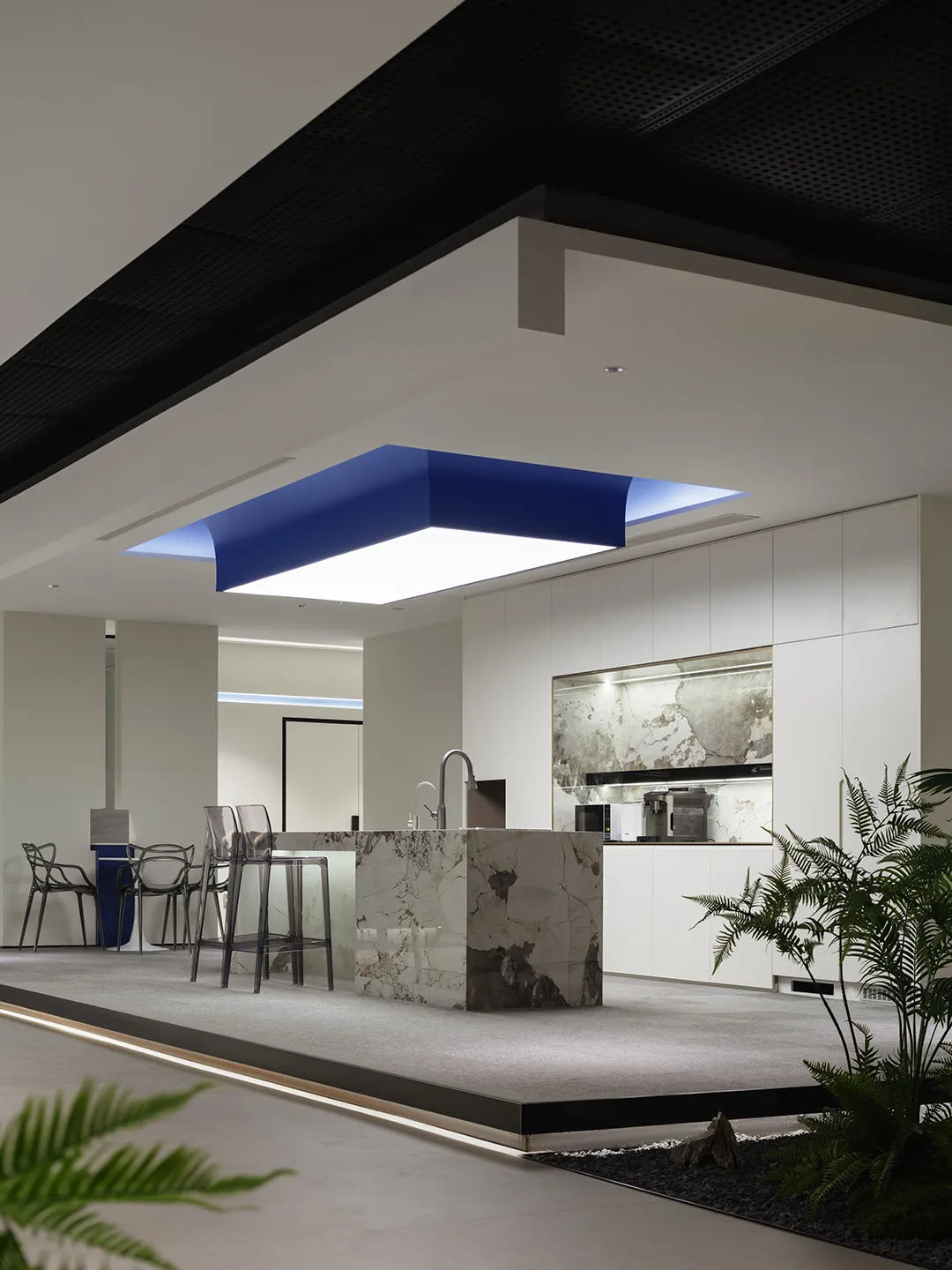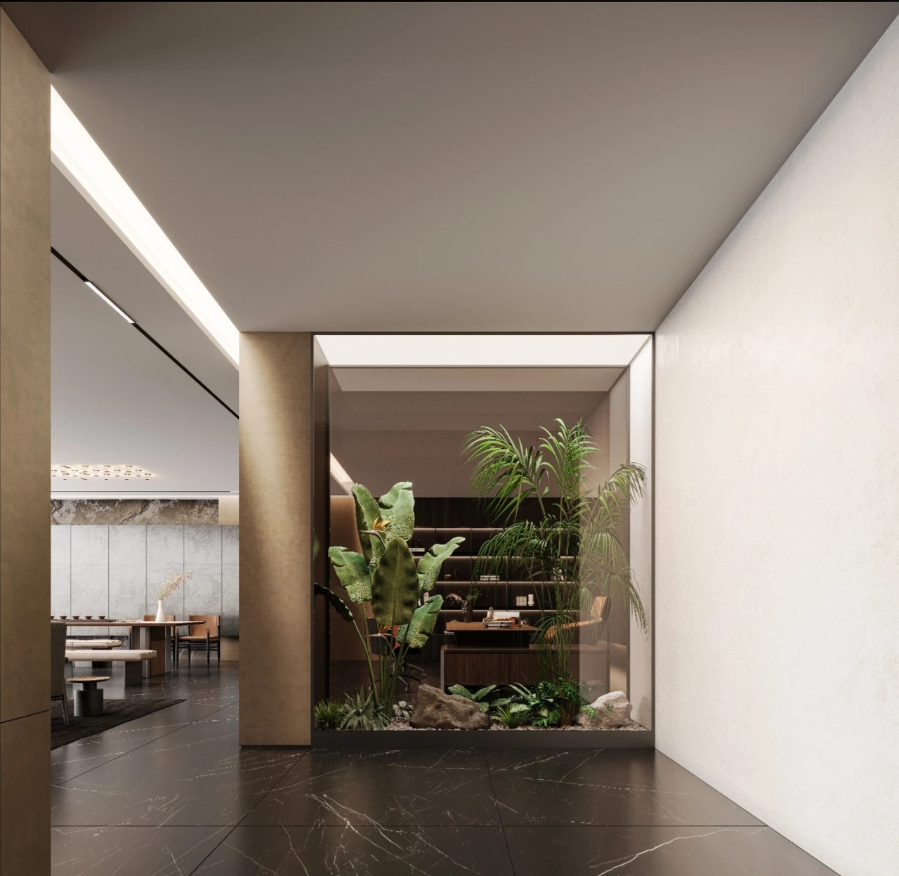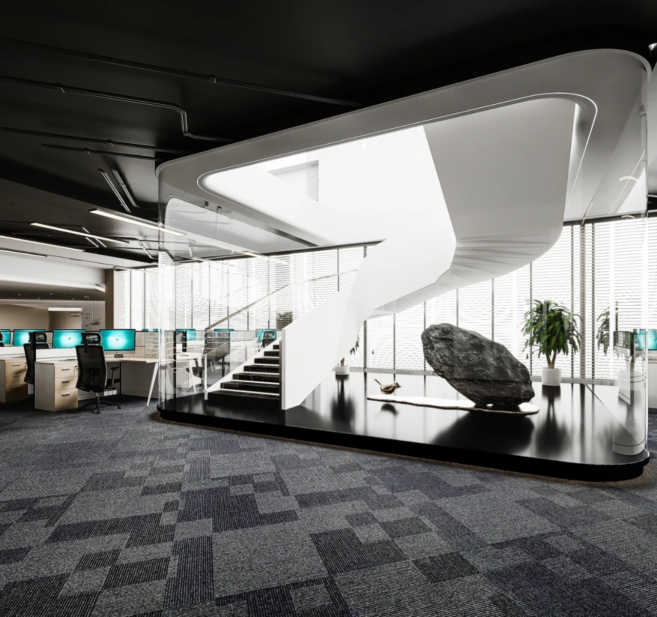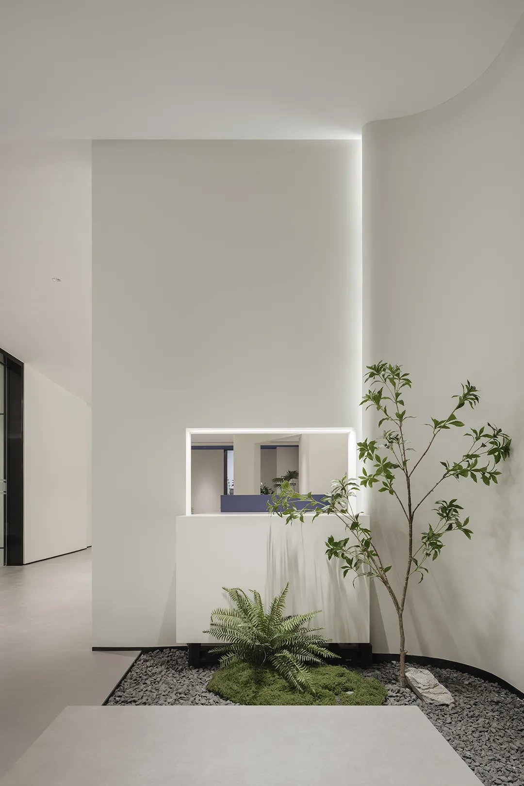 空间一隅的景观区,通过自然元素的巧妙融入创造出更具有人文关怀的工作环境。阳光倾泻而下,绿植点缀其间,仿佛在空间的每个角落都呼吸着自然的气息。设计感的线条勾勒空间的每一个细节,充满层次感与空间感,匹配色彩的极简舒适度。