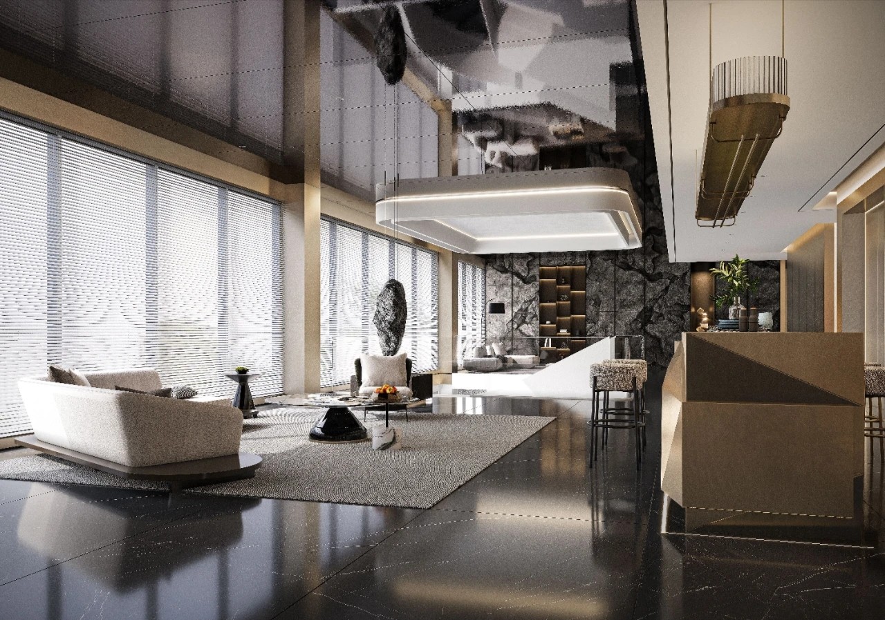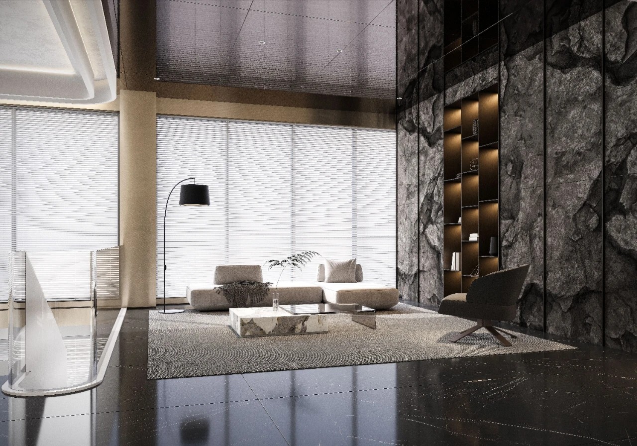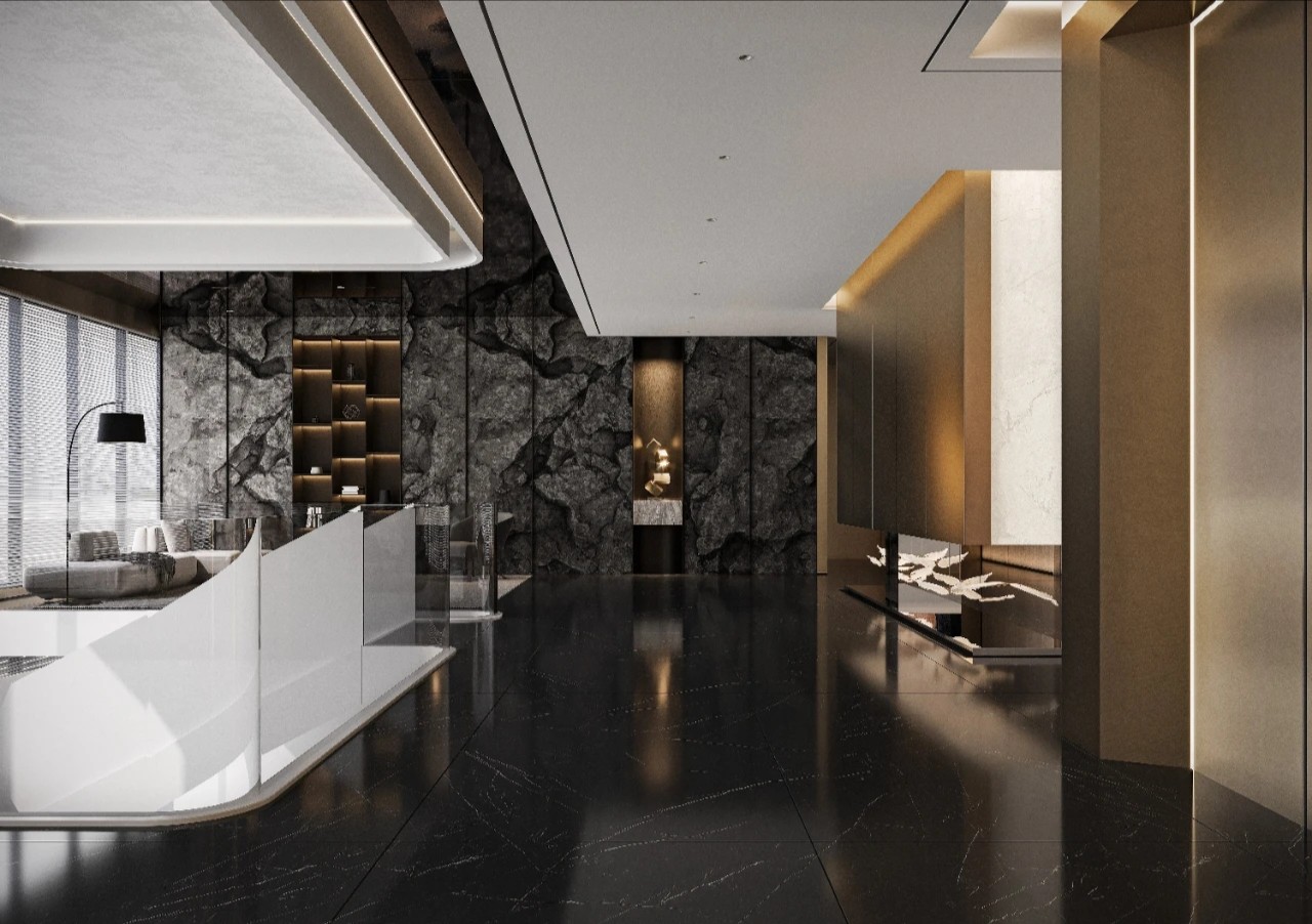 吊顶黑色镜面材料纵深延展,宛如镜面般反射出空间的深邃与辽阔。黑色的大理石地面与之相互呼应,其华丽的质感让人仿佛置身于一座现代艺术的殿堂。黑色玄武岩状的石材立面自然而粗犷,与精致的金属饰面两相而立,形成了极致的反差。金属在光线的下折射光芒,宛如星辰般点亮了这个现代空间。
