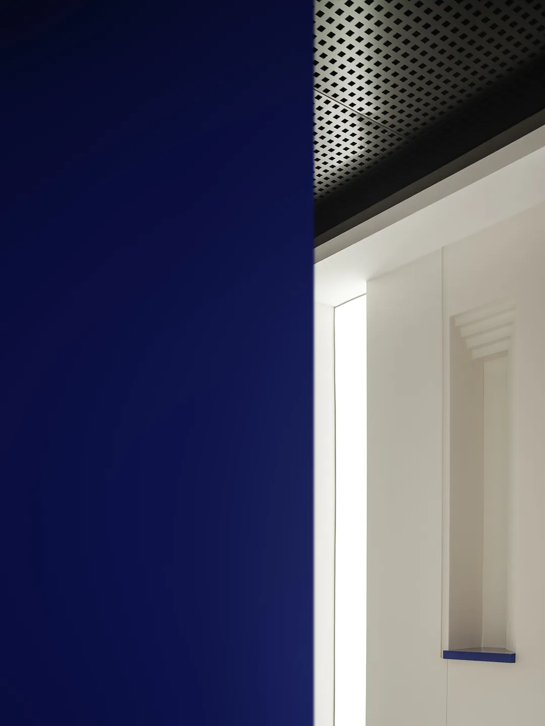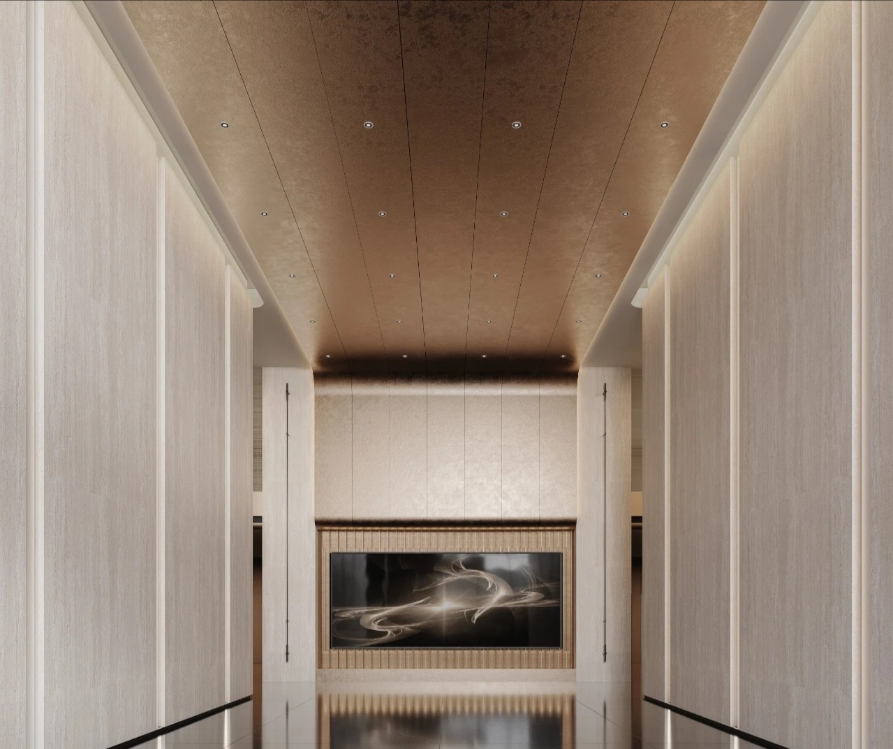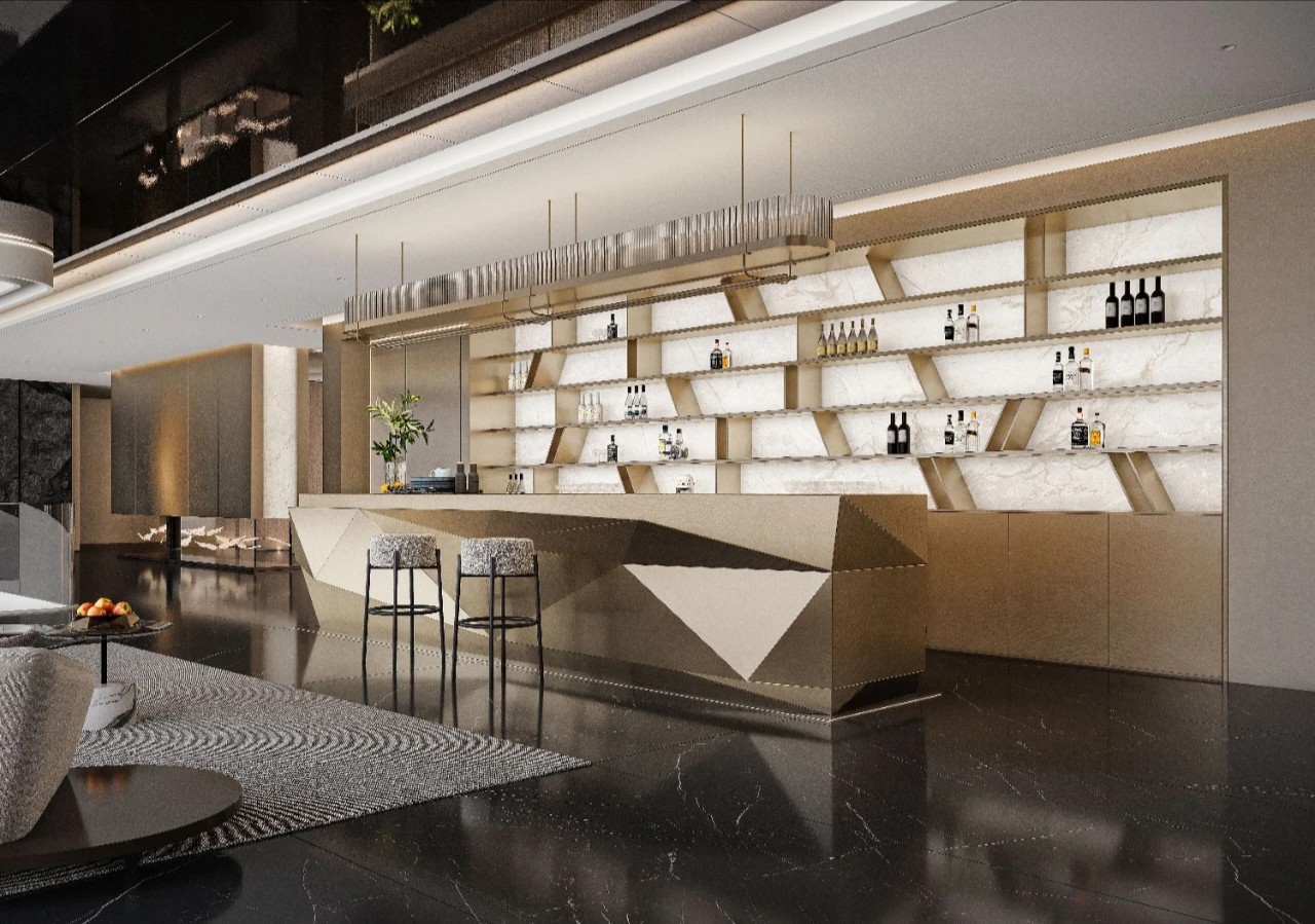 吊顶黑色镜面材料纵深延展,宛如镜面般反射出空间的深邃与辽阔。黑色的大理石地面与之相互呼应,其华丽的质感让人仿佛置身于一座现代艺术的殿堂。黑色玄武岩状的石材立面自然而粗犷,与精致的金属饰面两相而立,形成了极致的反差。金属在光线的下折射光芒,宛如星辰般点亮了这个现代空间。