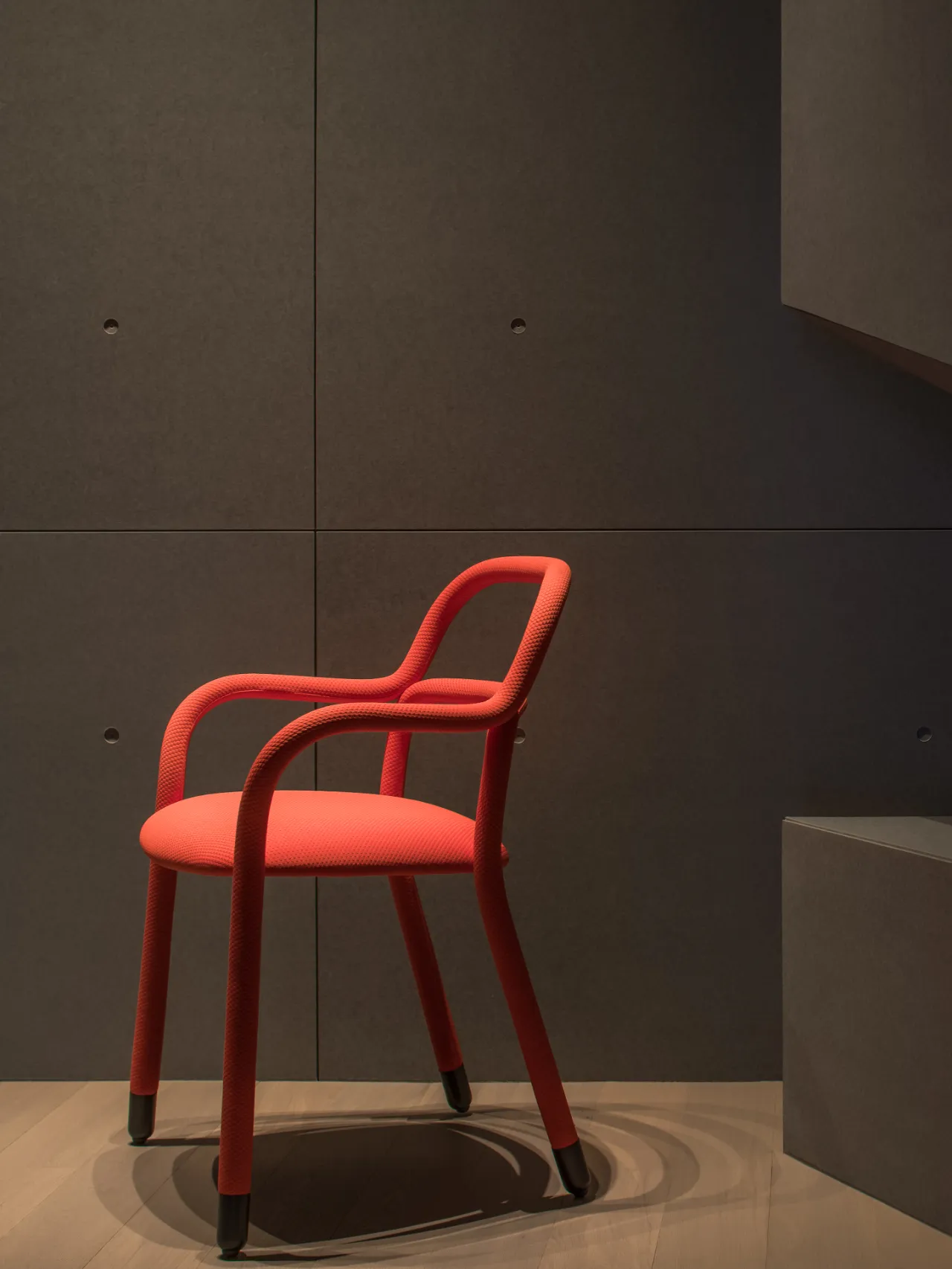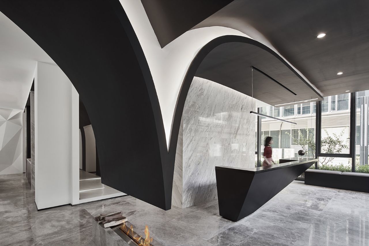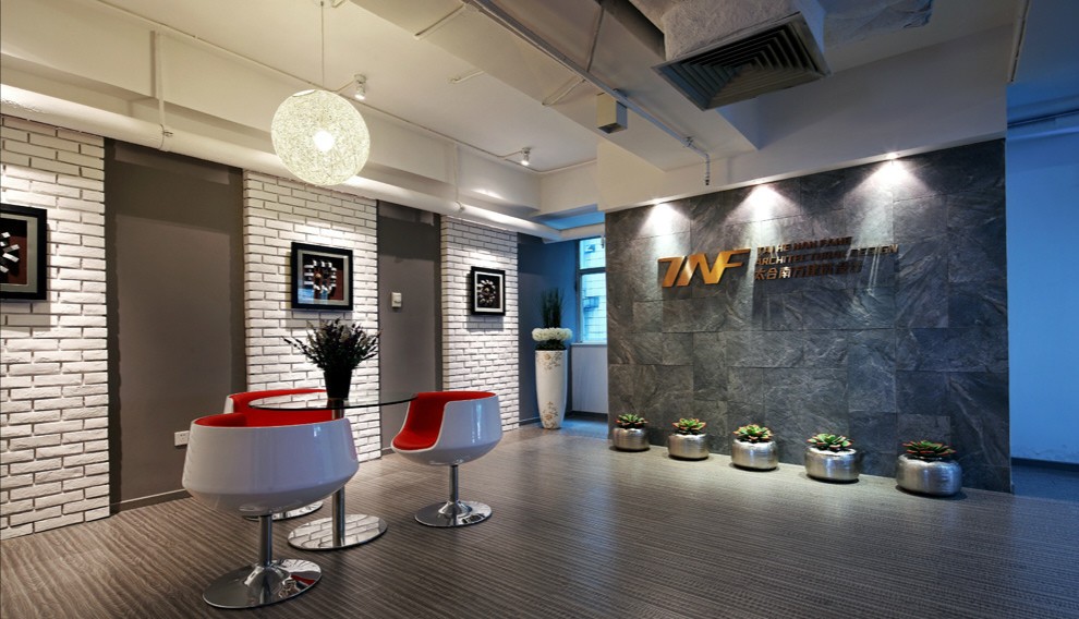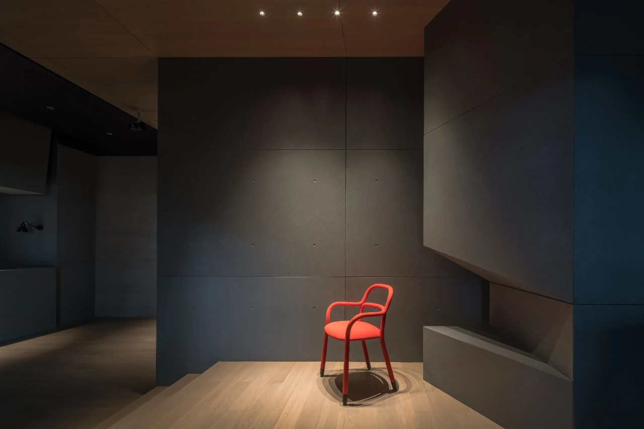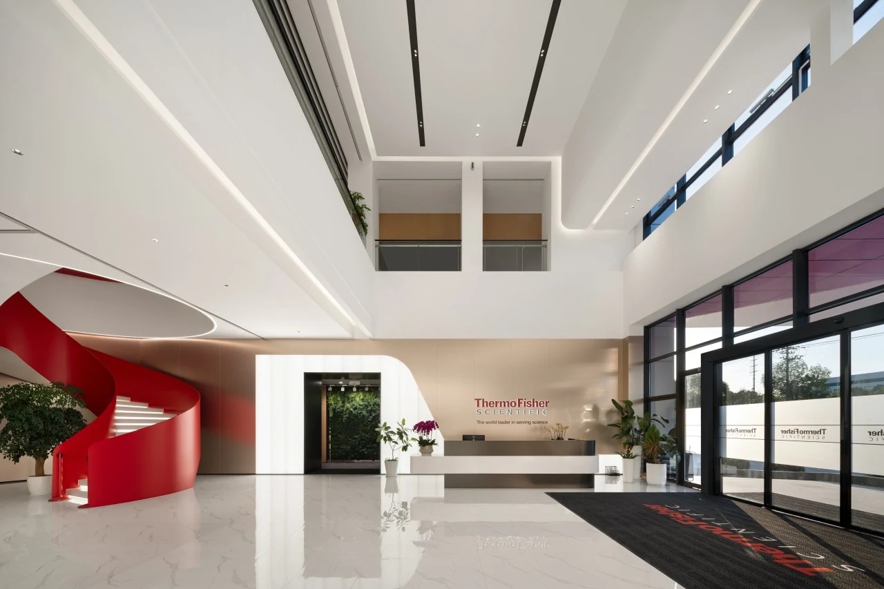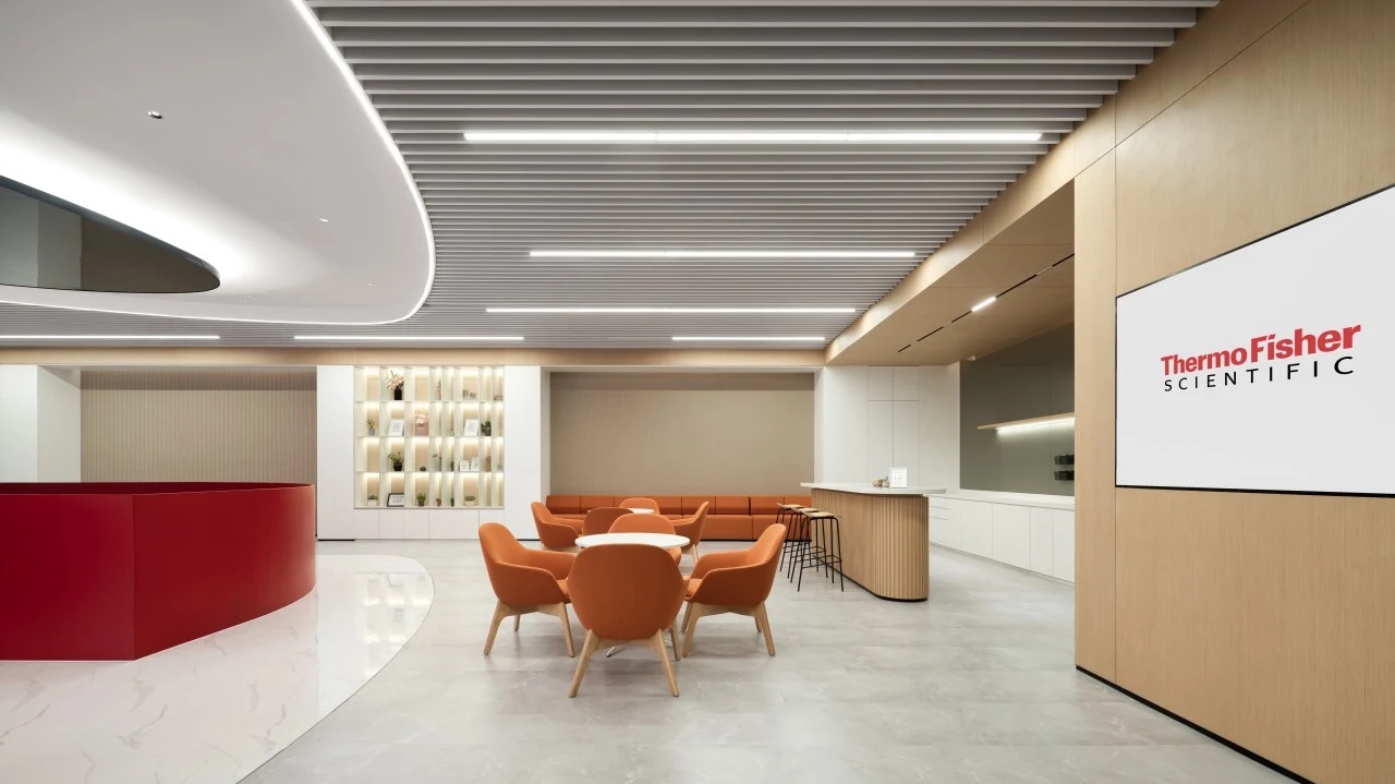 楼梯使用了赛默飞的鲜明的品牌标志色-红色,浅金色搭配红色凸显质感,在前台增加了一抹亮眼的跃动元素。沿楼梯而上至二层,步入一方自在惬意的吧台茶水区,开放灵活的环境将支持人们在任何时间,与内部同事或外部访客,展开一场非正式的、轻松愉悦的交流,或是在这里享受一段美好的咖啡时光。