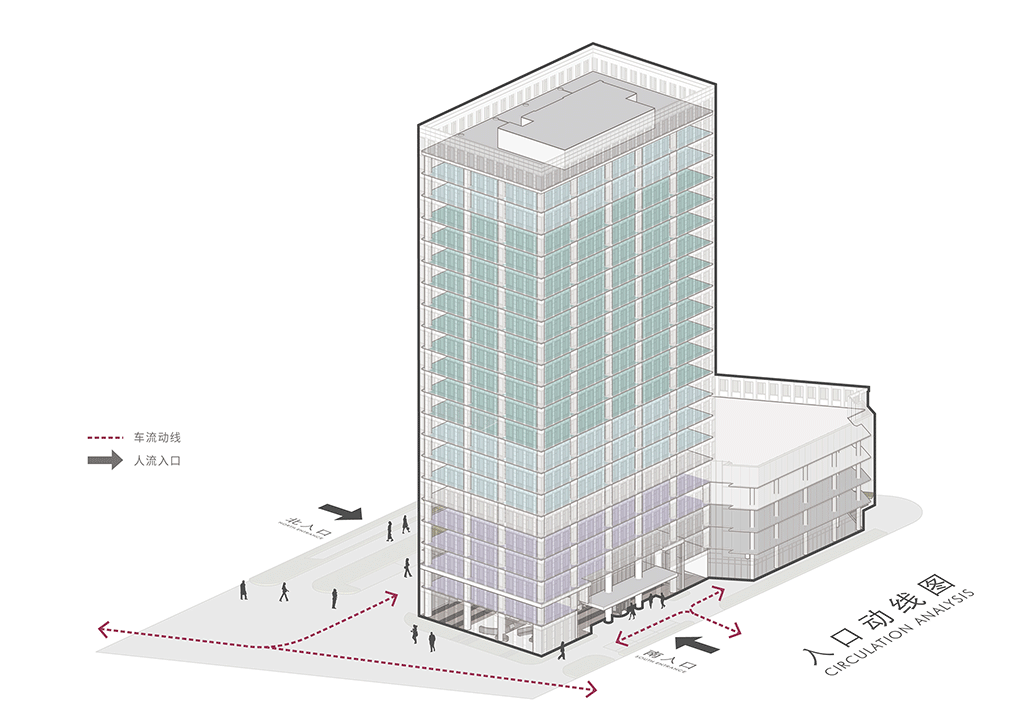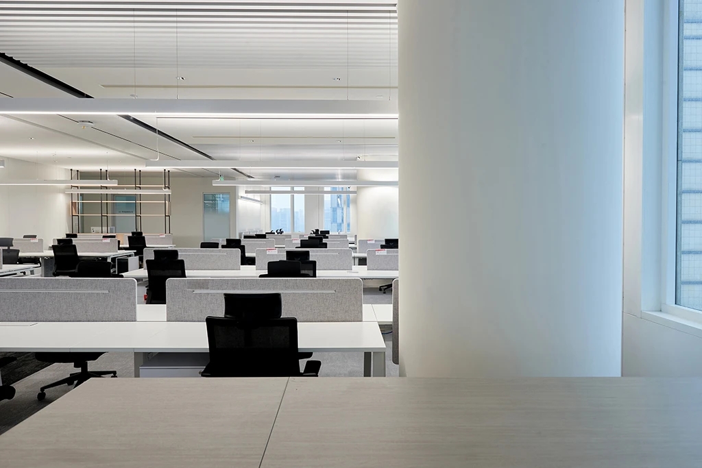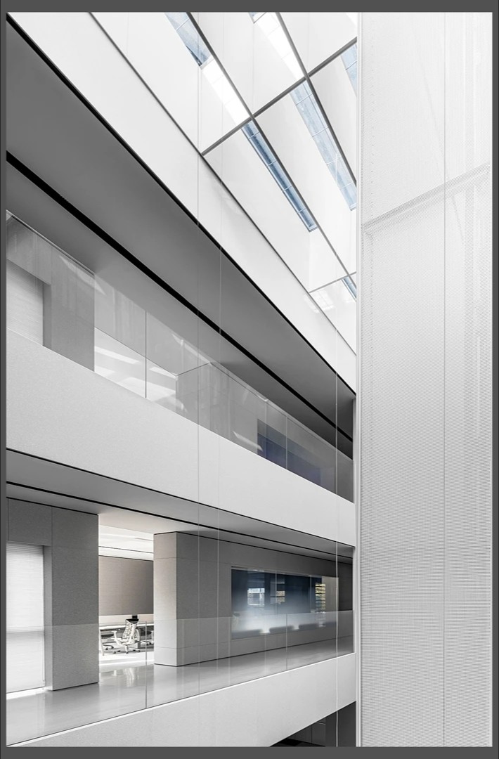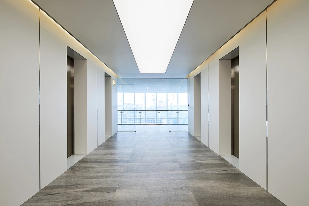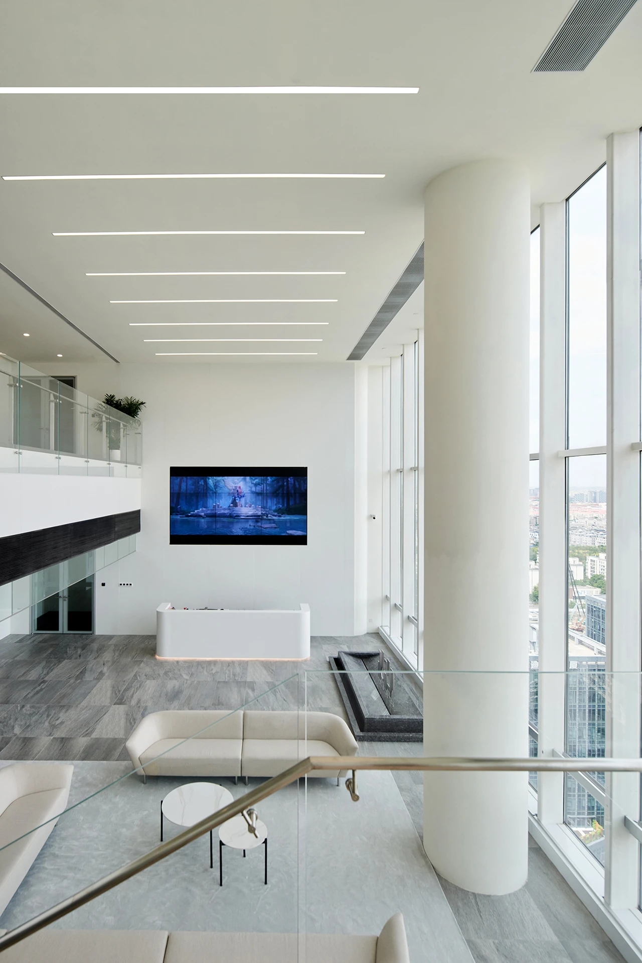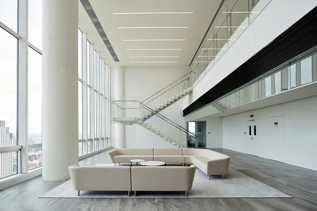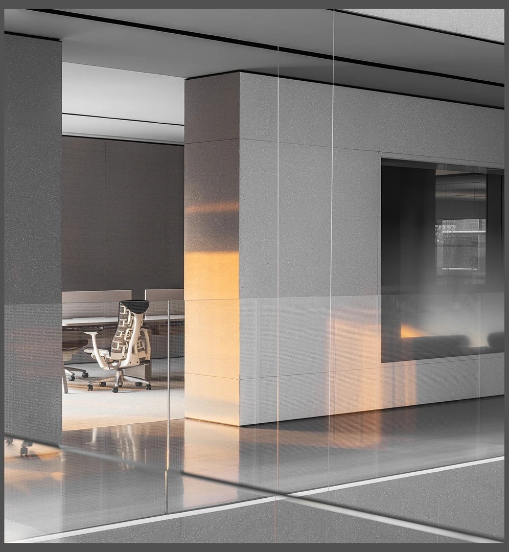 22楼的空中大堂为进入高层职能办公区主要入口,并新增了楼梯连接23楼顶层,在大堂入口处迎接访客的是取代常规LOGO的水景,由水景将人引向窗外景色。