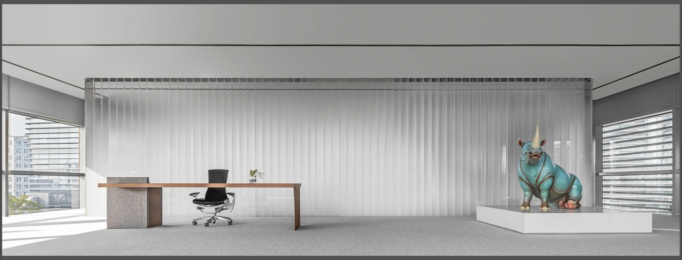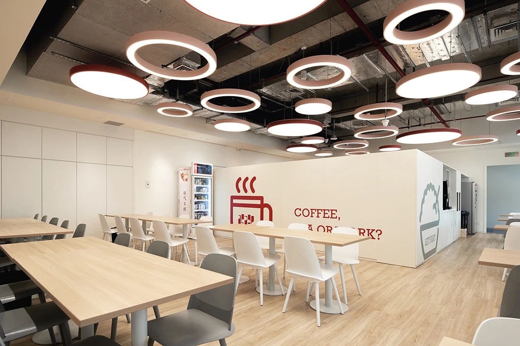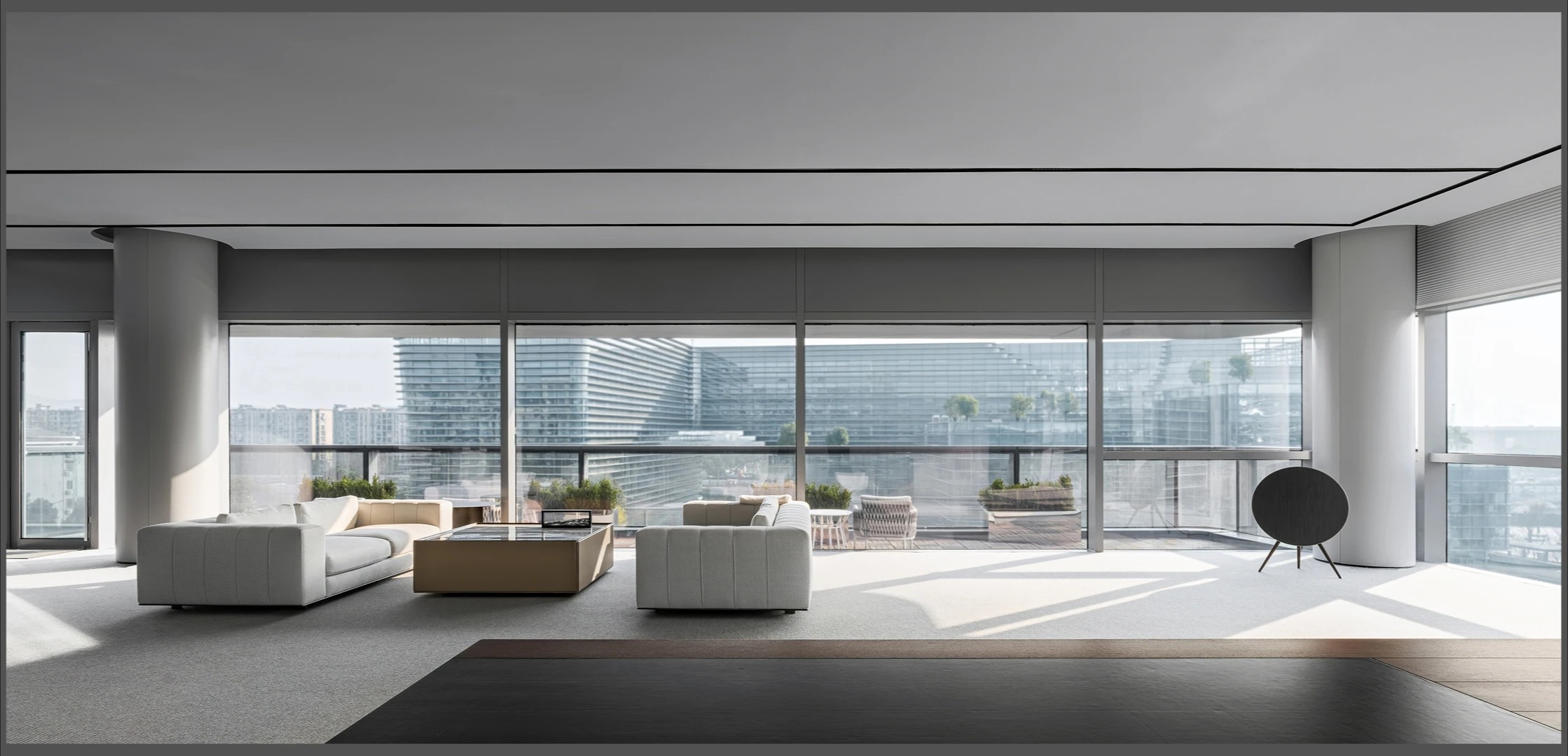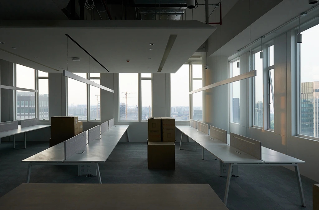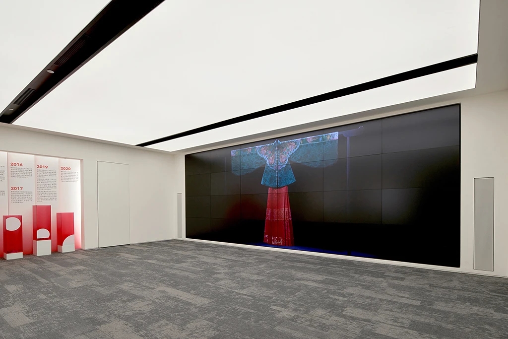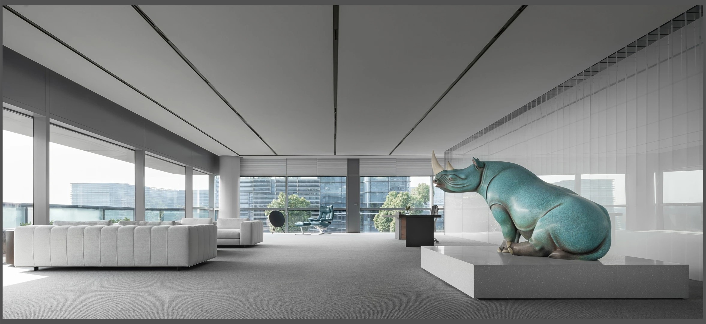 22楼的空中大堂为进入高层职能办公区主要入口,并新增了楼梯连接23楼顶层,在大堂入口处迎接访客的是取代常规LOGO的水景,由水景将人引向窗外景色。